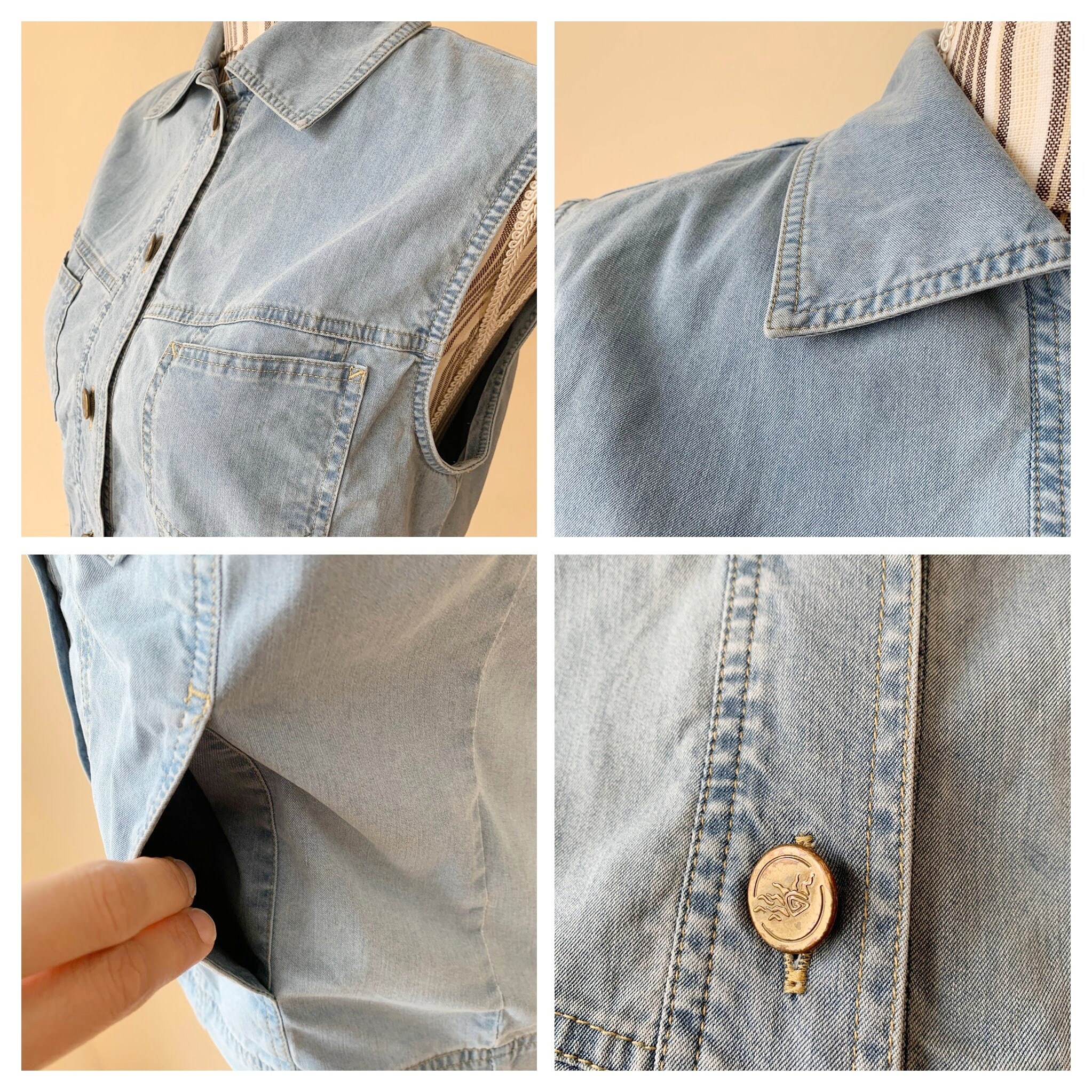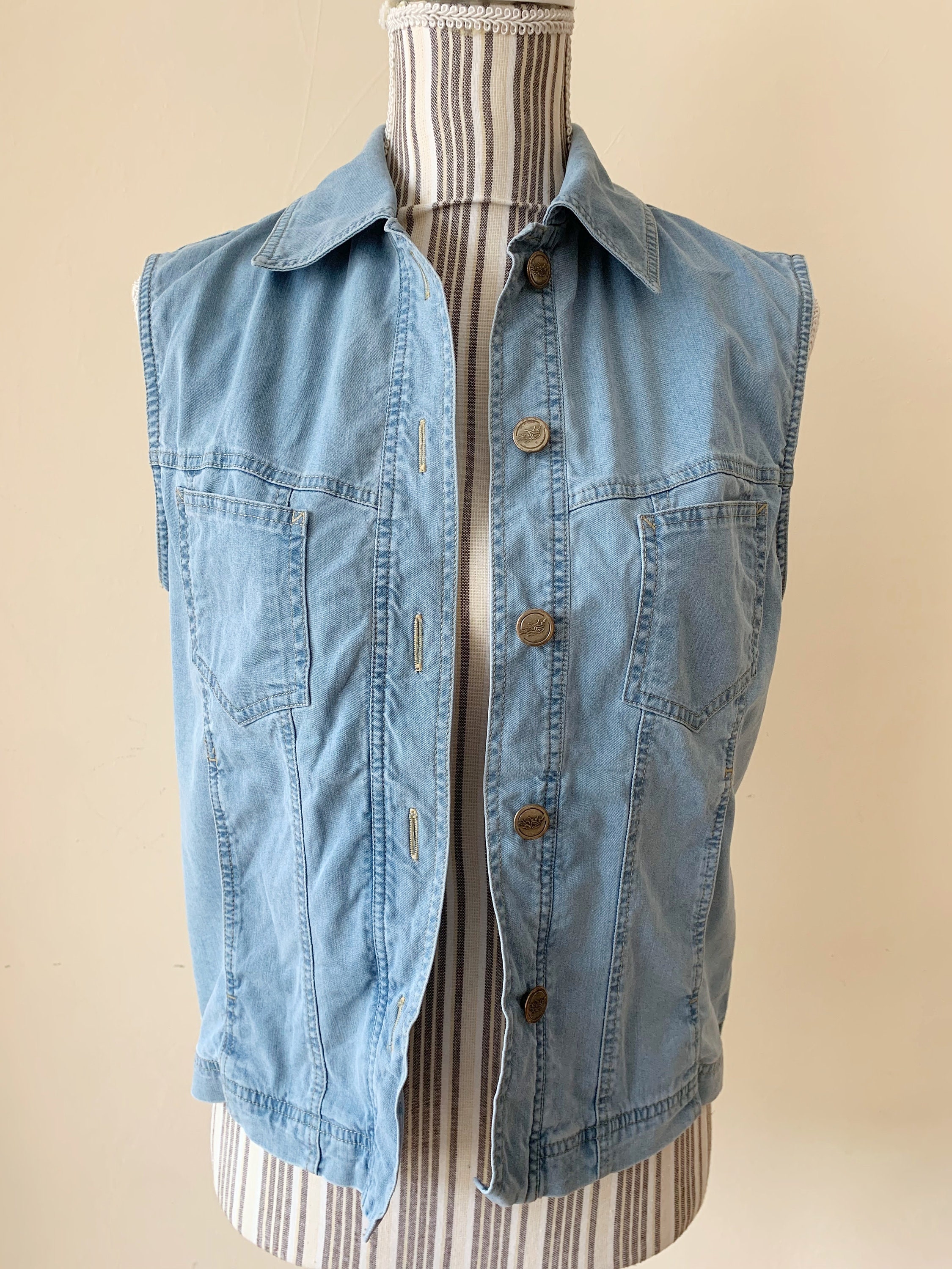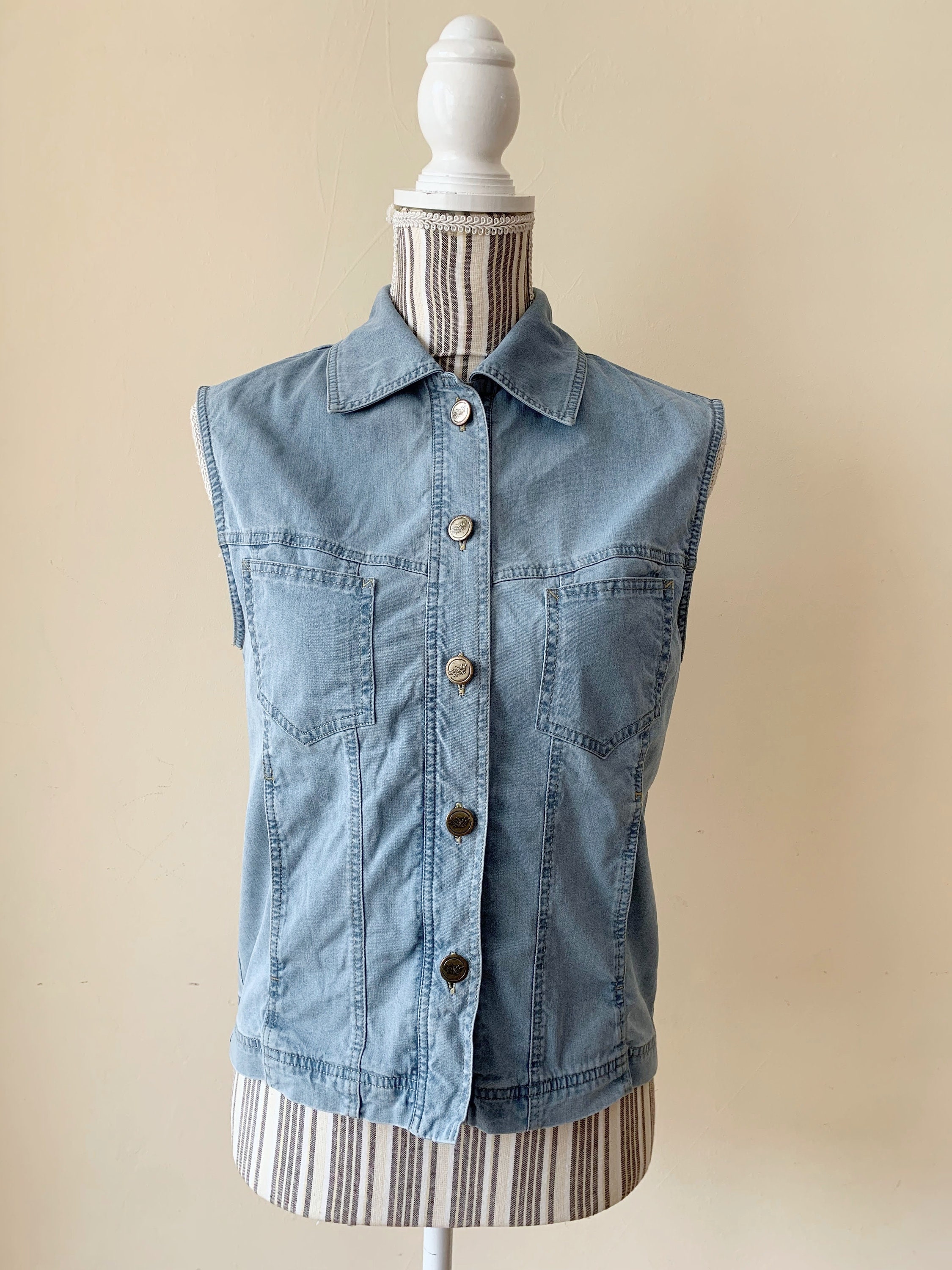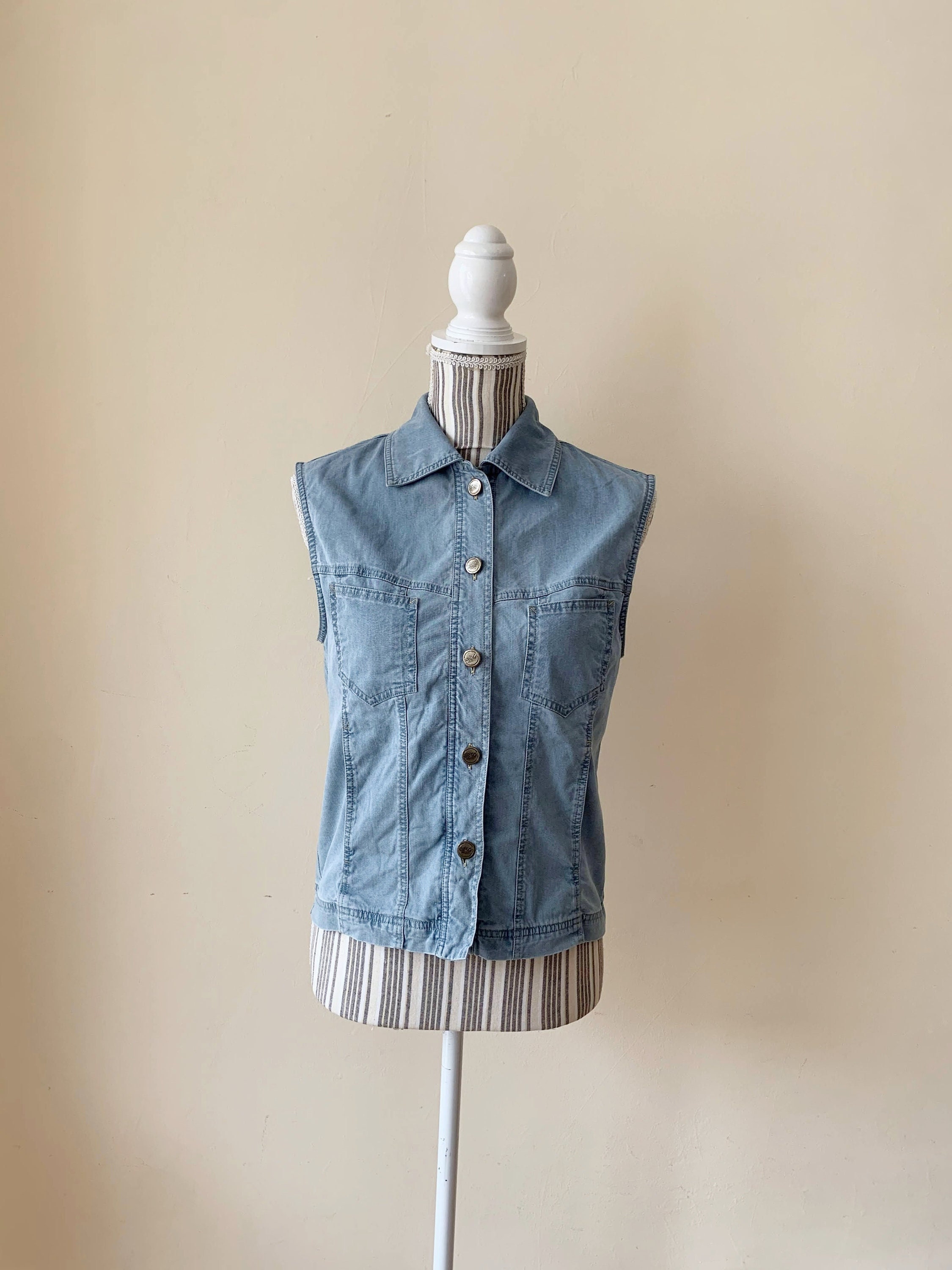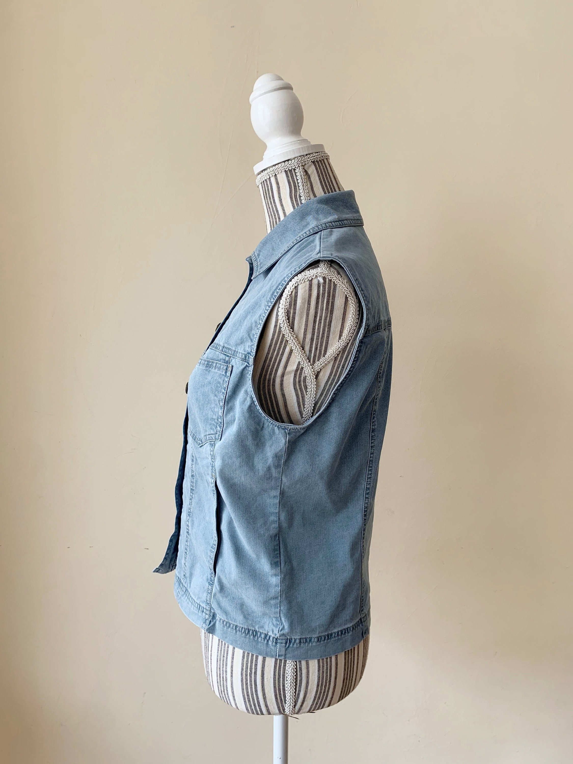 This is a light blue sleeveless jean jacket with front button up closure and high collar. This vintage 90s sleeveless denim vest has front pockets and gathered silhouette. This denim vest is by the brand La Strada. It is made of cotton blend denim fabric (80% cotton, 20% polyester). This jean vest is in pretty light blue color which has a faded look. This thin denim vest has no lining. The size marked on the label is US 36, which fits like S. This denim tank is the perfect outerwear over a floral flowy dress or with a shirt underneath.