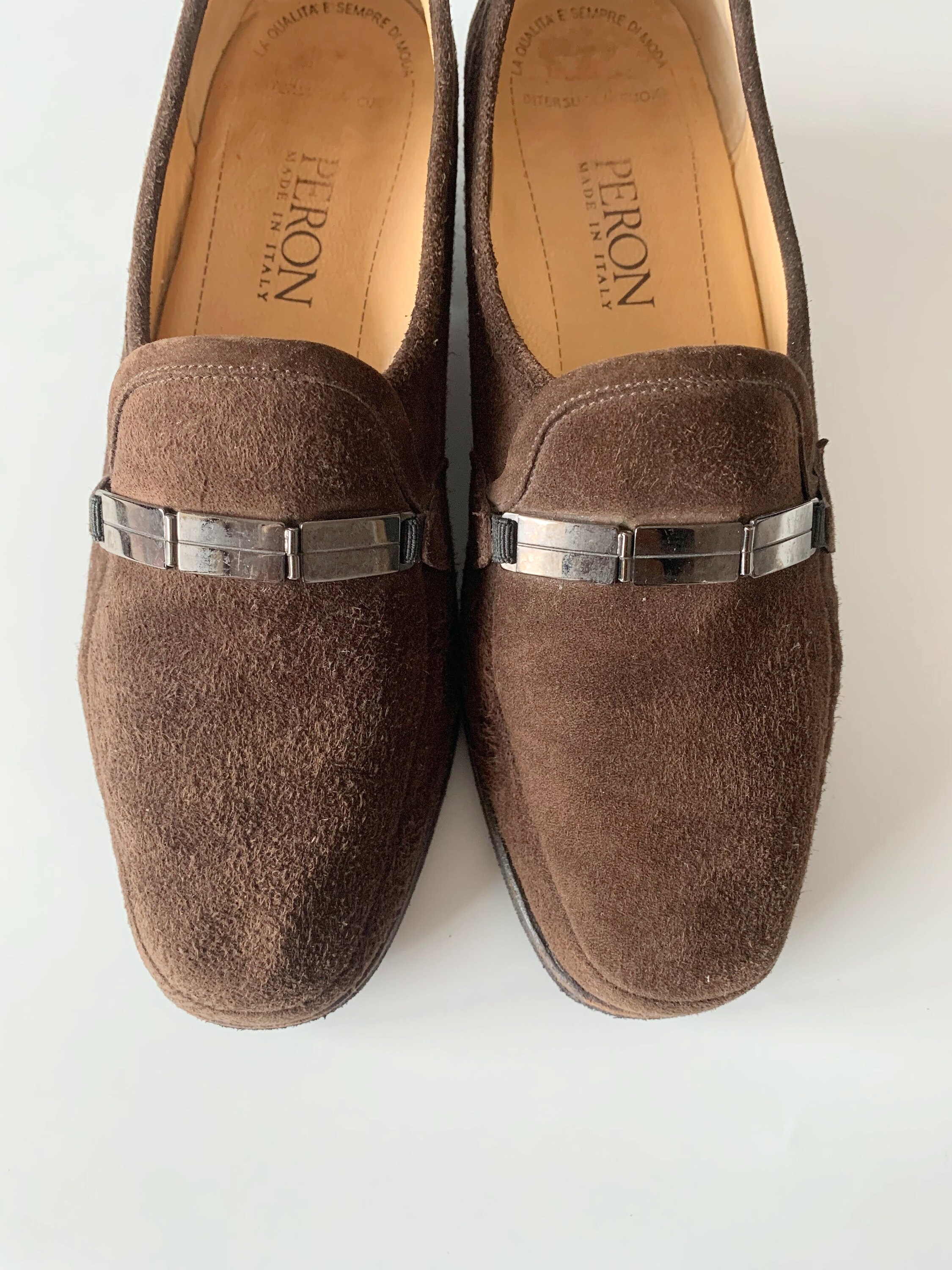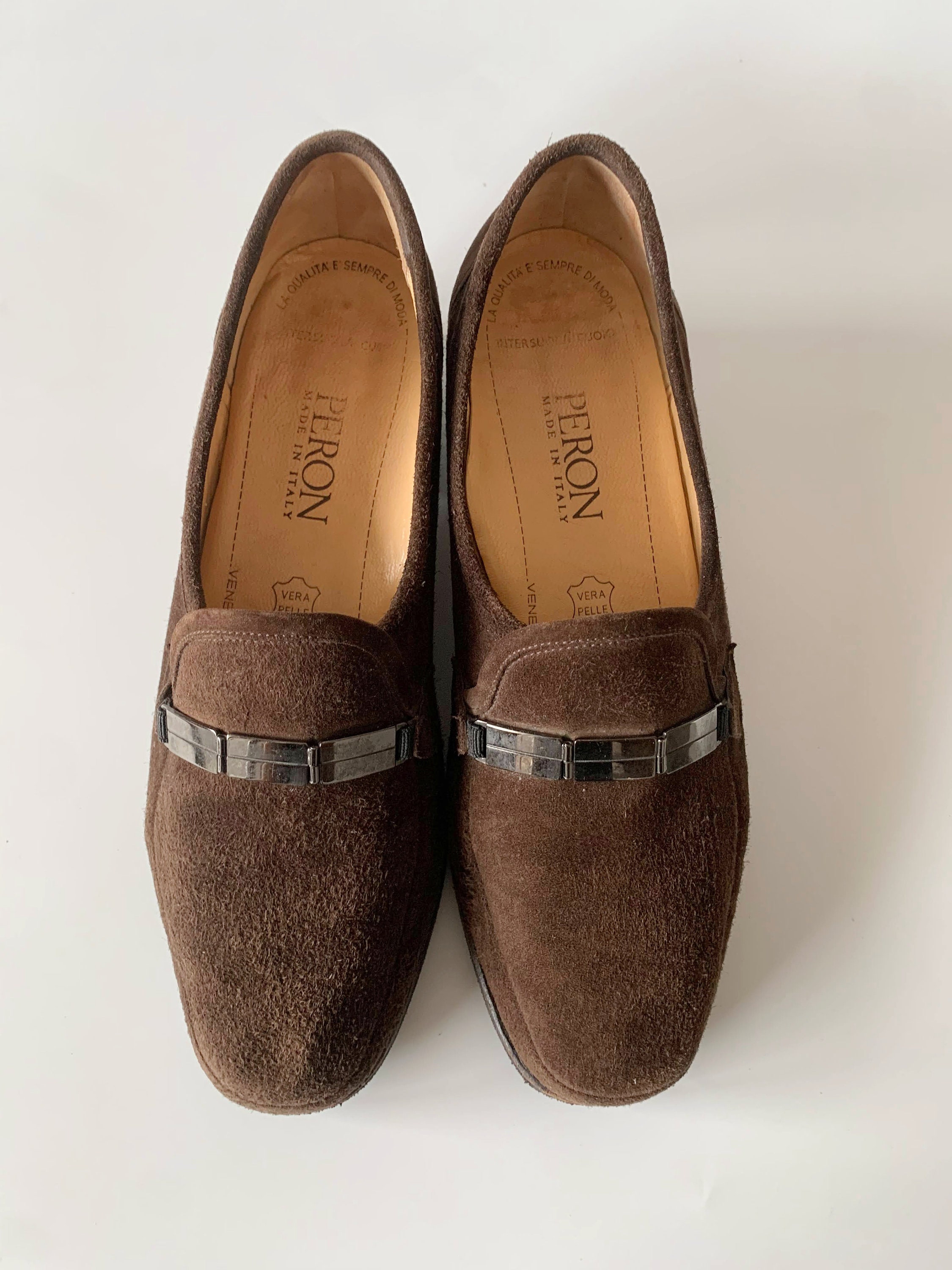 These are vintage 90s brown leather penny loafers for women size 39, which fit like US 8, UK 6. These brown slip on shoes were made in Italy by the brand Peron. These comfy granny moccasin are made of suede leather, real leather insoles with rubber soles. These granny moccasins have a low block heel and they are super comfy to walk in all day long. You would look stylish and yet comfortable. Perfect daily flats that your feet will love. The size marked is EUR 39 , which fits like US 8, UK 6. Please check the measurements below.