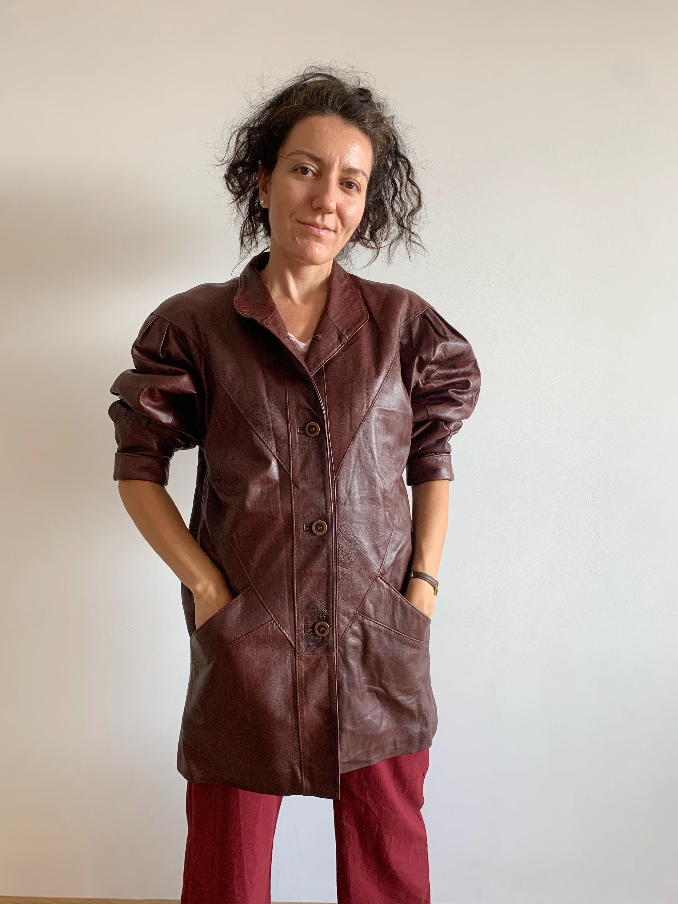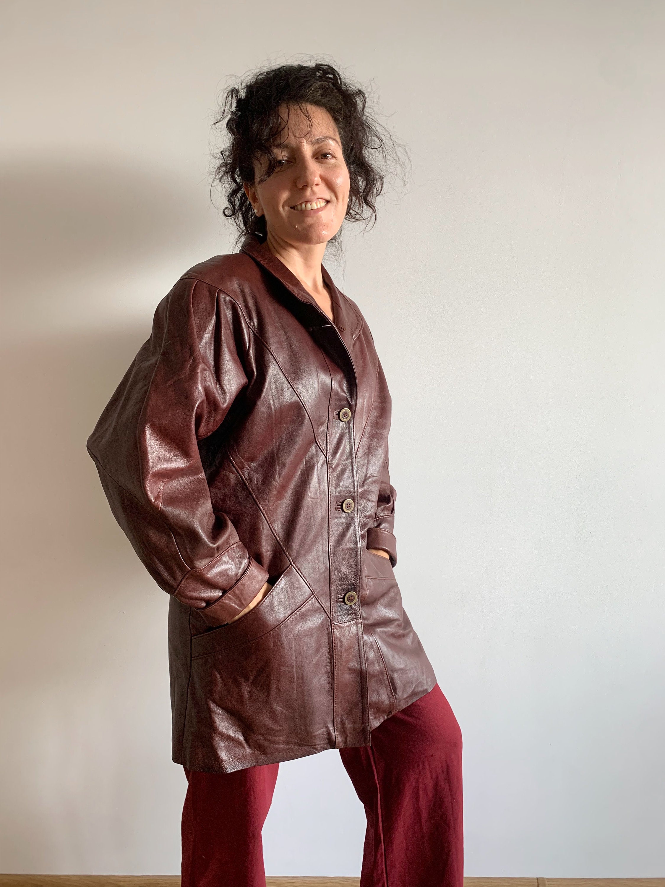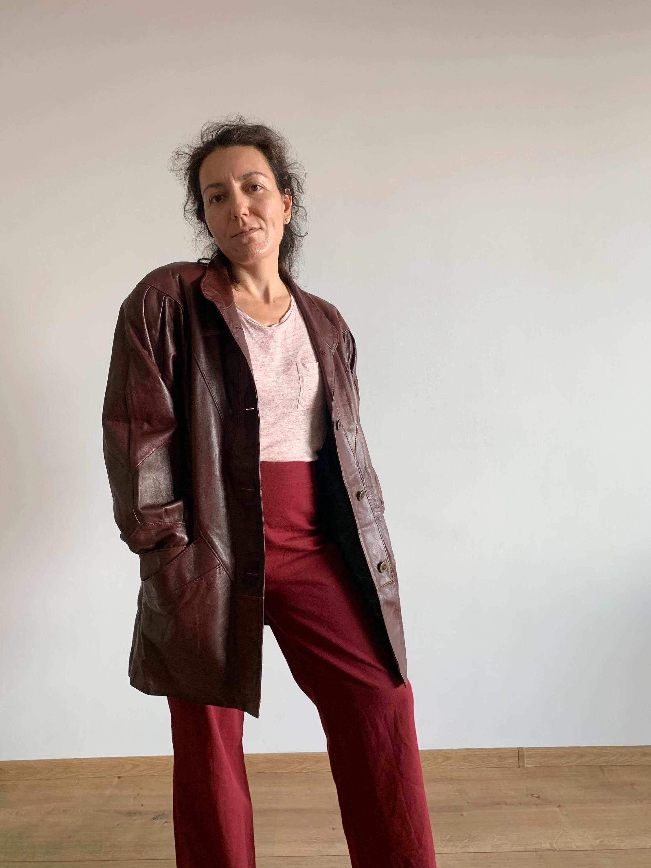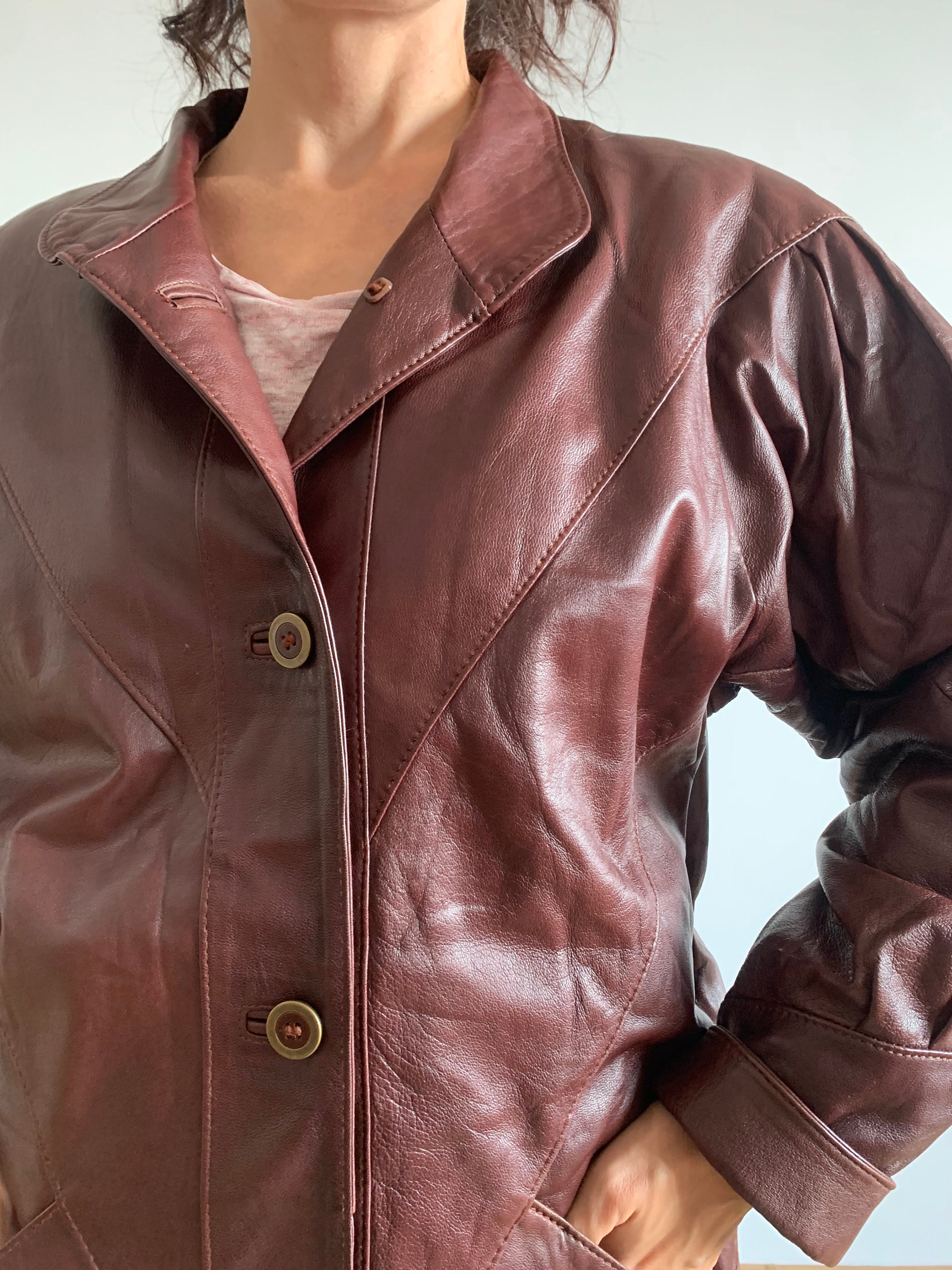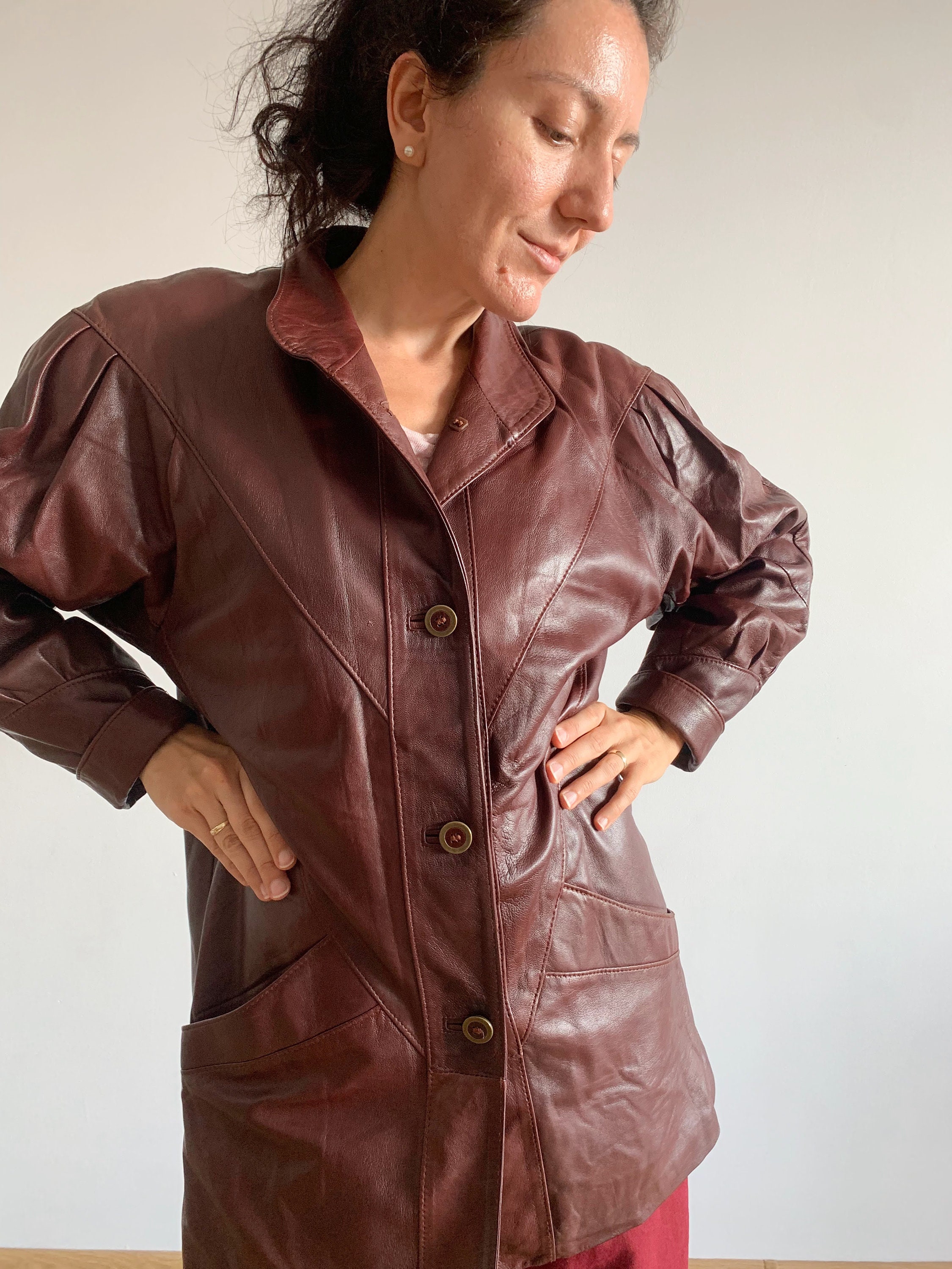 This is a vintage 80s oversized genuine leather jacket for women size 34 S. This relaxed fit boxy jacket has wide statement shoulders and loose fit silhouette. It has wide batwing sleeves. This long bulky jacket has button front closure and two front pockets. This burgundy leather jacket has polyester lining. This oversized leather jacket is size 34 which fits like size S, however it fits quit oversized, it would also fit size M/L. I am modelling the jacket and I wear size S EUR 36, US 6, UK 10. Please check the measurements below.