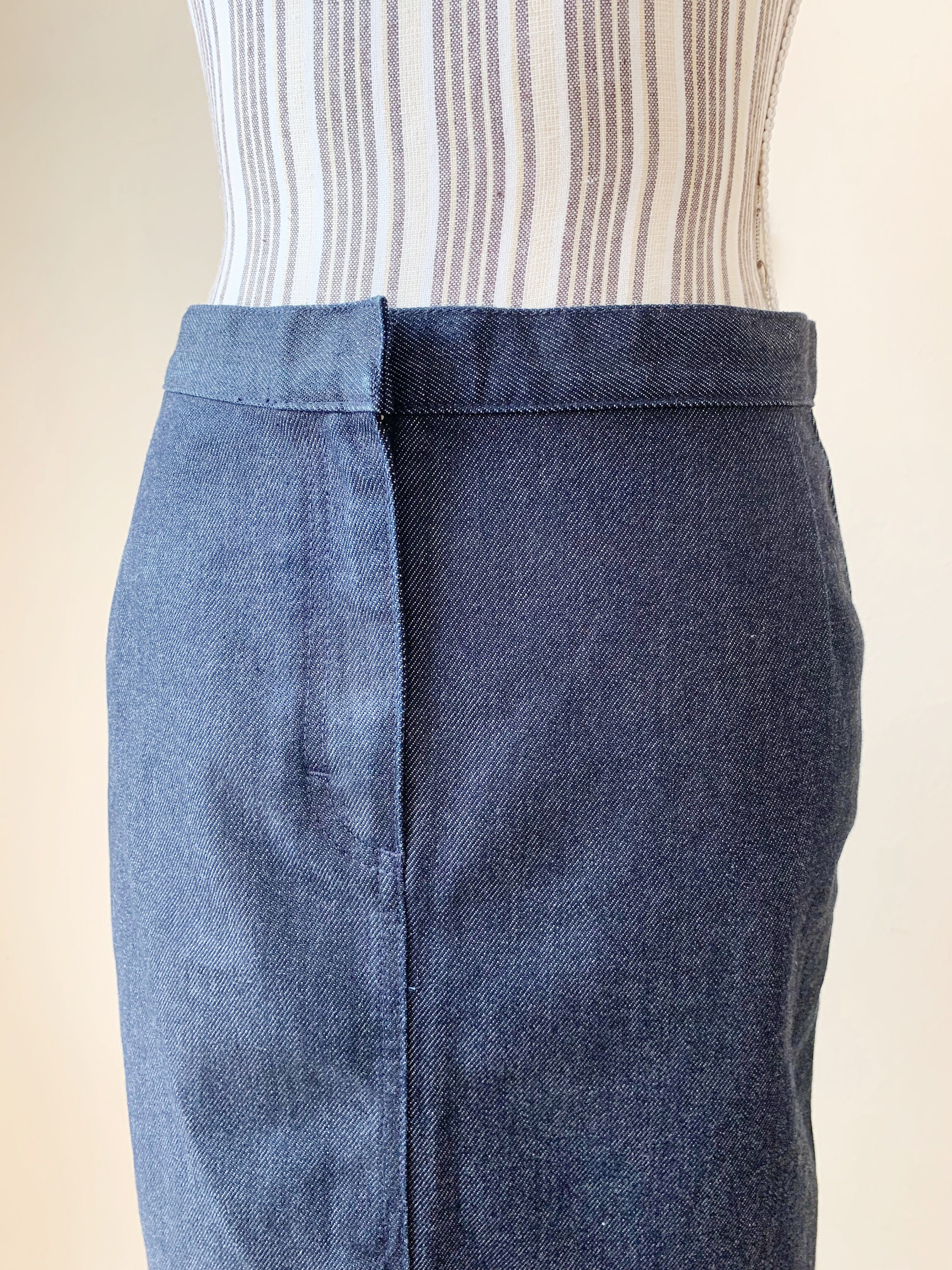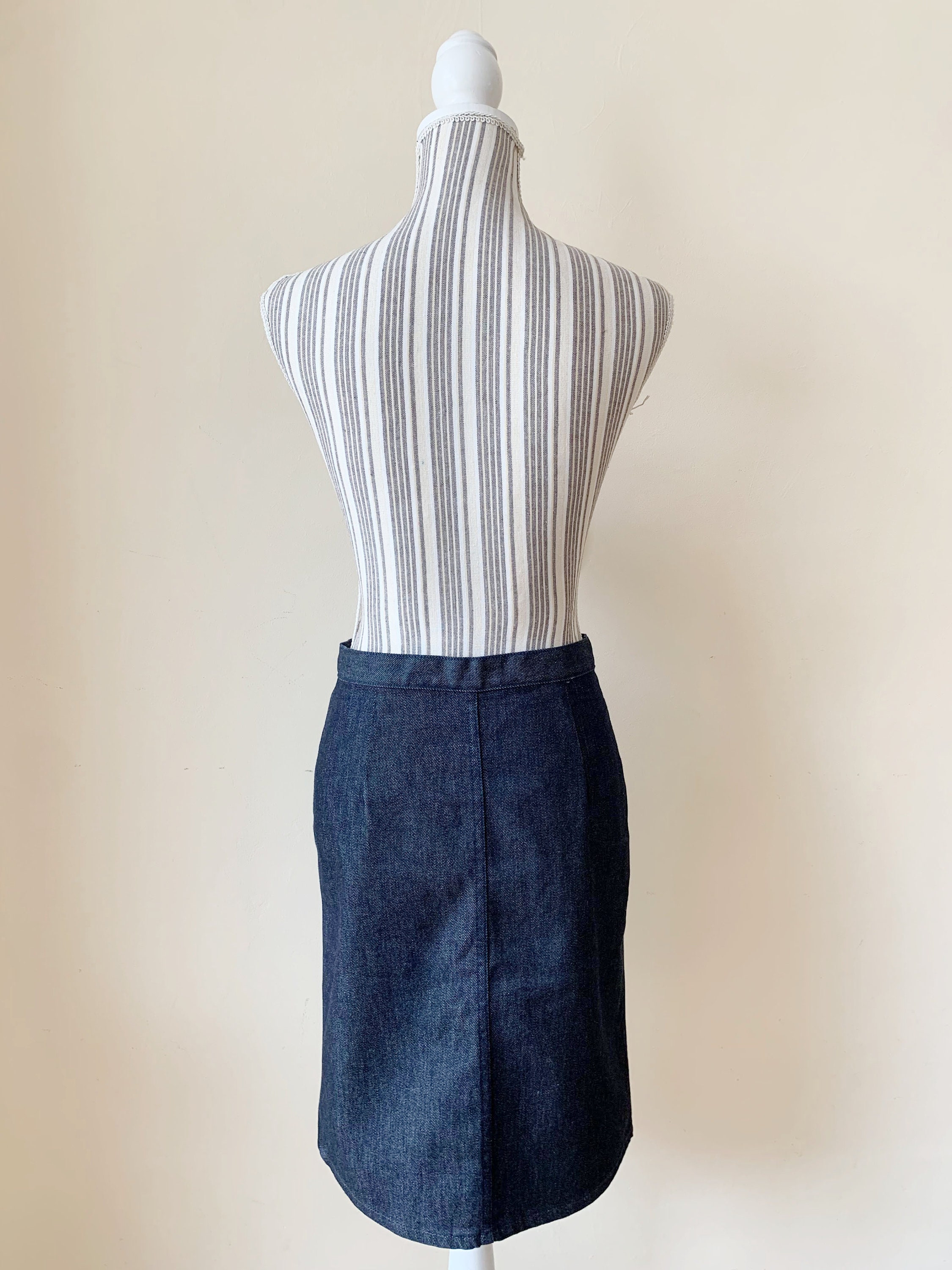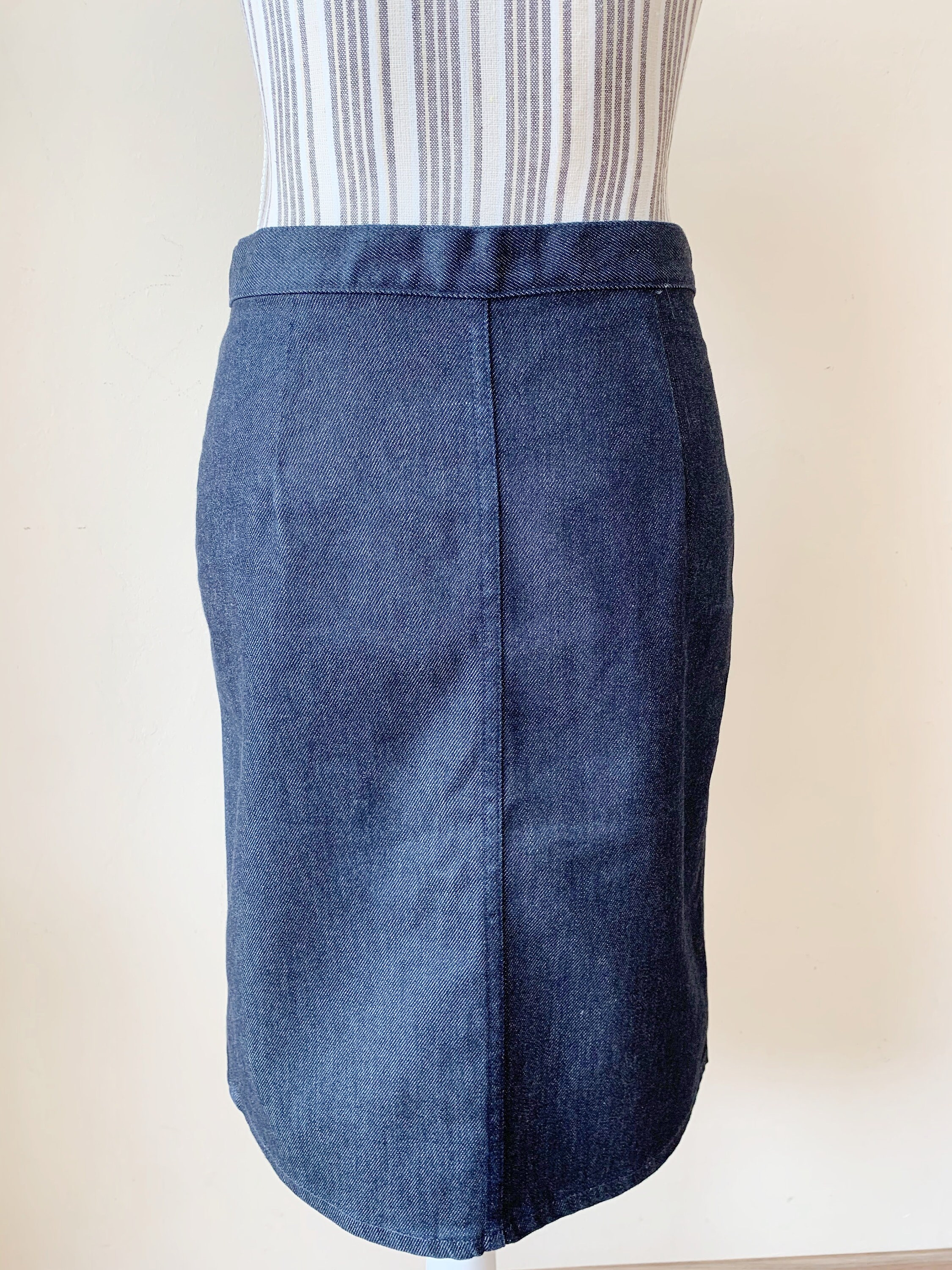 This is a vintage midi denim skirt by the brand Sisley. This casual above the knee denim pencil skirt has a fited silhouette and front split. This sexy wiggle midi denim skirt is the perfect preppy skirt that you can put on whenever you feel you have nothing to wear. This midi skirt is made of cotton denim fabric which has a little bit of stretch (the fabric is 98% cotton, 2% elastane). The size marked is 42, it fits like size S.
