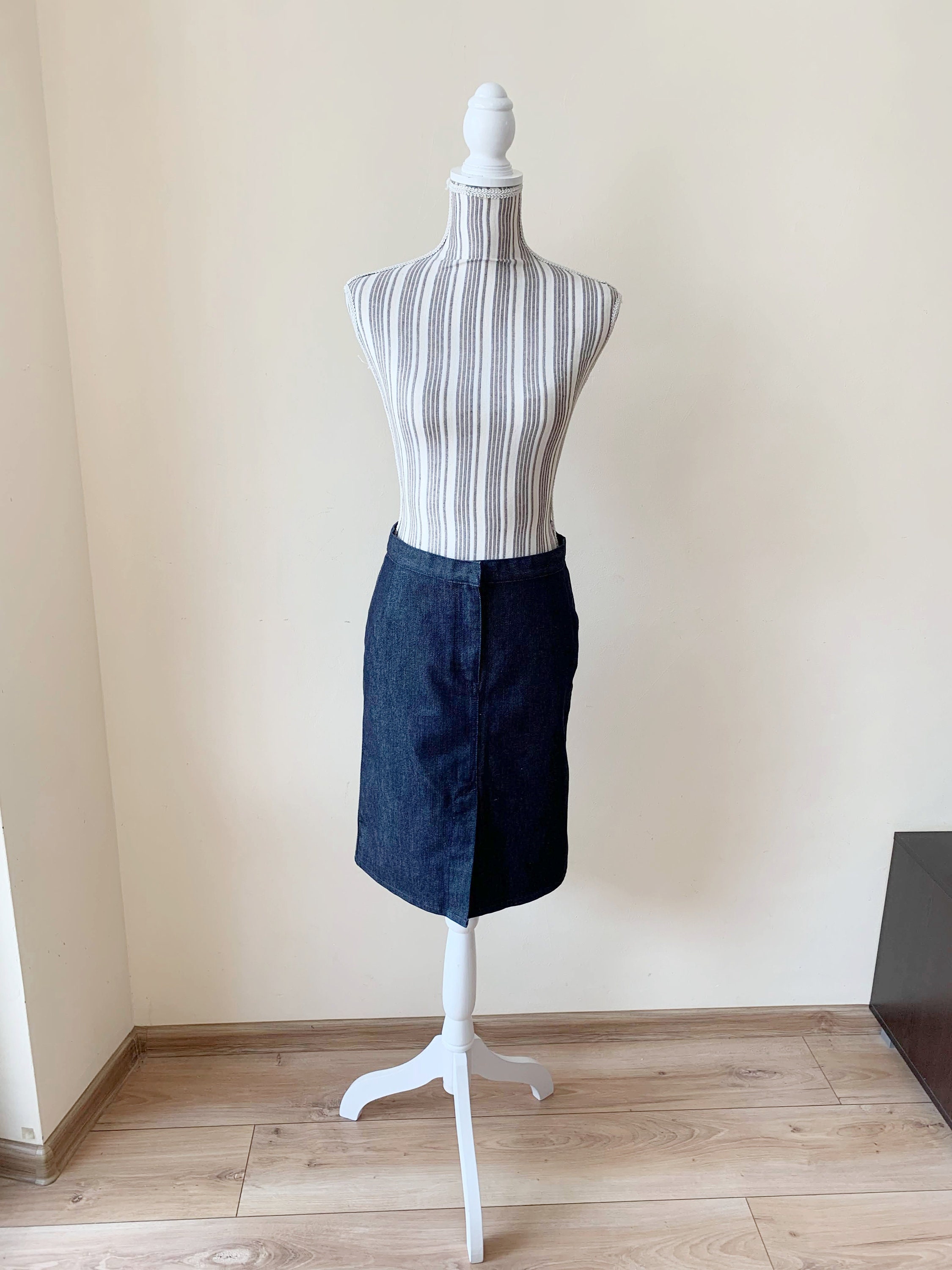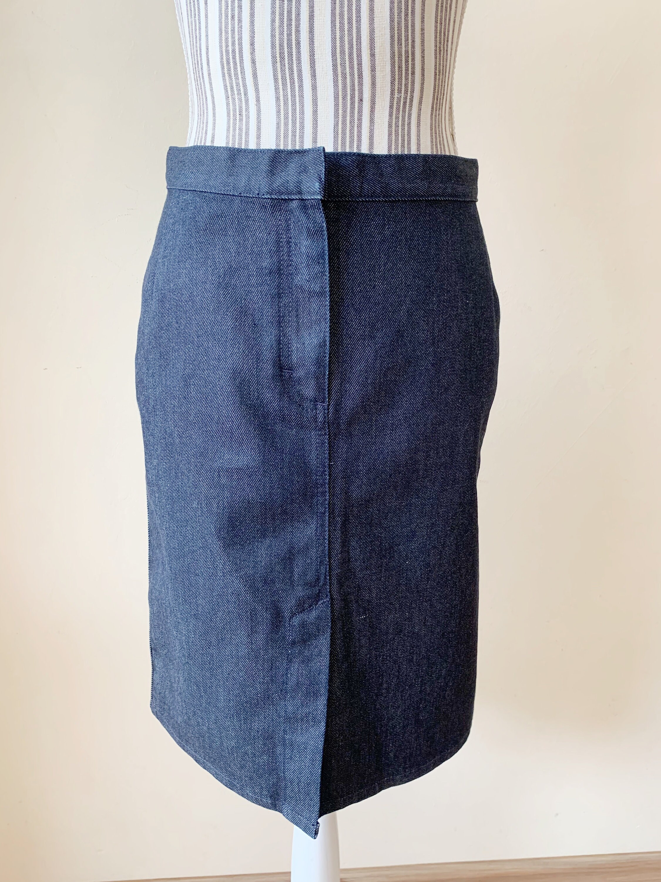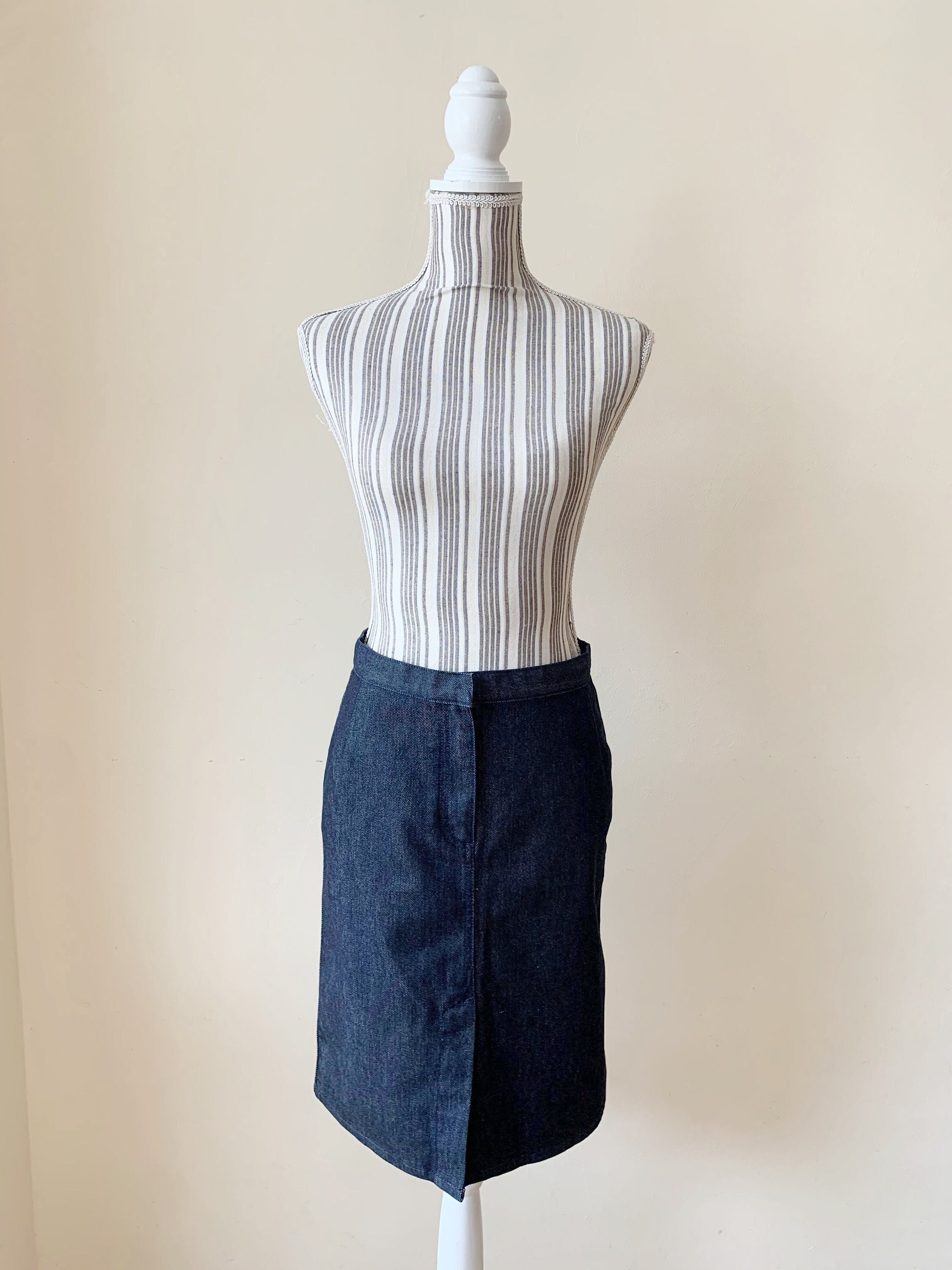 This is a vintage midi denim skirt by the brand Sisley. This casual above the knee denim pencil skirt has a fited silhouette and front split. This sexy wiggle midi denim skirt is the perfect preppy skirt that you can put on whenever you feel you have nothing to wear. This midi skirt is made of cotton denim fabric which has a little bit of stretch (the fabric is 98% cotton, 2% elastane). The size marked is 42, it fits like size S.