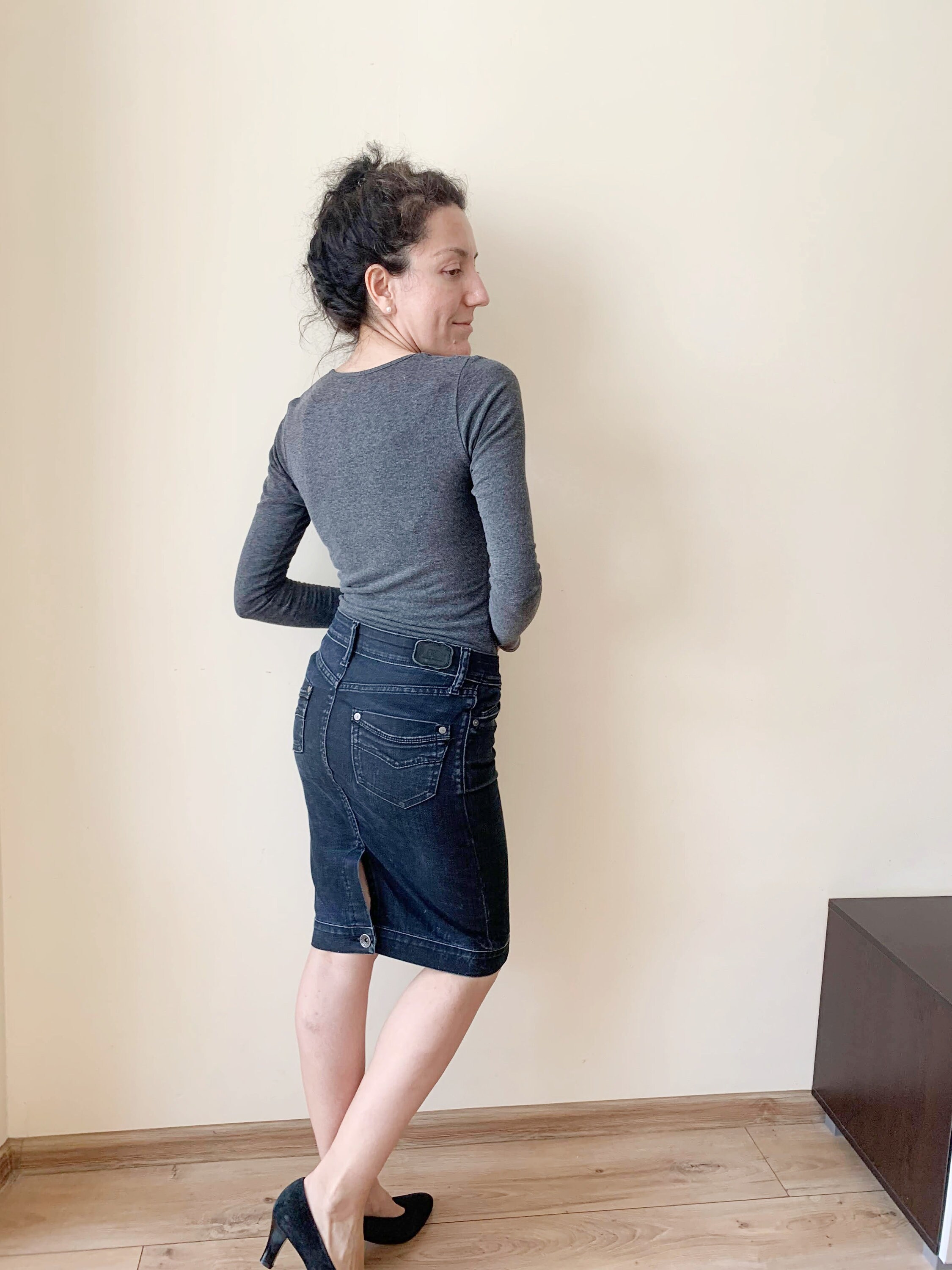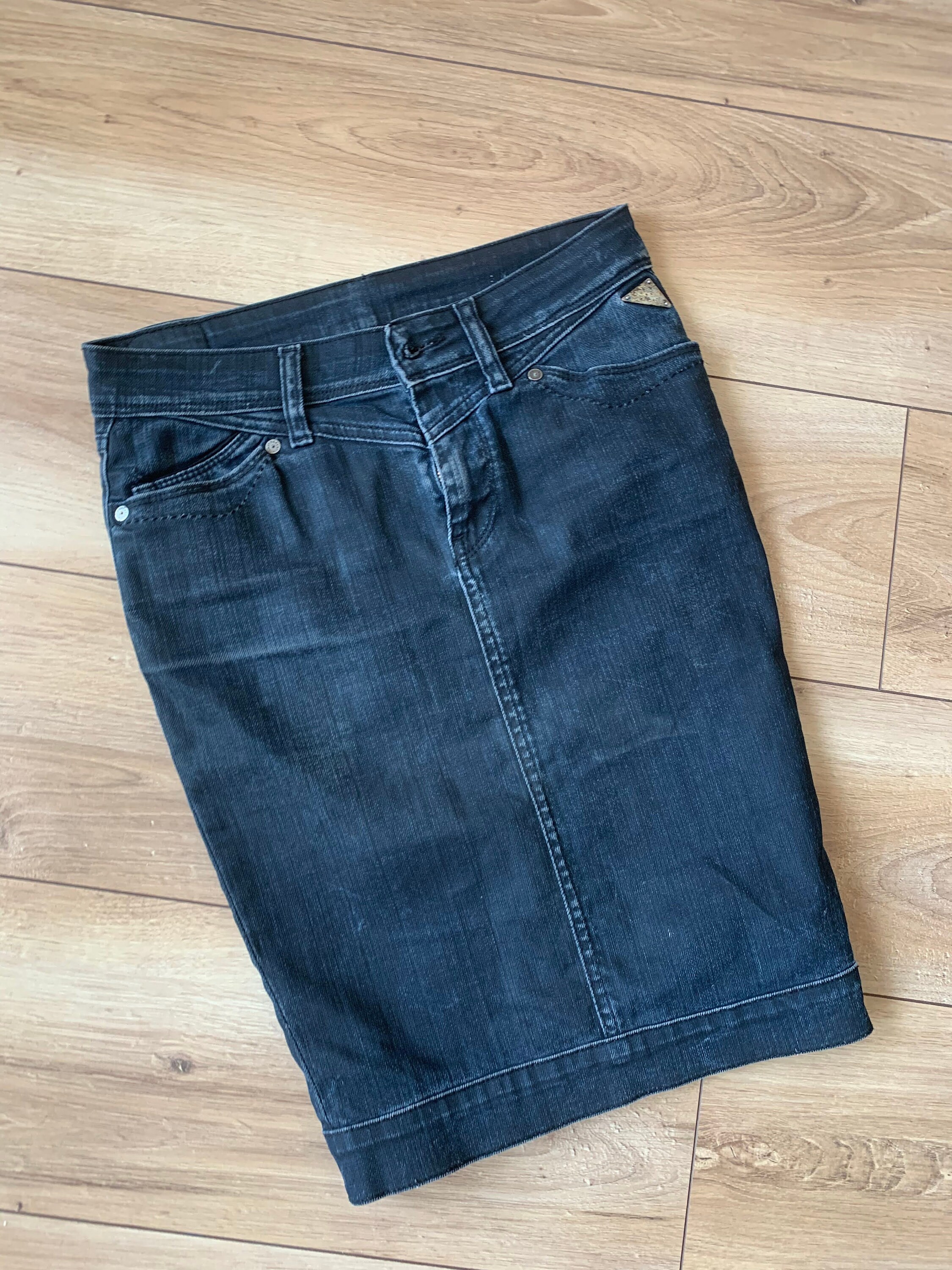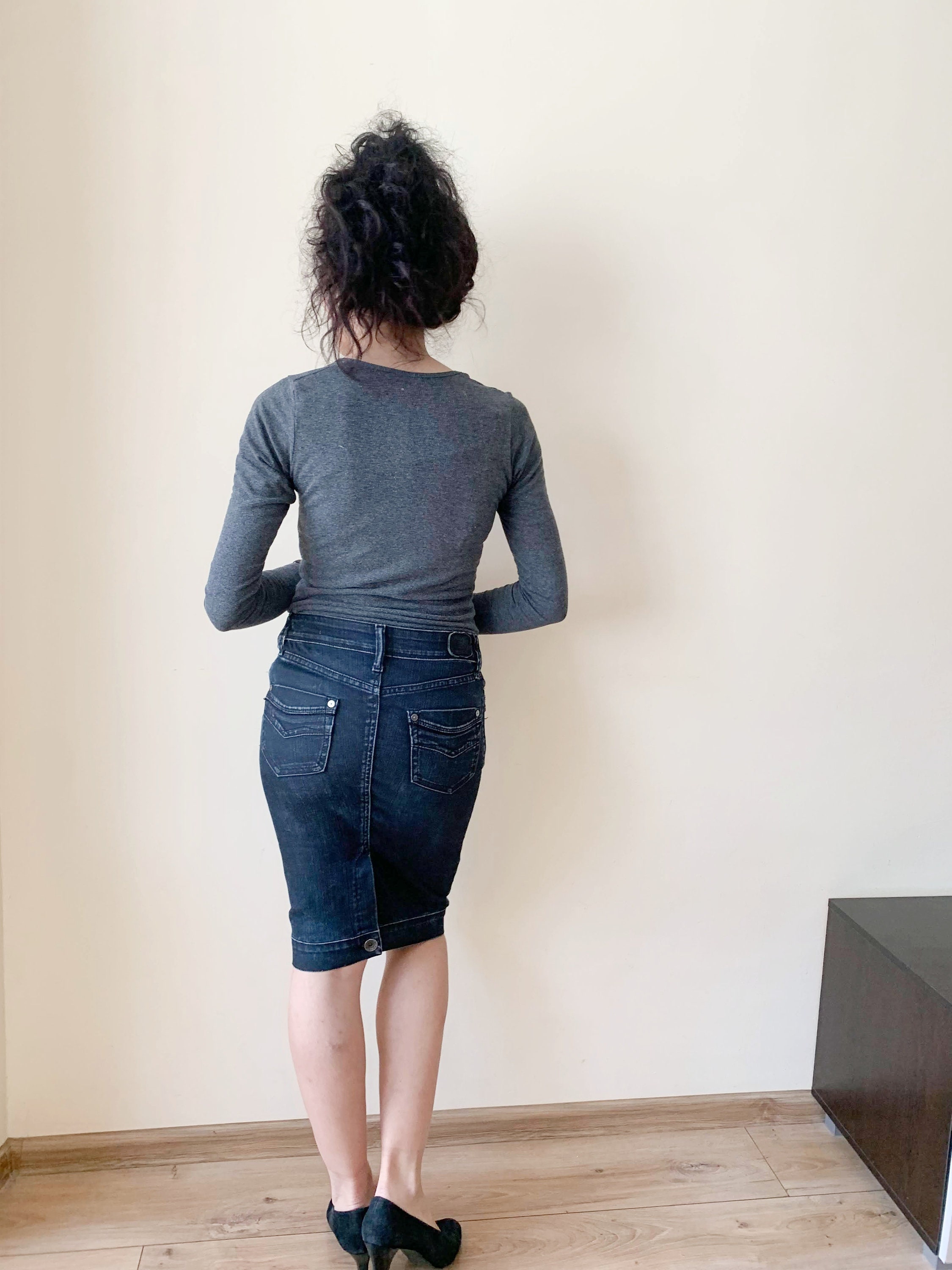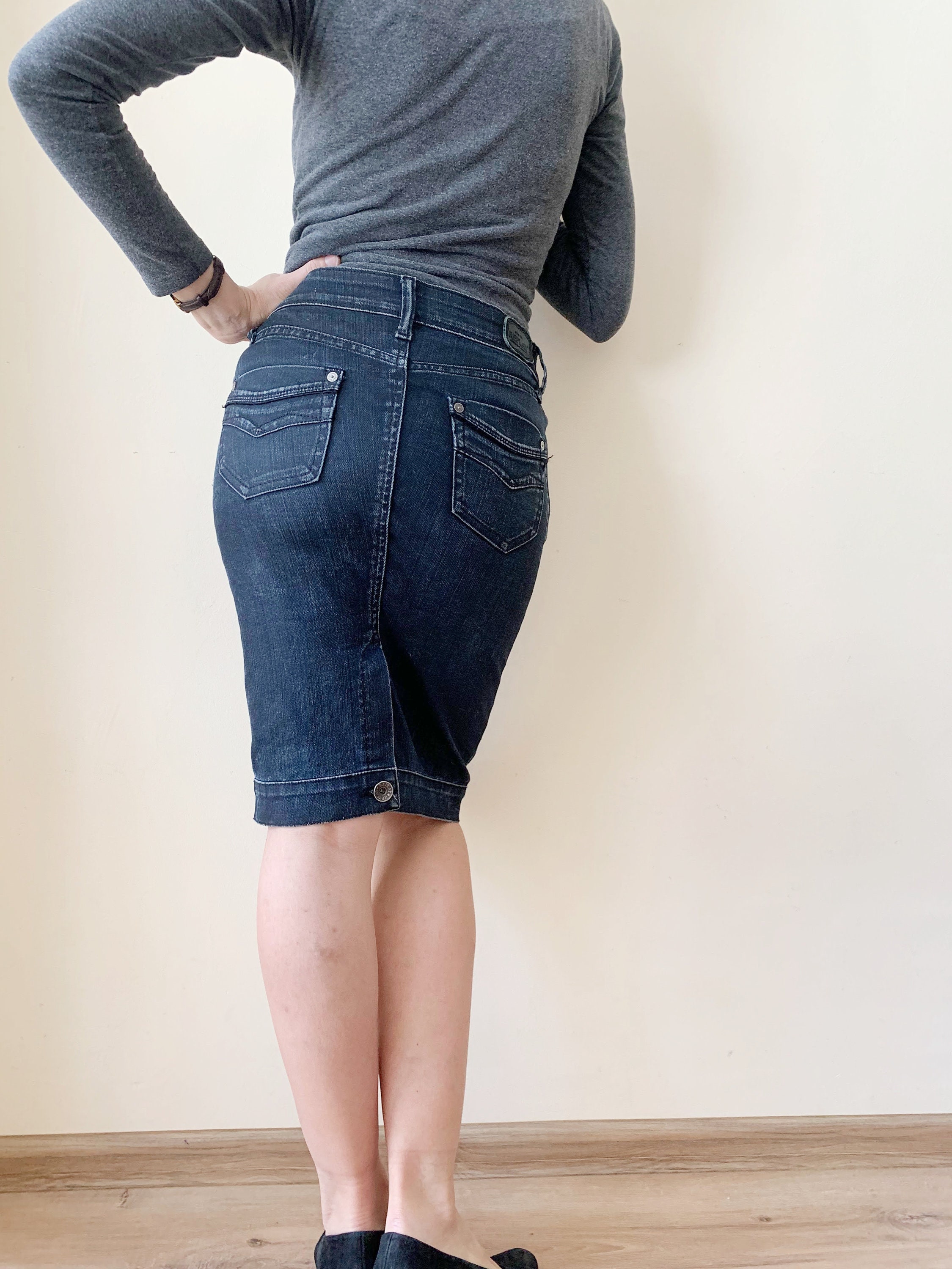 This is a vintage midi denim skirt by the brand Replay. This casual knee length denim pencil skirt has a fitted silhouette and back slit with button. This sexy wiggle midi denim skirt is the perfect preppy skirt that you can put on whenever you feel you have nothing to wear. This midi skirt is made of cotton denim fabric which has a good bit of stretch (the fabric is 87% cotton, 11% polyamide 2% elastane). The size marked is 26, it fits like size S. I am modelling this denim midi skirt. I wear size S, EUR 36, US 6, UK 10. Please check the measurements below.