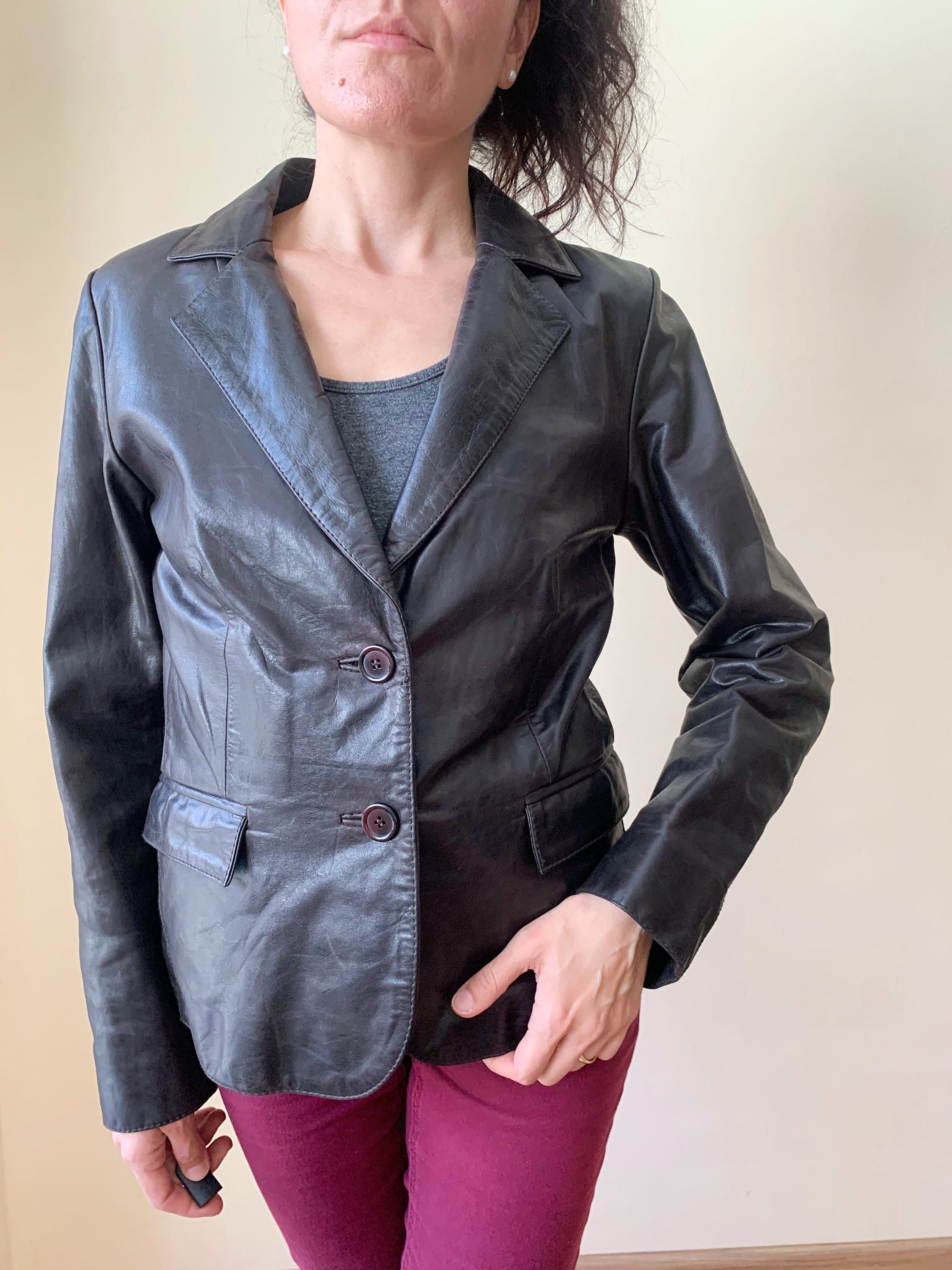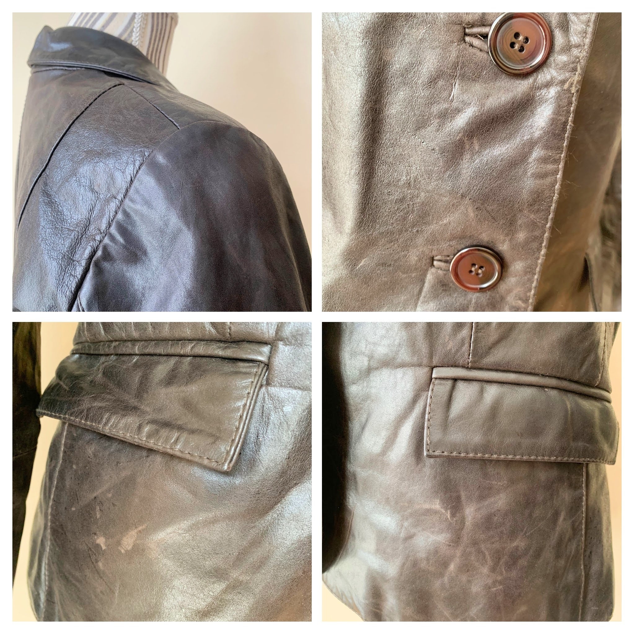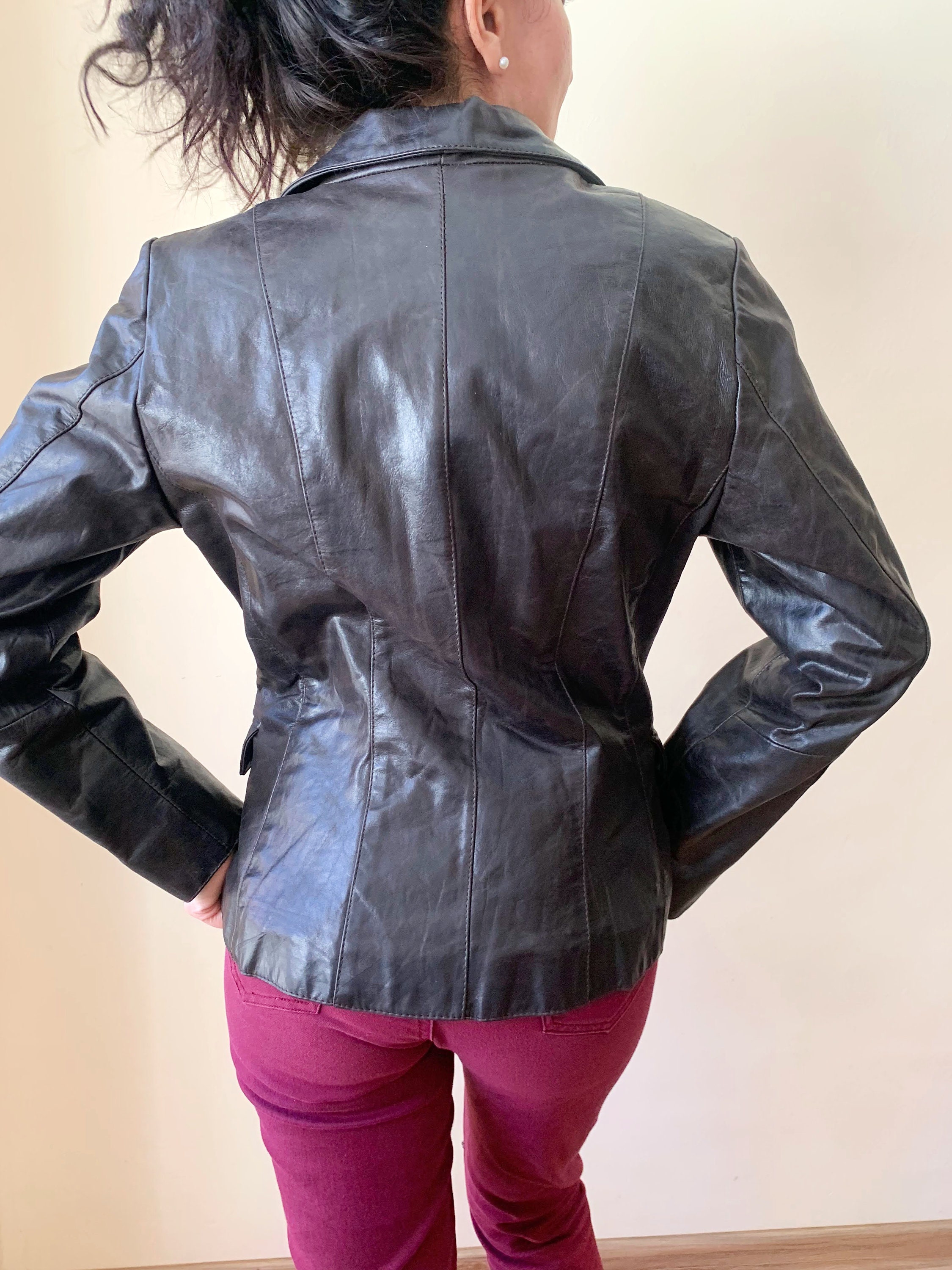 This is a vintage 90s brown leather blazer for women by the brand Aleksander. This dark brown leather blazer has two button closure and fitted silhouette. It is made of sturdy well worn leather which has a distressed look due to the wear. There are multiple scratches on the leather surface. This grunge leather jacket has two front pockets. It has light polyester lining. This cropped leather blazer is the perfect outerwear for any season - fall, spring, summer and even in the winter if you like in warmer climate. The size marked on this leather jacket for women is 36, it fits like size S small. Please check the measurements below.