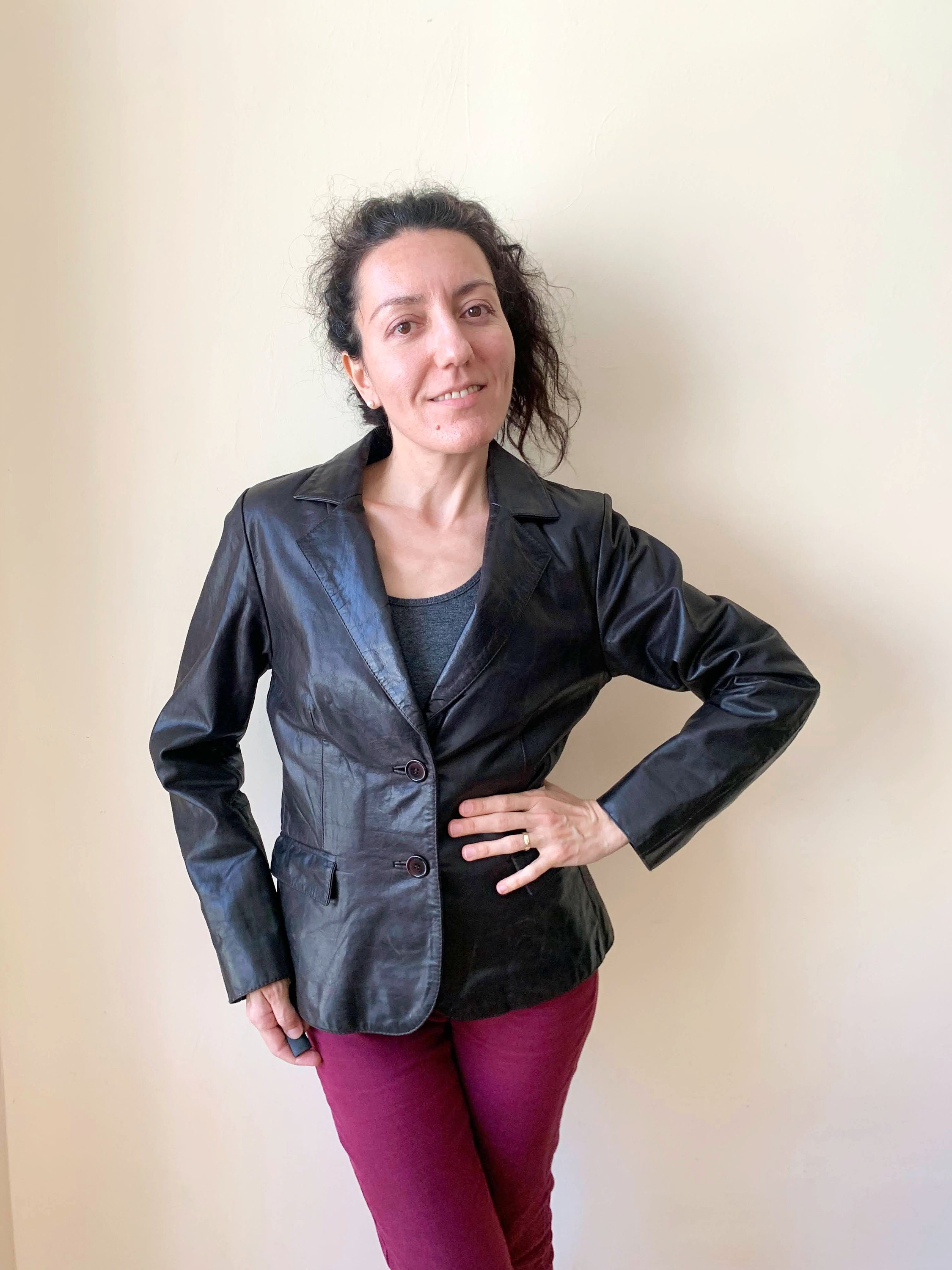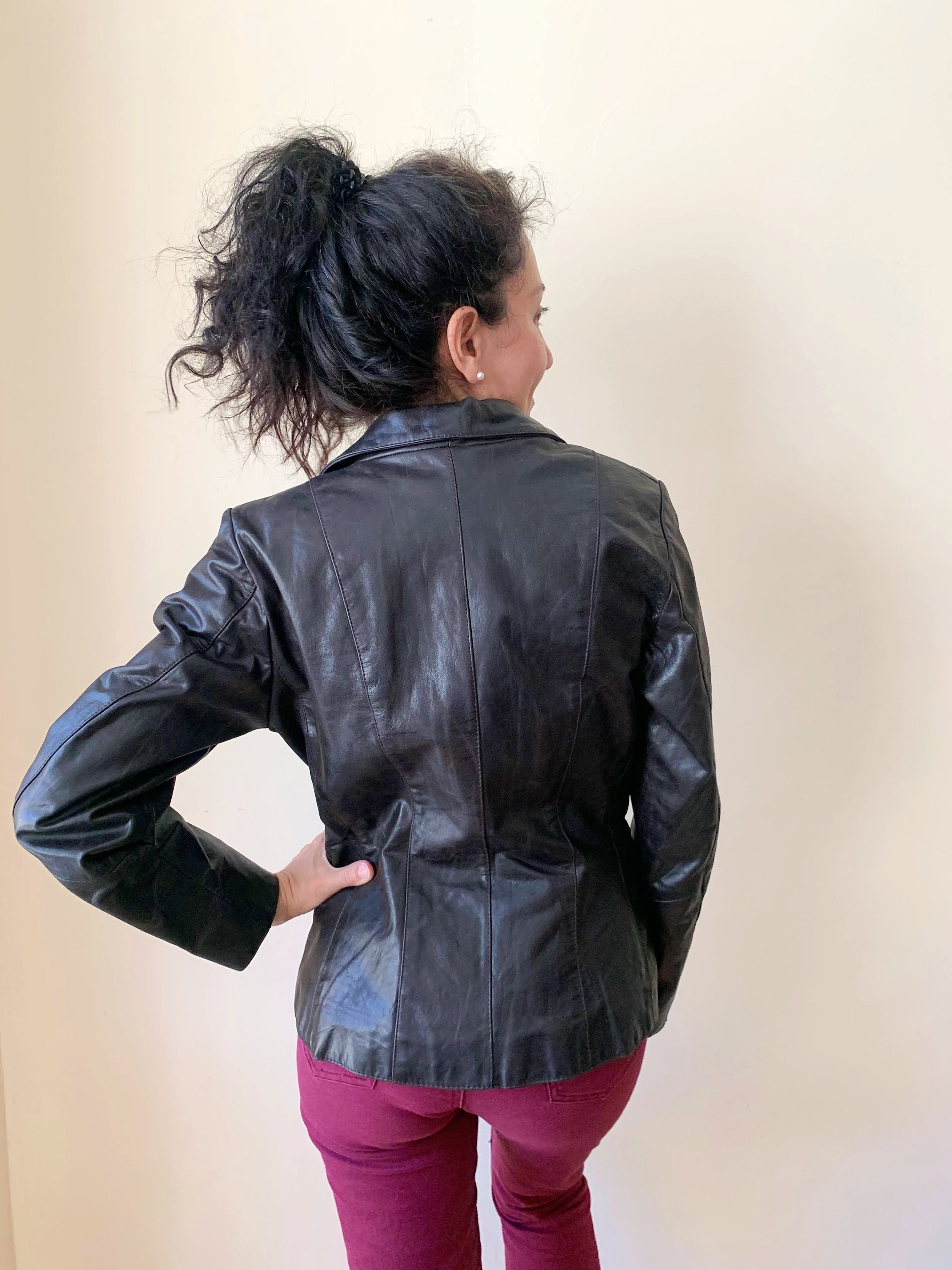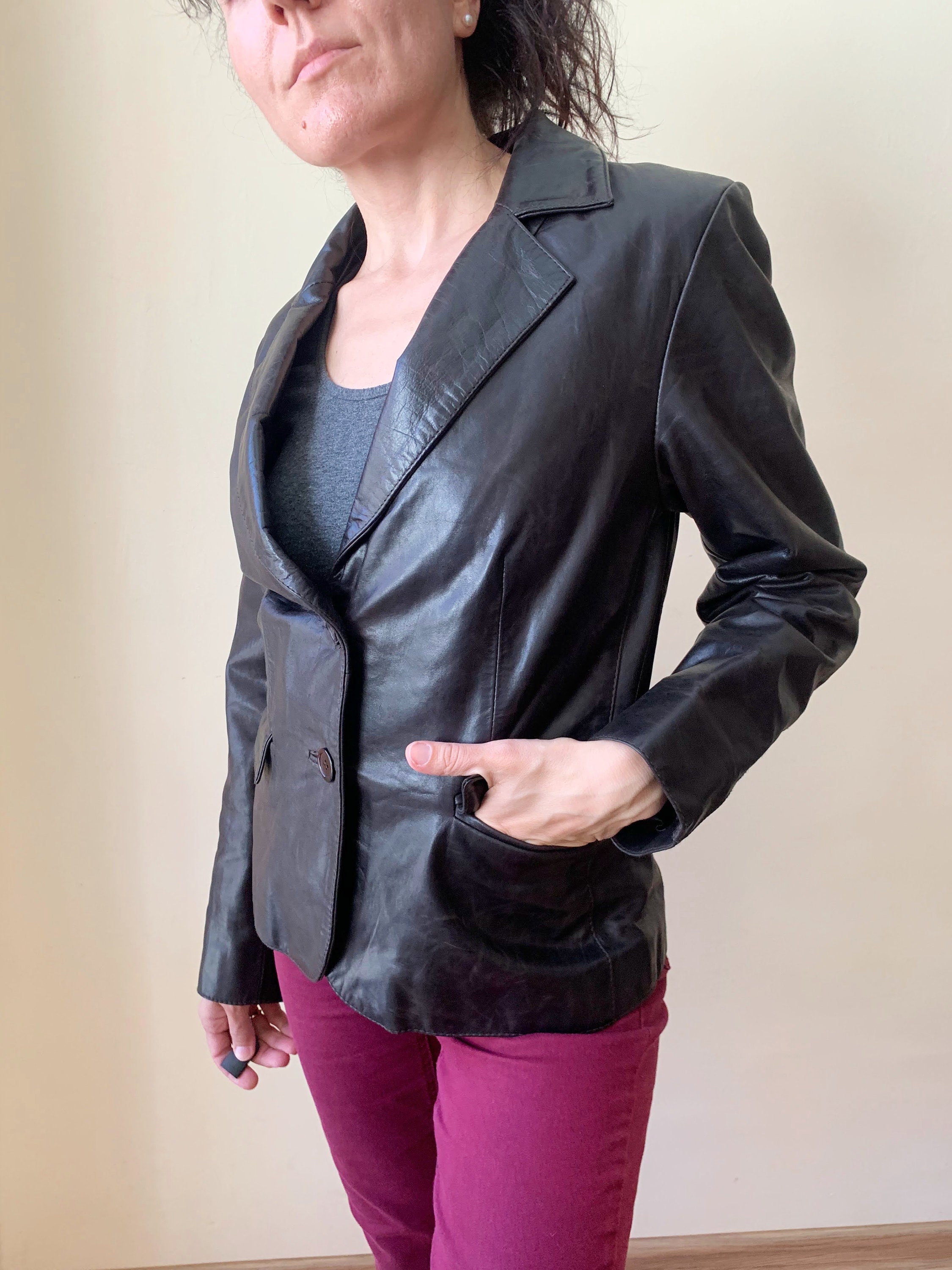 This is a vintage 90s brown leather blazer for women by the brand Aleksander. This dark brown leather blazer has two button closure and fitted silhouette. It is made of sturdy well worn leather which has a distressed look due to the wear. There are multiple scratches on the leather surface. This grunge leather jacket has two front pockets. It has light polyester lining. This cropped leather blazer is the perfect outerwear for any season - fall, spring, summer and even in the winter if you like in warmer climate. The size marked on this leather jacket for women is 36, it fits like size S small. Please check the measurements below.