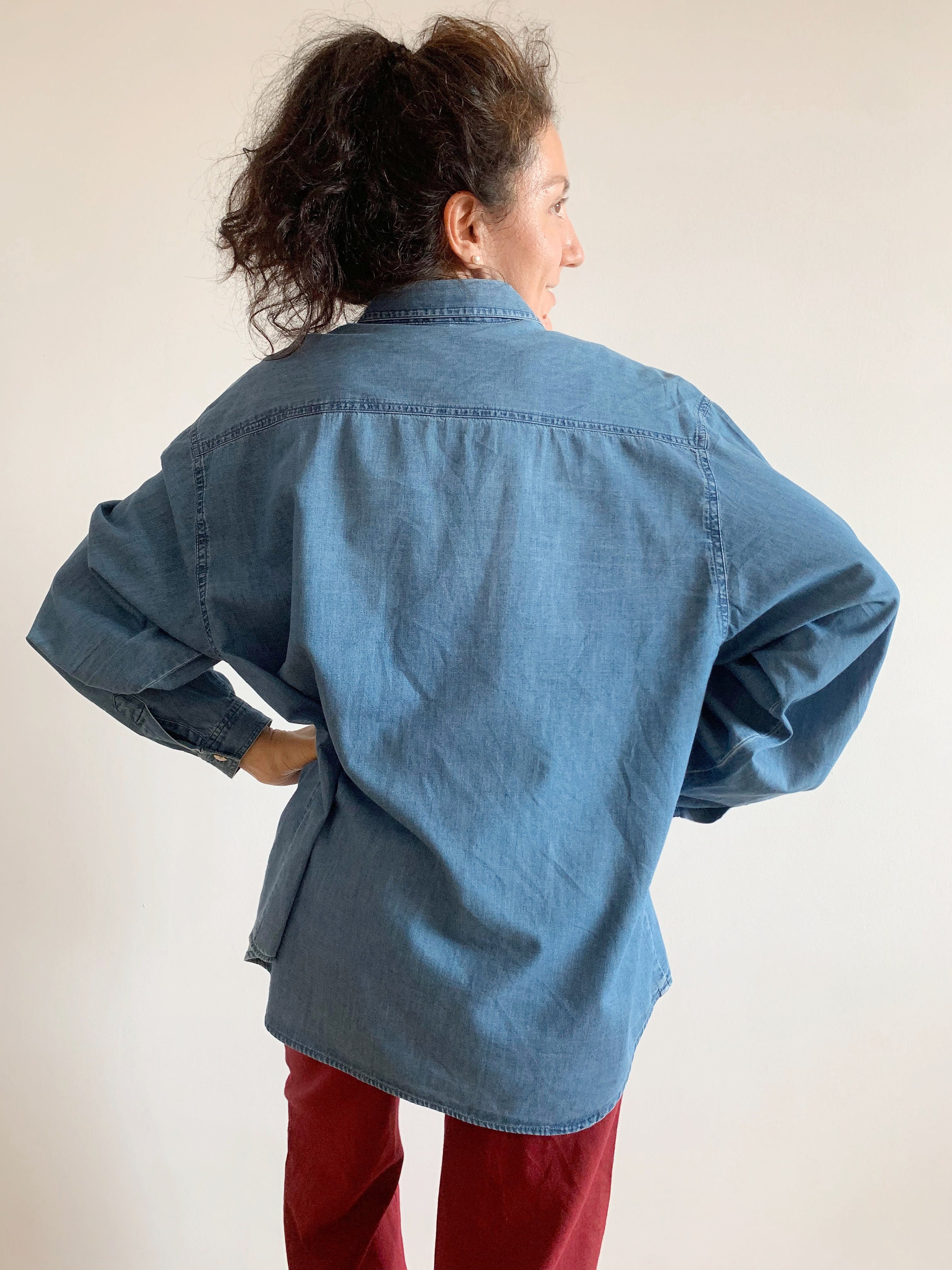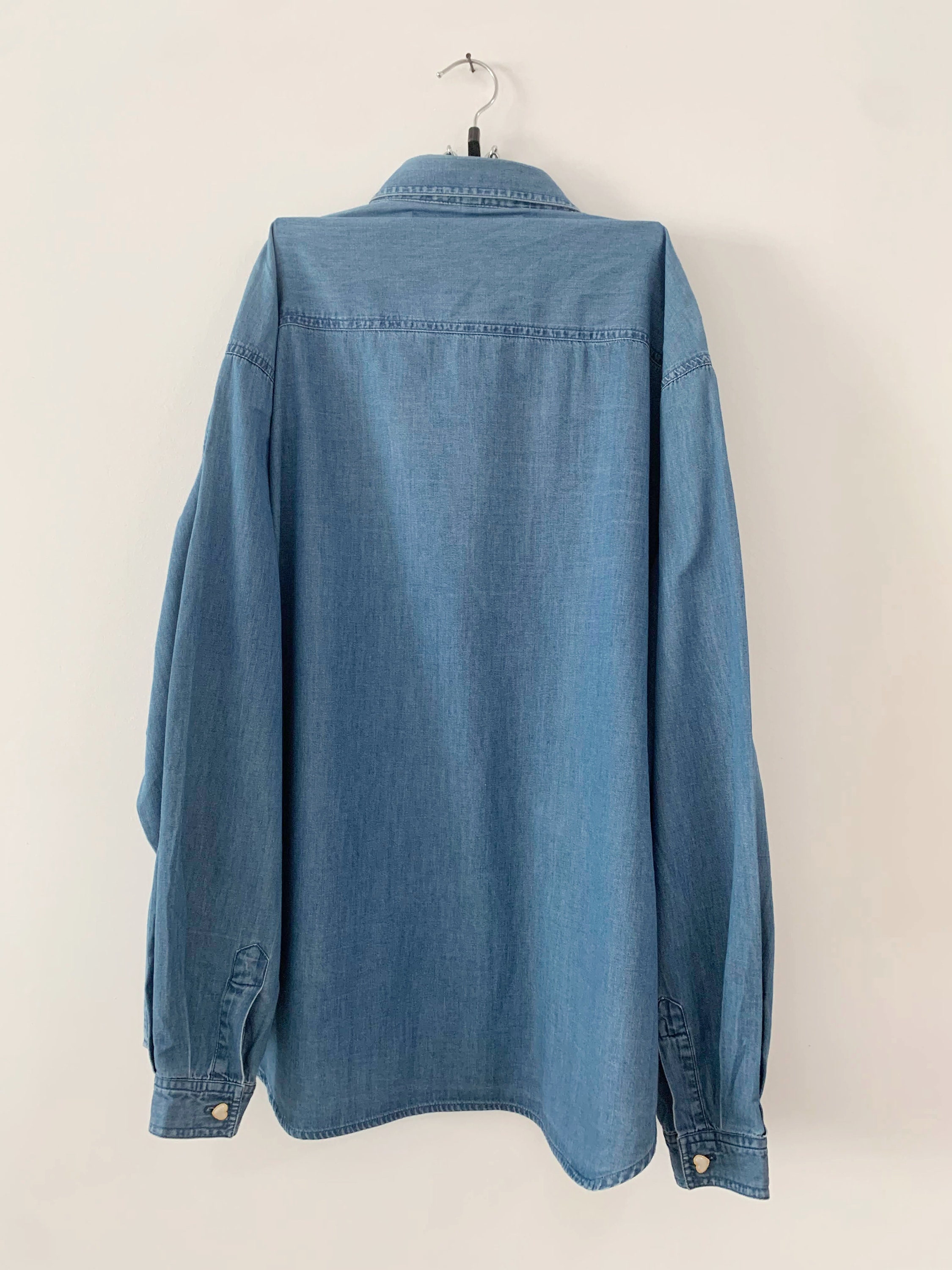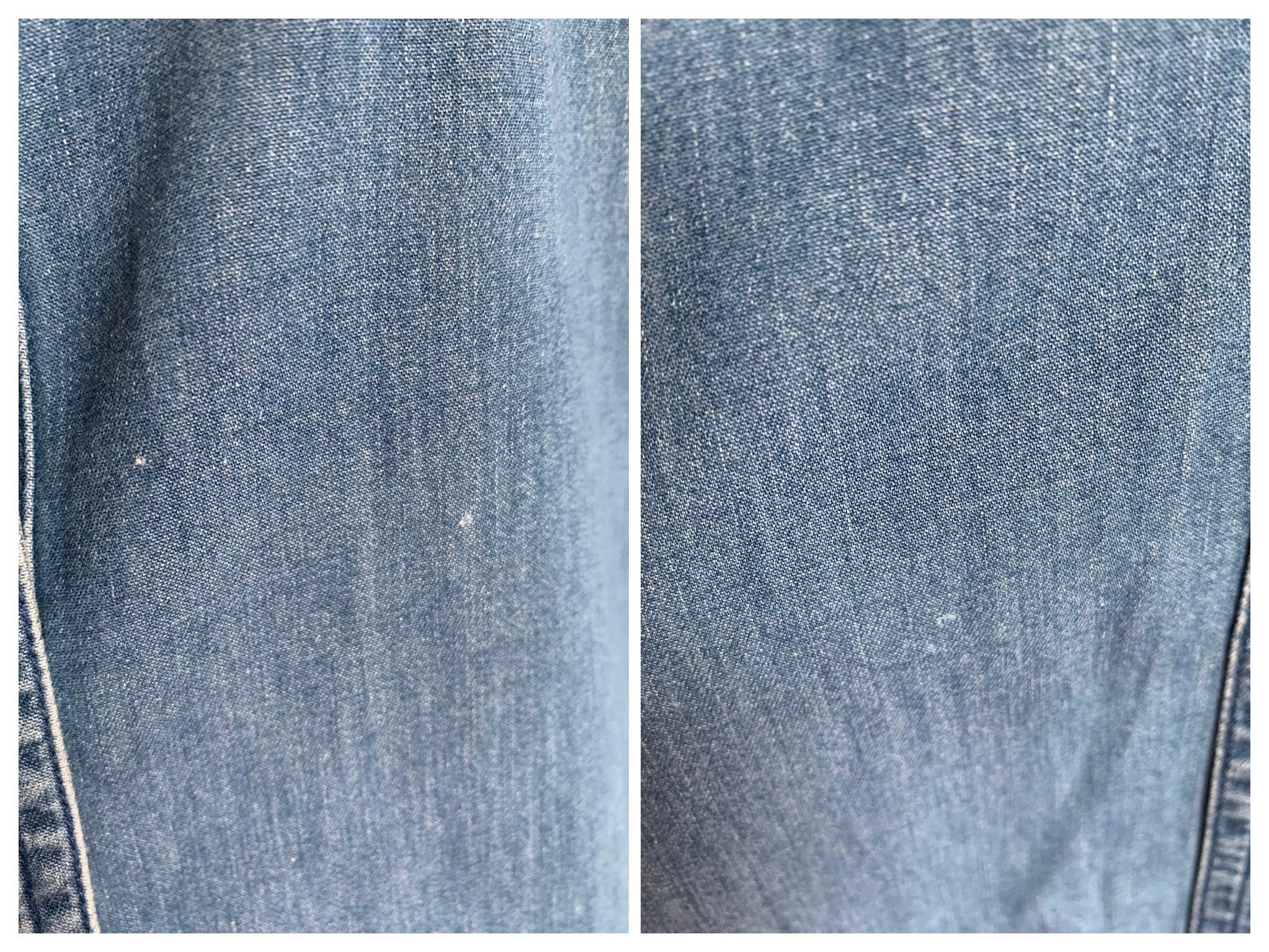 Condition: There is some fading around the edges and some tiny lighter spots on this blue denim shirt.