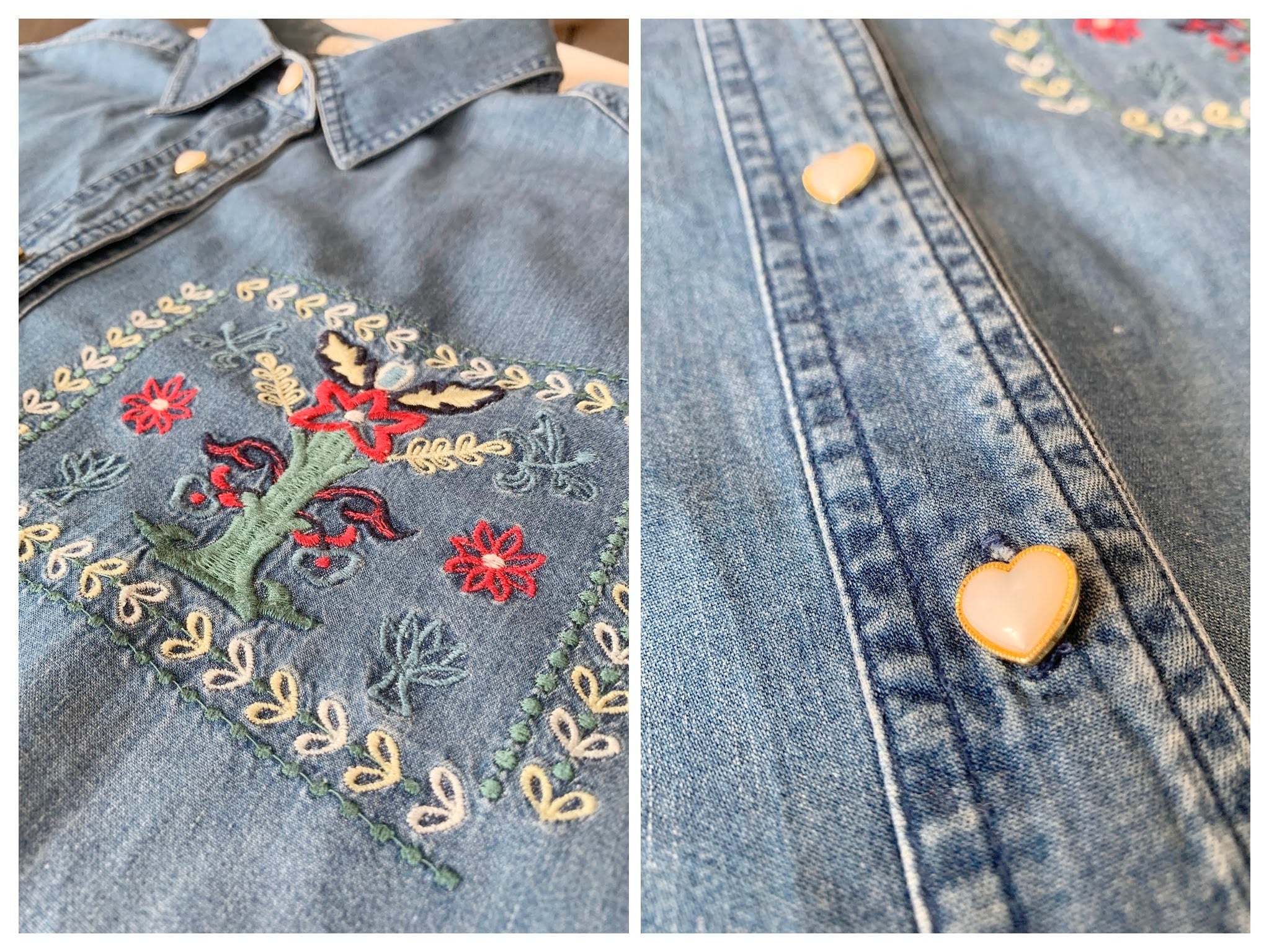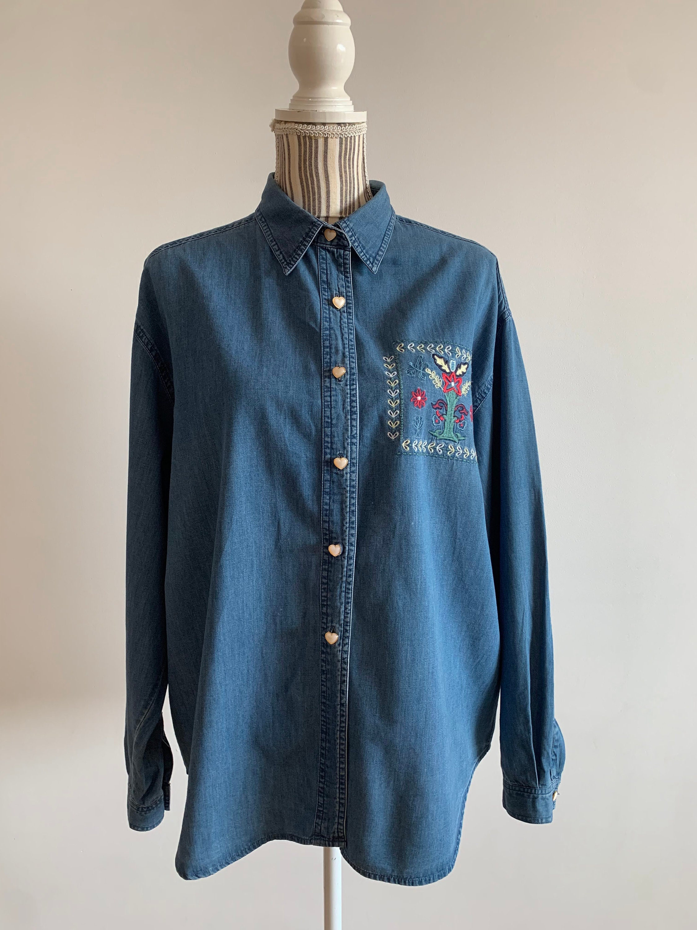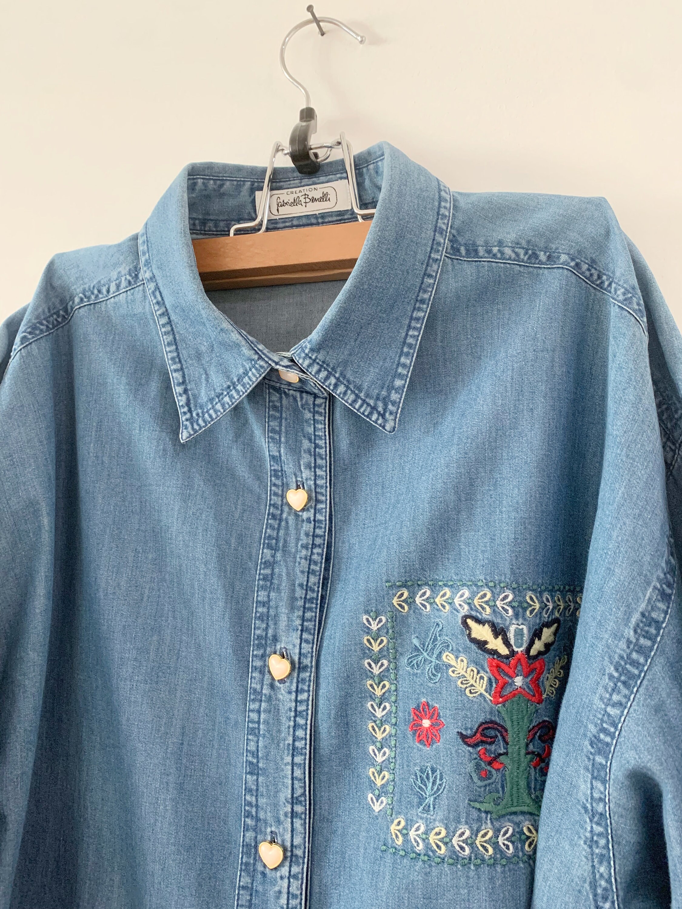 This is a beautiful vintage 90s embroidered denim shirt for women with relaxed fit and long sleeves and button front closure. This western style blue jeans shirt has a loose fit silhouette. It is made of 100% cotton denim fabric which has a bit of fading. This ladies cowboy shirt is by the Gabriella Benelli. The size marked is 44, it fits like oversized size M or L. Please check the measurements below.