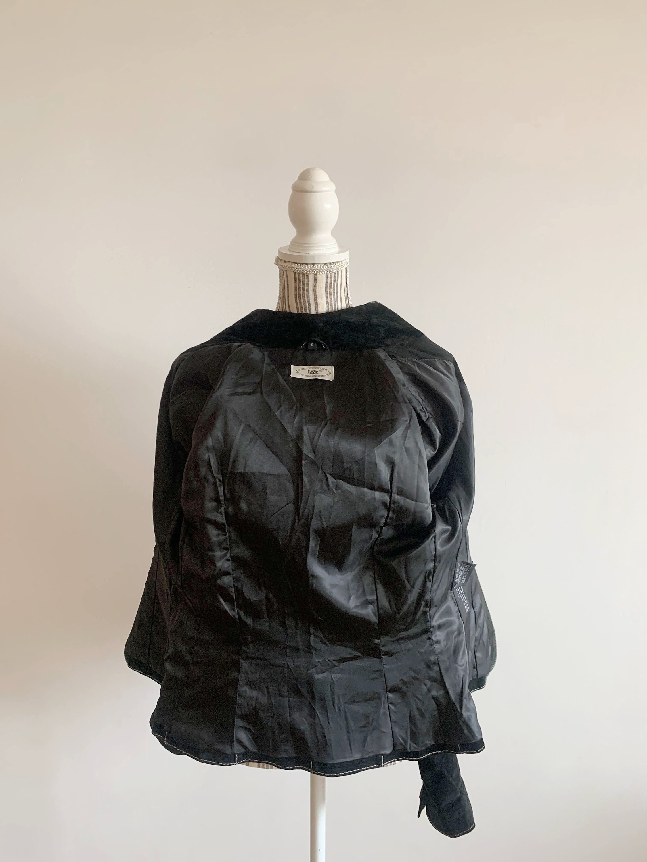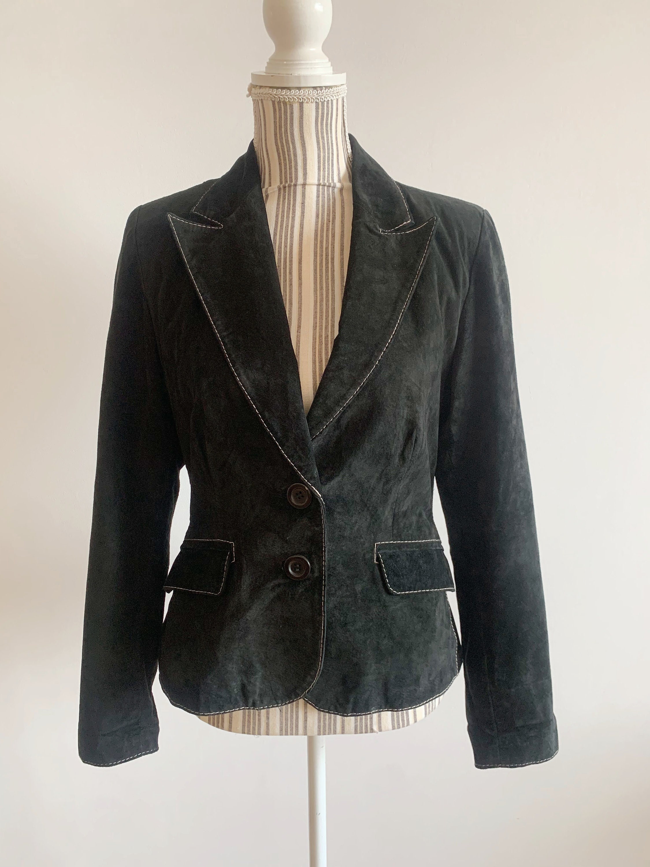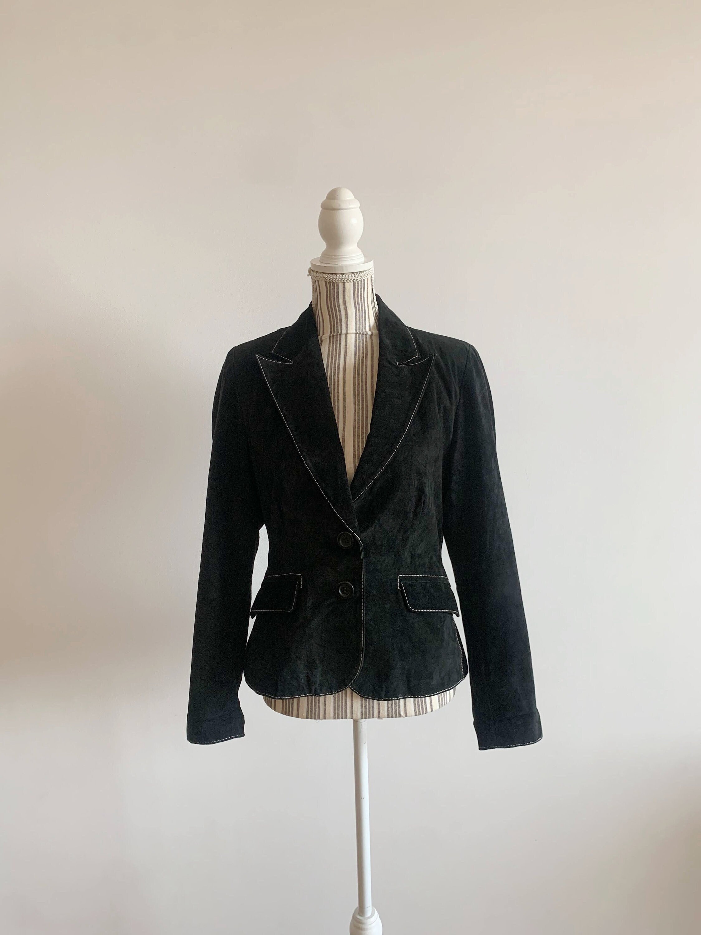 This is s beautiful vintage Y2K suede leather blazer coat which caries the 70s boho hippie look. This suede leather jacket is made of genuine suede leather in black color with polyester lining. This suede blazer jacket has two pockets and a front button closure. This western collared blazer coat is by the band Jazz. The size marked is S. Please check the measurements below.
