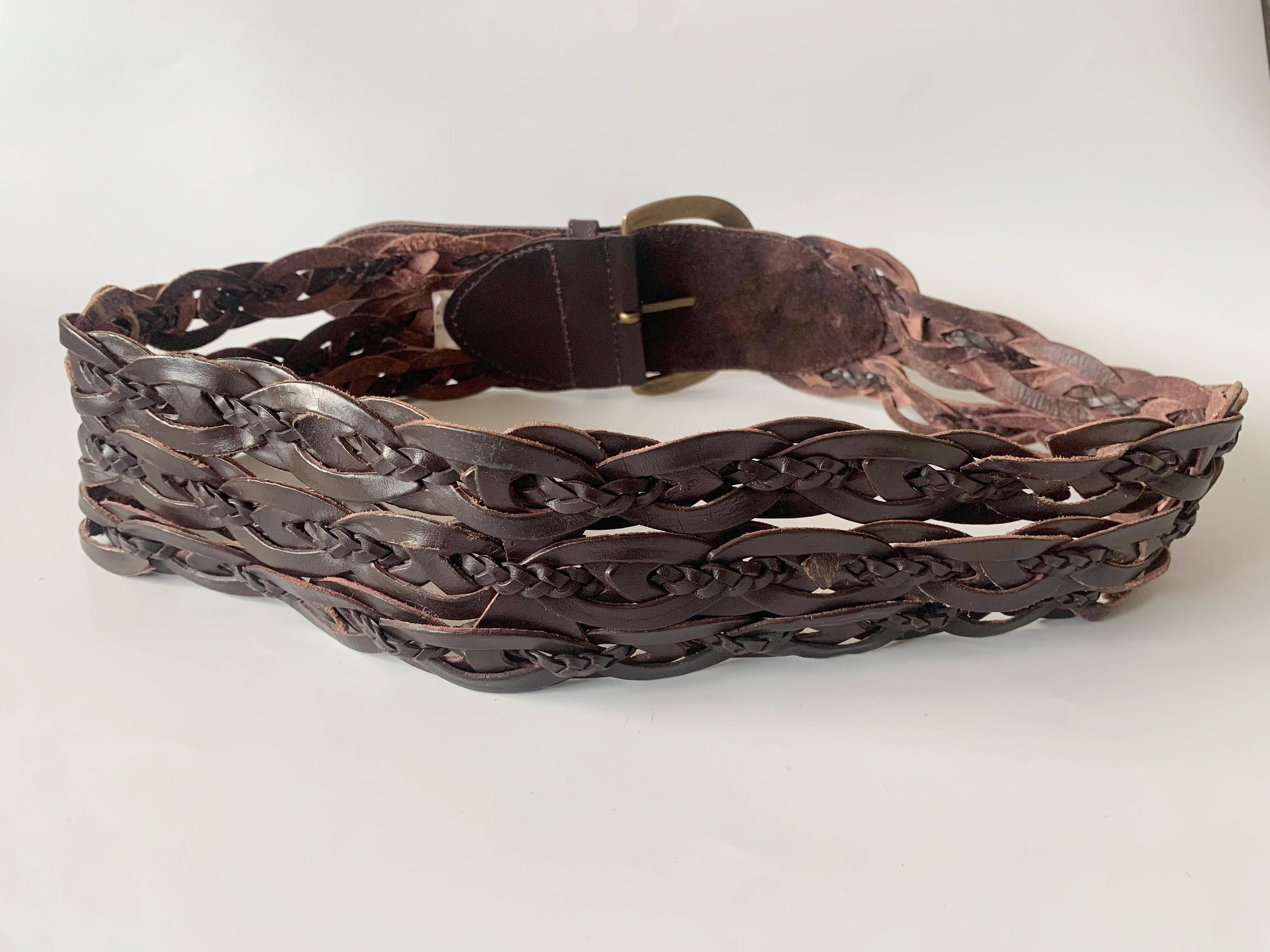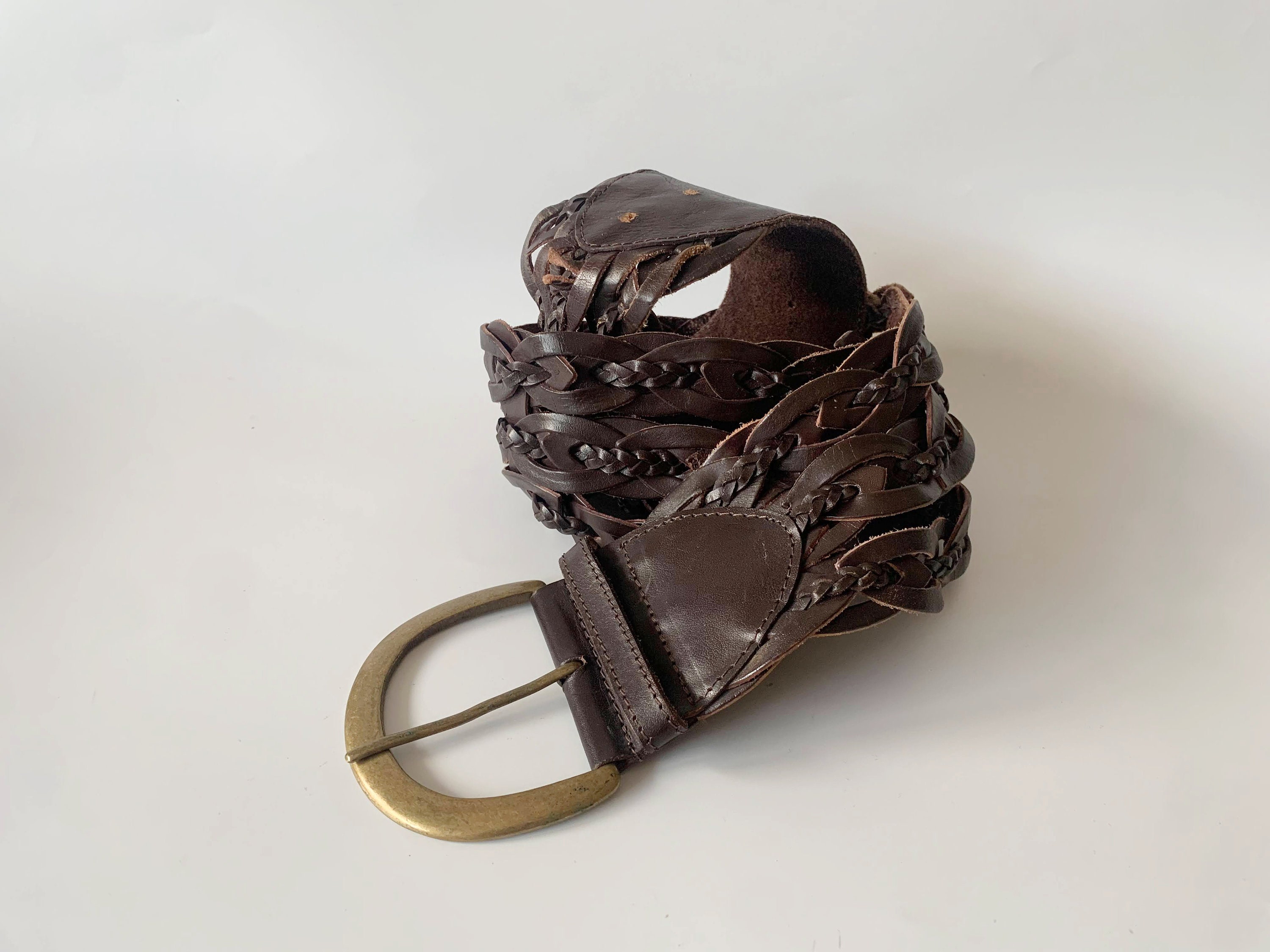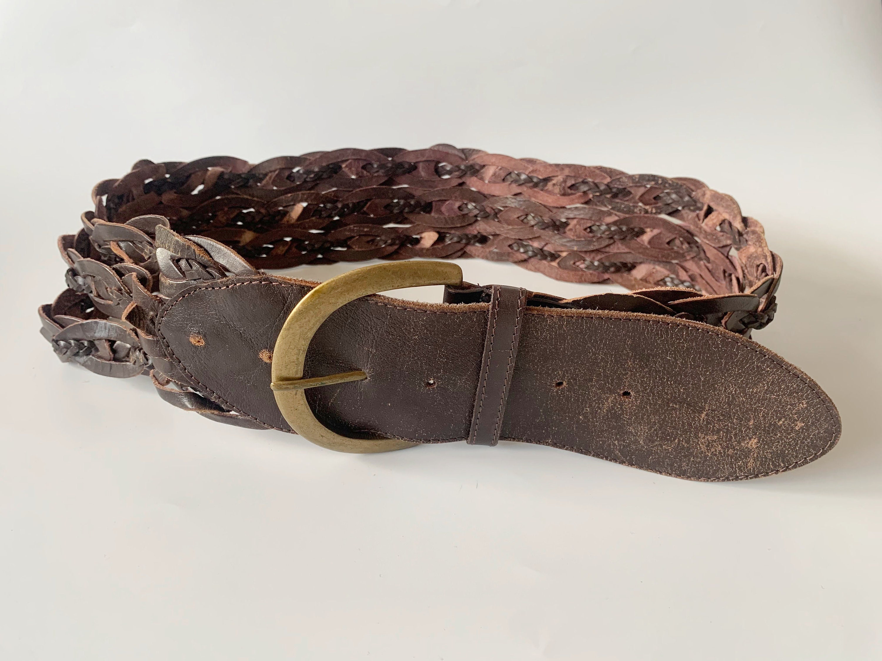 This is a genuine leather woven belt for women which has a heavily distressed look due to the wear. This boho belt is made of real leather strands in warm brown color, beautifully woven. The belt has a D ring brass buckle. It can adjust from 37.4”/ 95 cm to 41.3”/ 105 cm. The belt is 3.1”/ 8 cm wide at its widest part.