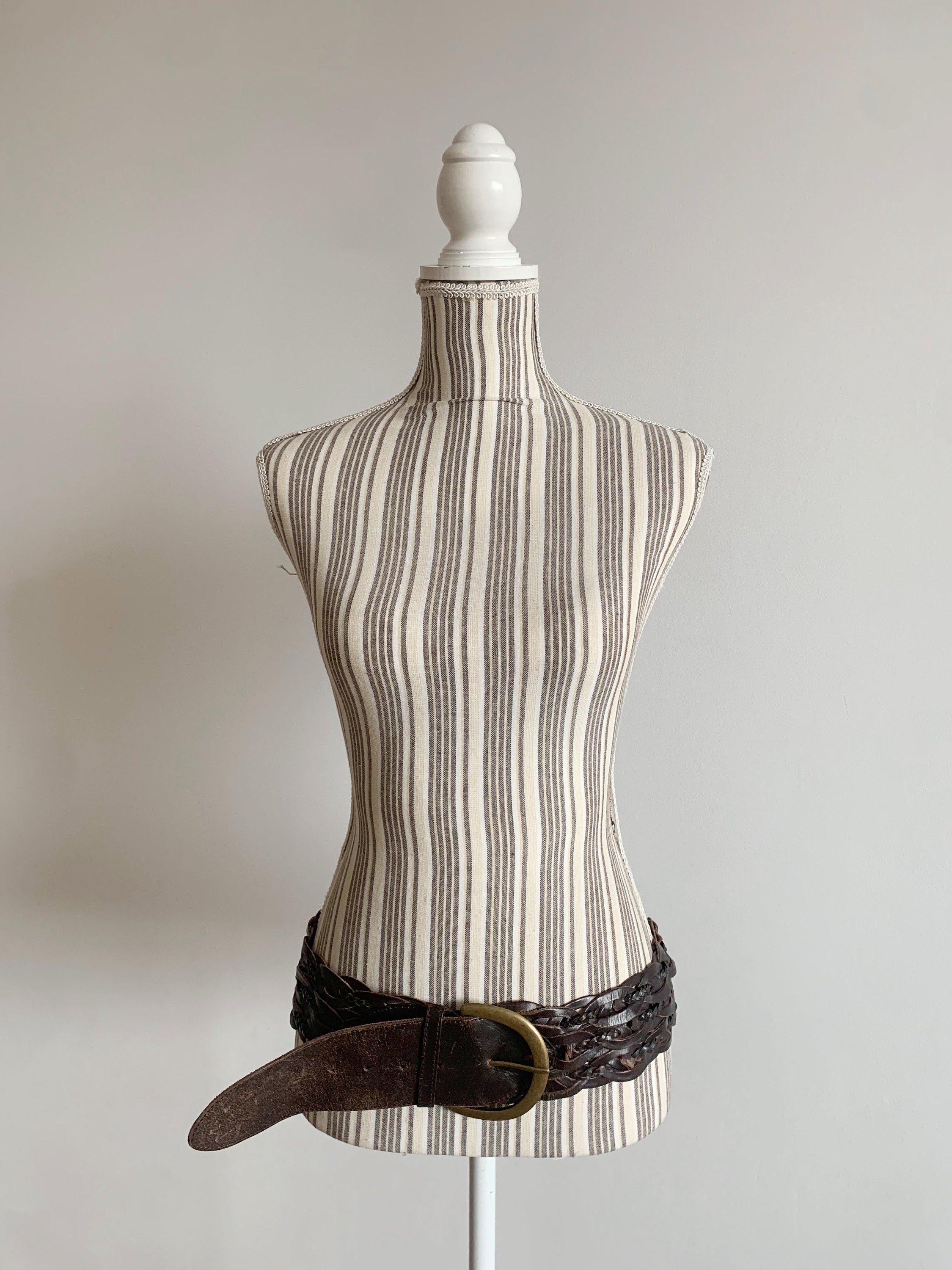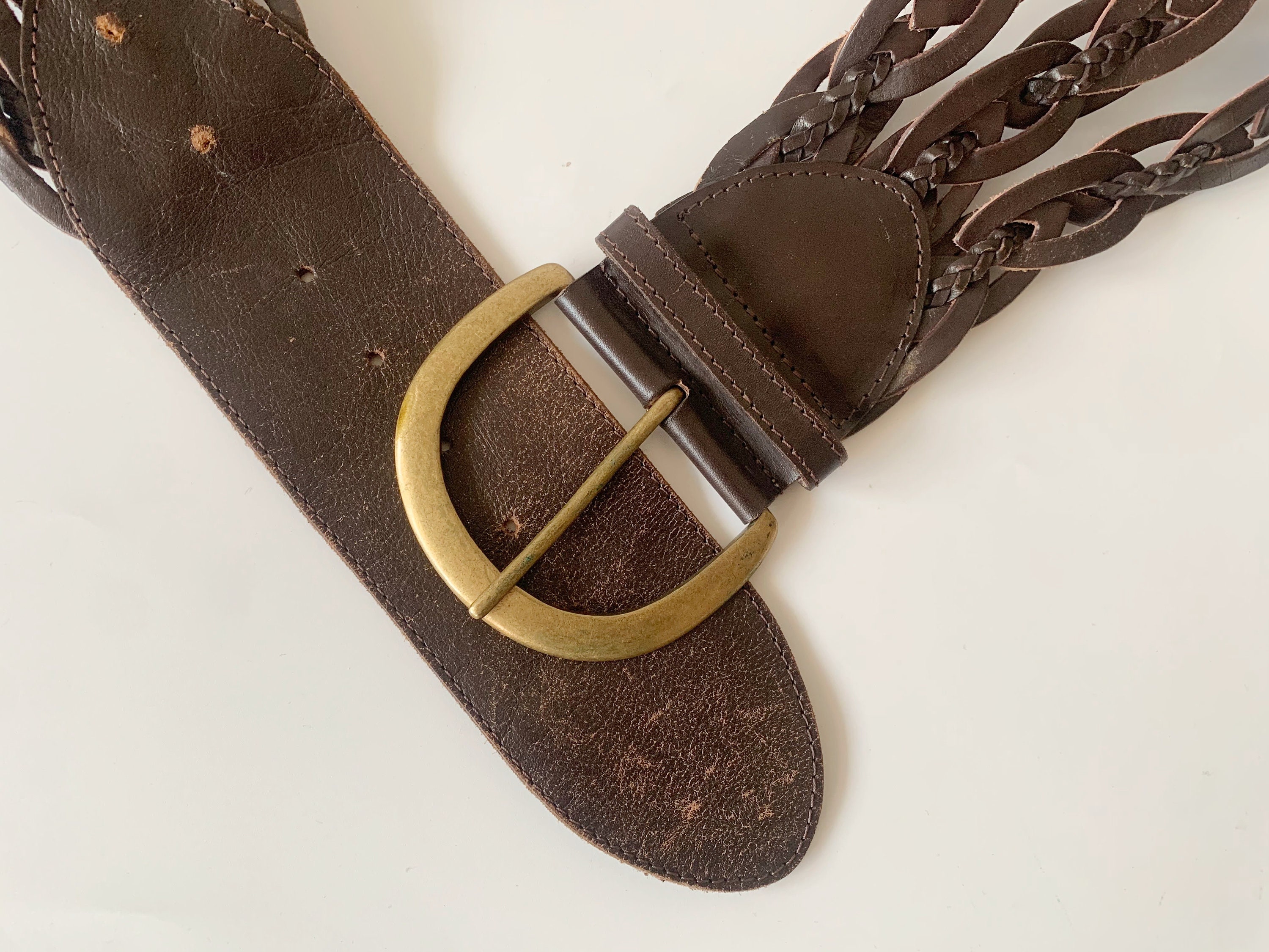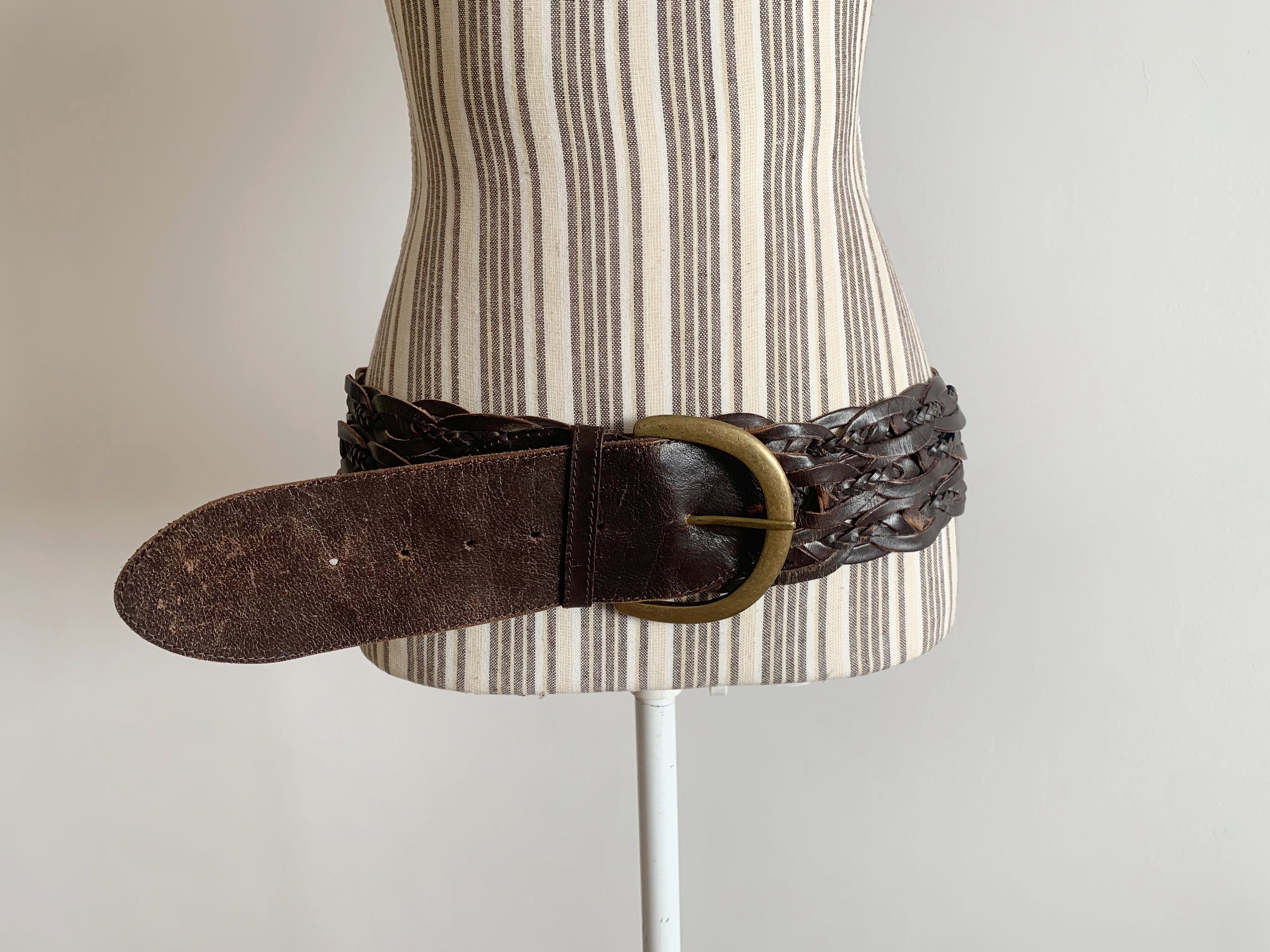 This is a genuine leather woven belt for women which has a heavily distressed look due to the wear. This boho belt is made of real leather strands in warm brown color, beautifully woven. The belt has a D ring brass buckle. It can adjust from 37.4”/ 95 cm to 41.3”/ 105 cm. The belt is 3.1”/ 8 cm wide at its widest part.