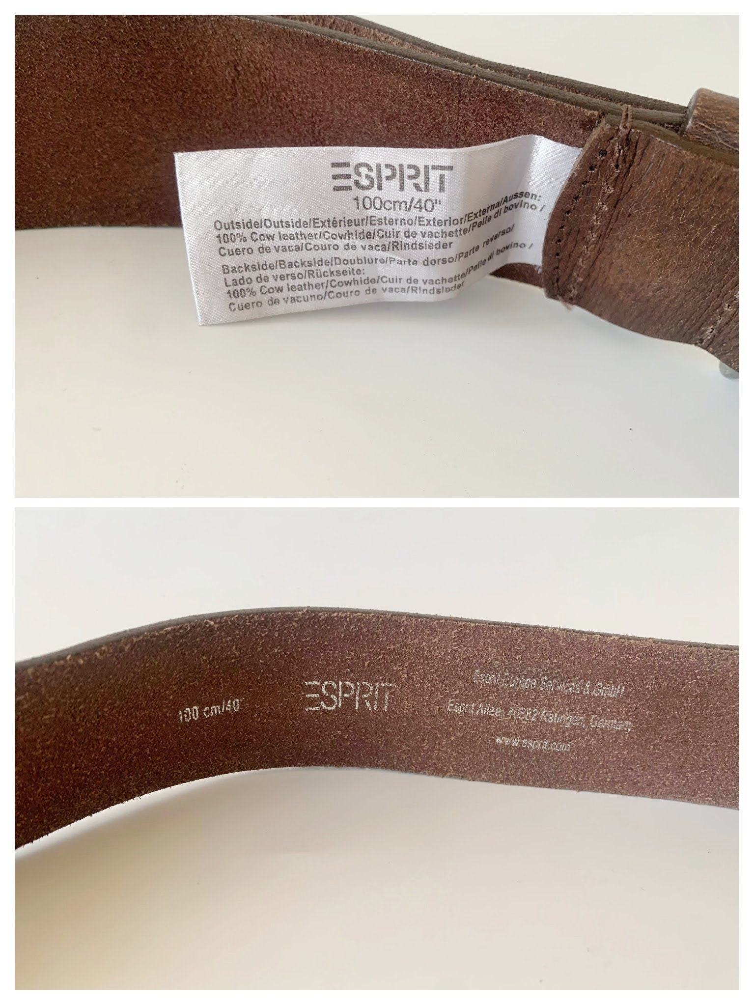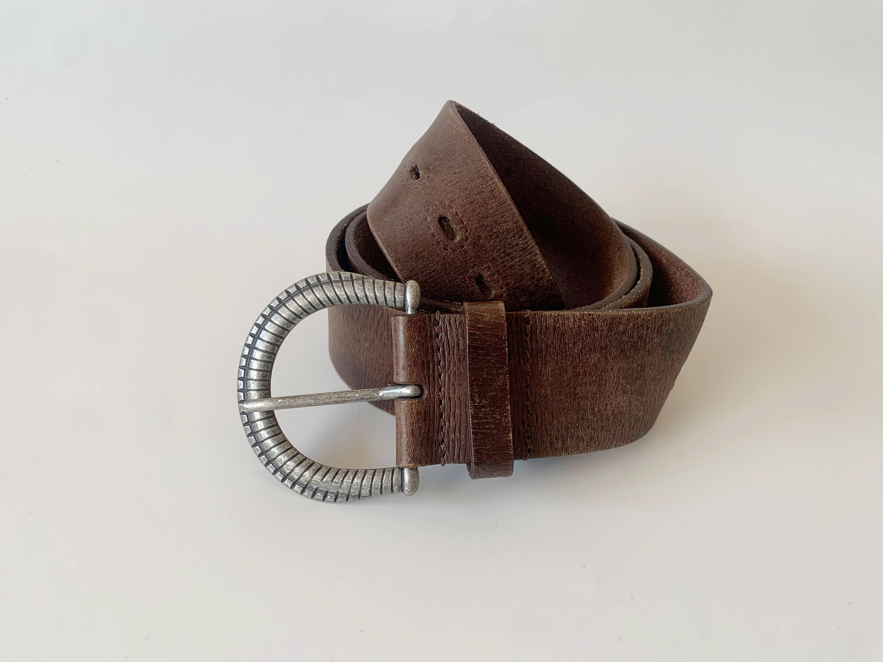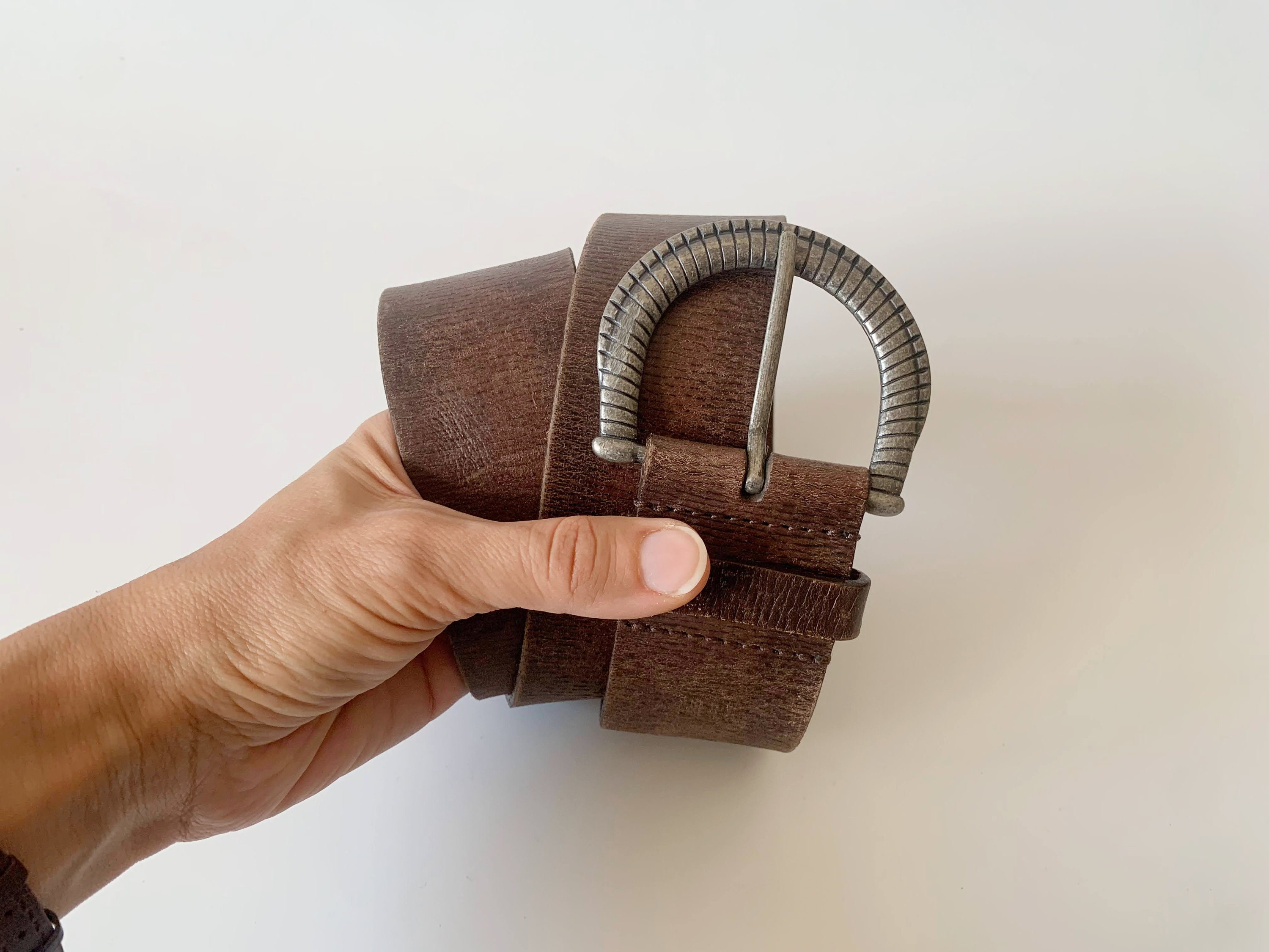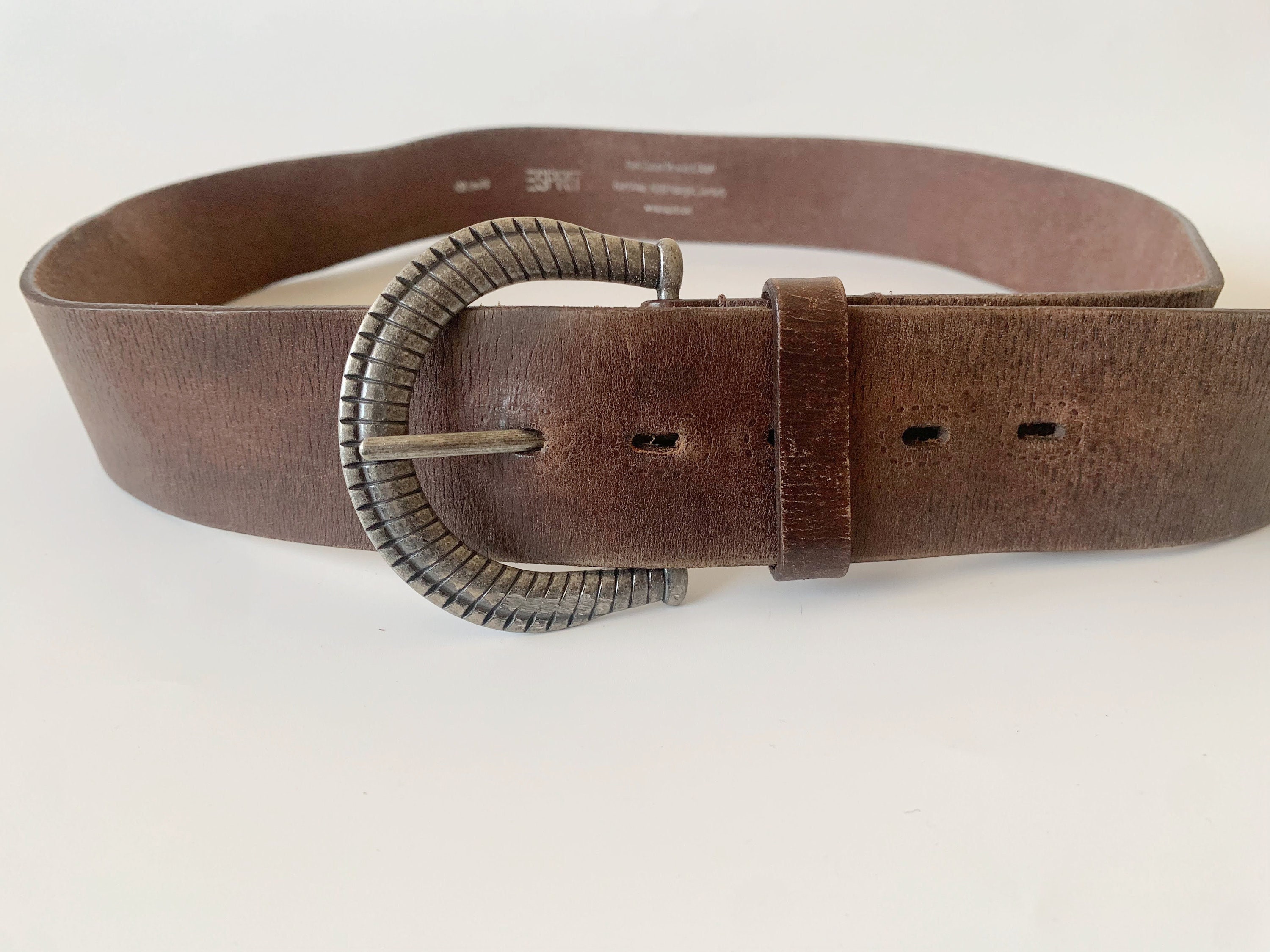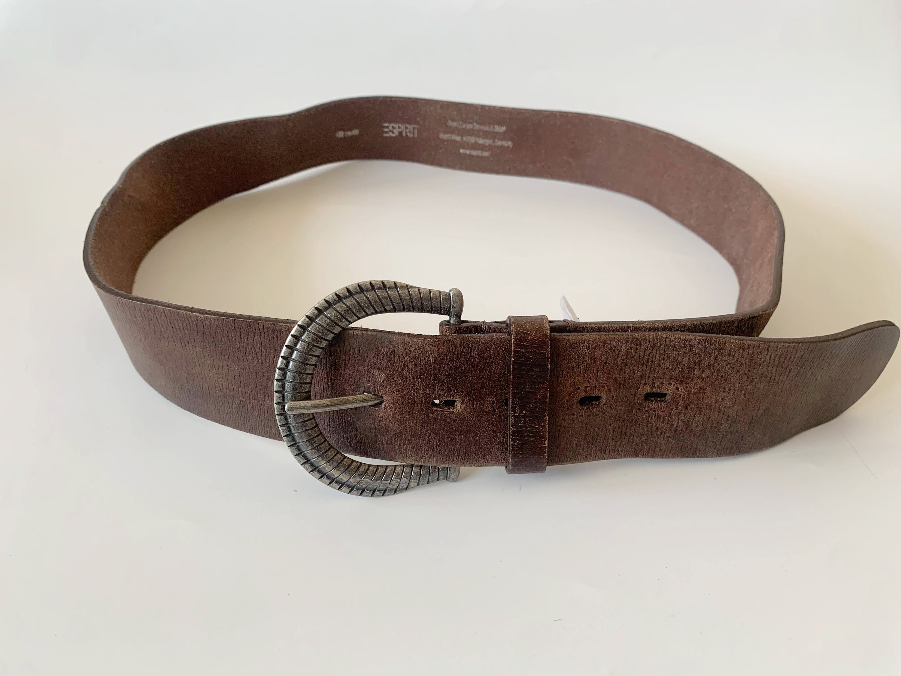 This is a vintage heavily distressed brown leather belt by Esprit. This unisex leather waist belt is perfect has a d ring carved silver tone buckle. This simple distressed leather belt is made of thick genuine leather in warm brown color with silver tone metal buckle. The size marked is 100 cm / 40". This brown waist belt can adjust from 39.4" / 100 cm to 43.3" / 110 cm. This aged leather belt is 1.9" / 4.7 cm wide.