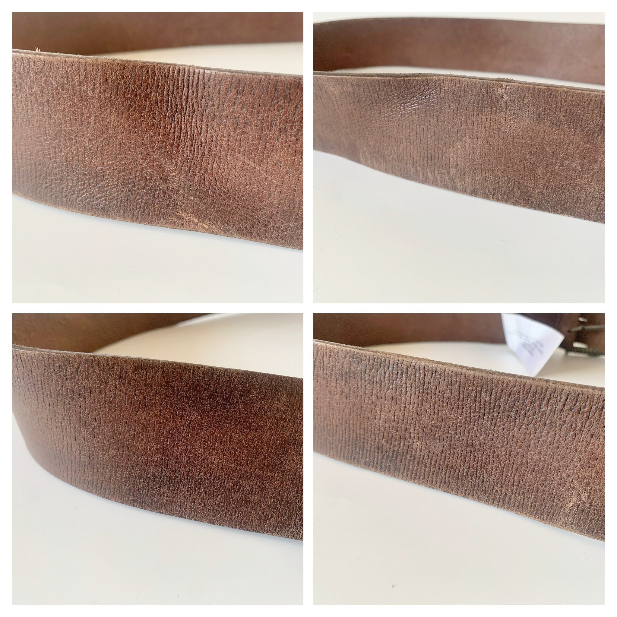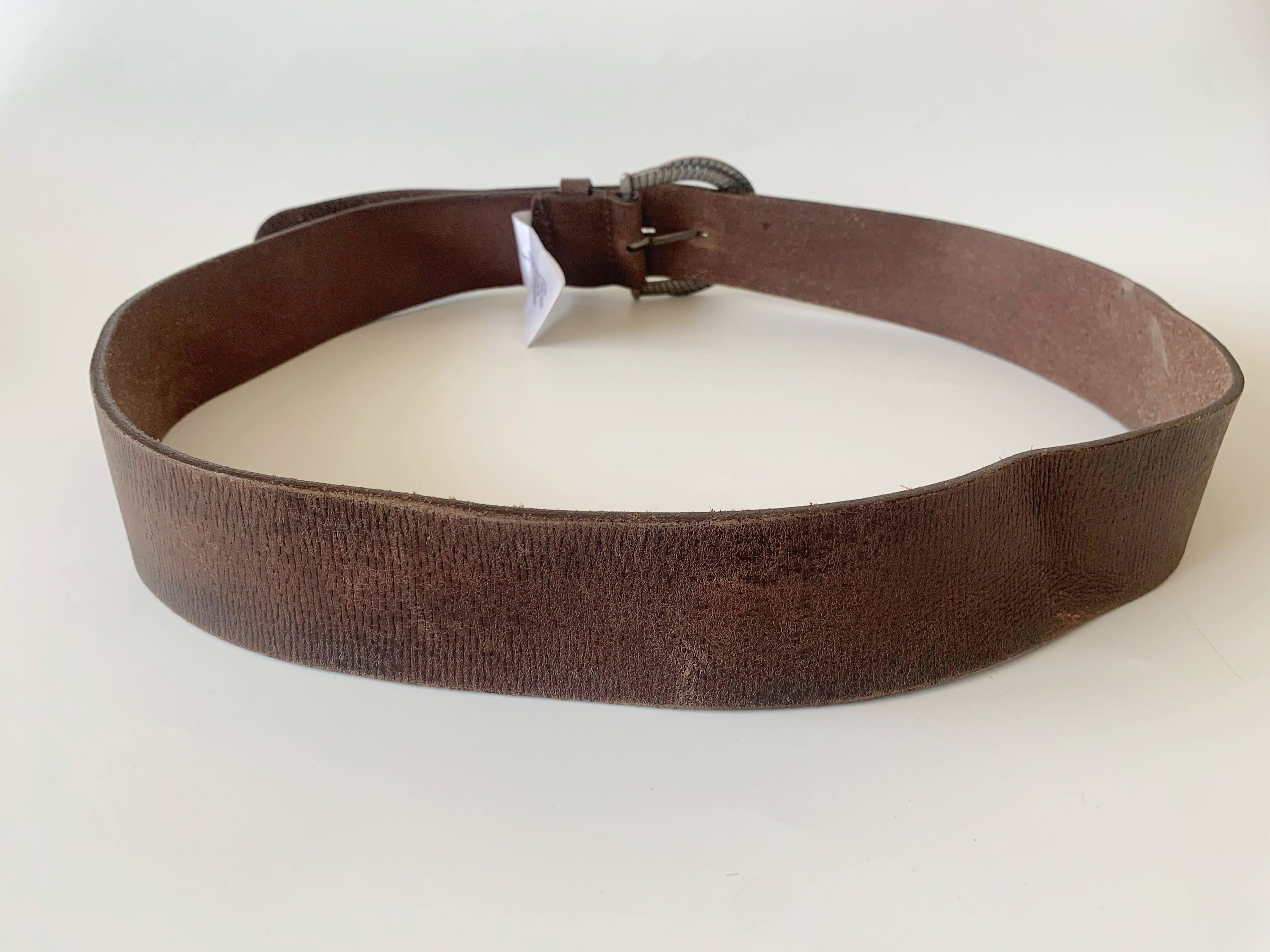 Condition: The leather has a beautifully distressed look, it has become softer with the wear and it has multiple scratches on the leather surface and some fading here and there. These signs of wear add to the character of this belt. The silver tone belt buckle is beautifully worn as well with scratches on the metal surface.