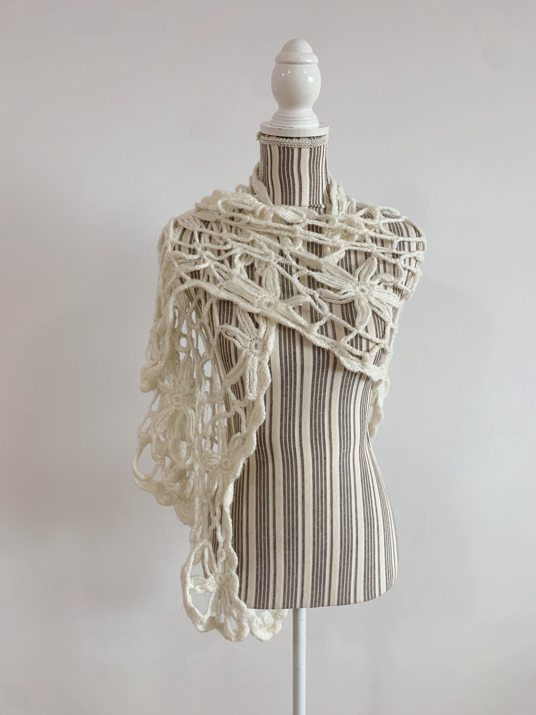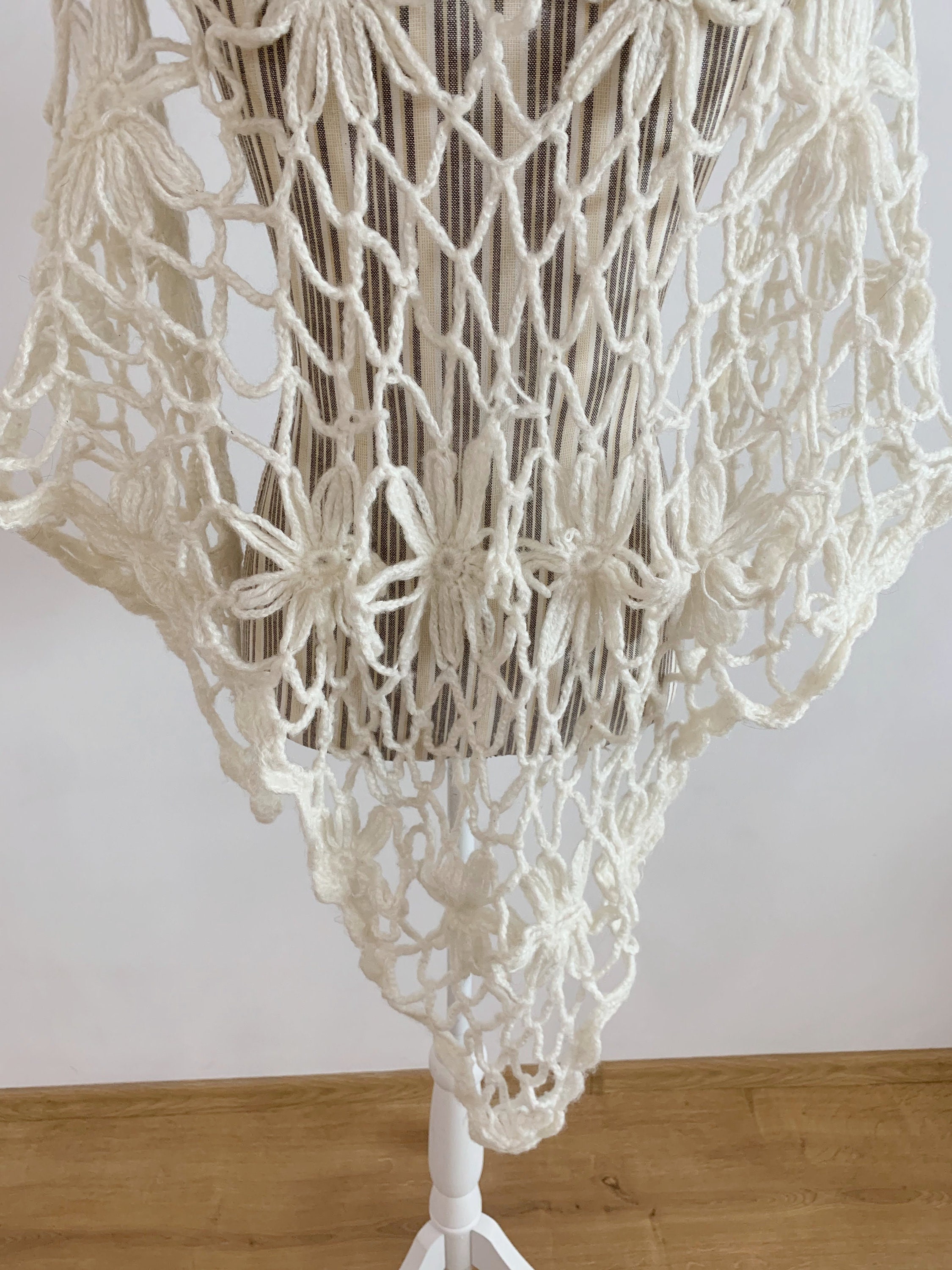 This is a beautiful vintage soft mohair crochet lace shawl in off white color. This fluffy lace shawl is made of soft warm yarn which will keep you cozy during the winter days and yet it will make you feel gorgeously stylish. This bohemian shawl has a fishnet floral pattern. Perfect mohair wrap for the fall/ winter season. This boho shawl will add a pop of romantic cottagecore style to your outfit. This women triangle shawl is the perfect gift for your sister, mother or grandmother.