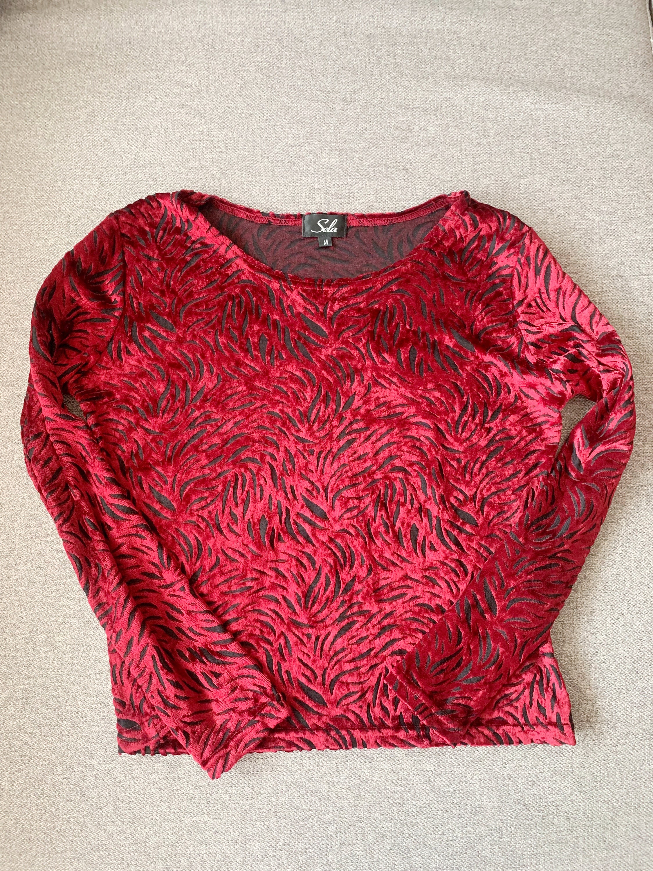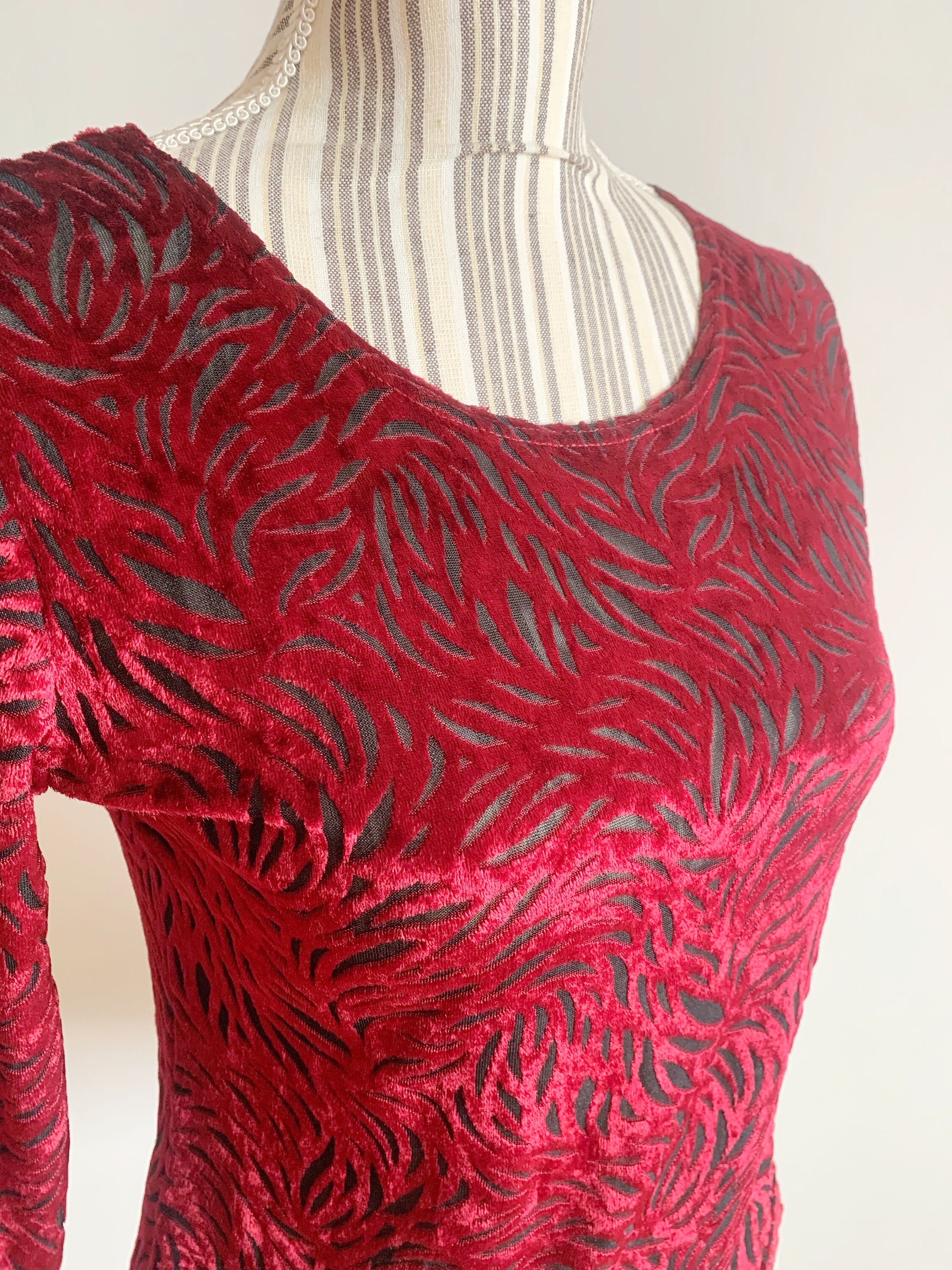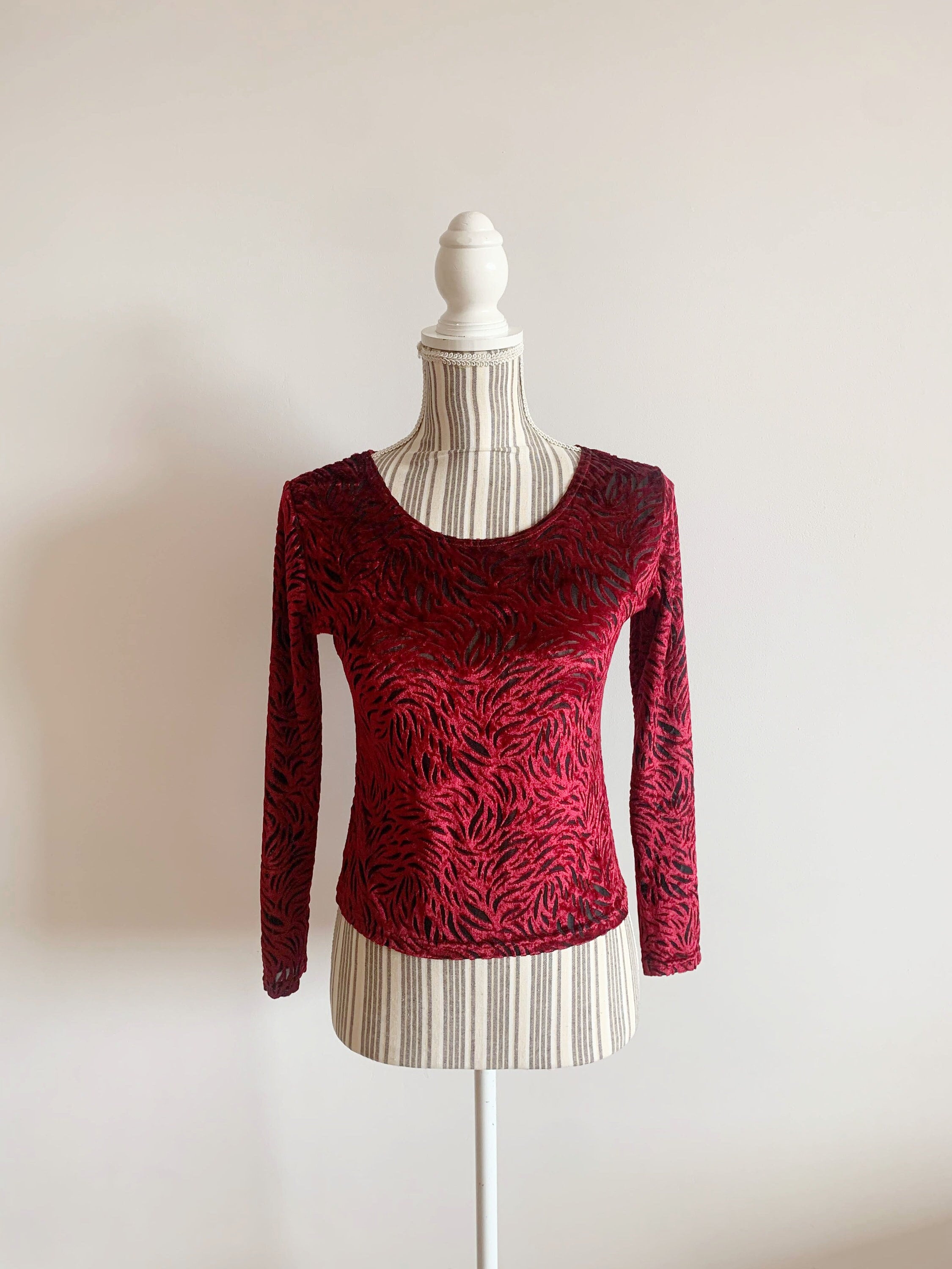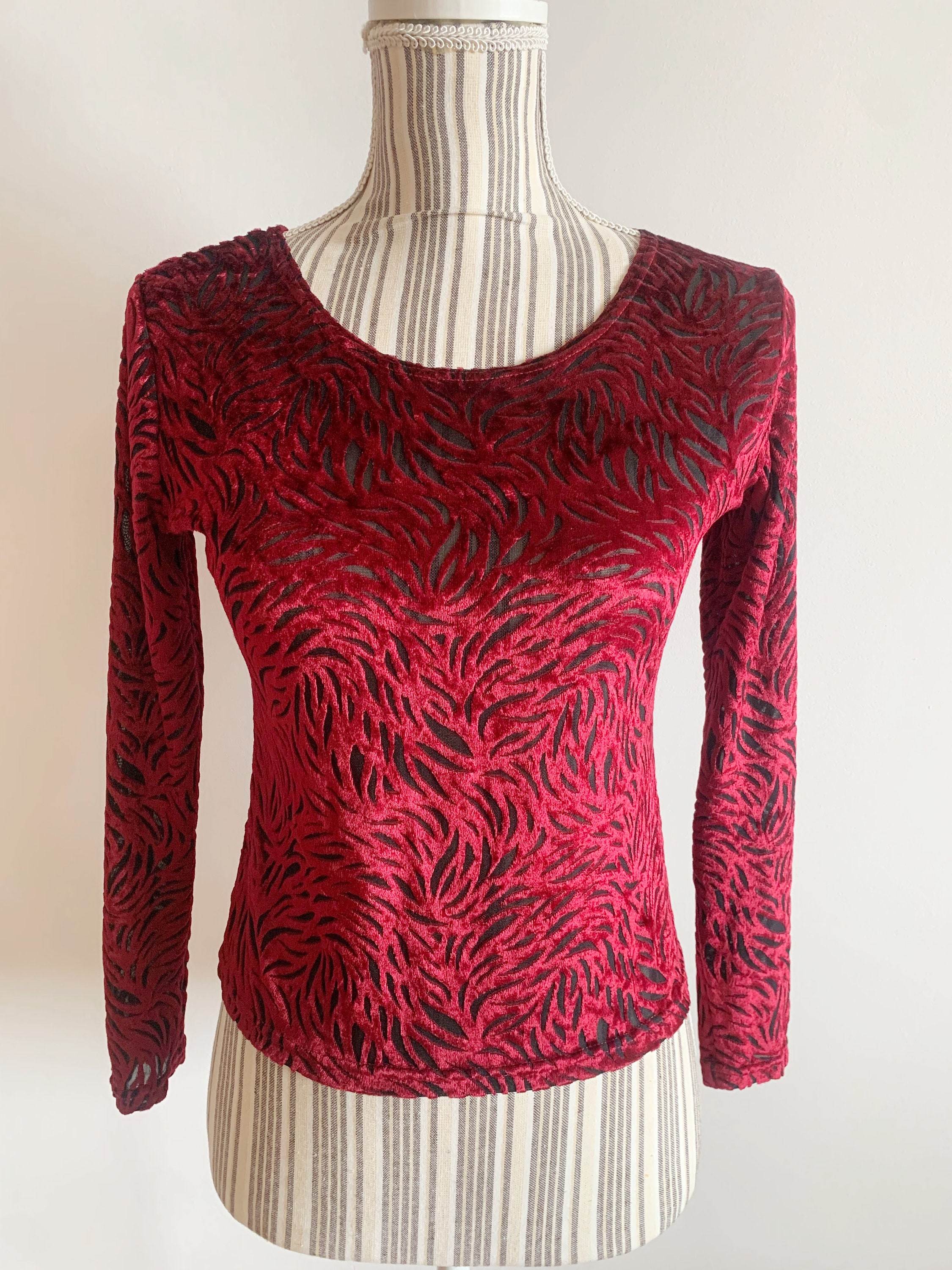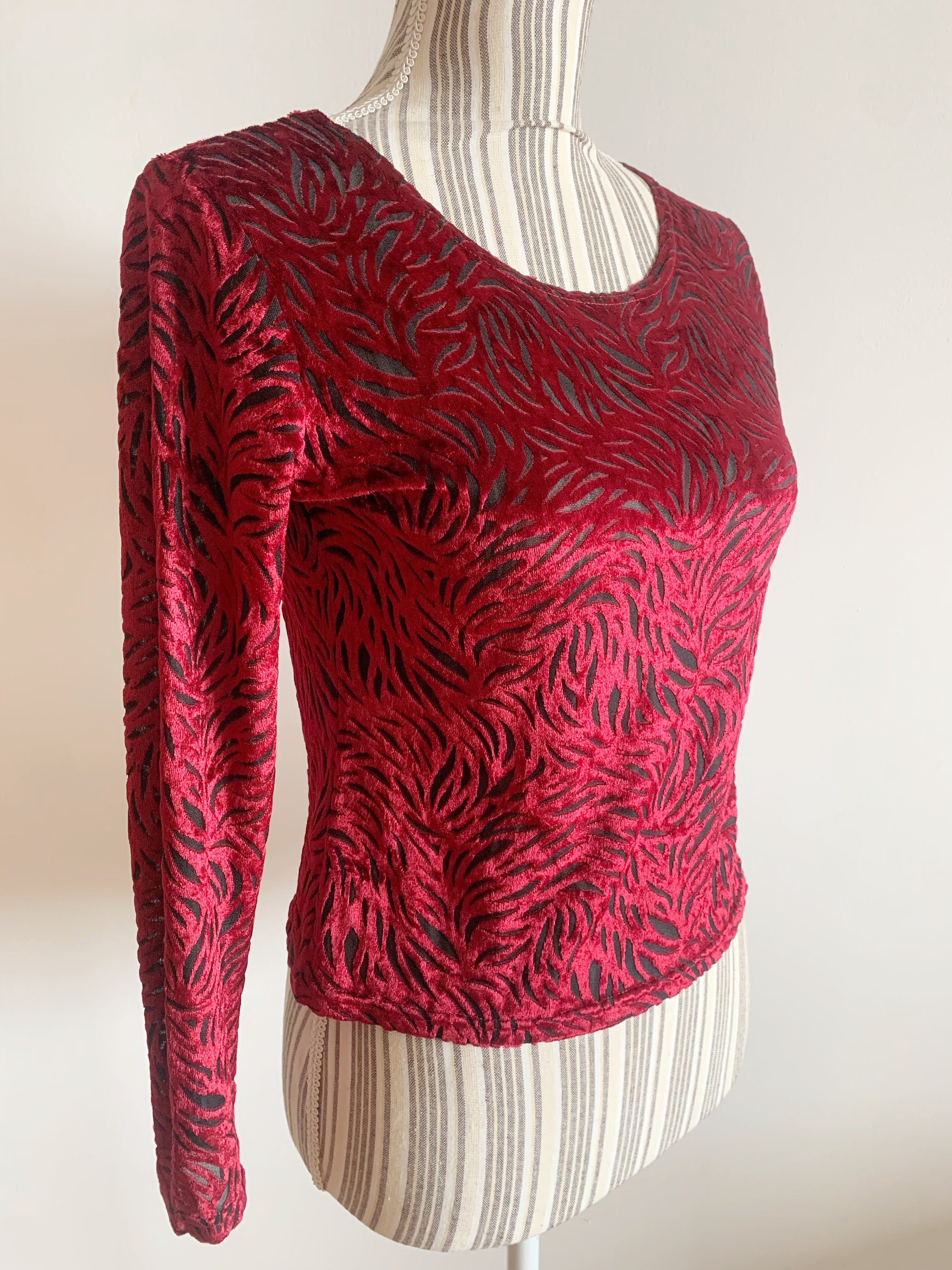 This is a pretty vintage 90s burgundy red sheer cropped blouse with long bracelet sleeves and scoop neck. This stretchy cut out velvet mesh top is made of elastic fabric which beautifully embraces your body, showing off all your curves. This transparent top will look awesome with just a black bra underneath. This maroon burn out velvet sheer top is super sexy and it will get all eyes on you. The size marked on this oxblood velvet shirt is M, however it fits smaller, like size S. Please check the measurements below.