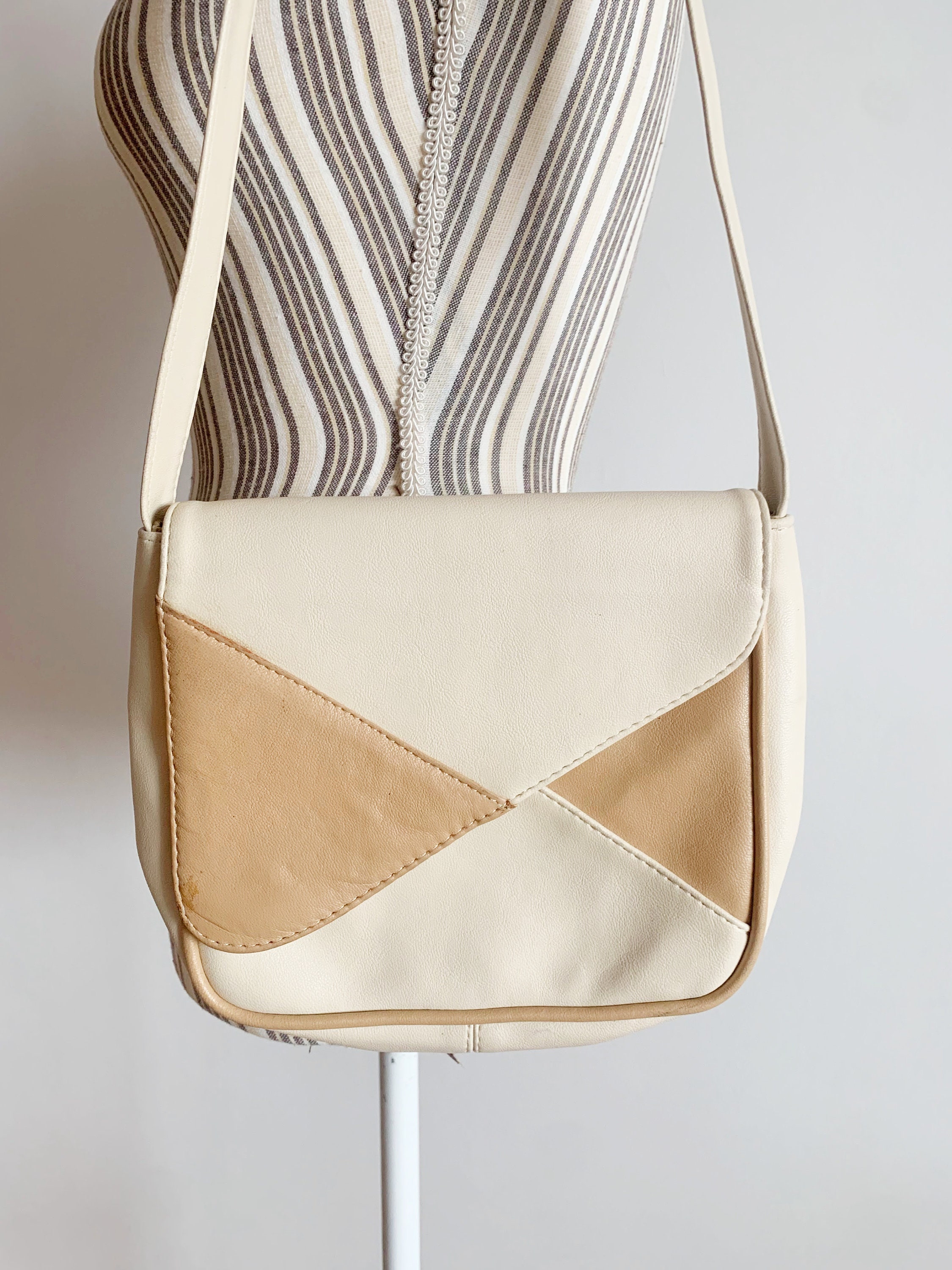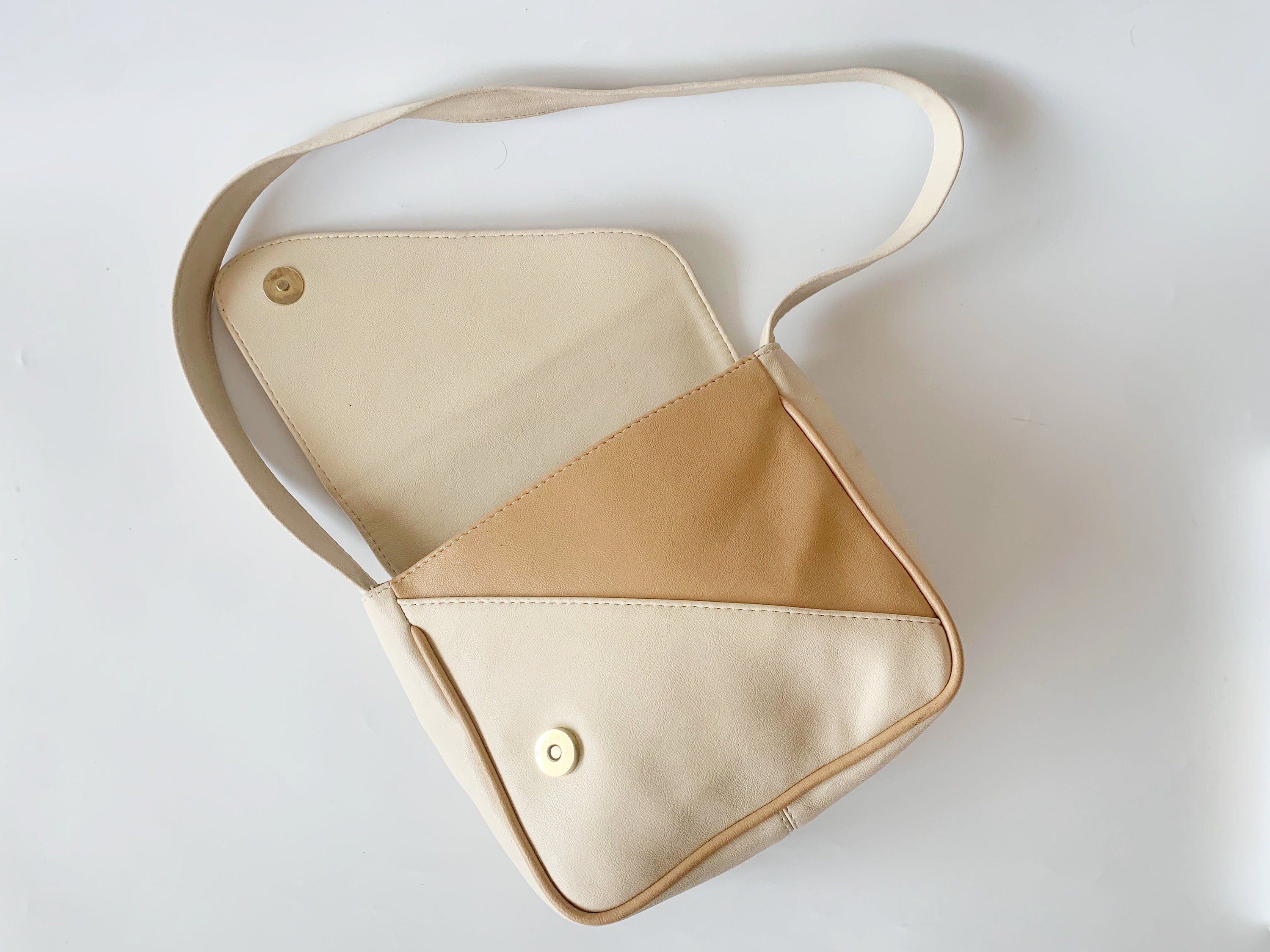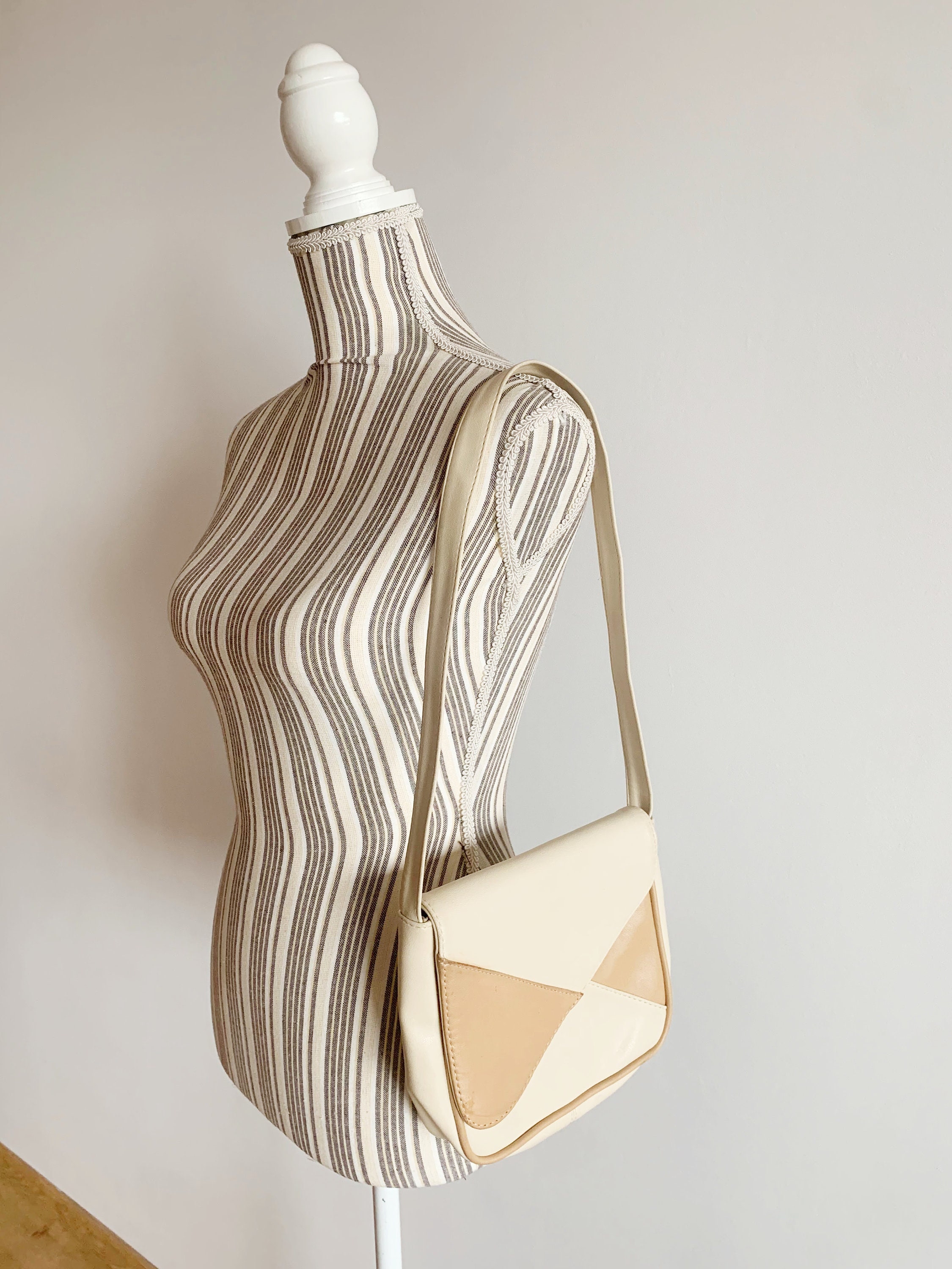 This is a vintage 90s colorblock beige and camel brown shoulder purse, made of faux leather. This vegan leather purse has a short shoulder strap. This vegan leather shoulder purse has triangular shape flap over lid and magnetic closure. The interior is lined in beige cotton paper like fabric. There is one compartment and a small zipper pocket inside.