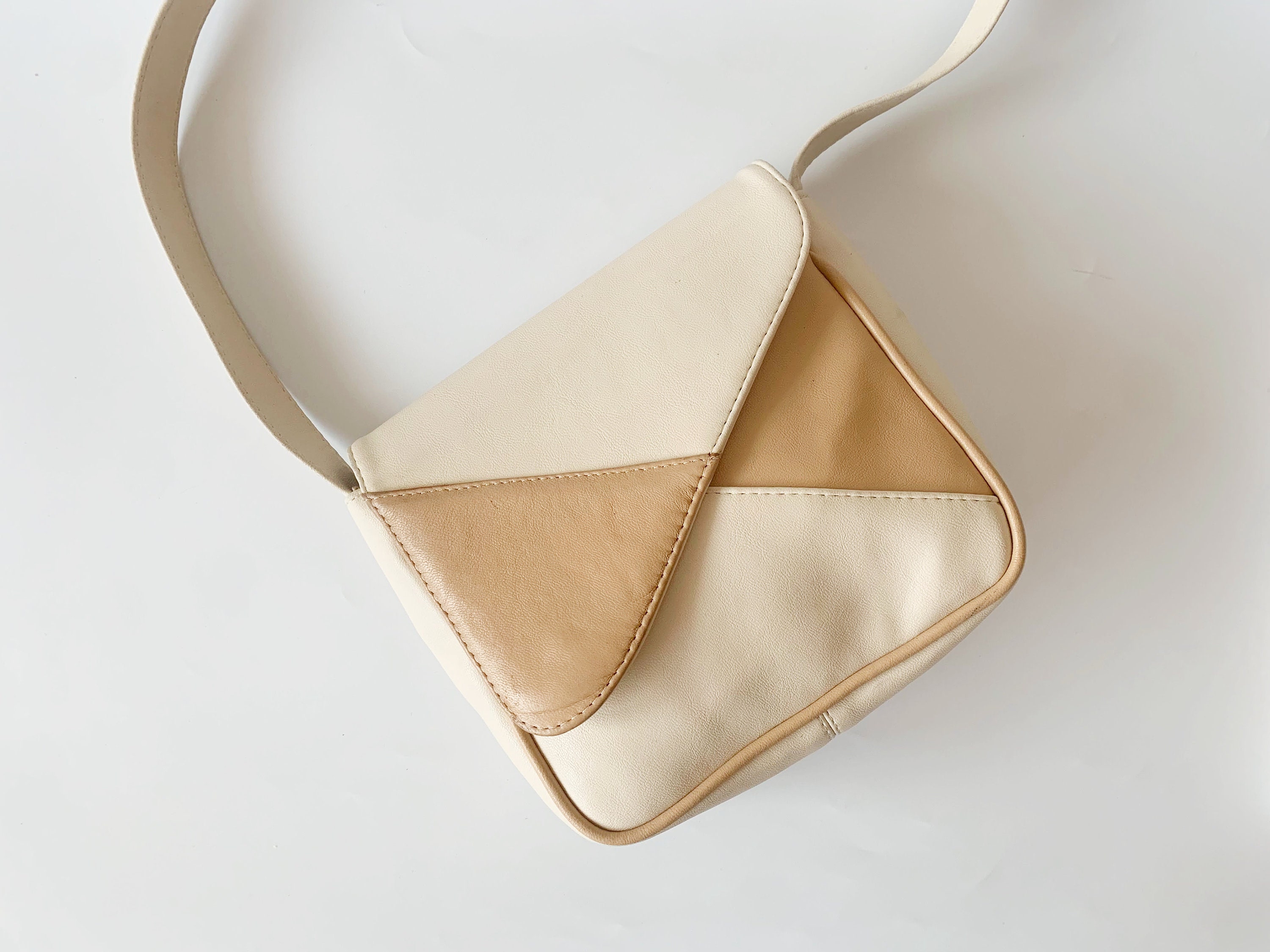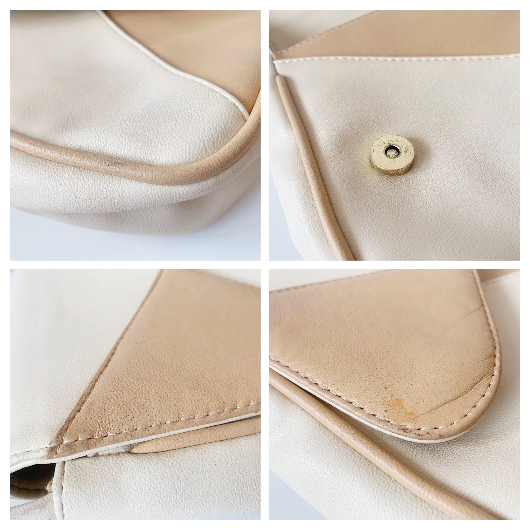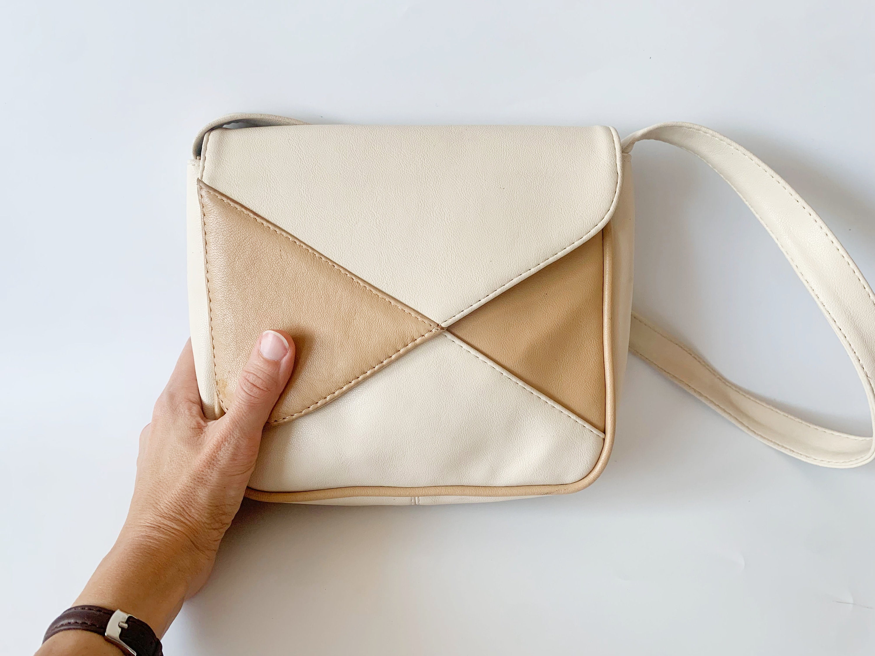 This is a vintage 90s colorblock beige and camel brown shoulder purse, made of faux leather. This vegan leather purse has a short shoulder strap. This vegan leather shoulder purse has triangular shape flap over lid and magnetic closure. The interior is lined in beige cotton paper like fabric. There is one compartment and a small zipper pocket inside.
