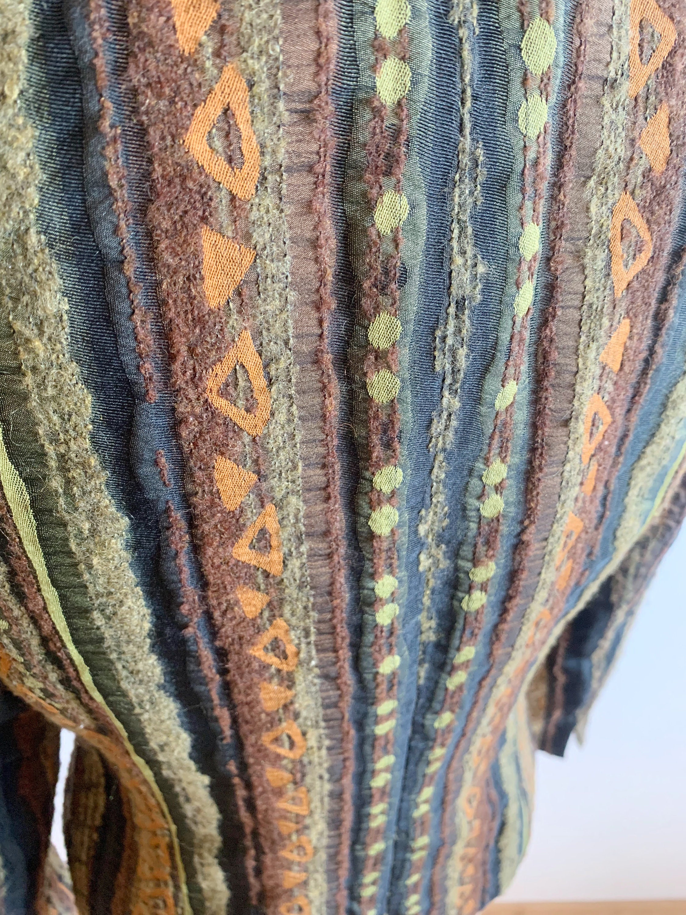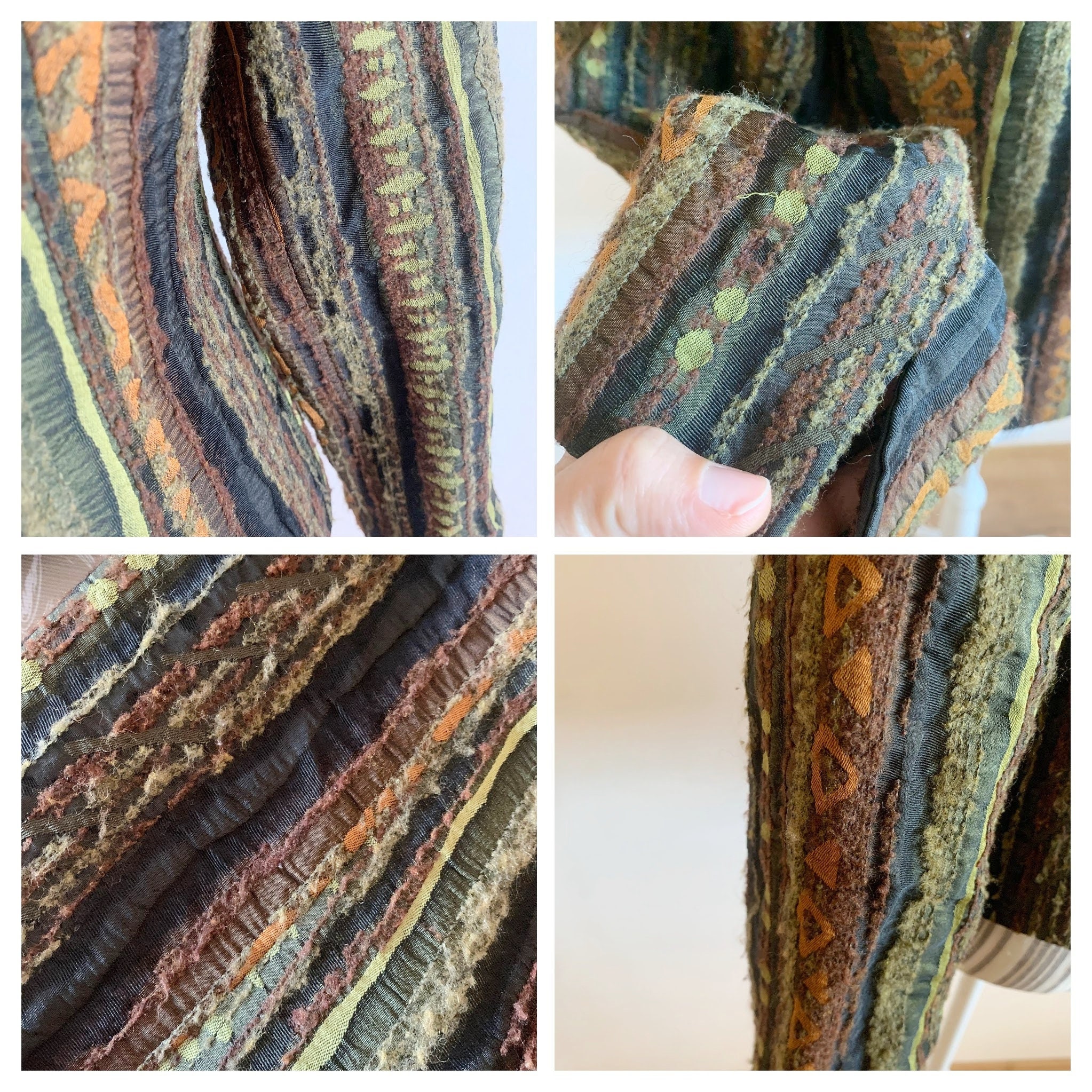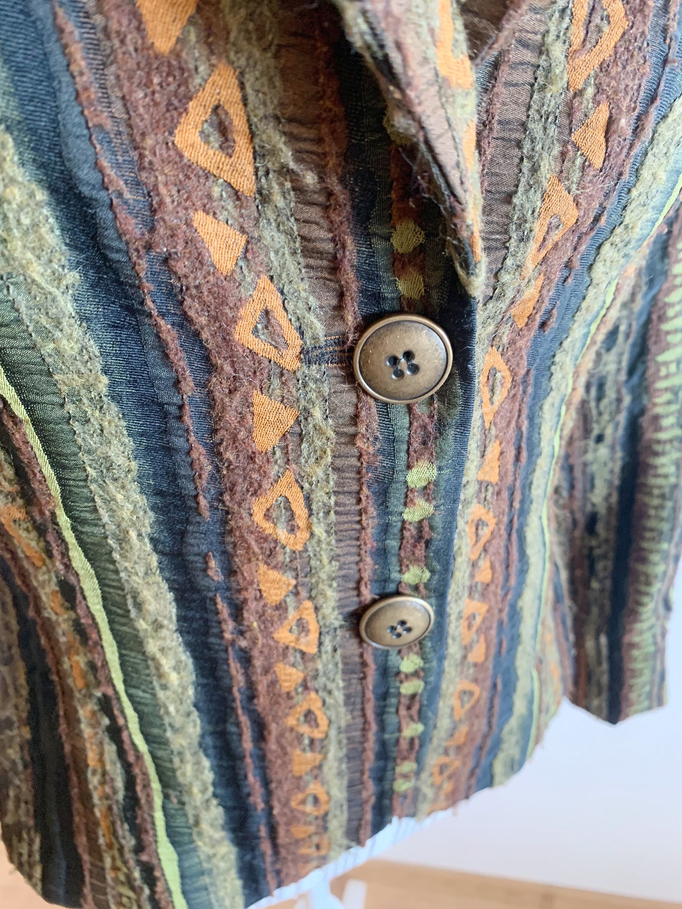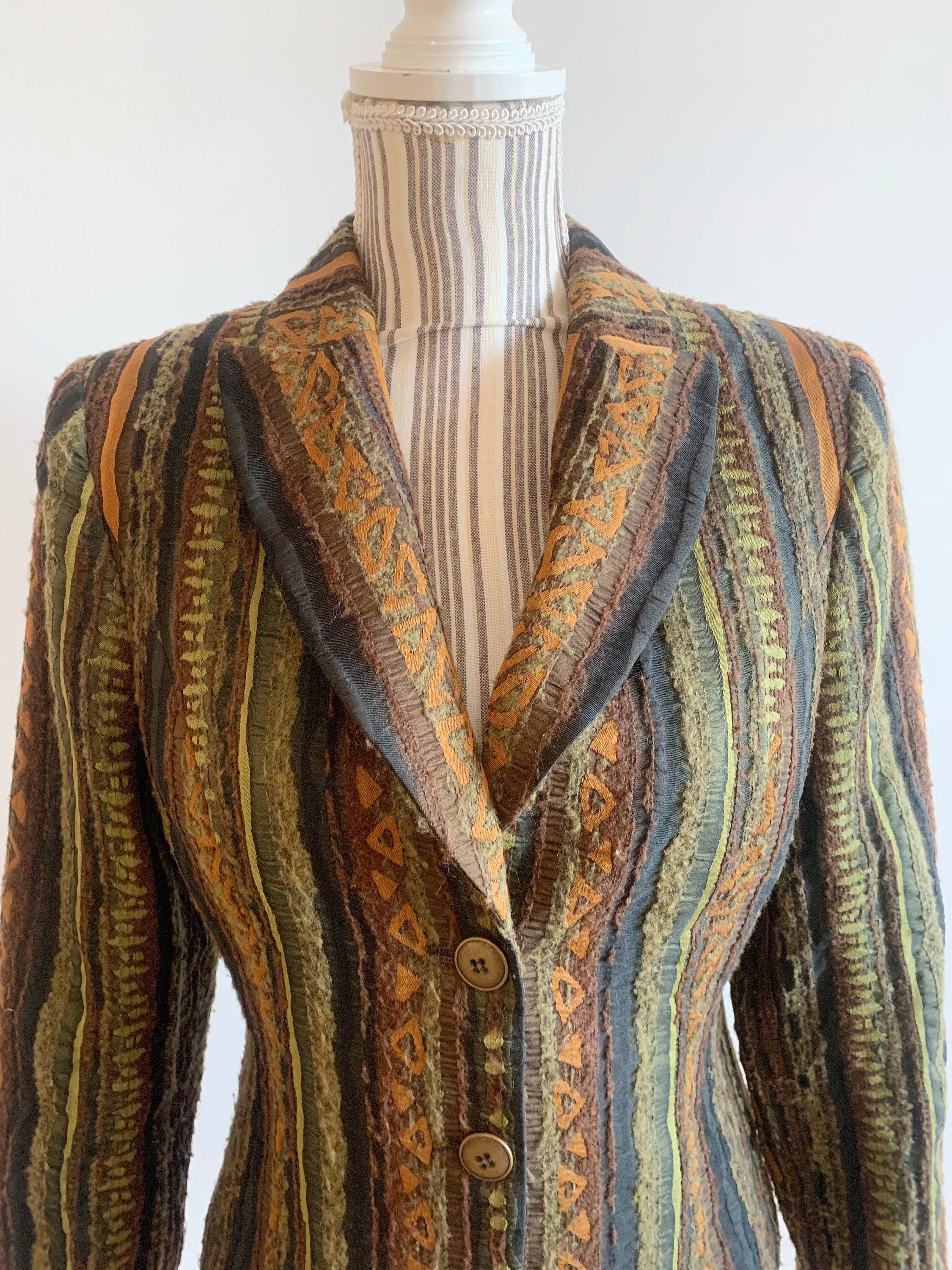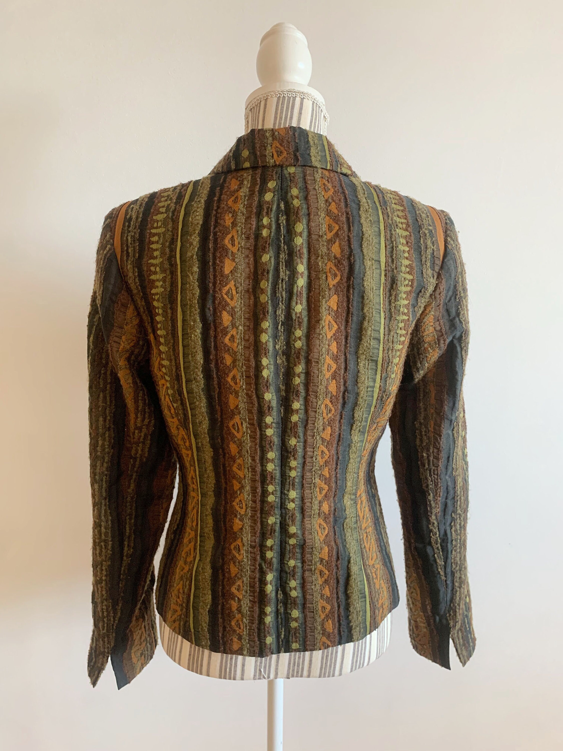 This is a gorgeous textured tweed blazer with button front closure, long sleeves and straight collar. This striped cropped coat is made of fluffy boucle fabric with tribal aztec print in olive green, burnt orange and taupe brown. The size marked is EUR 34, GB 8, US 4, which corresponds to size S women's. Please check the measurements below.