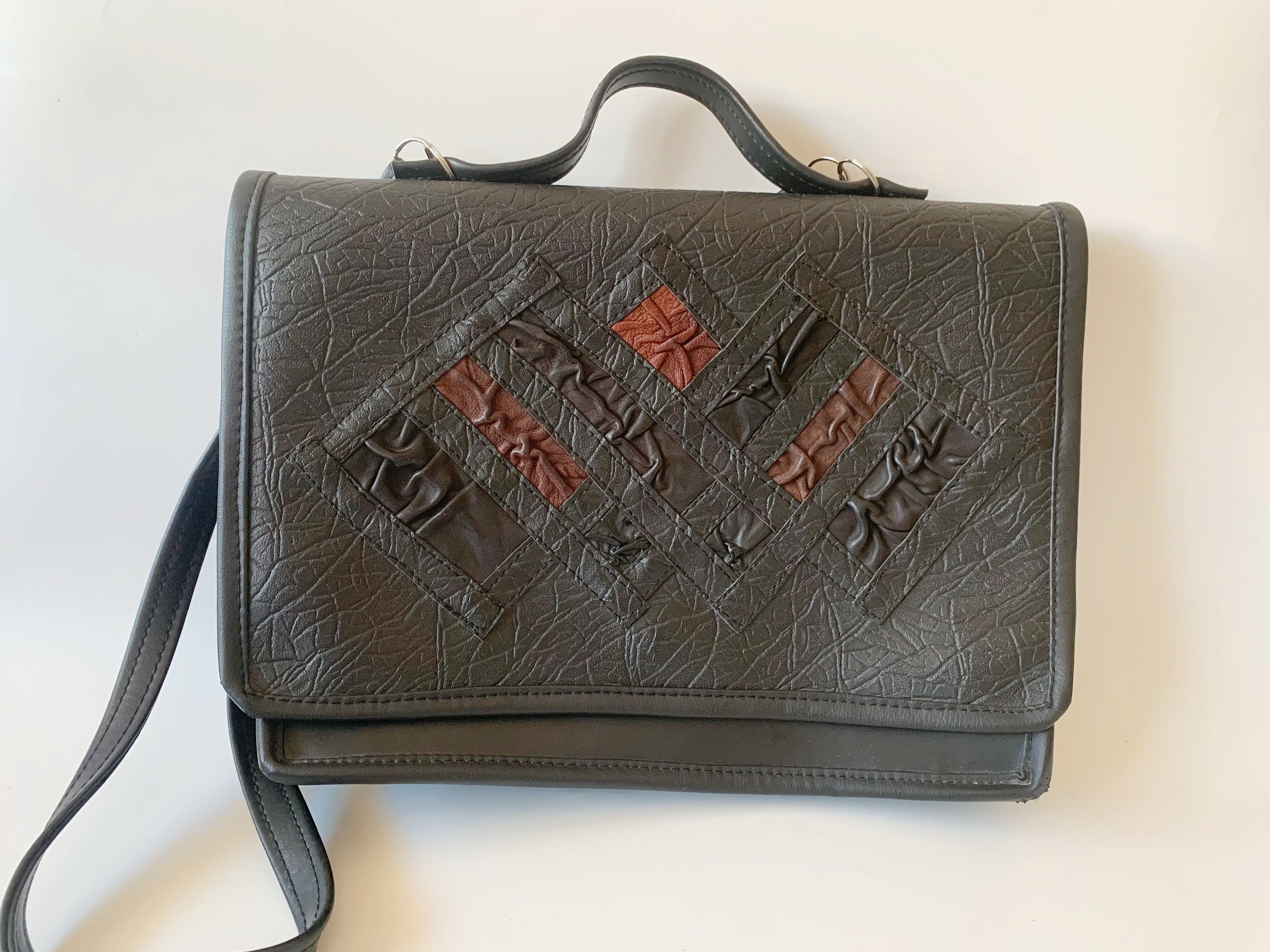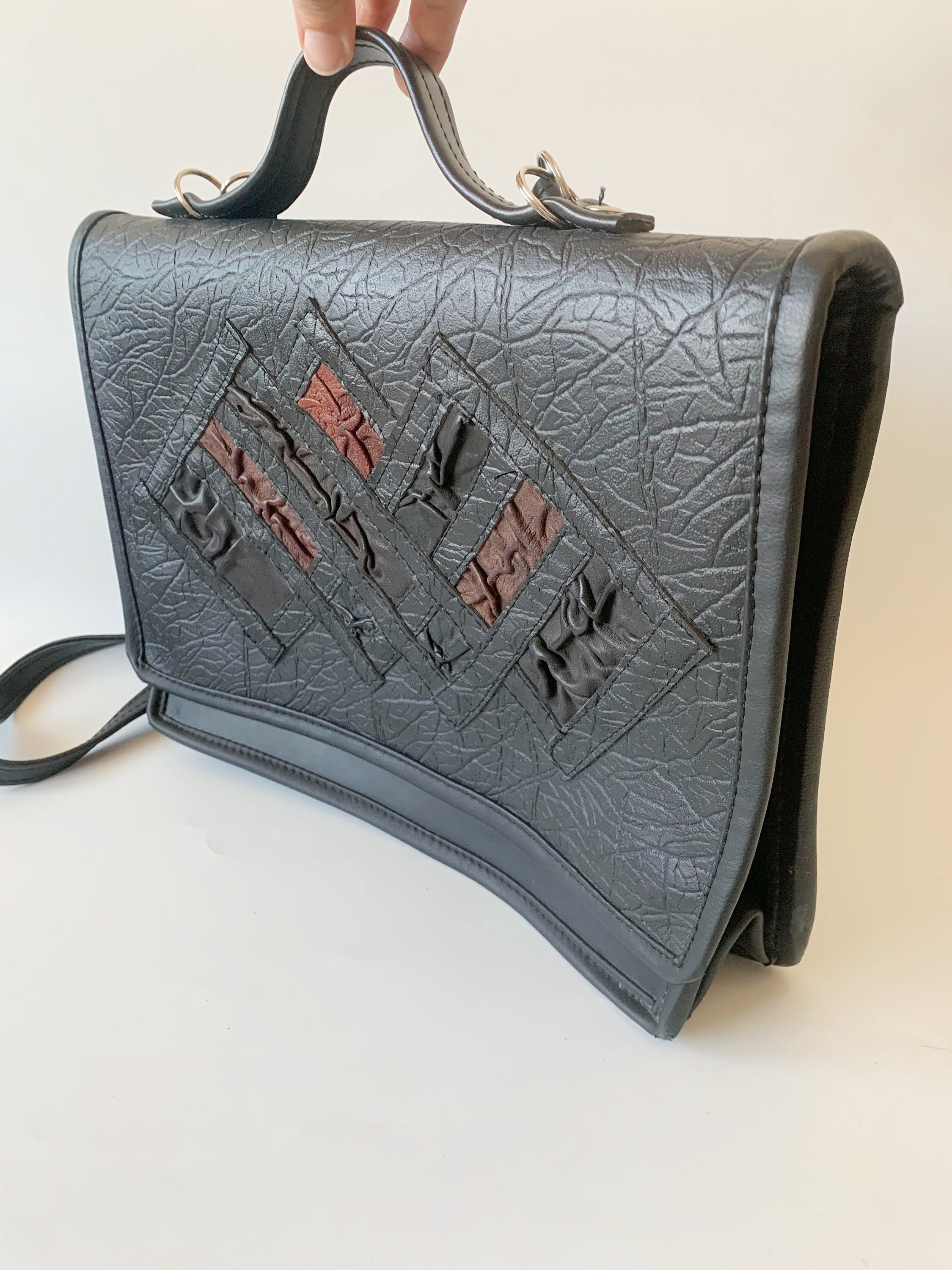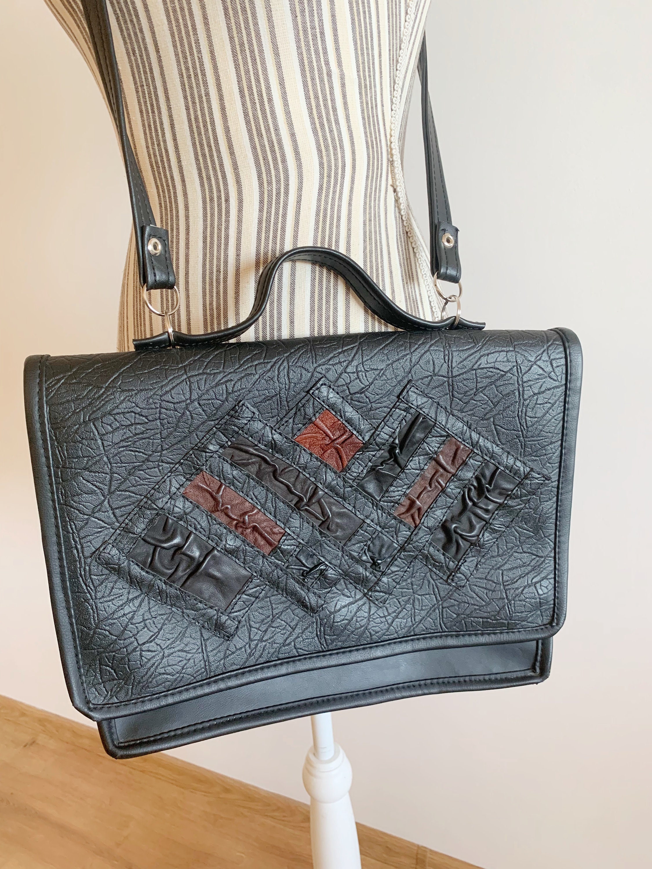 This is a vintage 90s distressed large black vegan leather satchel with brown and black real leather decoration. This faux leather top handle bag is spacious enough to fit in A4 documents. Perfect vintage messenger bag for women. This black vinyl shoulder bag has a long shoulder strap, so you can wear it as a shoulder or a crossbody bag. This large black satchel has magnetic closure. The interior is lined in felt wool fabric. There is one compartment, one large slip pocket and one pocket with zip closure.