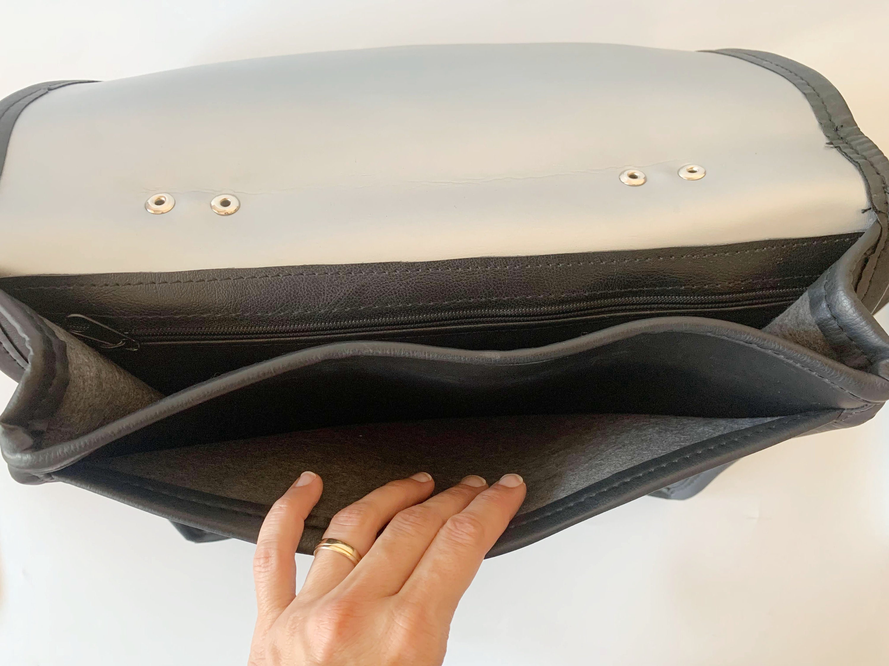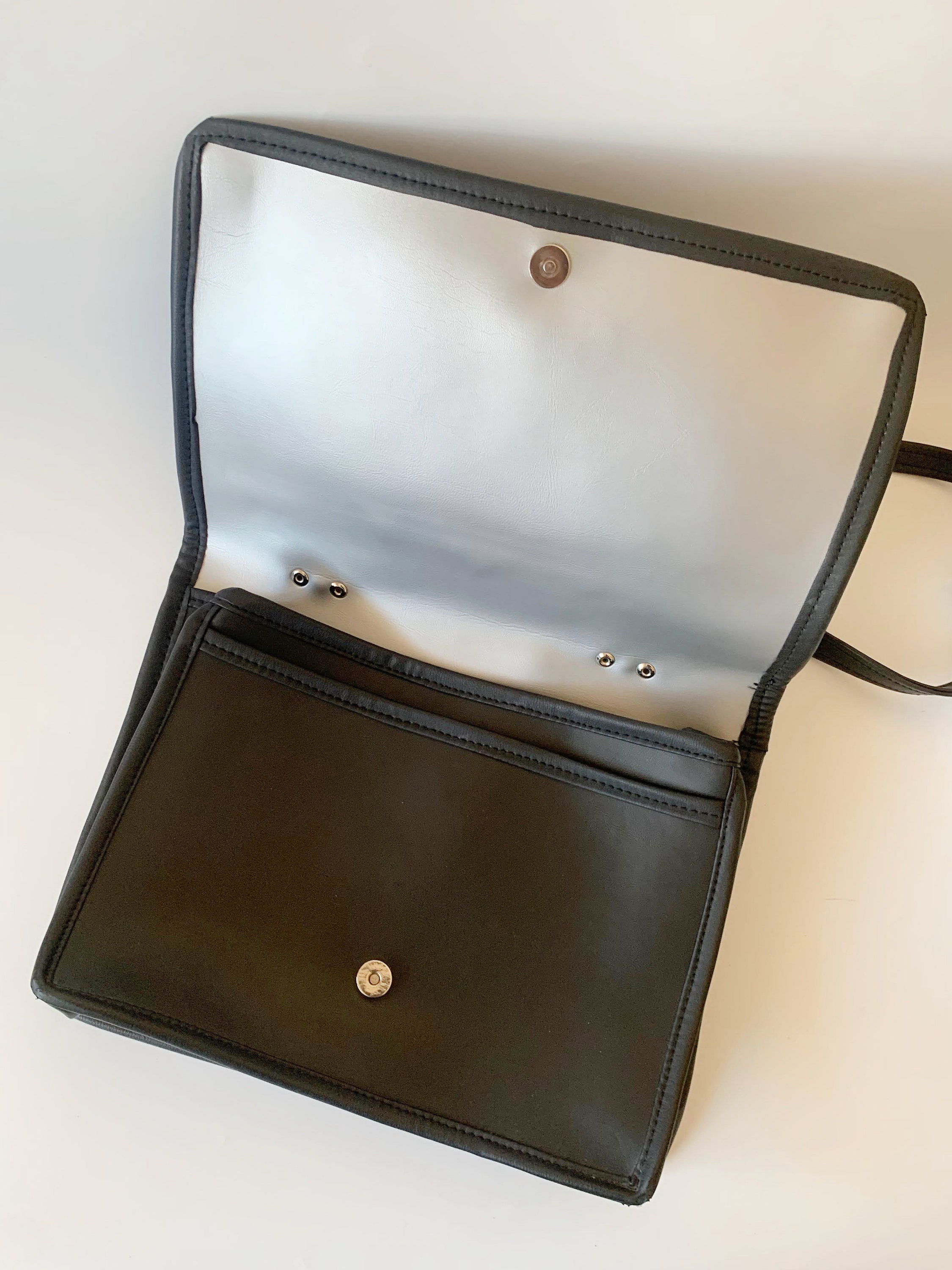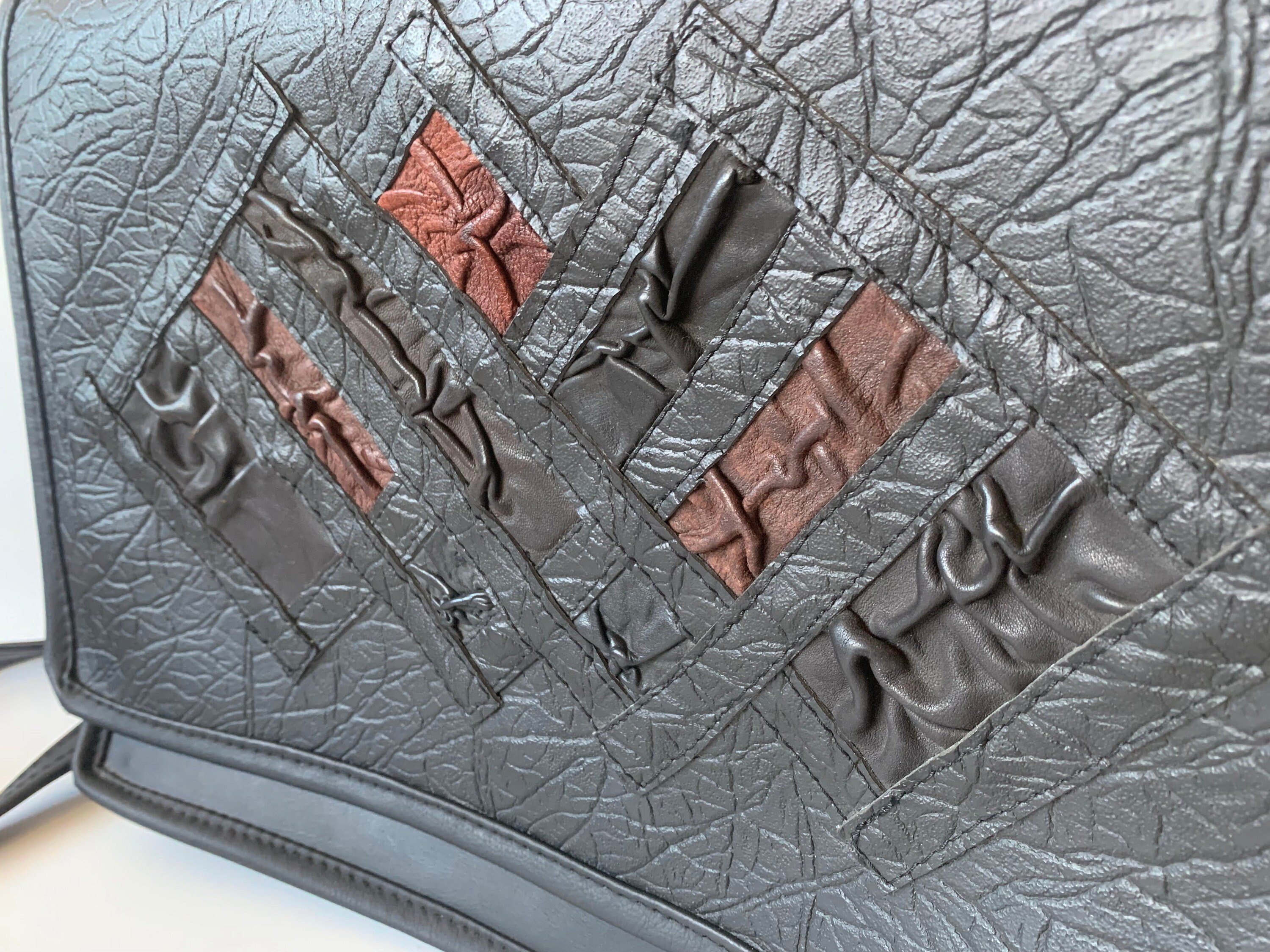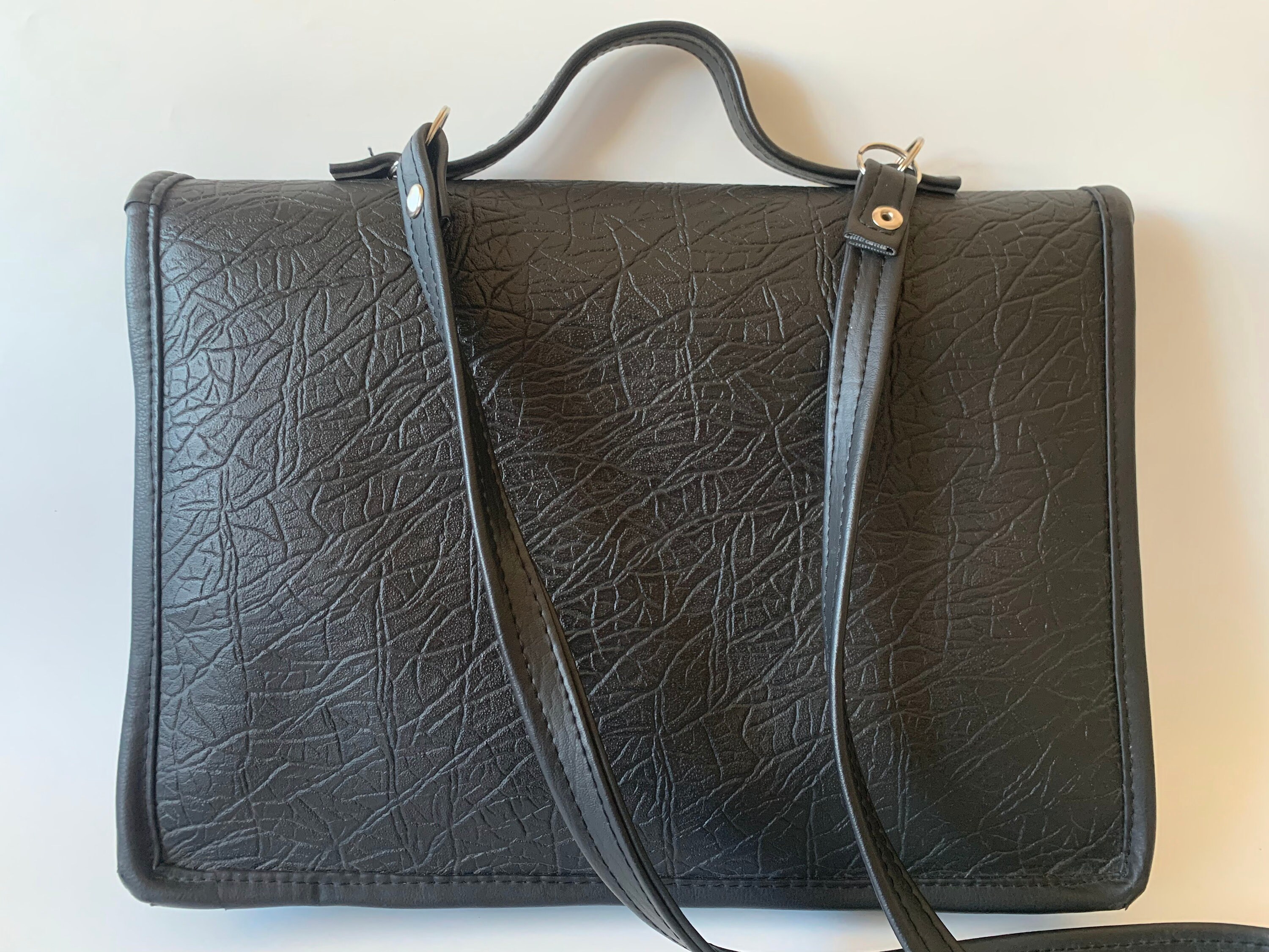 This is a vintage 90s distressed large black vegan leather satchel with brown and black real leather decoration. This faux leather top handle bag is spacious enough to fit in A4 documents. Perfect vintage messenger bag for women. This black vinyl shoulder bag has a long shoulder strap, so you can wear it as a shoulder or a crossbody bag. This large black satchel has magnetic closure. The interior is lined in felt wool fabric. There is one compartment, one large slip pocket and one pocket with zip closure.