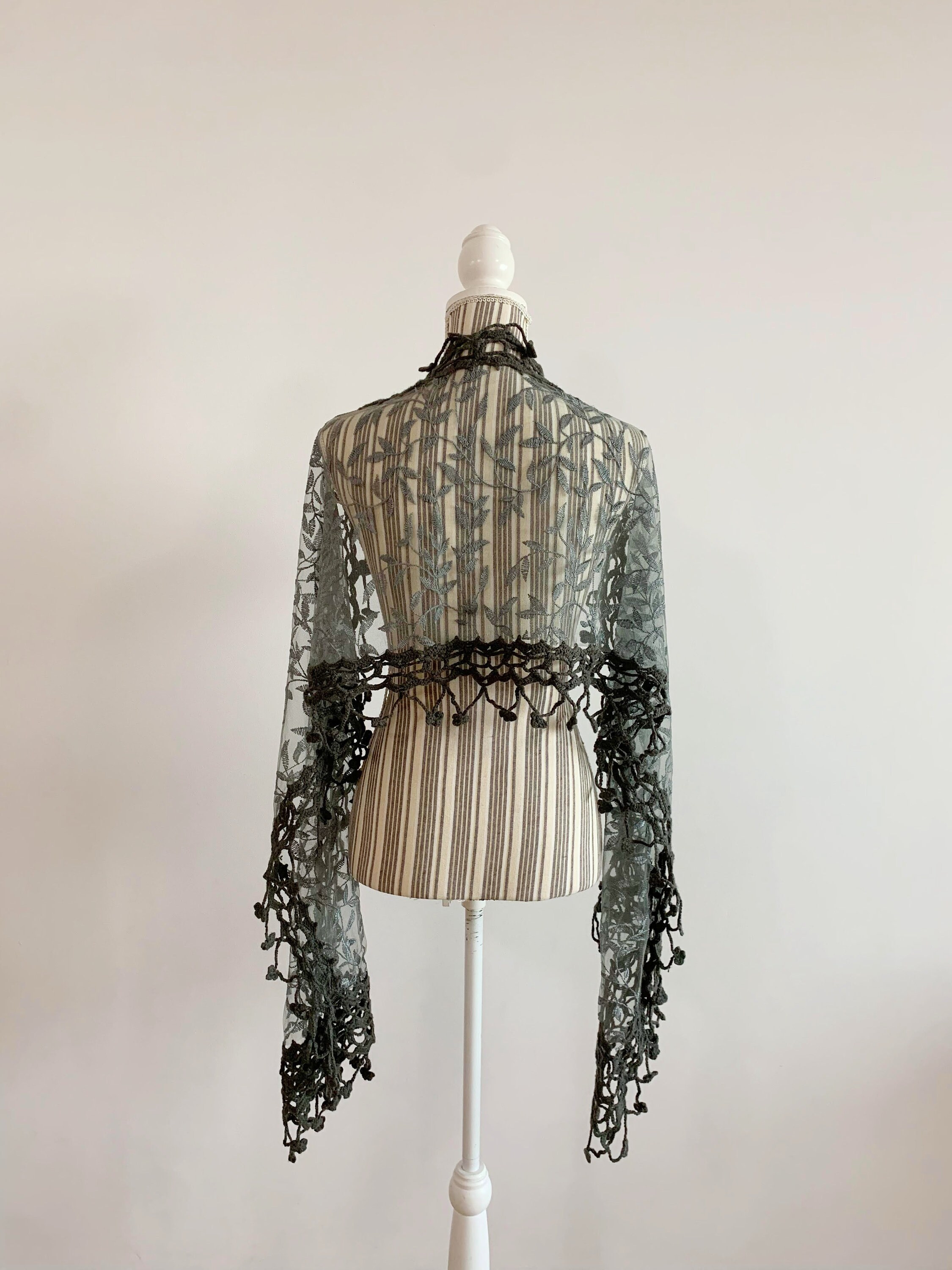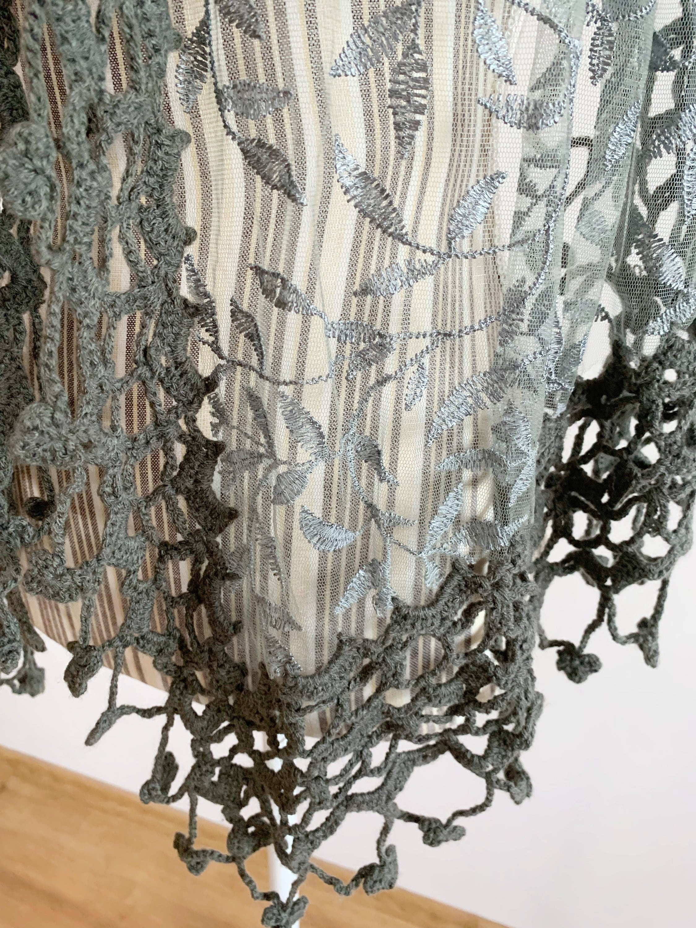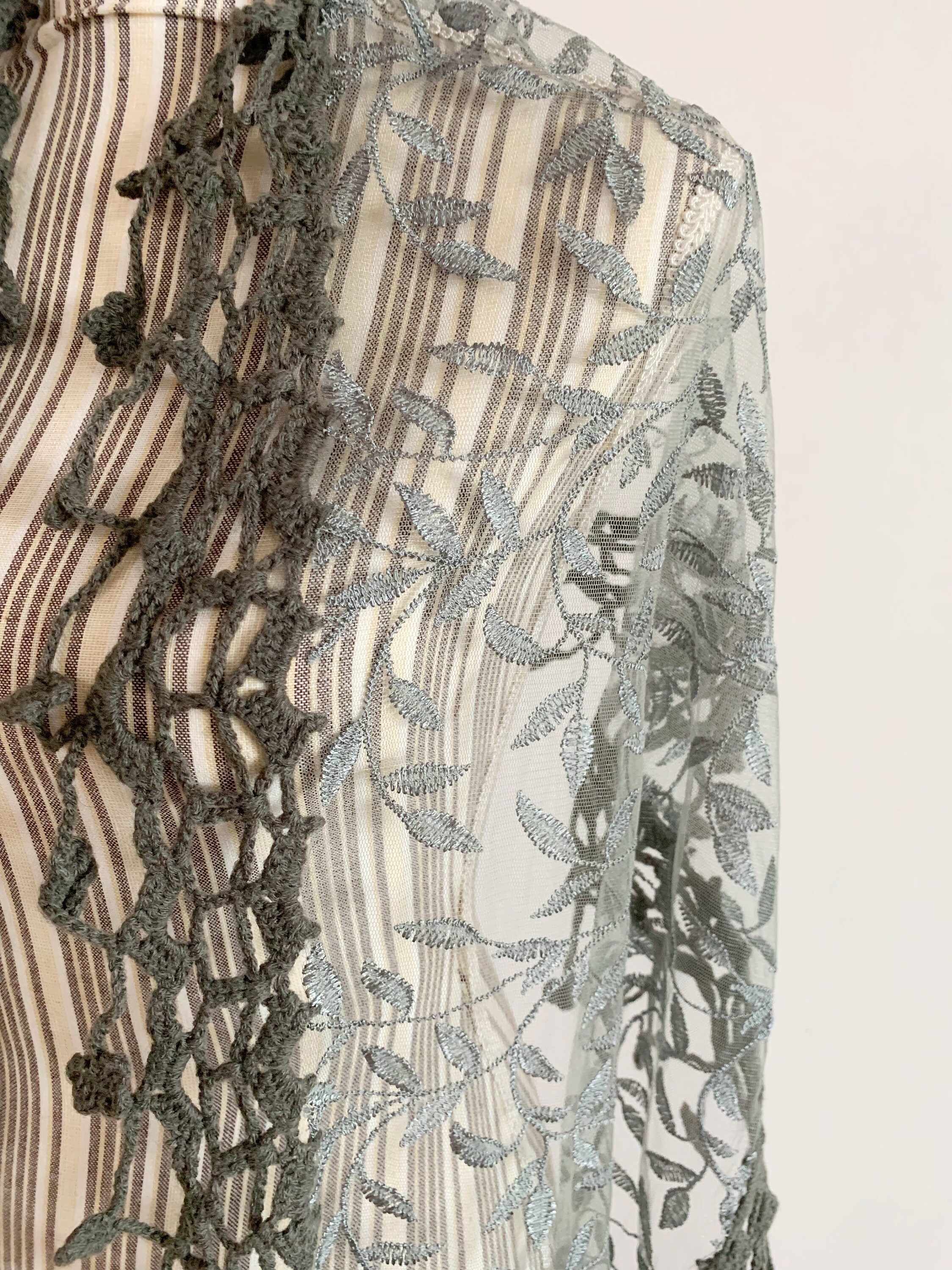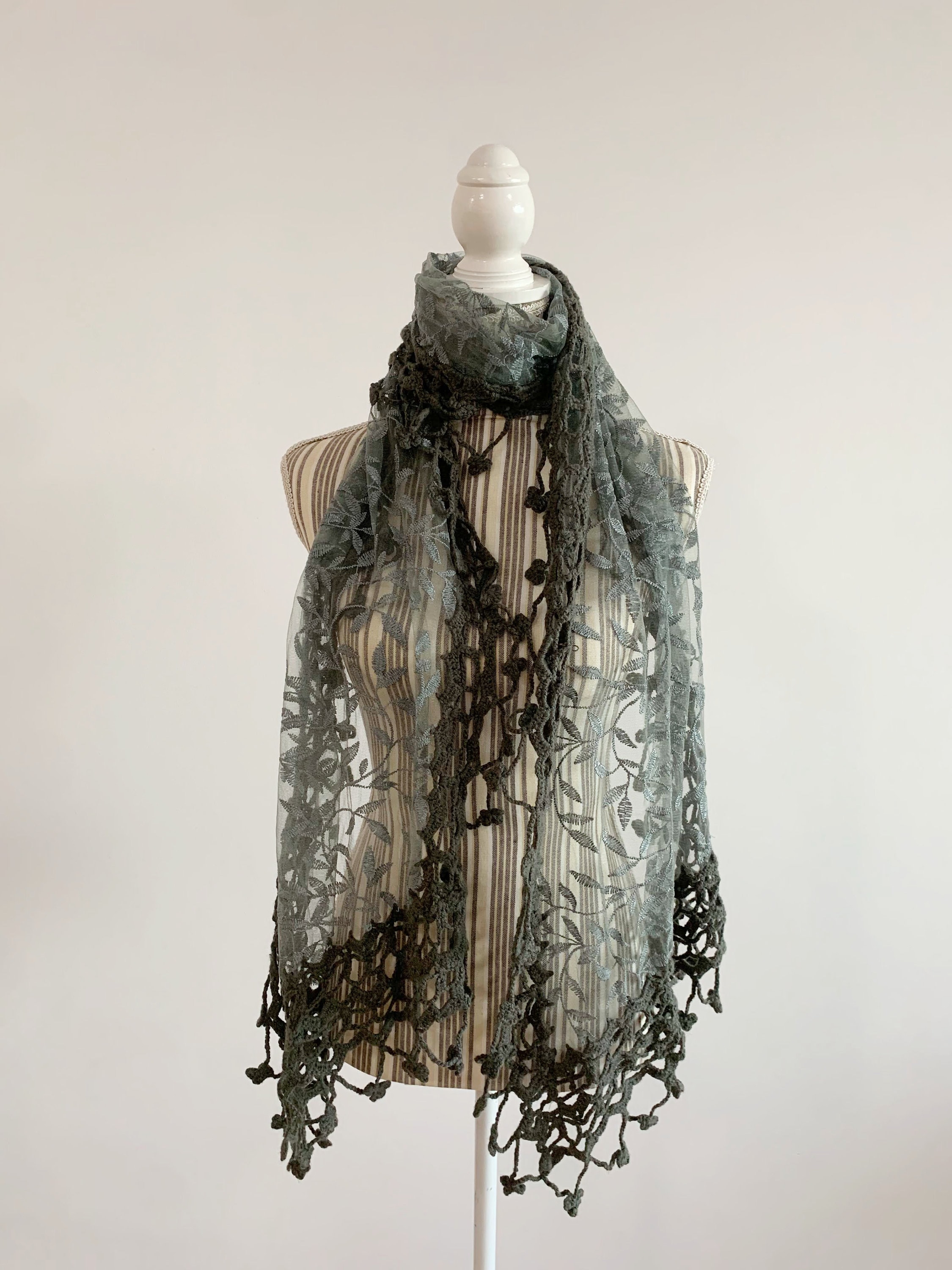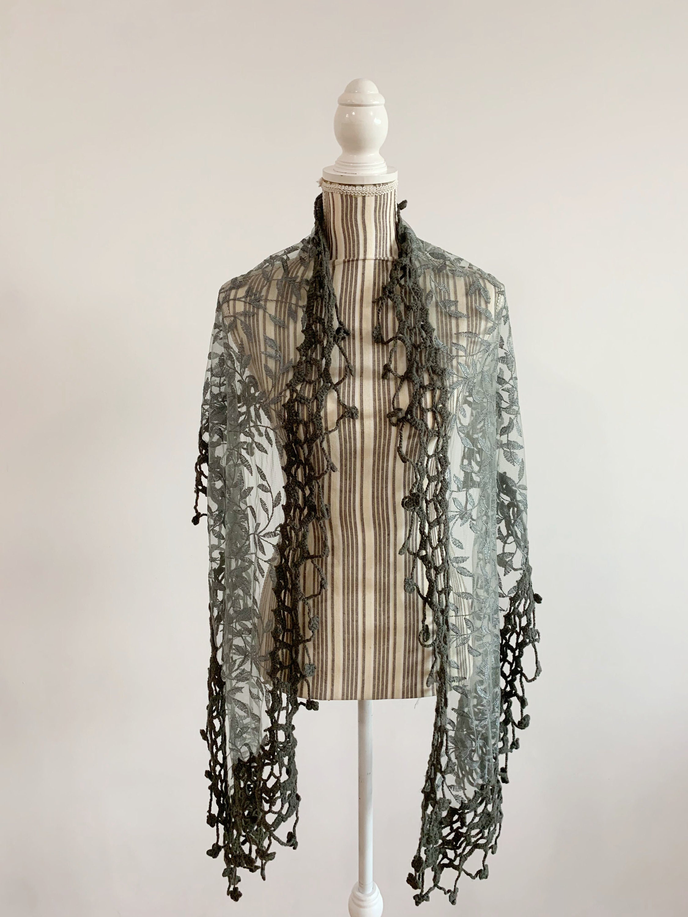This is a beautiful vintage 90s elegant cheer lace scarf in silver grey with crochet lace trim. This sheer lace oblong scarf is made of lightweight sheer fabric with gorgeous leaves print, which has a beautiful silky shine and handmade crochet lace detailing around the edges. This silver grey lace scarf is perfect to wear during the day or in the evenings.