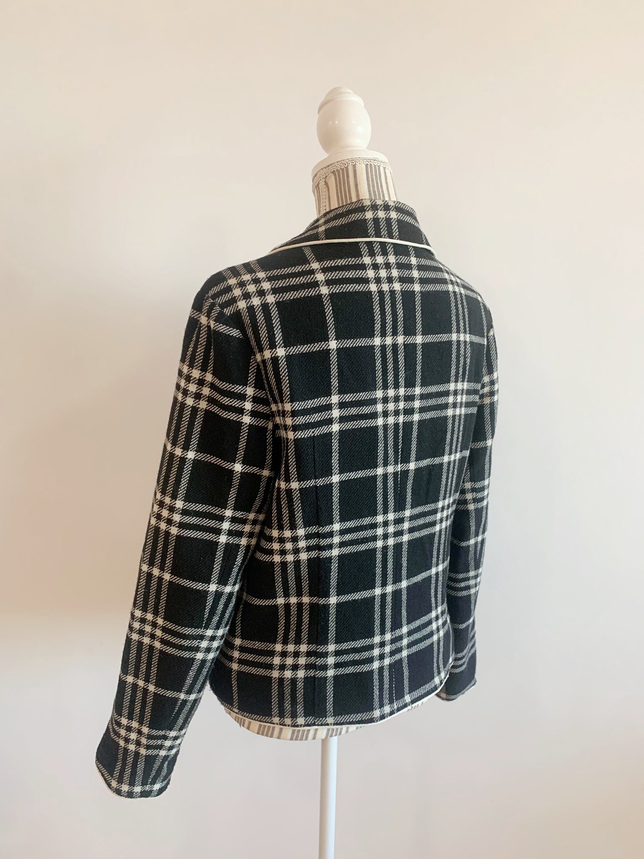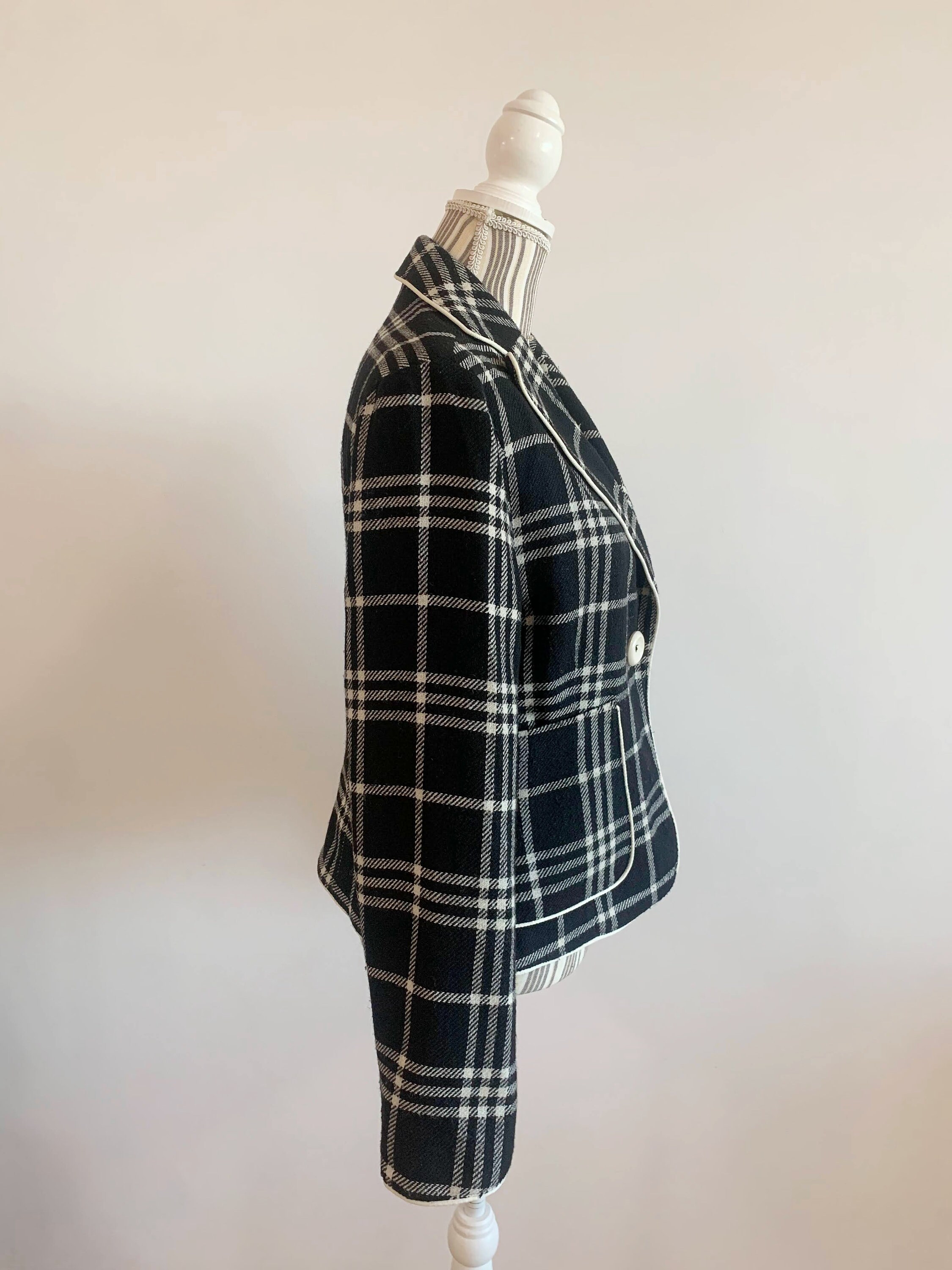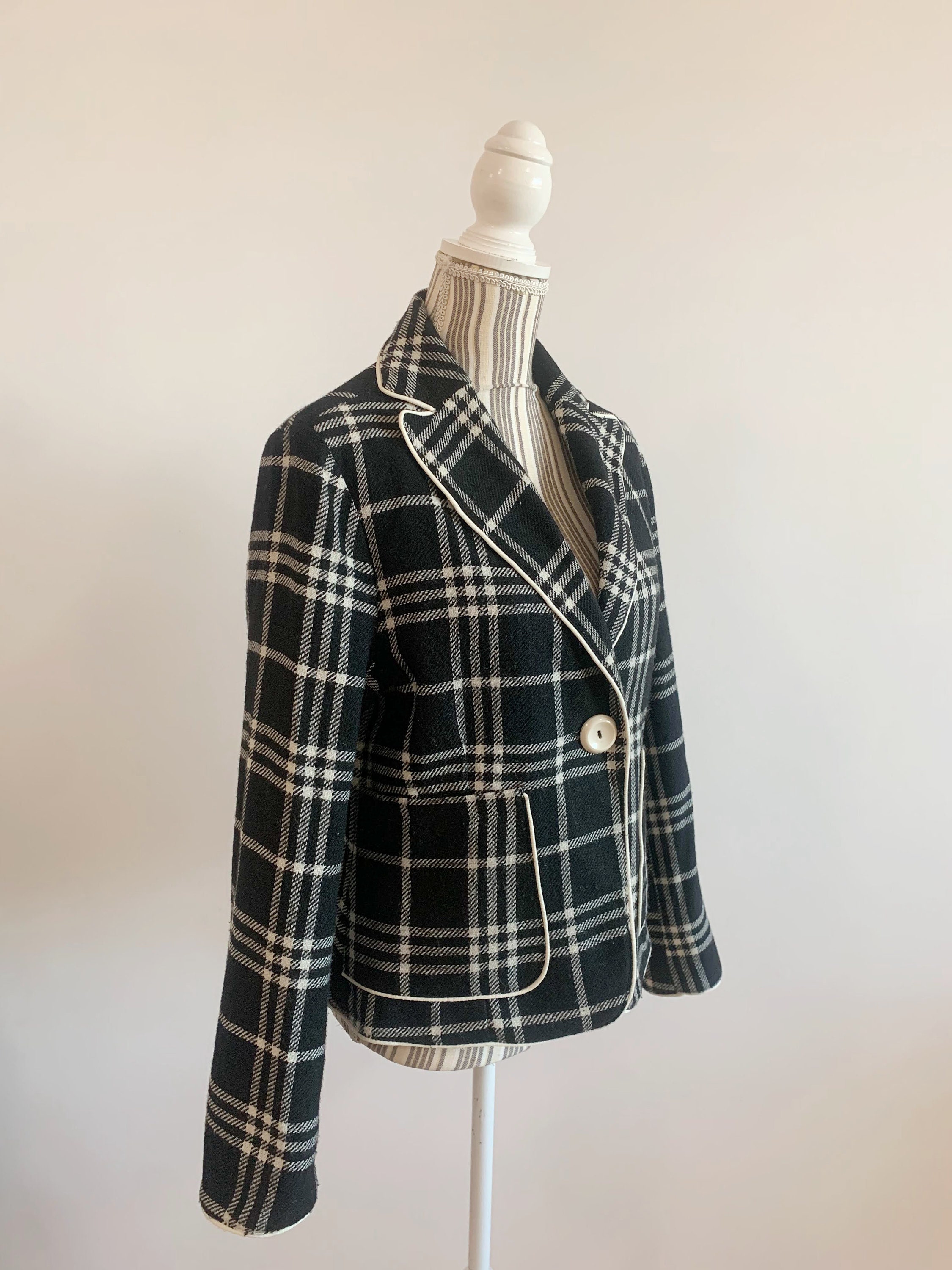 This is s beautiful vintage Y2K classic cropped wool mic tartan blazer jacket for women size L. This check blazer jacket is made of warm wool mix fabric. It has two size pockets. Simple classic design.