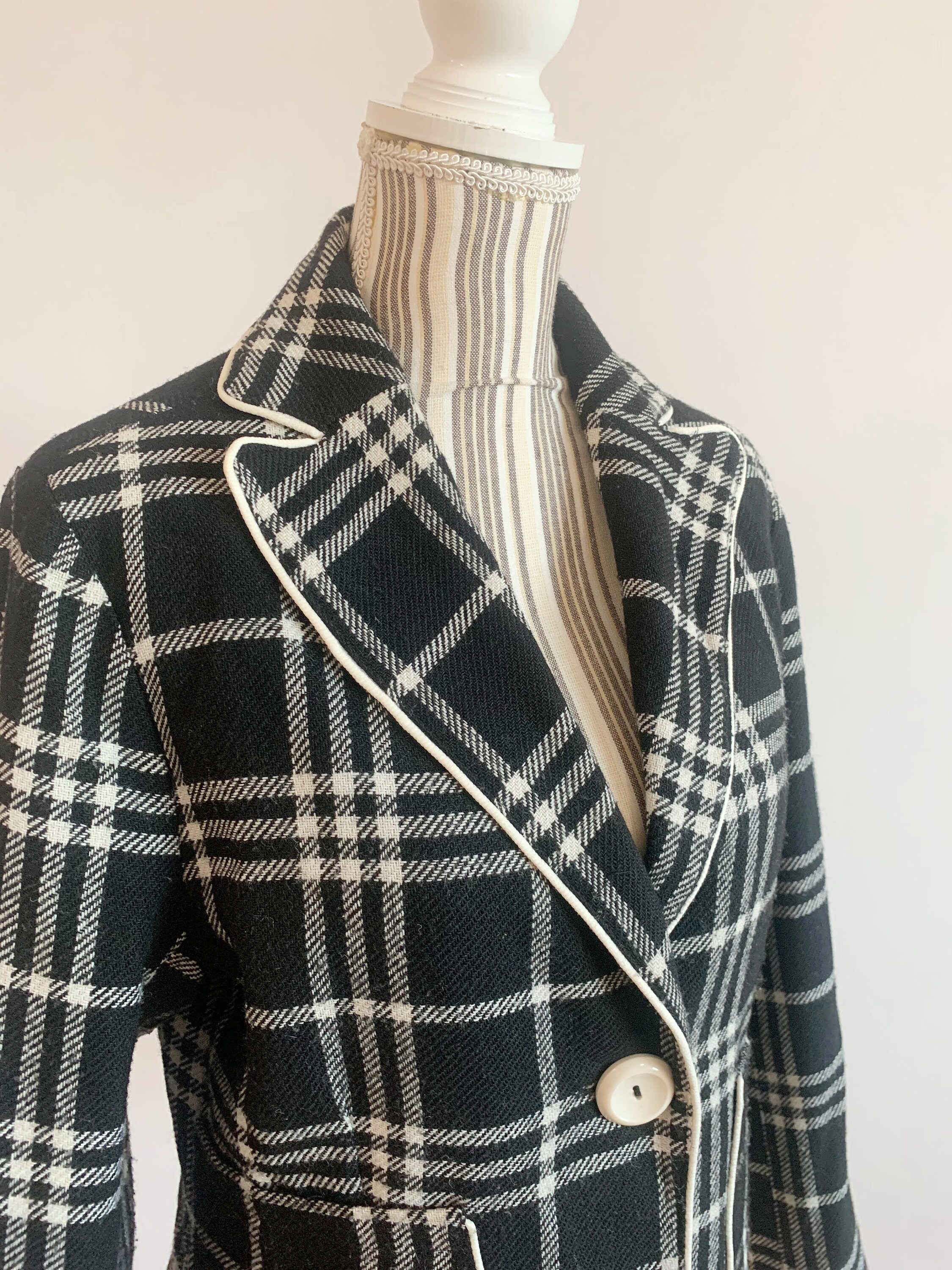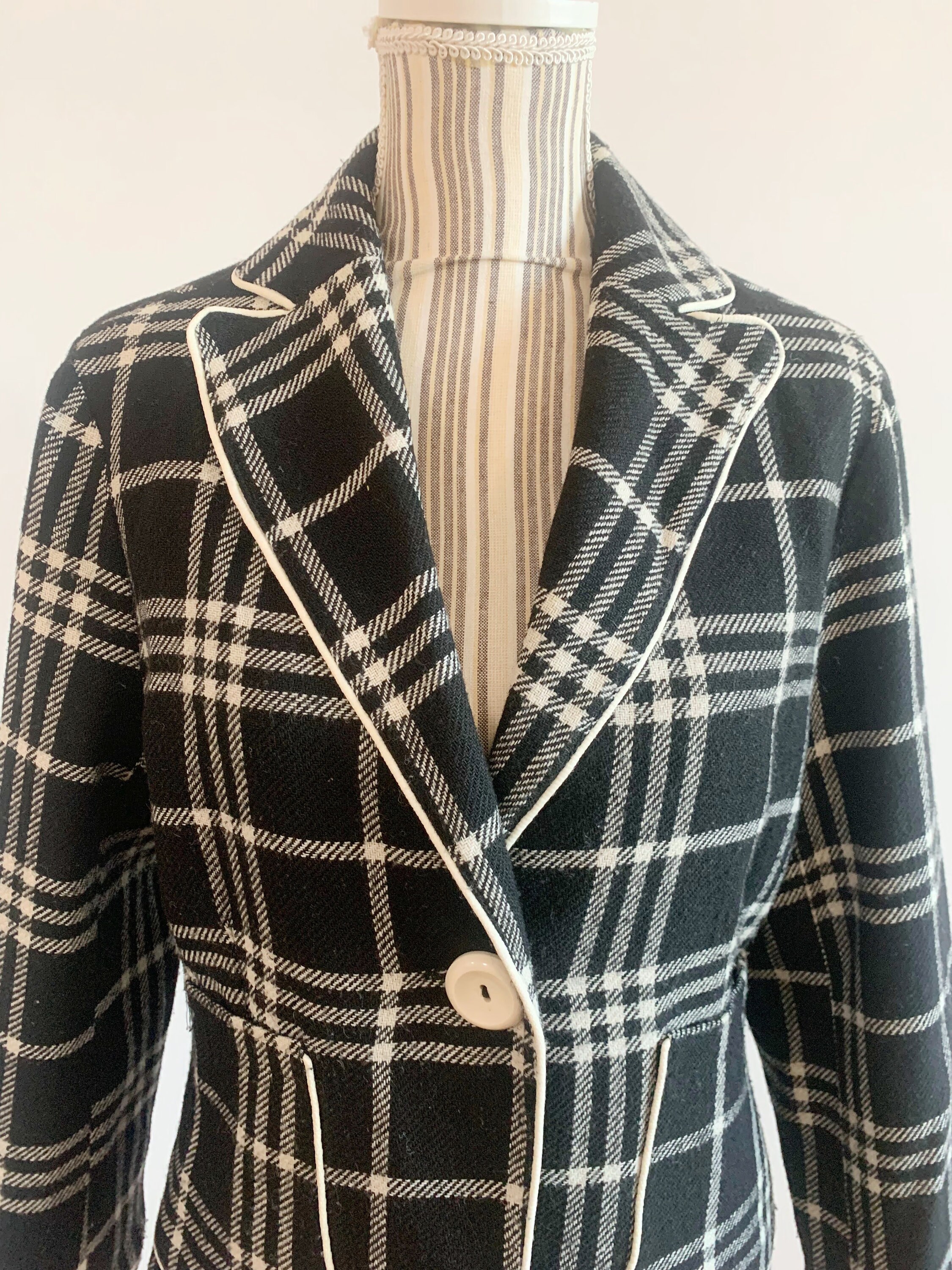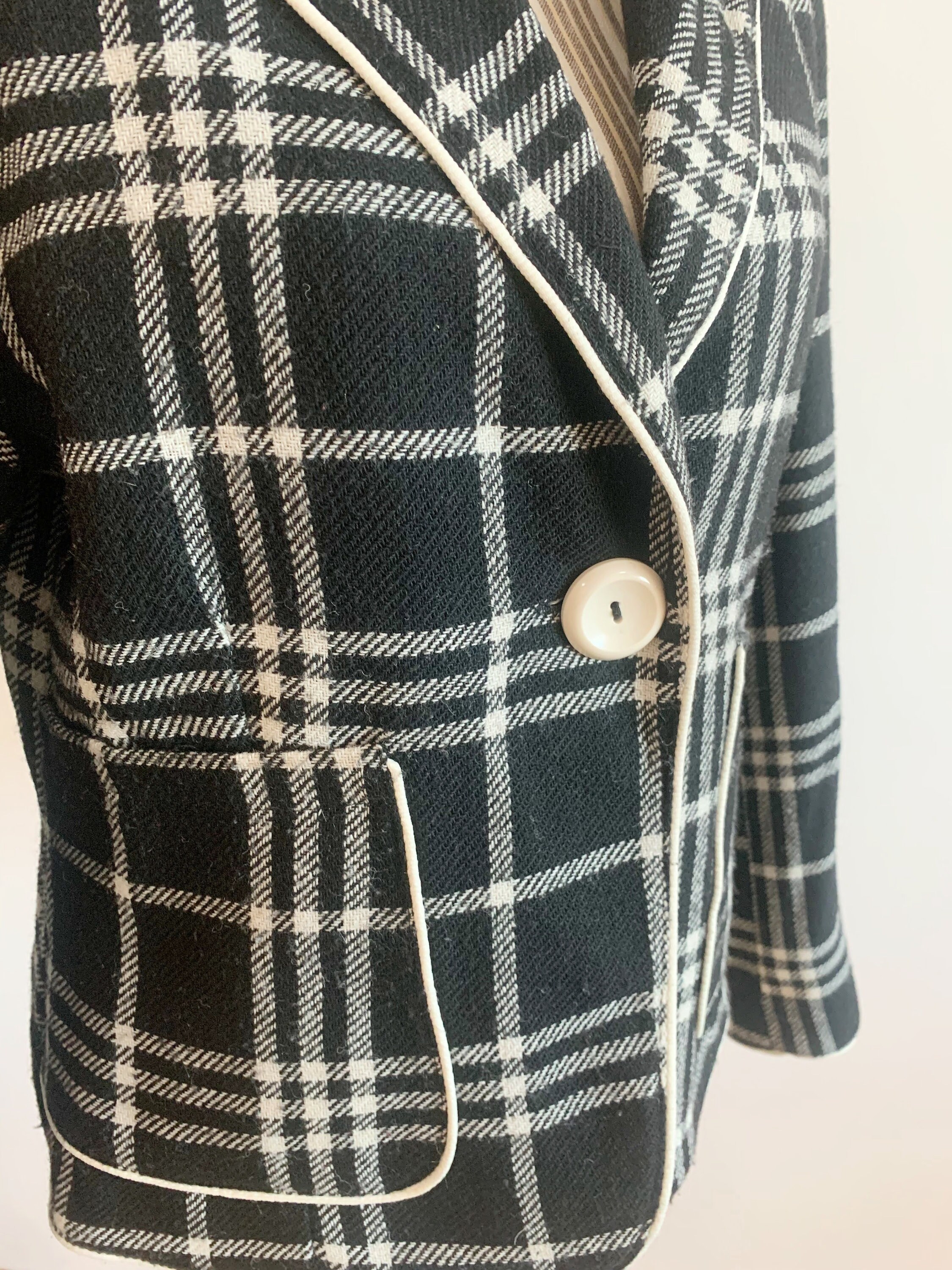 This is s beautiful vintage Y2K classic cropped wool mic tartan blazer jacket for women size L. This check blazer jacket is made of warm wool mix fabric. It has two size pockets. Simple classic design.