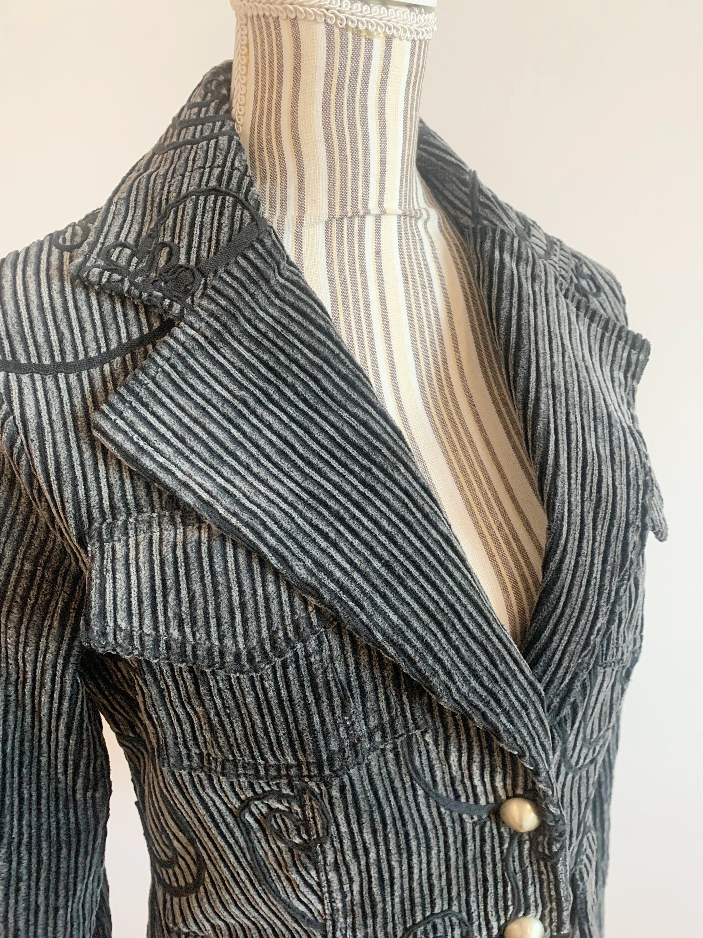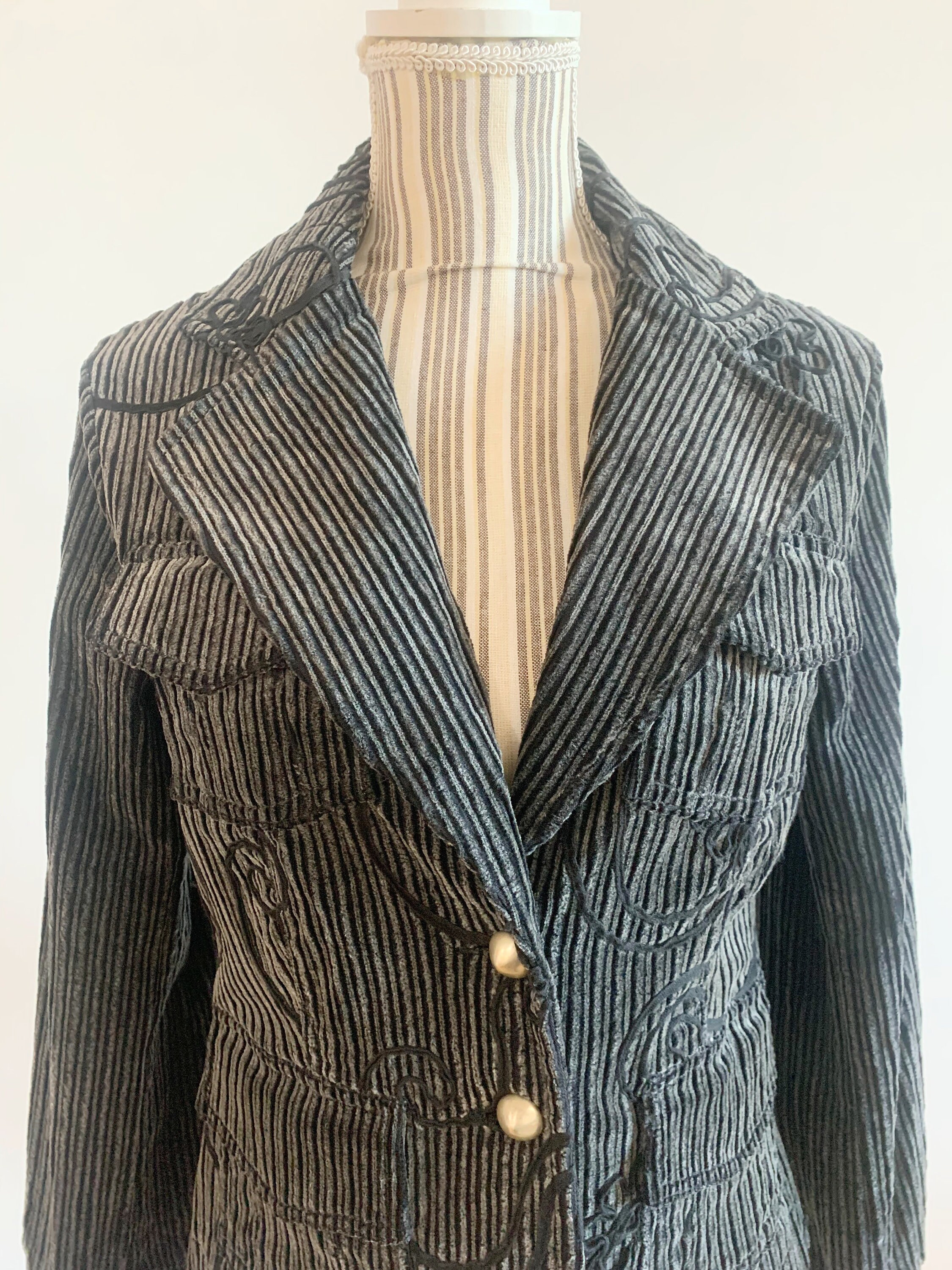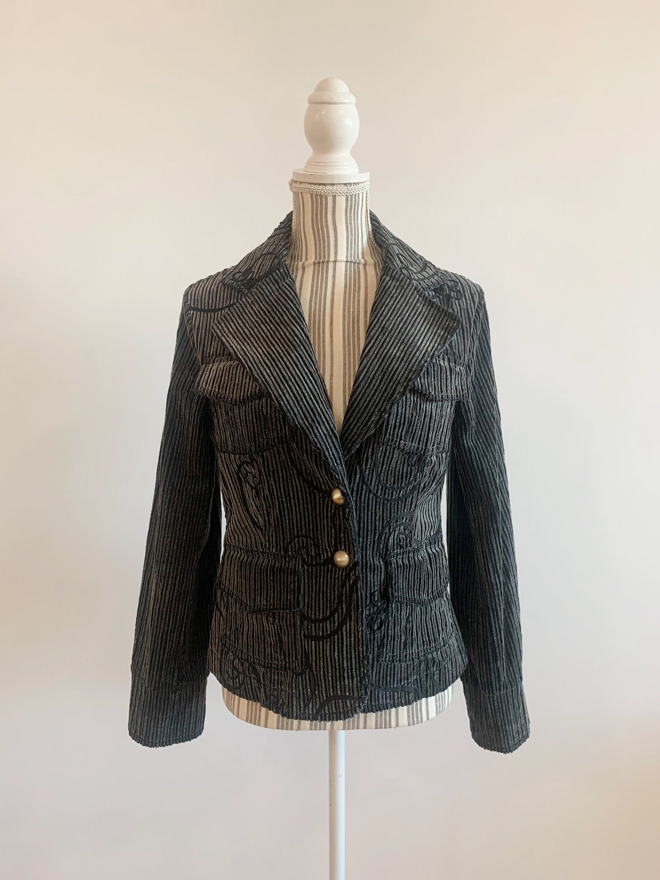 This is s vintage 90s silver grey cotton corduroy blazer jacket for women with two button closure and two sets of pockets. This floral print velvet coat has an elegant slim fit silhouette. Perfect for the spring fall season. Fits like size S women's