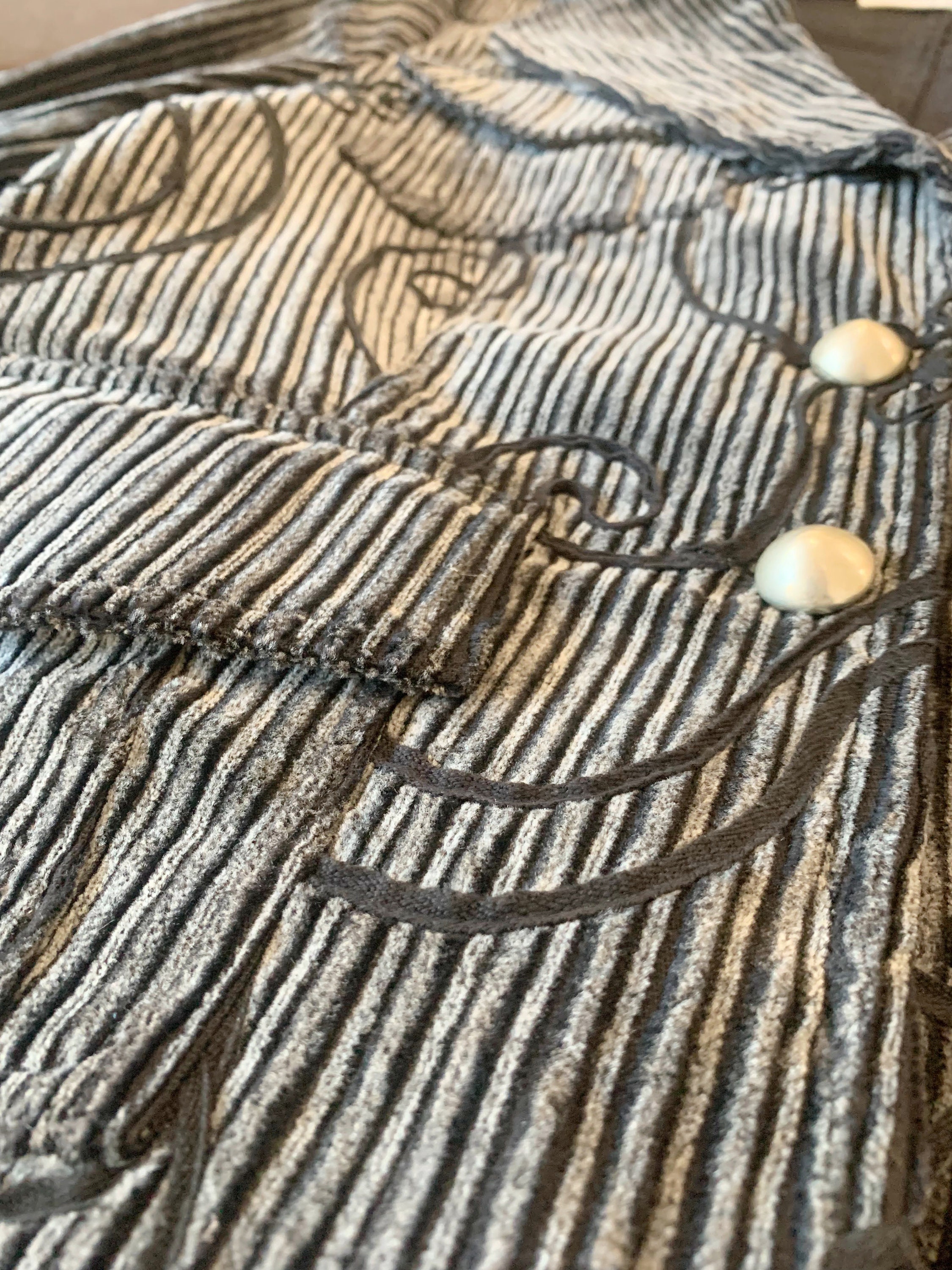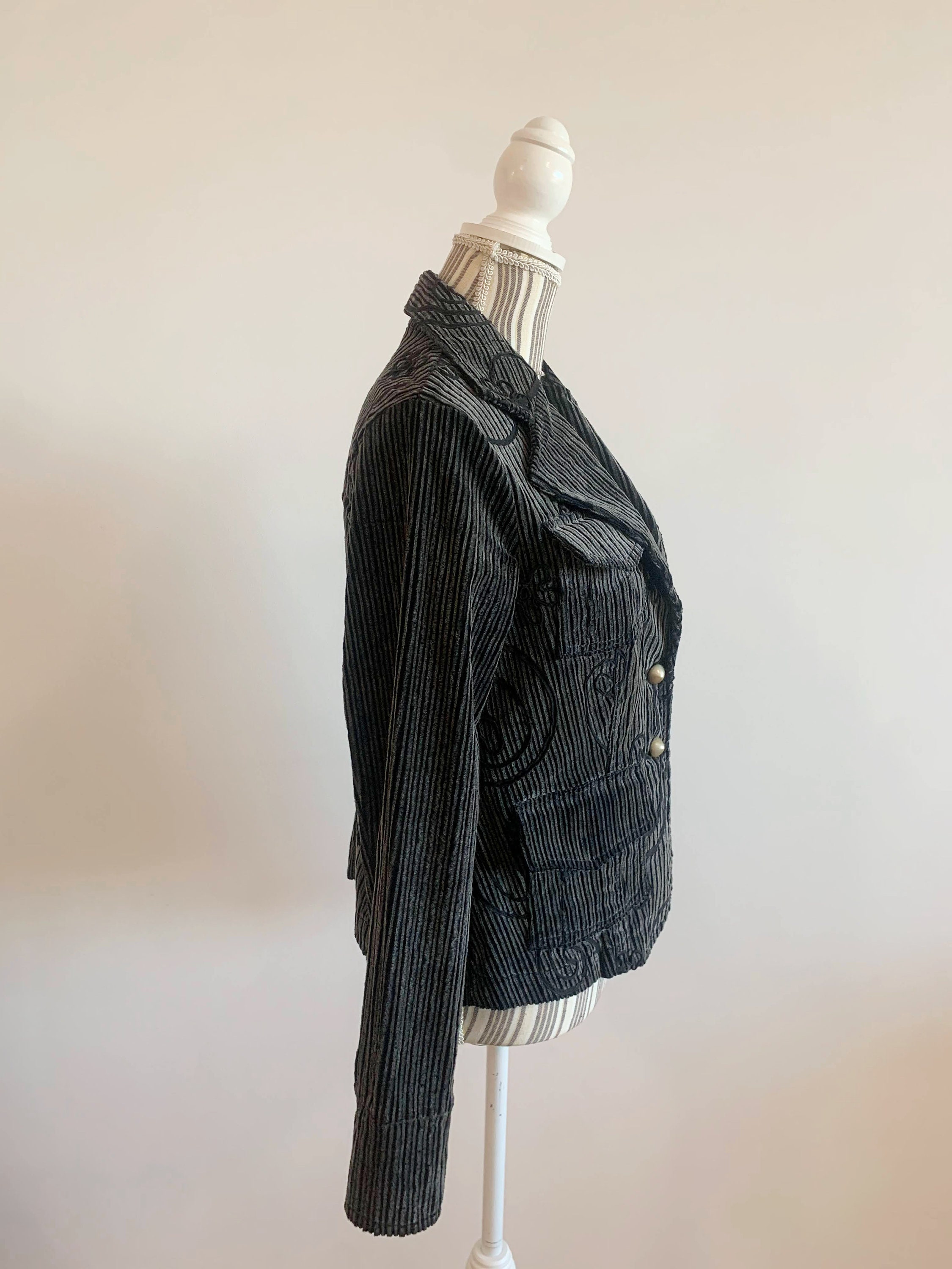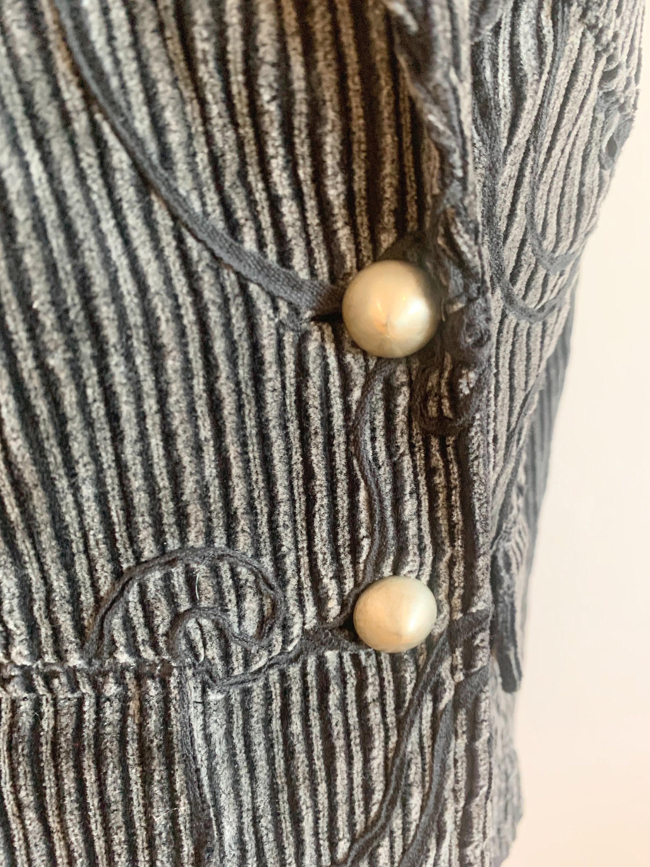 This is s vintage 90s silver grey cotton corduroy blazer jacket for women with two button closure and two sets of pockets. This floral print velvet coat has an elegant slim fit silhouette. Perfect for the spring fall season. Fits like size S women's