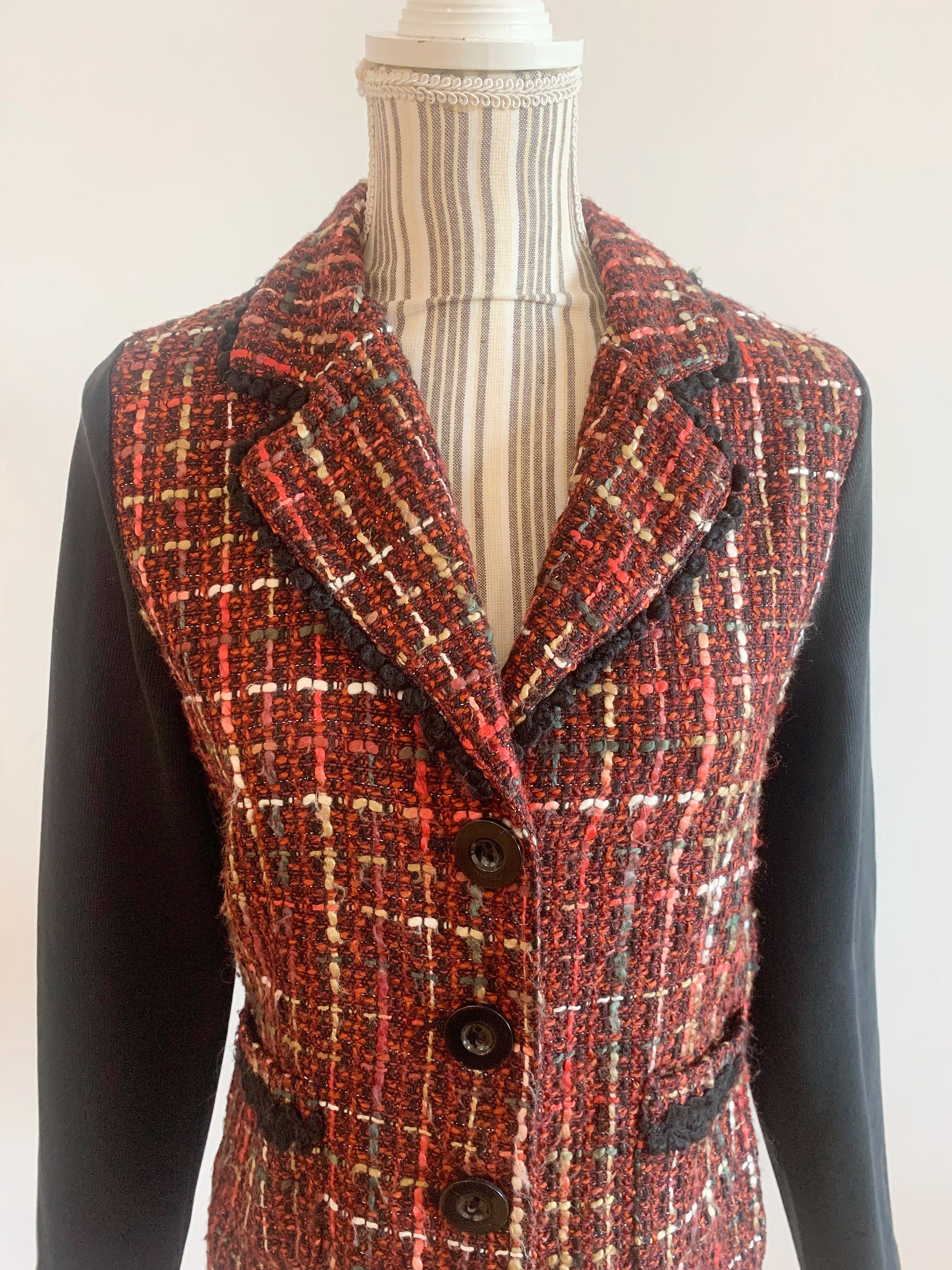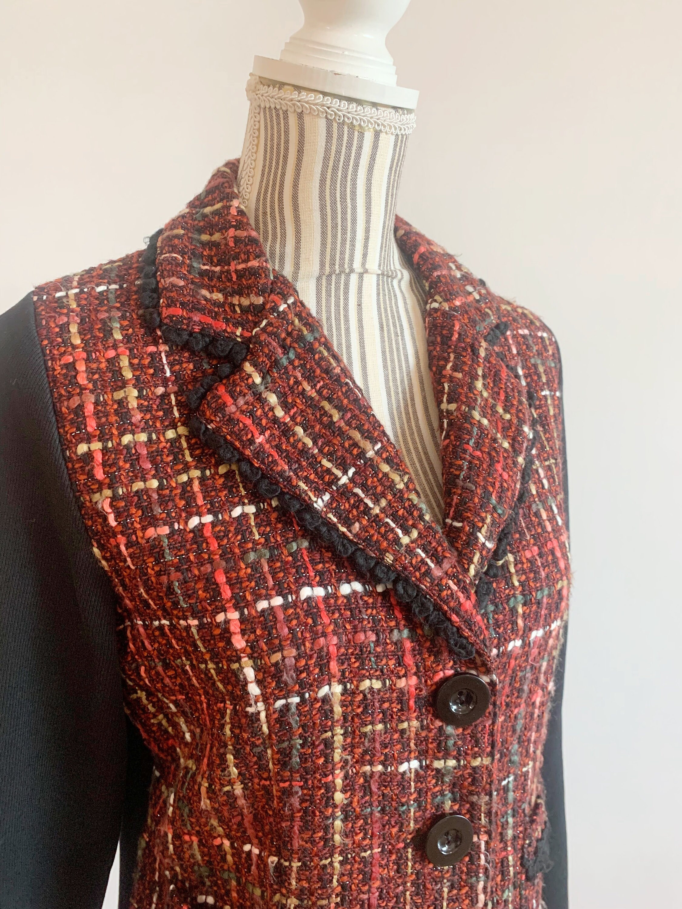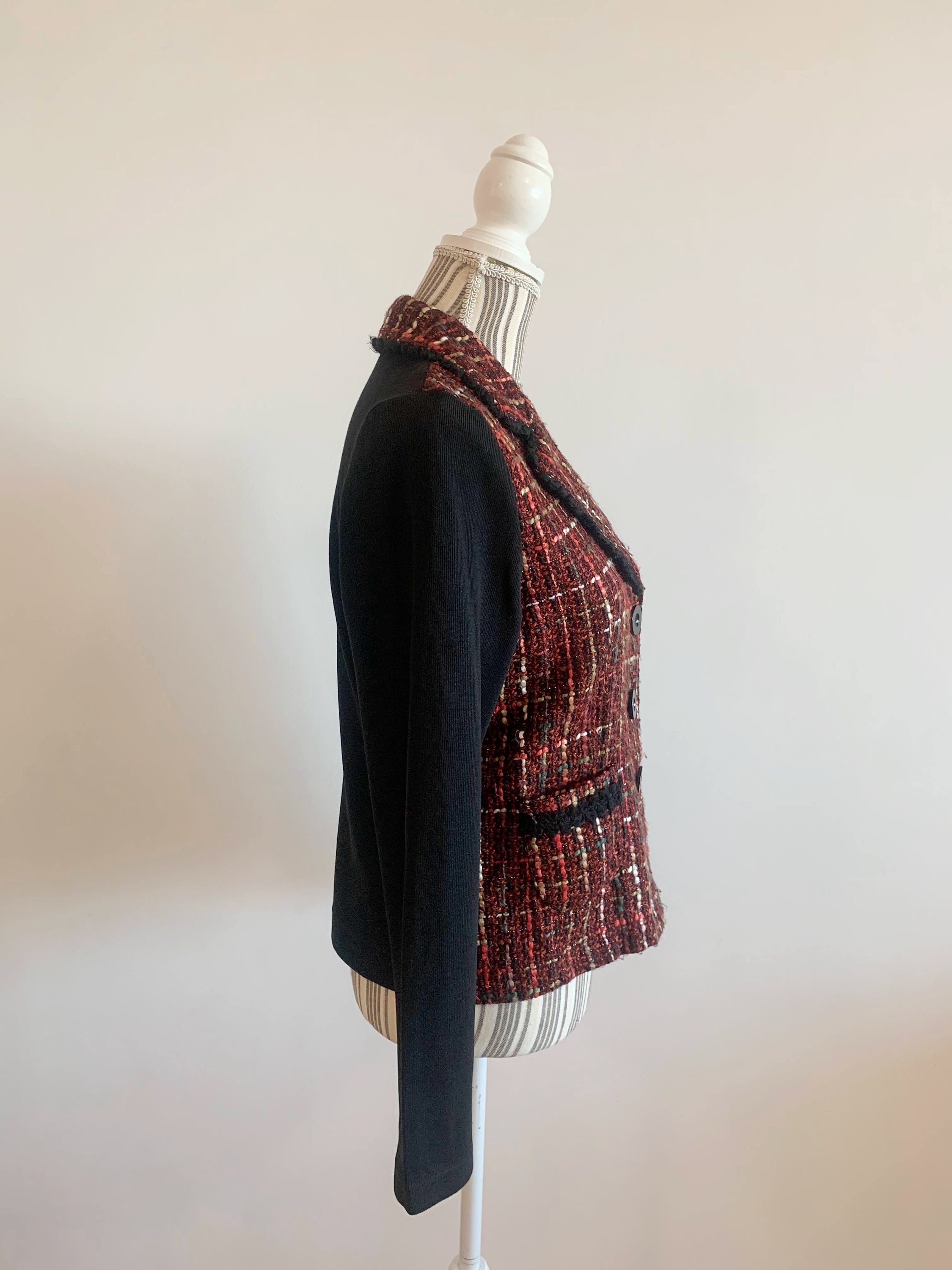 This is s beautiful vintage 90s relaxed fit plaid tweed blazer jacket for women size M. This boucle tweed blazer is made of two types of fabric - fluffy boucle tweed fabric at the front and black stretchy jersey fabric at the back and the sleeves. This cropped blazer jacket fits like size M
