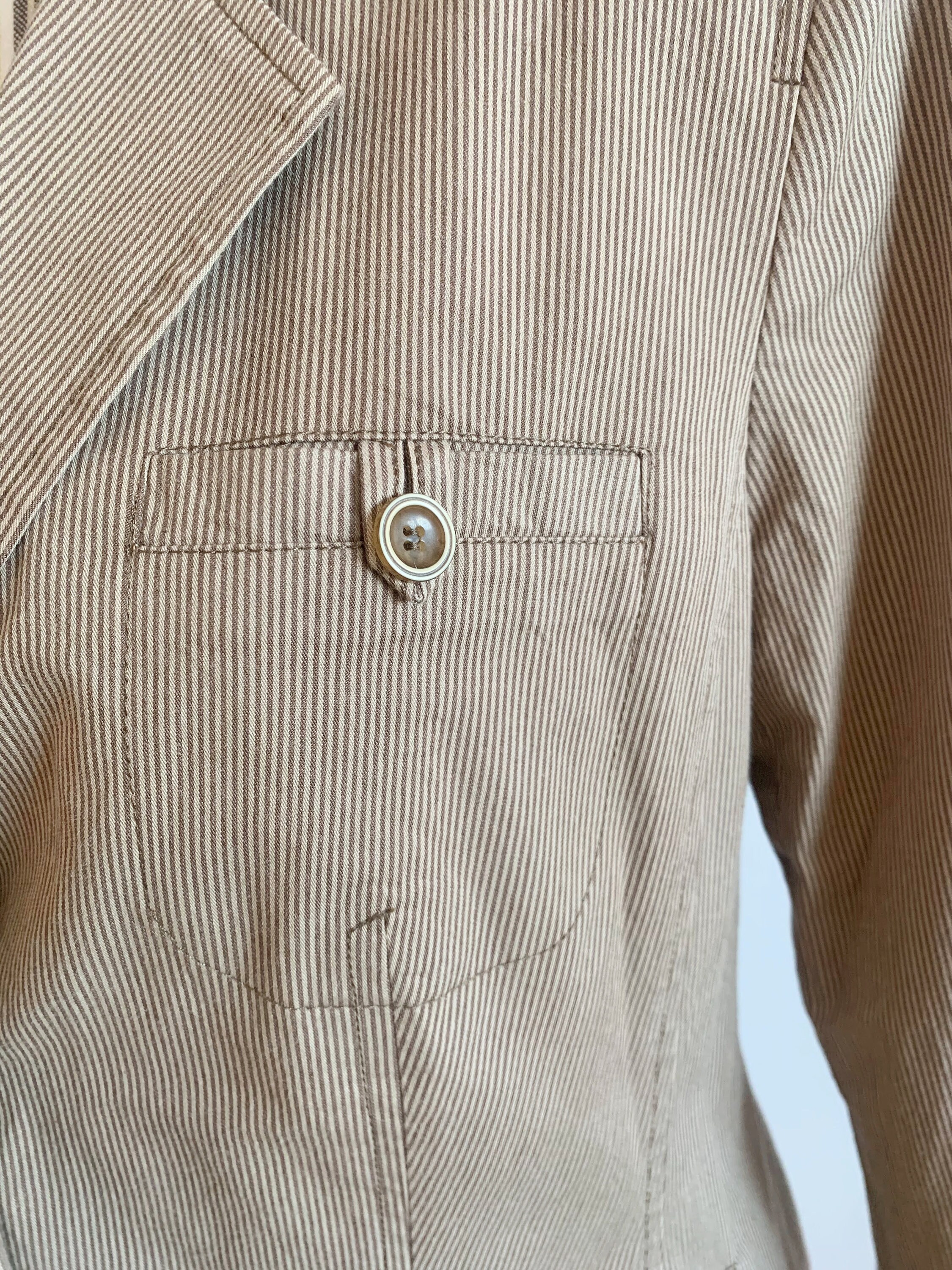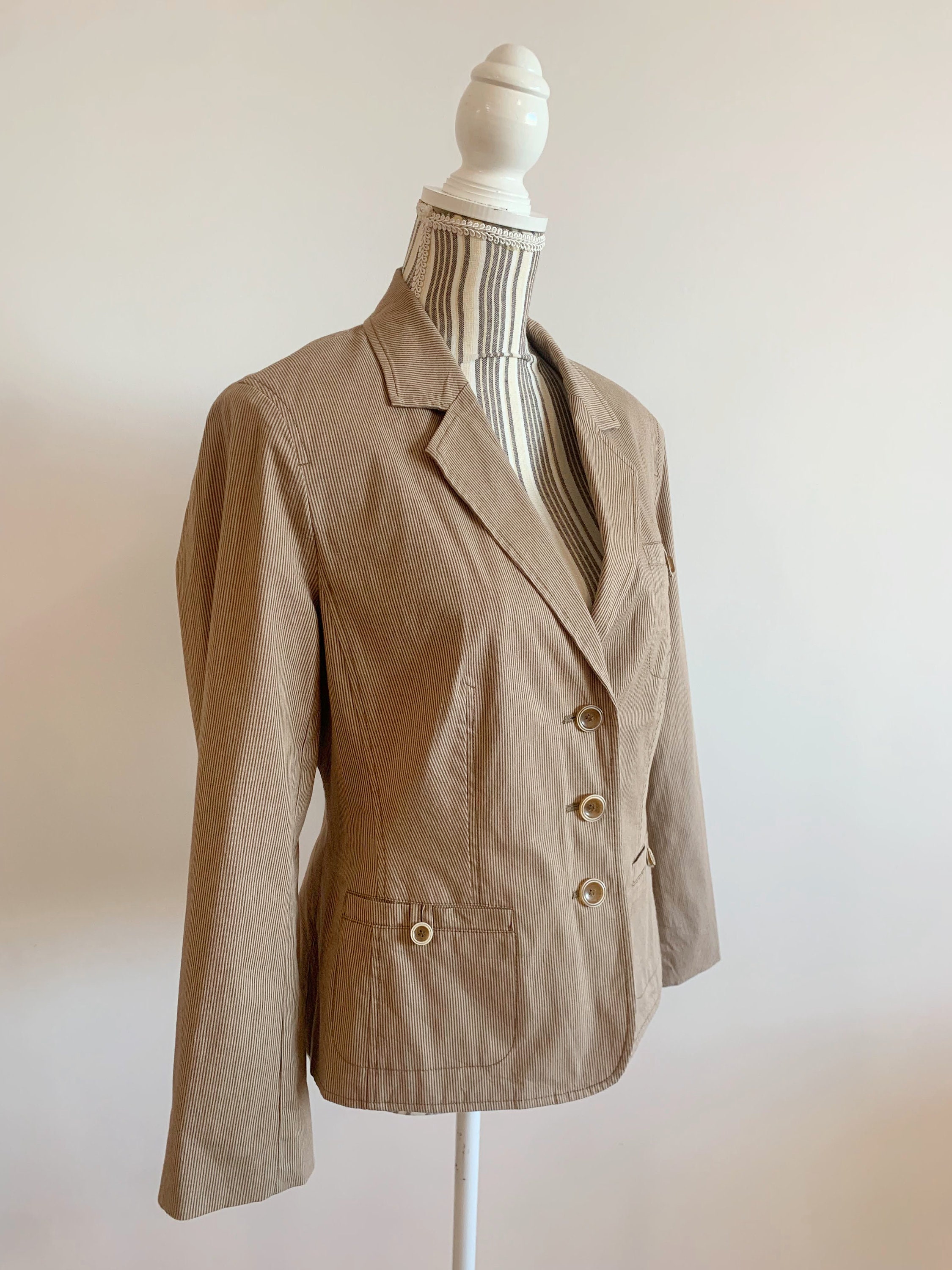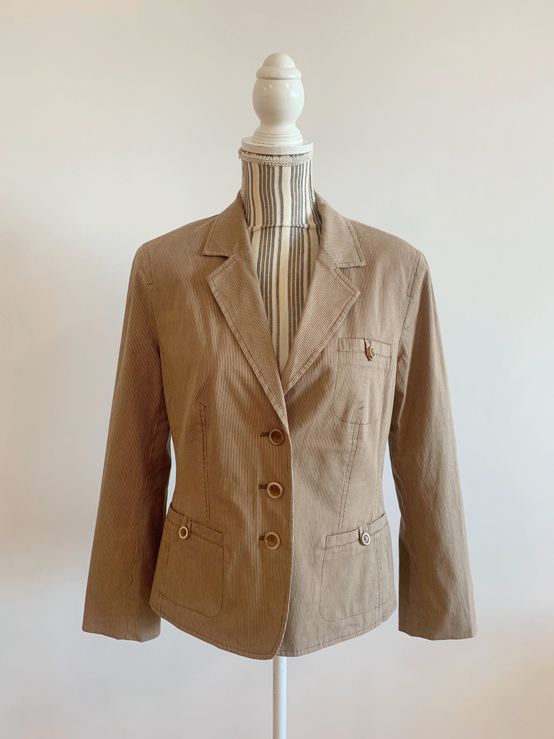 This is a simple minimalist striped tan beige cotton blazer jacket for women by Betty Barclay. This casual sports coat has a classic design, pockets and three button closure. It has delicate came brown stripes over tan beige base. It is made of cotton fabric with cotton lining. This 90s blazer jacket fits like size M