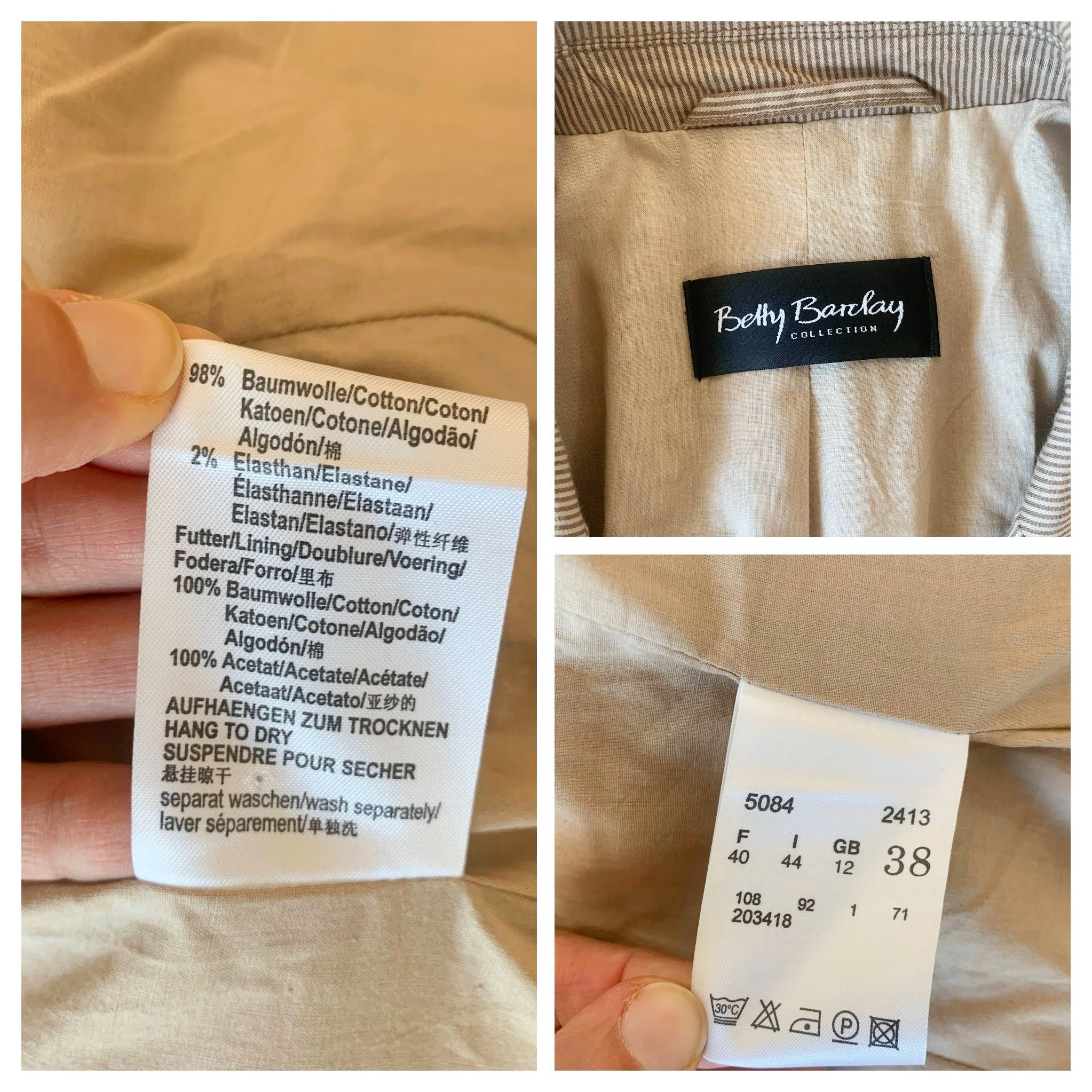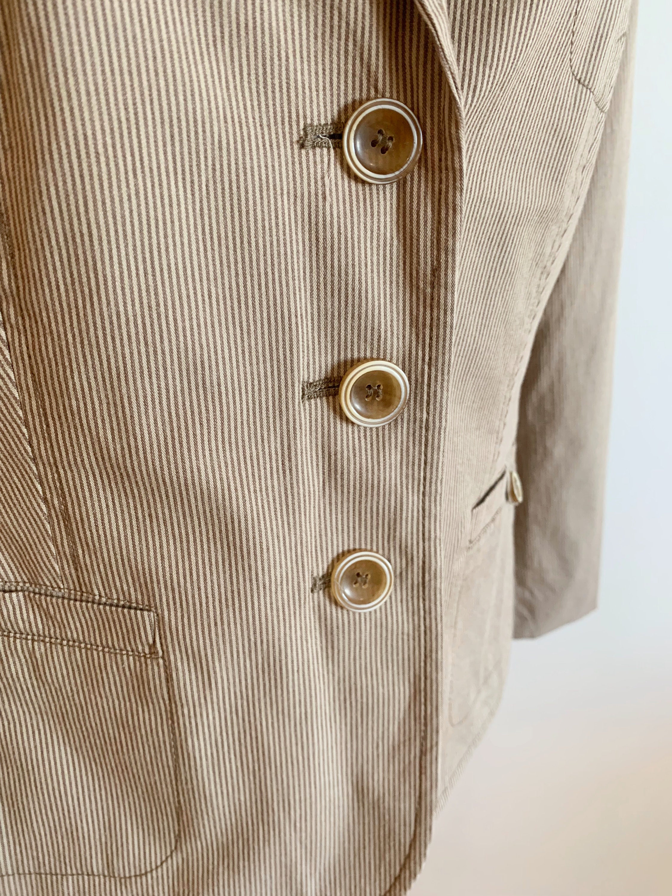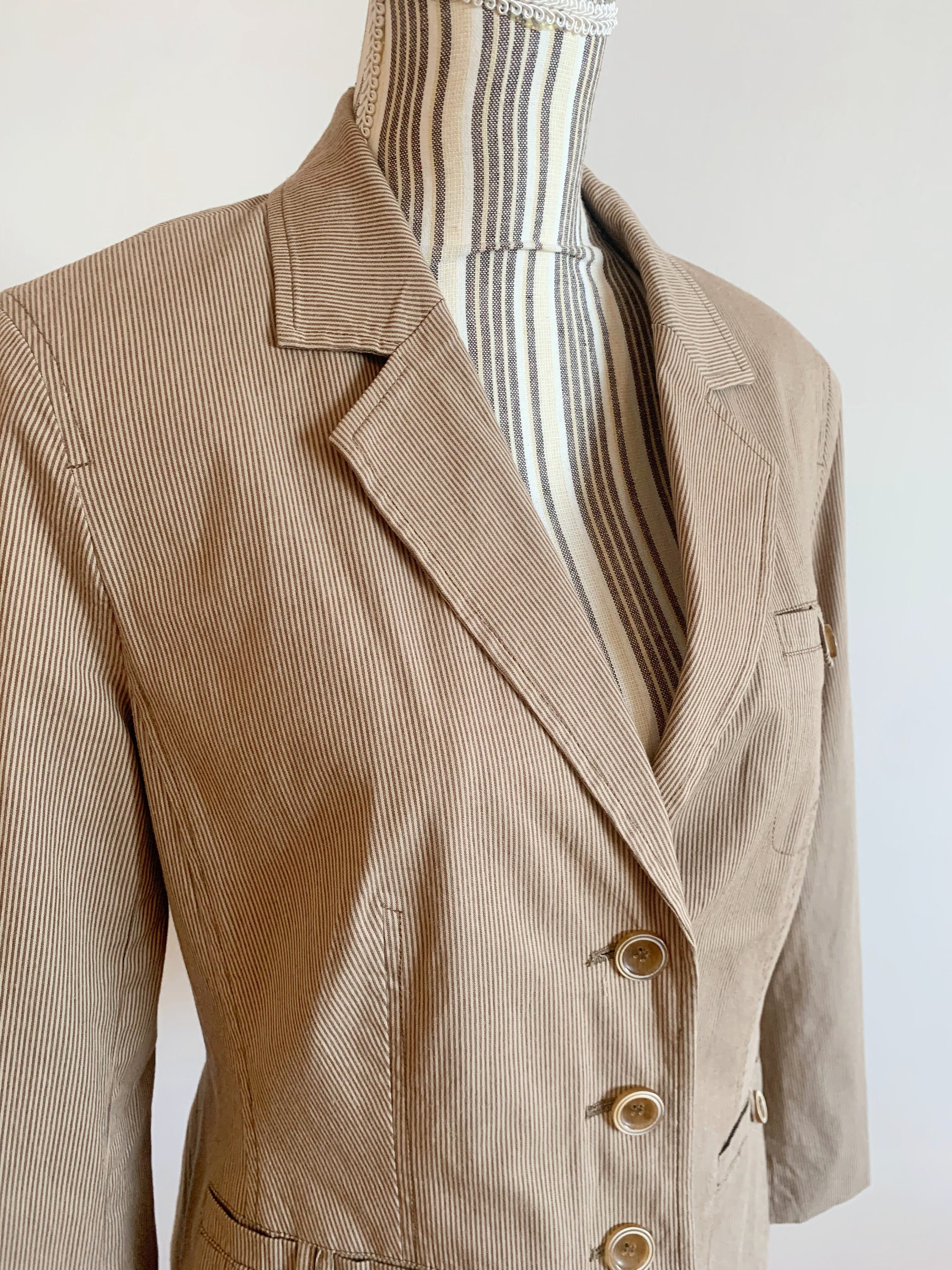 This is a simple minimalist striped tan beige cotton blazer jacket for women by Betty Barclay. This casual sports coat has a classic design, pockets and three button closure. It has delicate came brown stripes over tan beige base. It is made of cotton fabric with cotton lining. This 90s blazer jacket fits like size M
