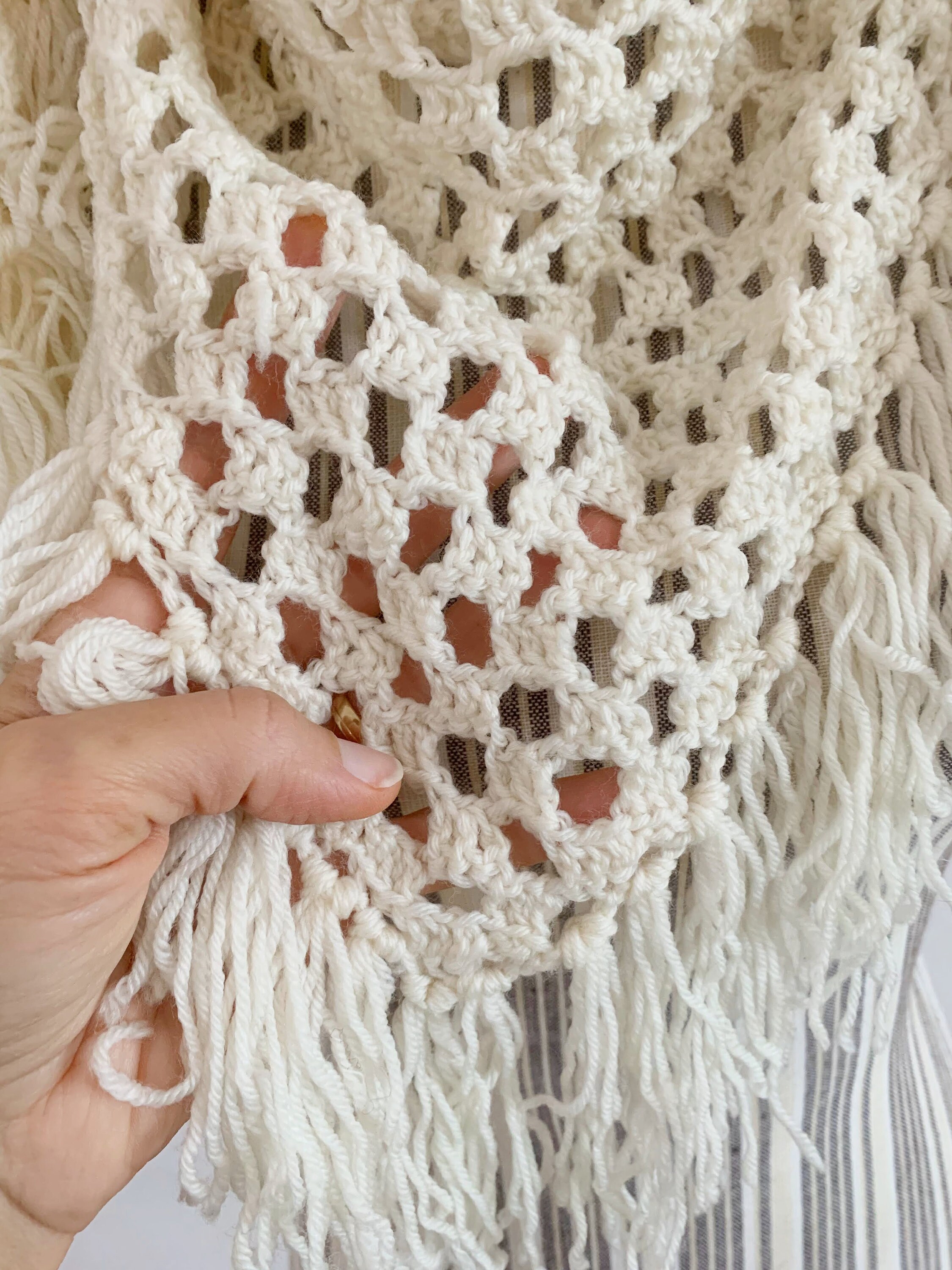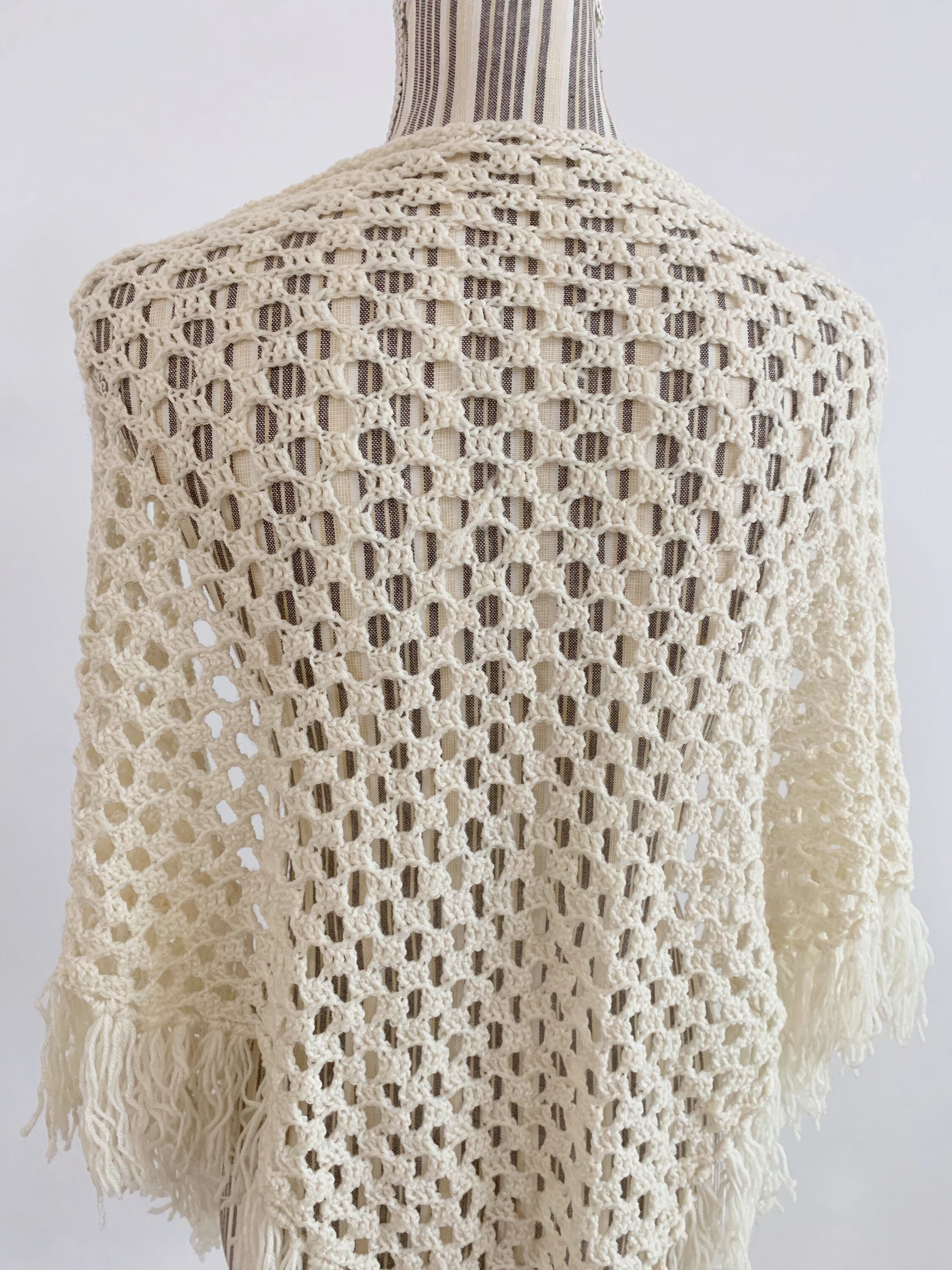 Condition: this crochet lace shawl is beautifully preserved. Perhaps the crochet fabric was smoother before and the fringes have become a bit ruffled with the time. But overall this vintage lace bridal shawl is in beautiful vintage condition