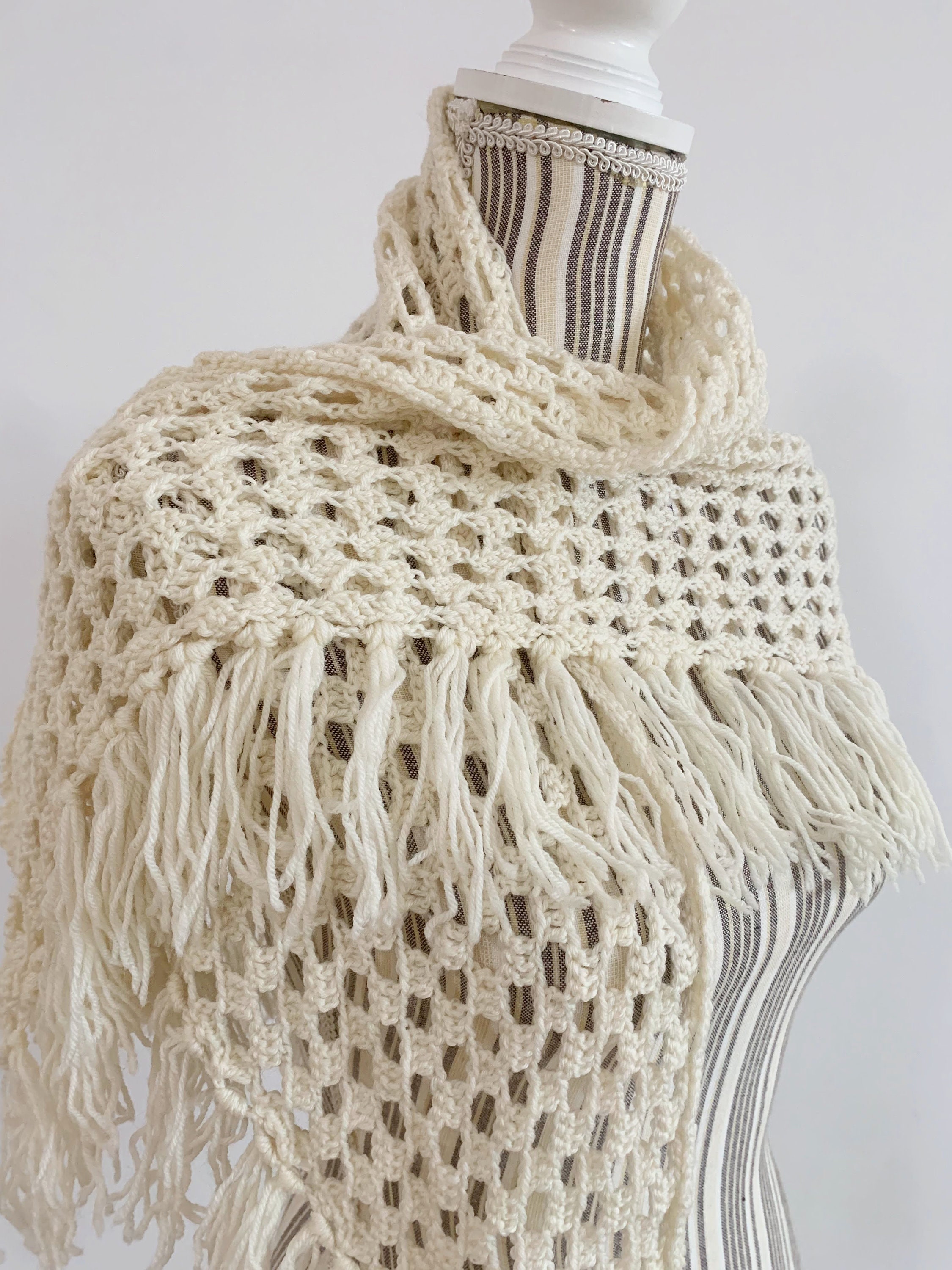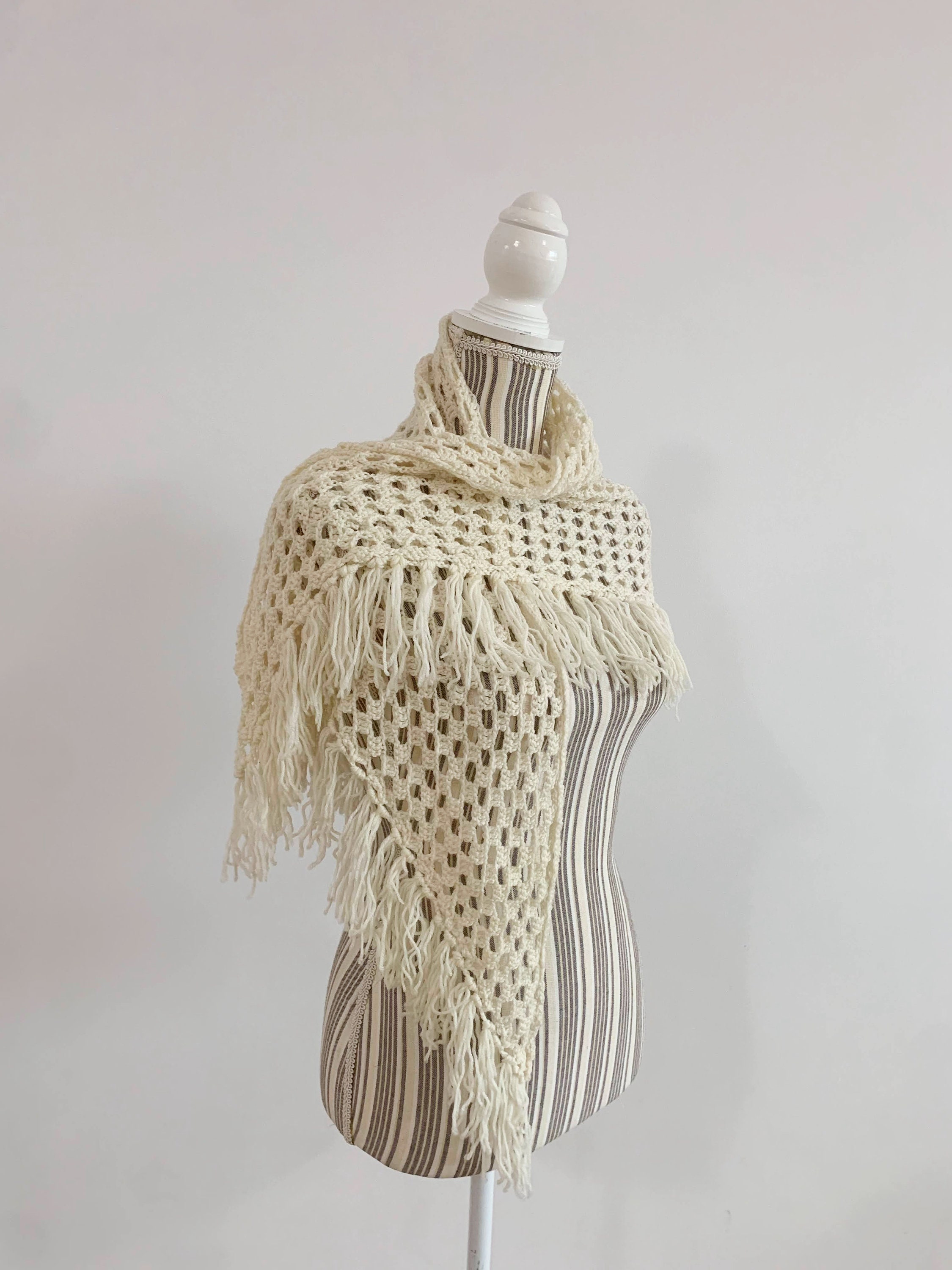 This is a pretty vintage ecru color crochet lace shawl with tassels. This lace bridal shawl is made of soft yarn which feels like acrylic wool. This cream beige bohemian shawl can be worn in so many different ways. It will keep your neck and shoulders warm. It would make a wonderful gift for her for any special occasion. This boho shawl looks amazing with dresses or with cowgirl shirts. Awesome shabby accessory for your boho outfits.