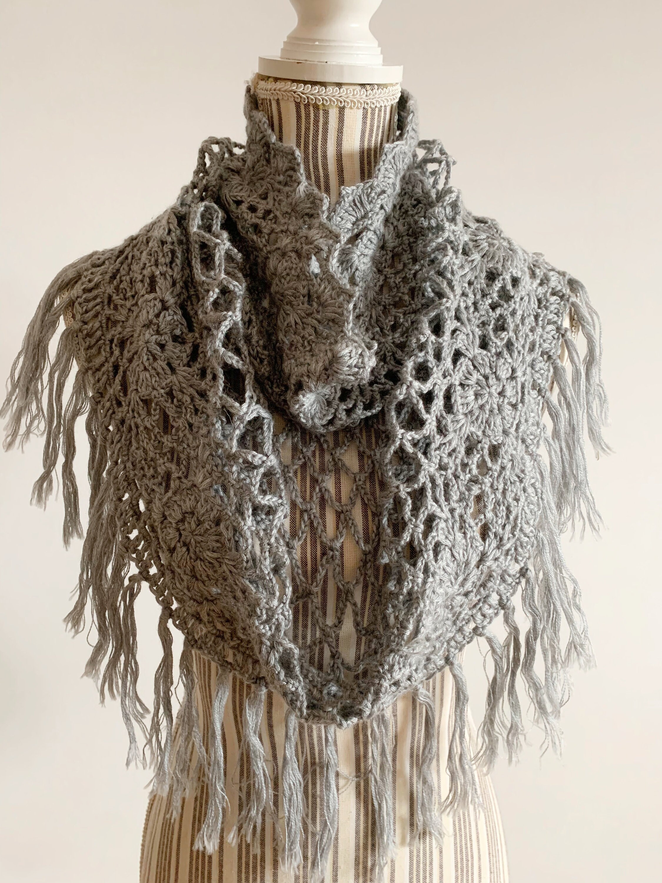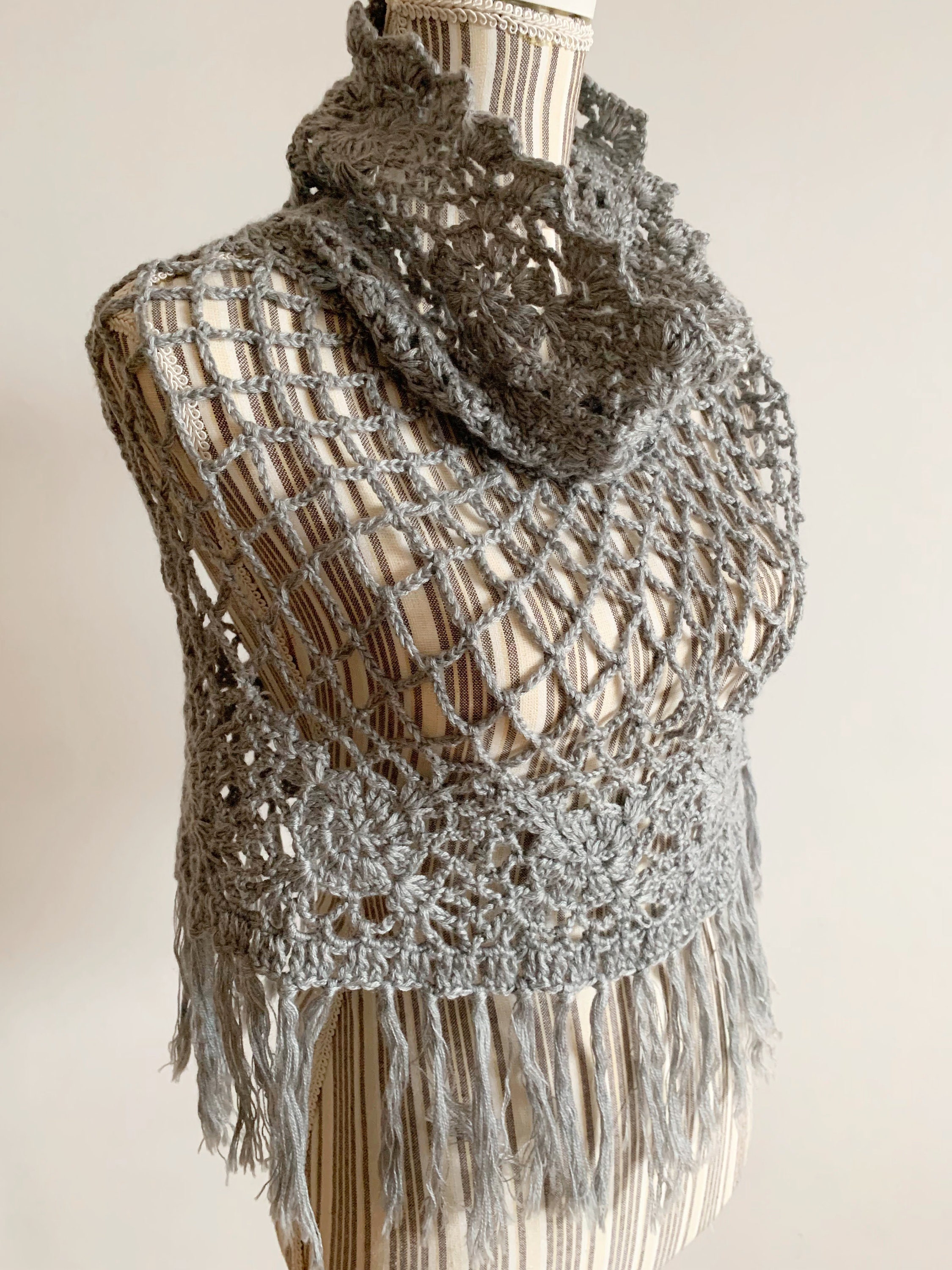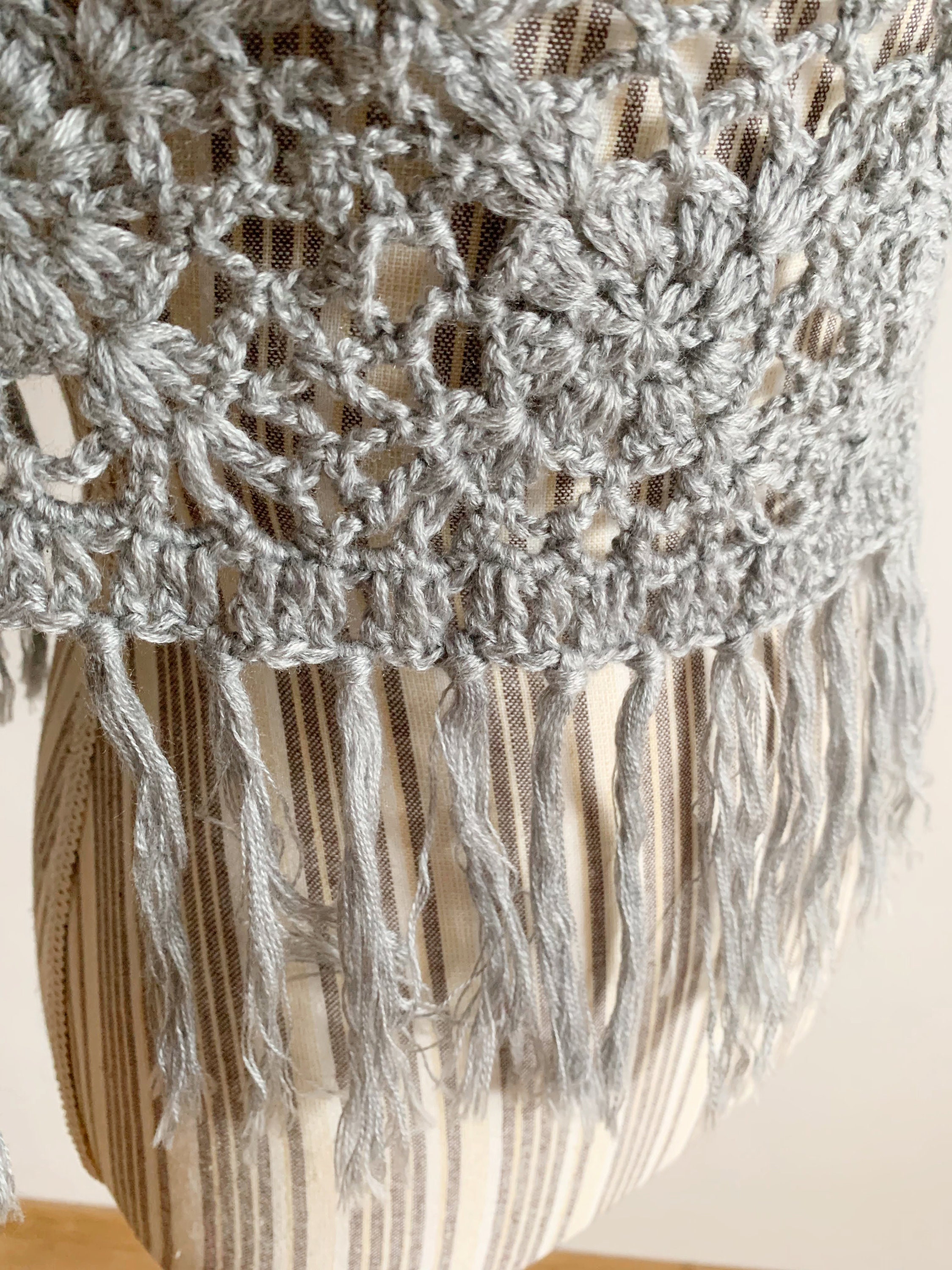 This is a beautiful vintage crochet neck collar in neutral grey color with lace detailing and fringe at the bottom. This adorable fluffy floral lace crochet turtleneck scarf is made of soft warm yarn which feels like acrylic wool blend. This pullover turtleneck scarf is perfect for the fall or winter season. It will keep you warm and stylish. This crochet cowl will add a pop of boho chic look to your outfits.