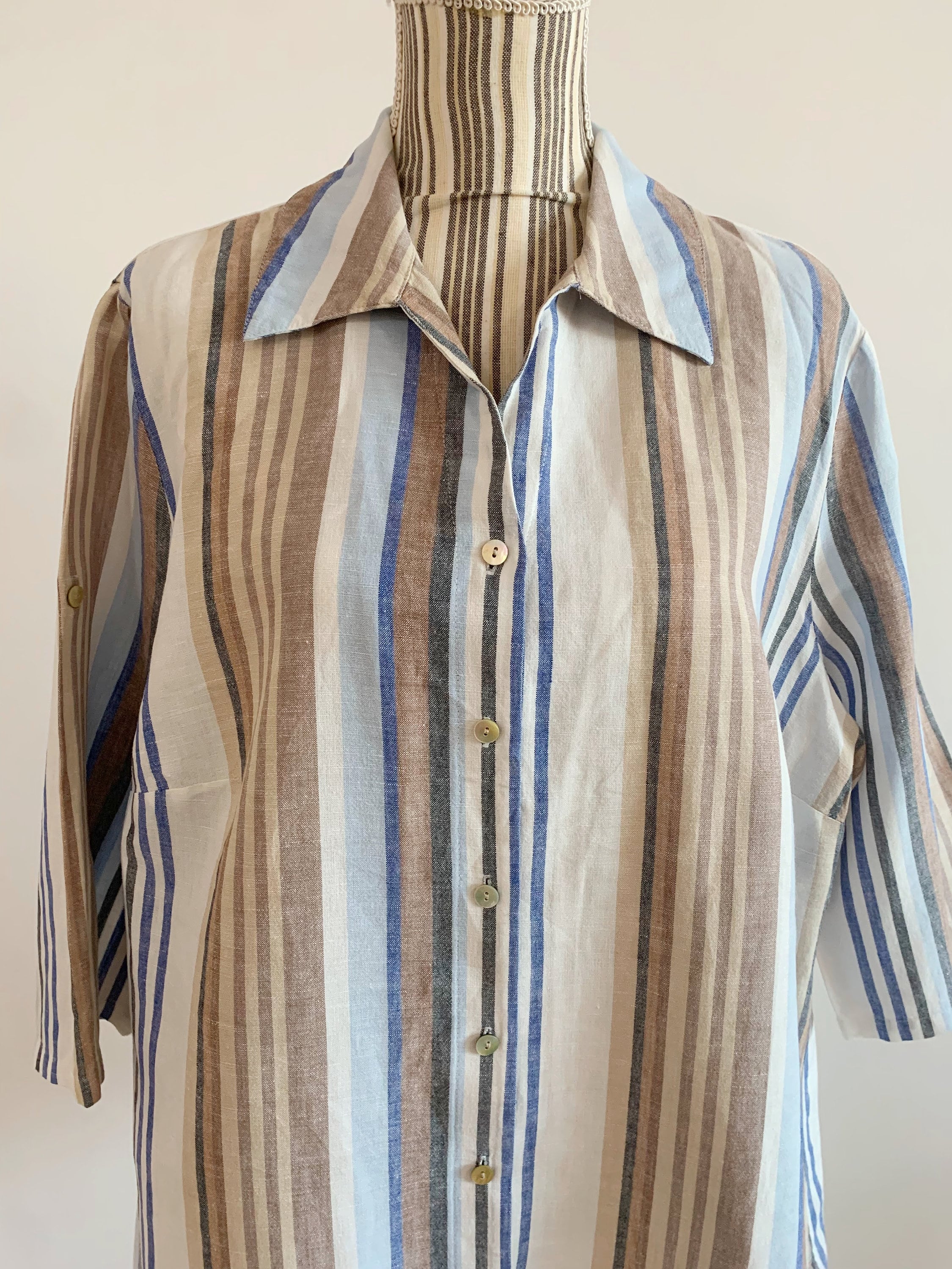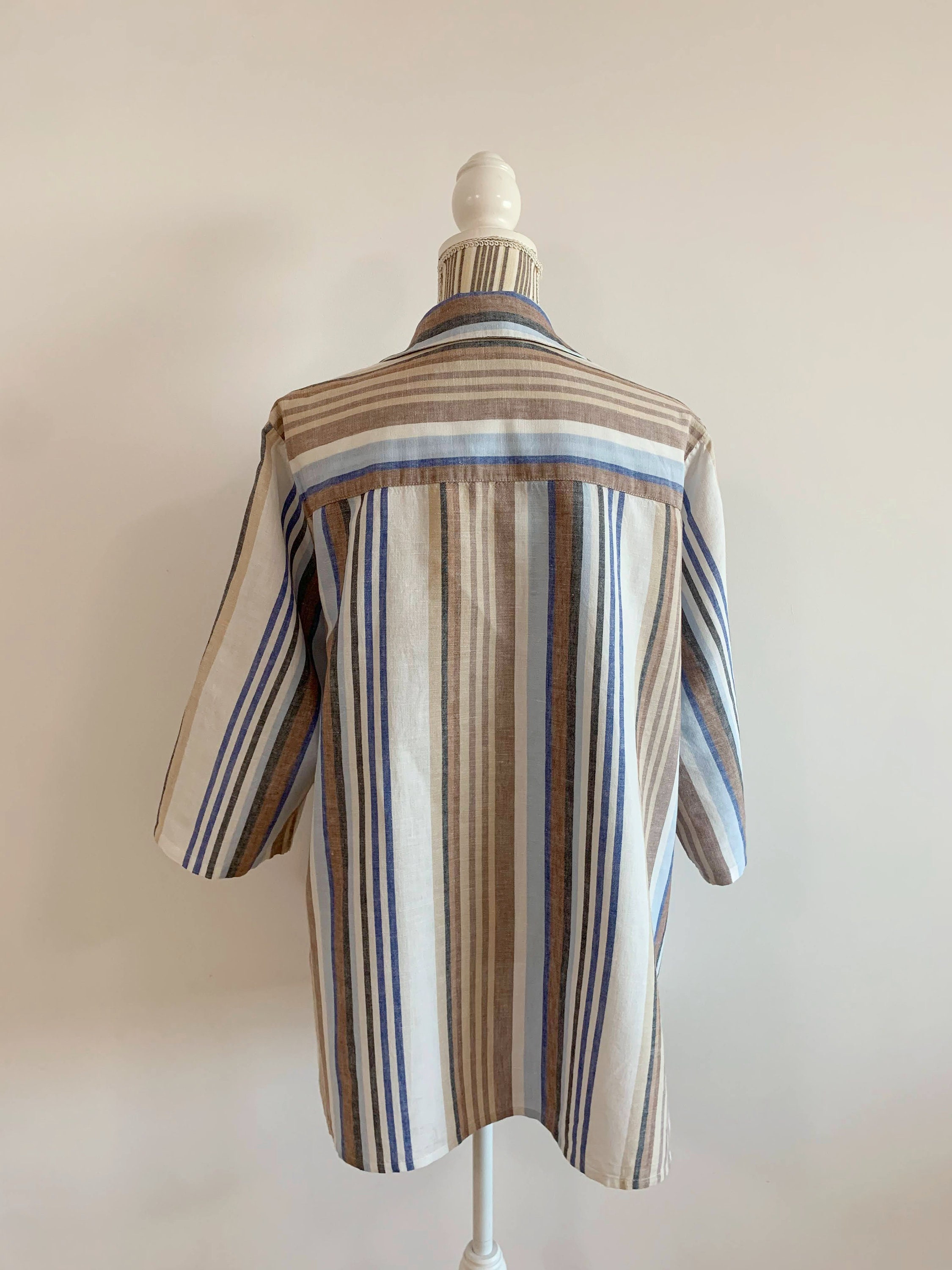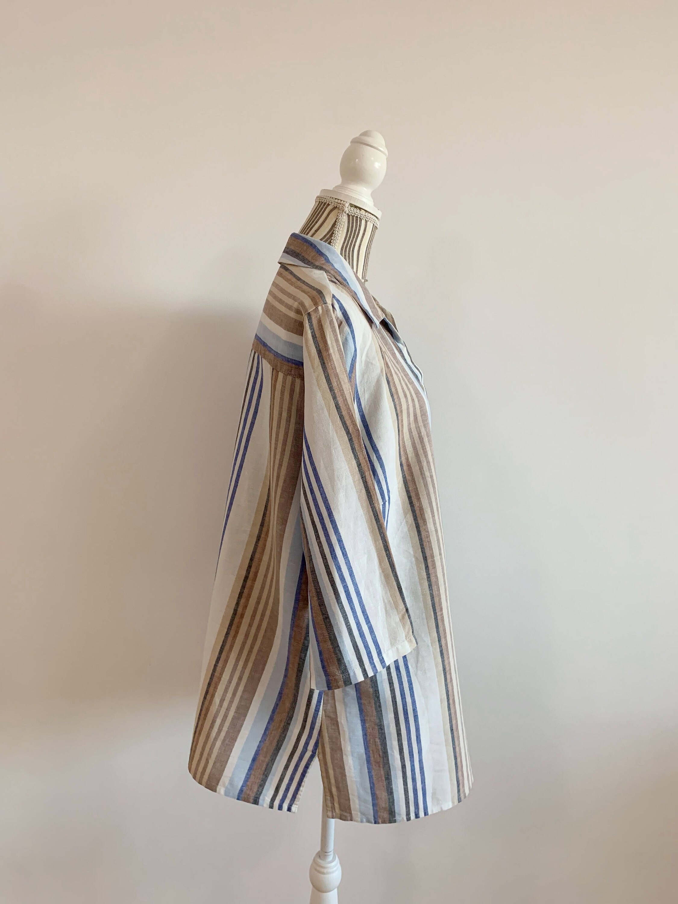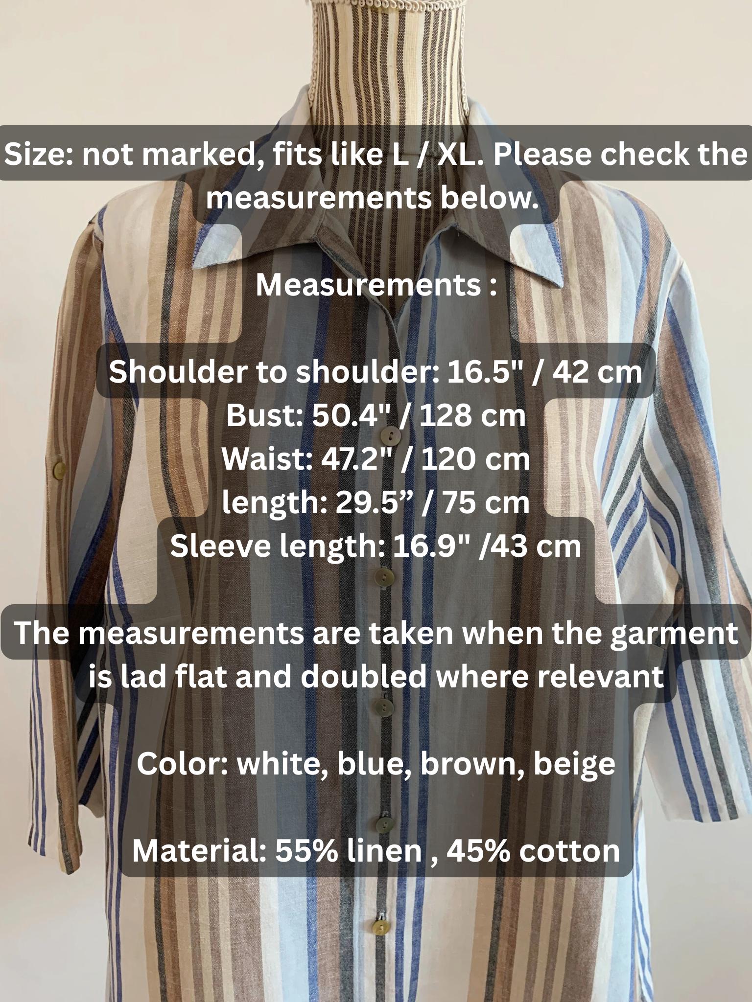Gorgeous striped oversized relaxed fit striped short sleeve summer shirt, made of linen cotton blend fabric (55% linen, 45% cotton). This classic basic linen shirt has button front closure and side slits. It has no size marked, it fits like size L/ XL women's clothing. Please check the measurements below.