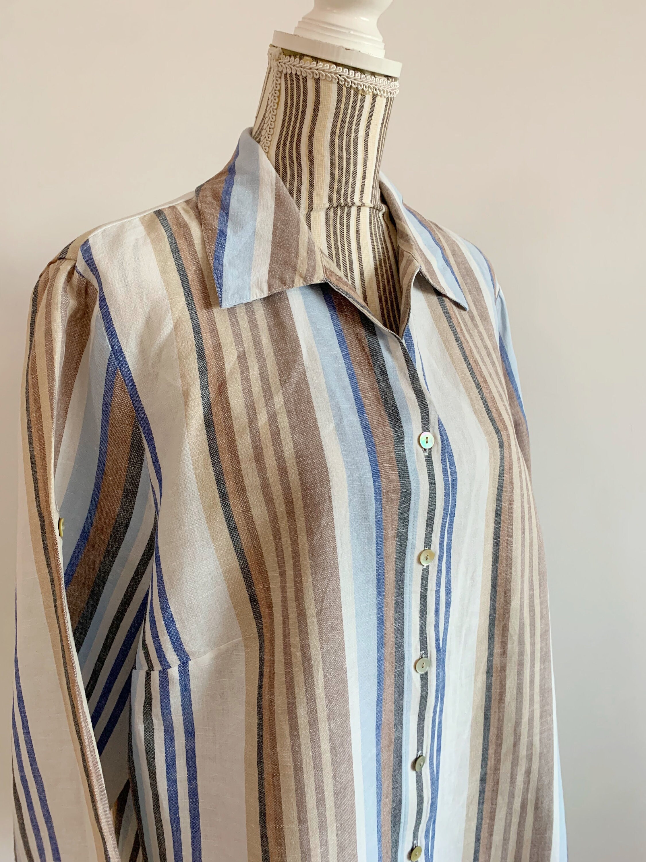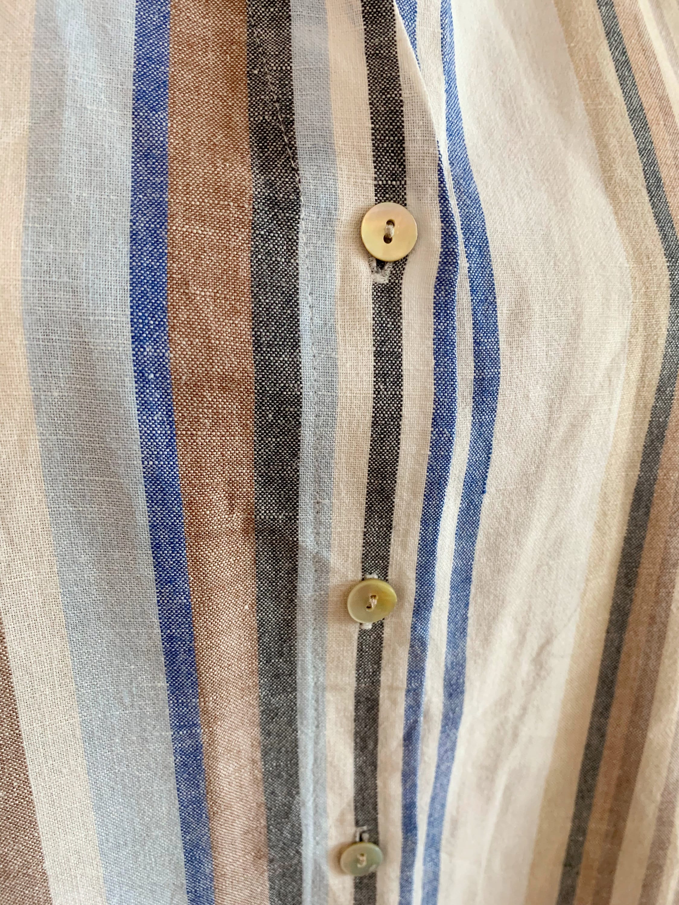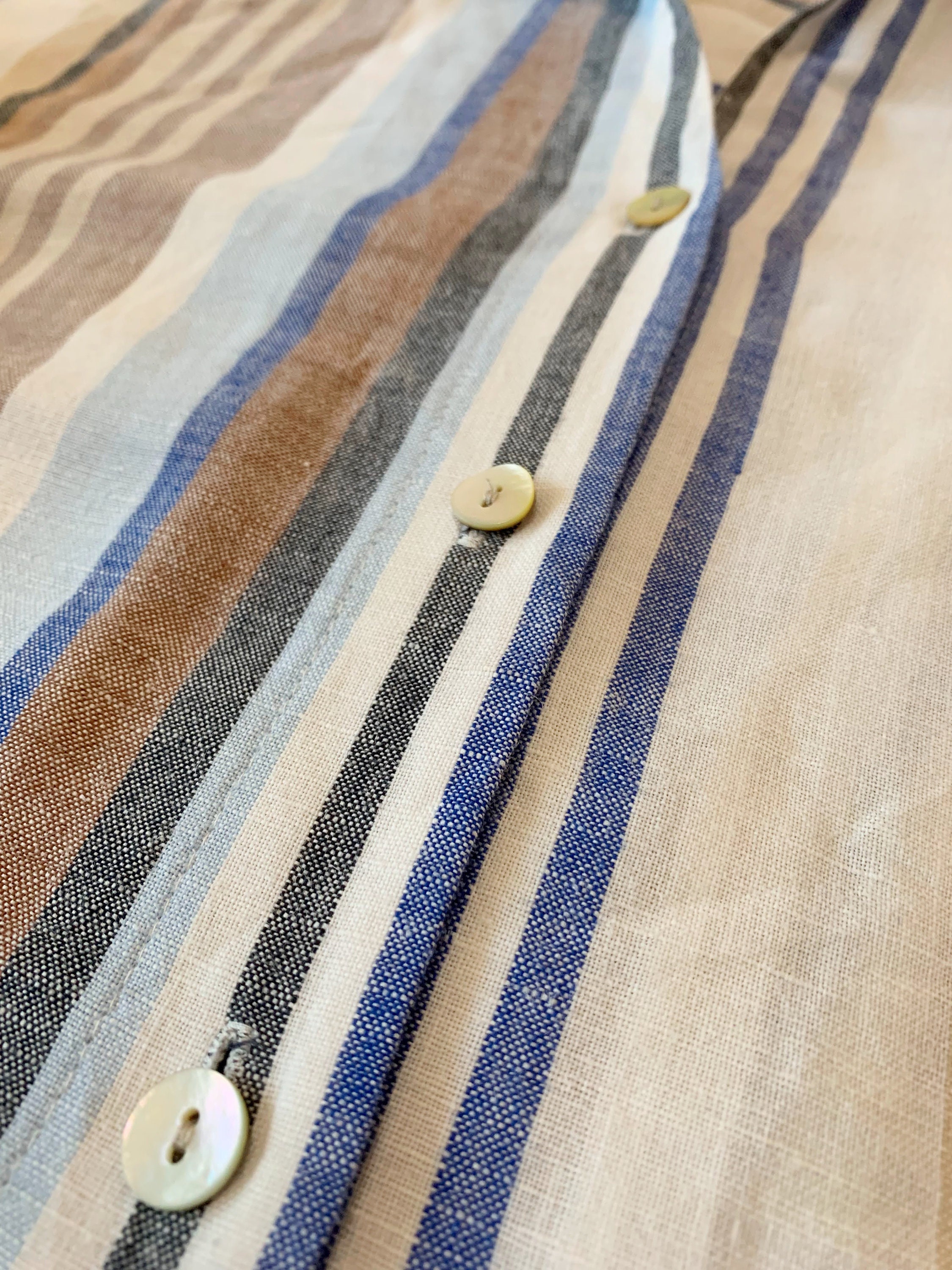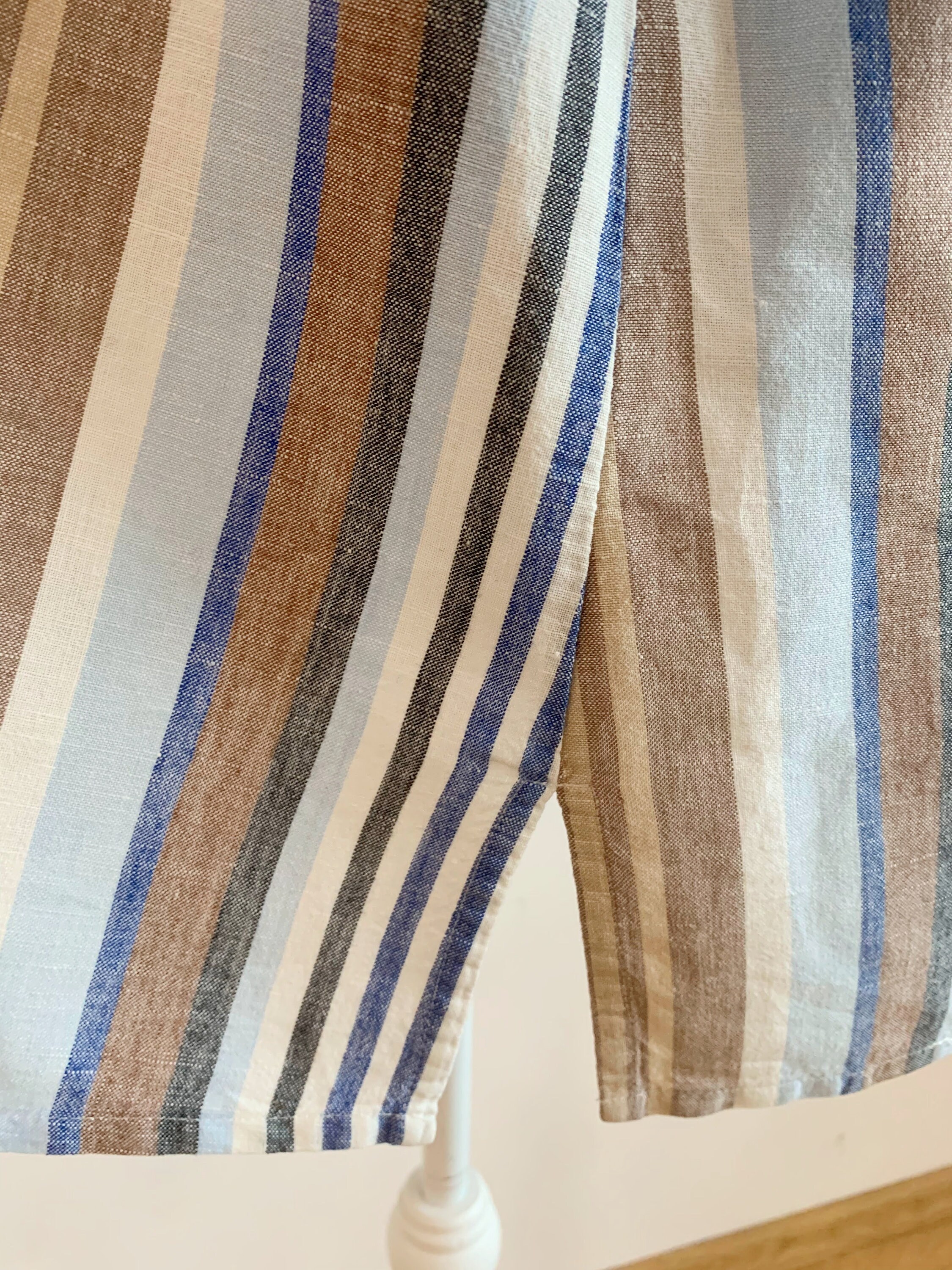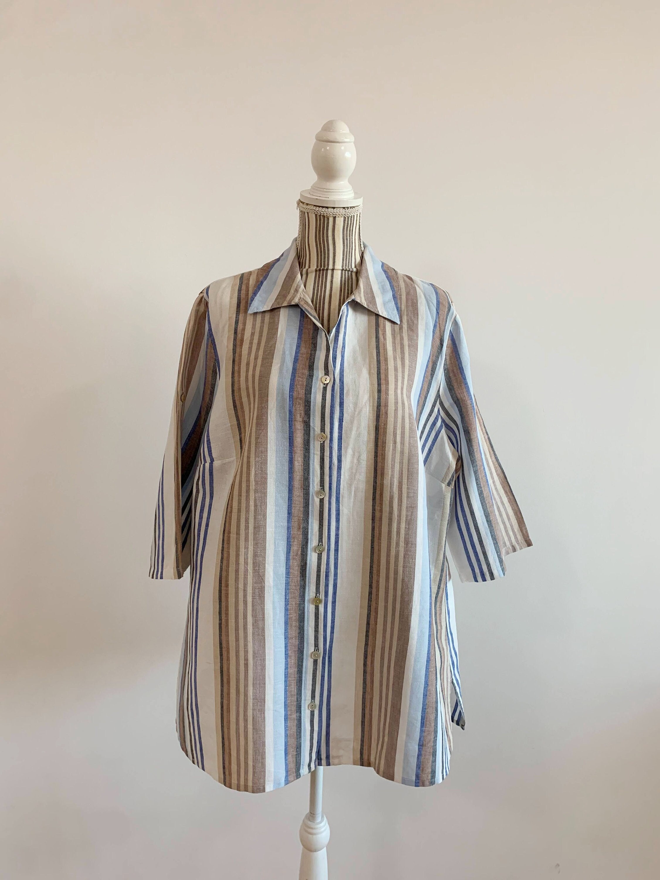 Gorgeous striped oversized relaxed fit striped short sleeve summer shirt, made of linen cotton blend fabric (55% linen, 45% cotton). This classic basic linen shirt has button front closure and side slits. It has no size marked, it fits like size L/ XL women's clothing. Please check the measurements below.