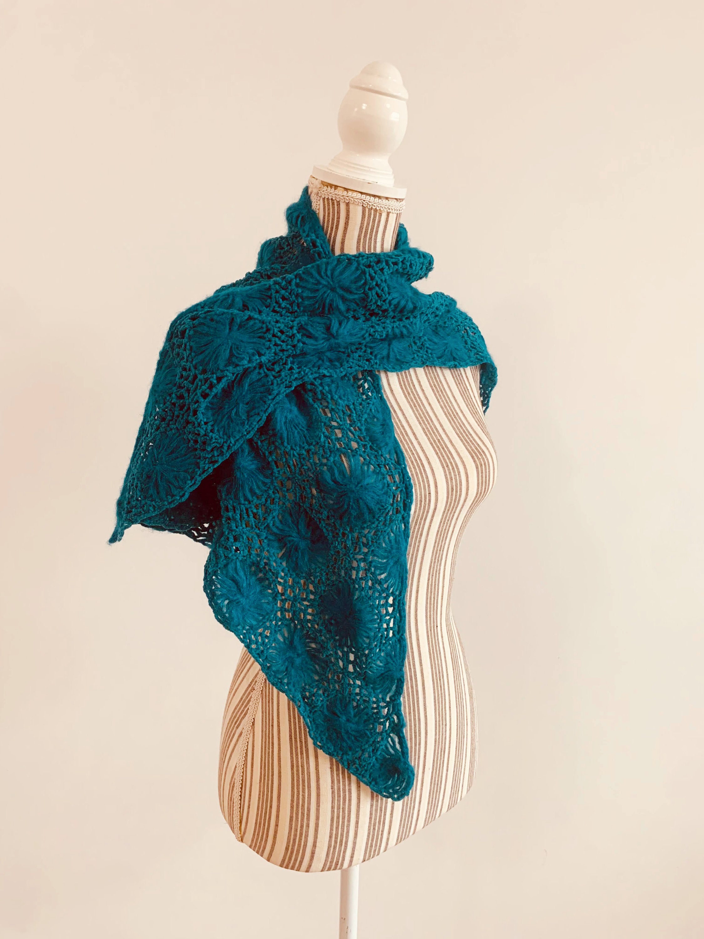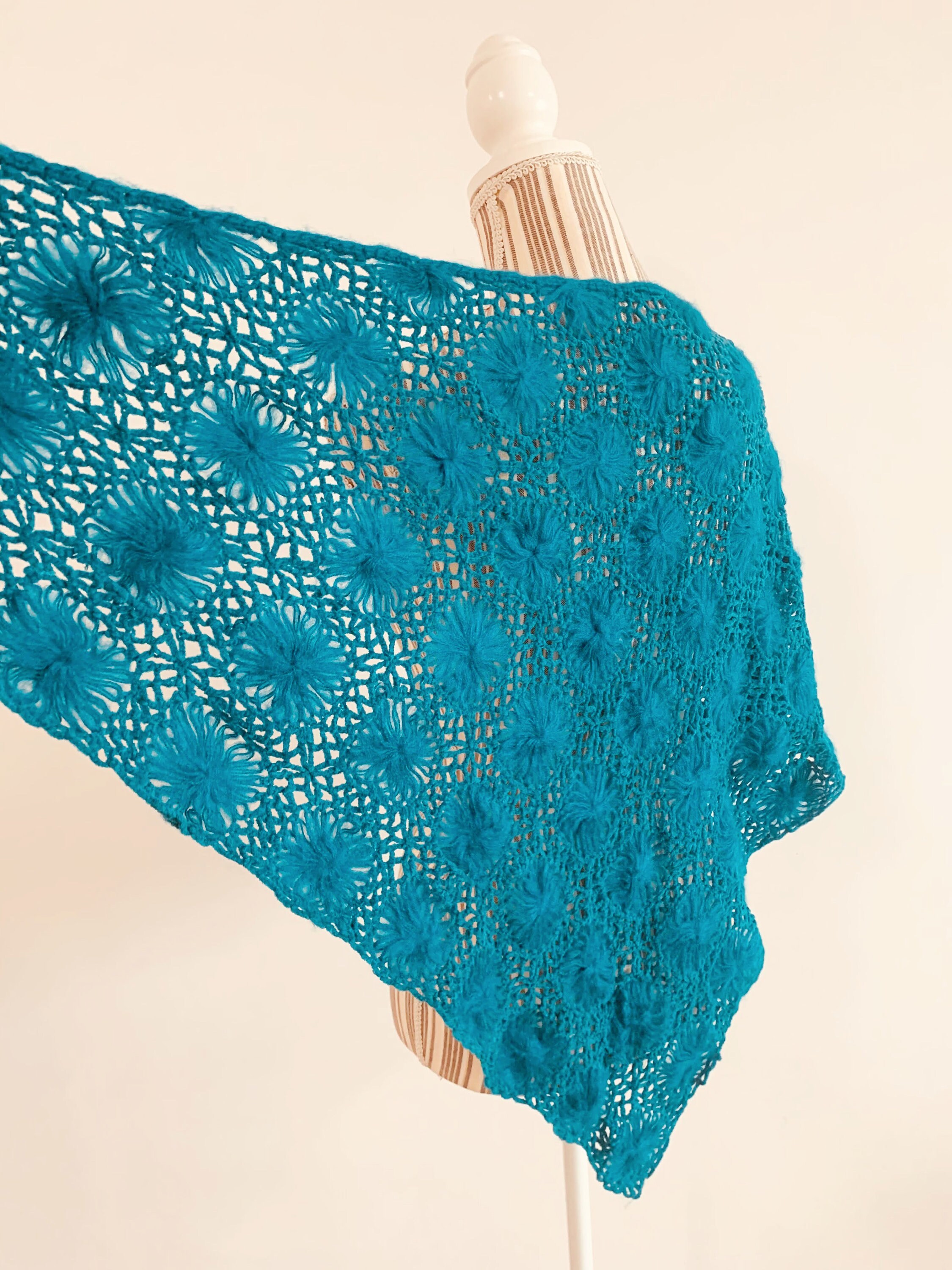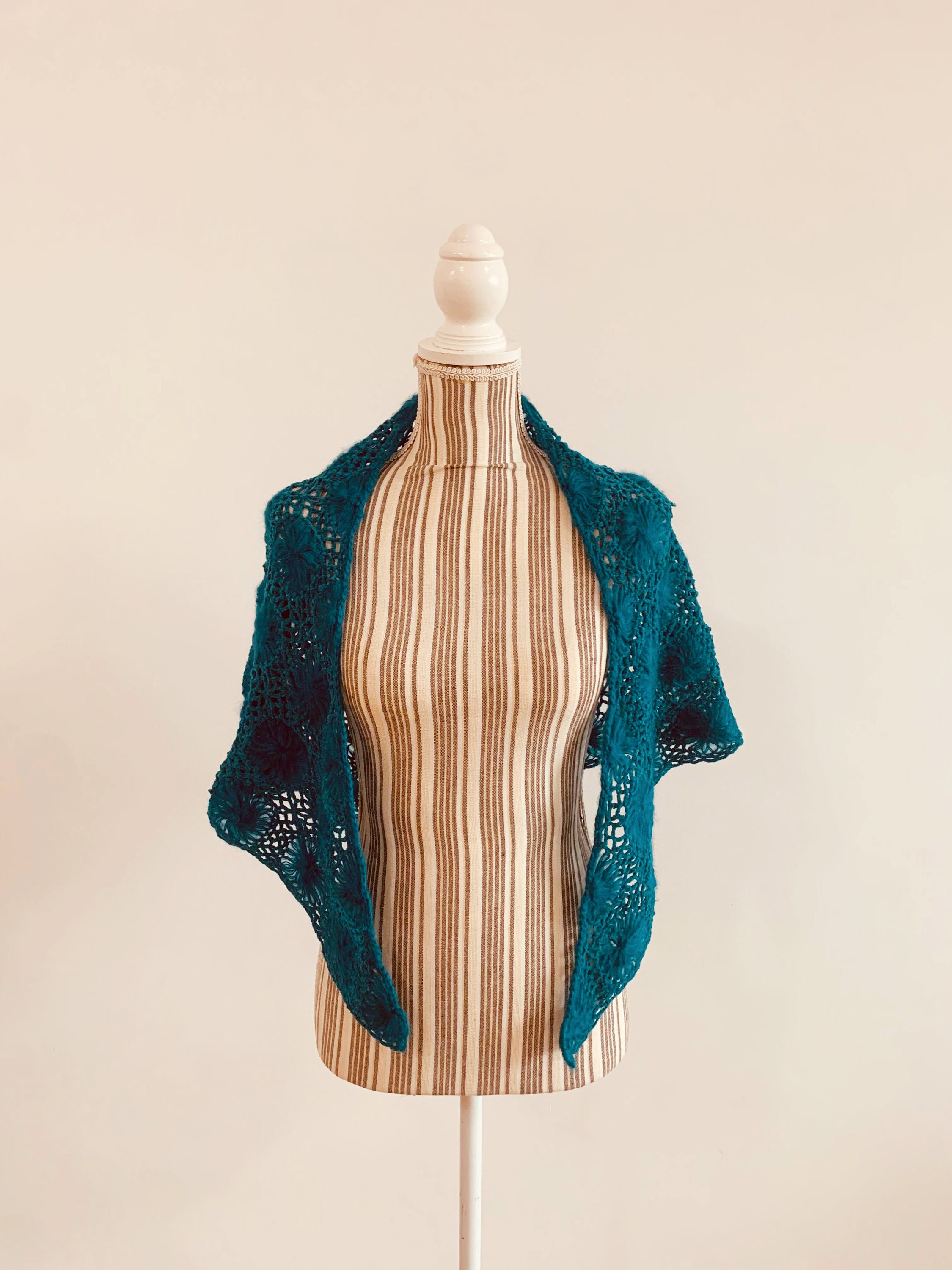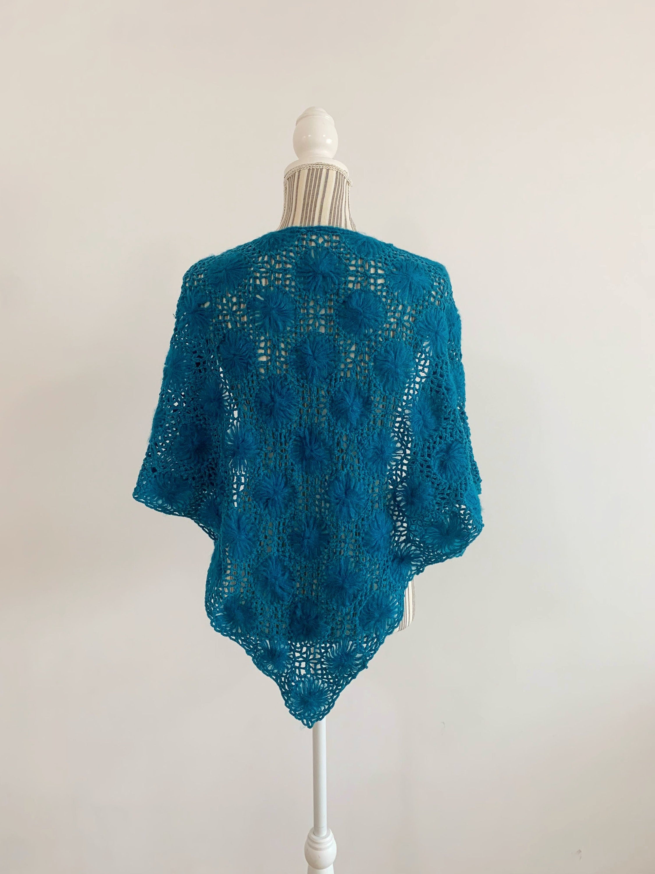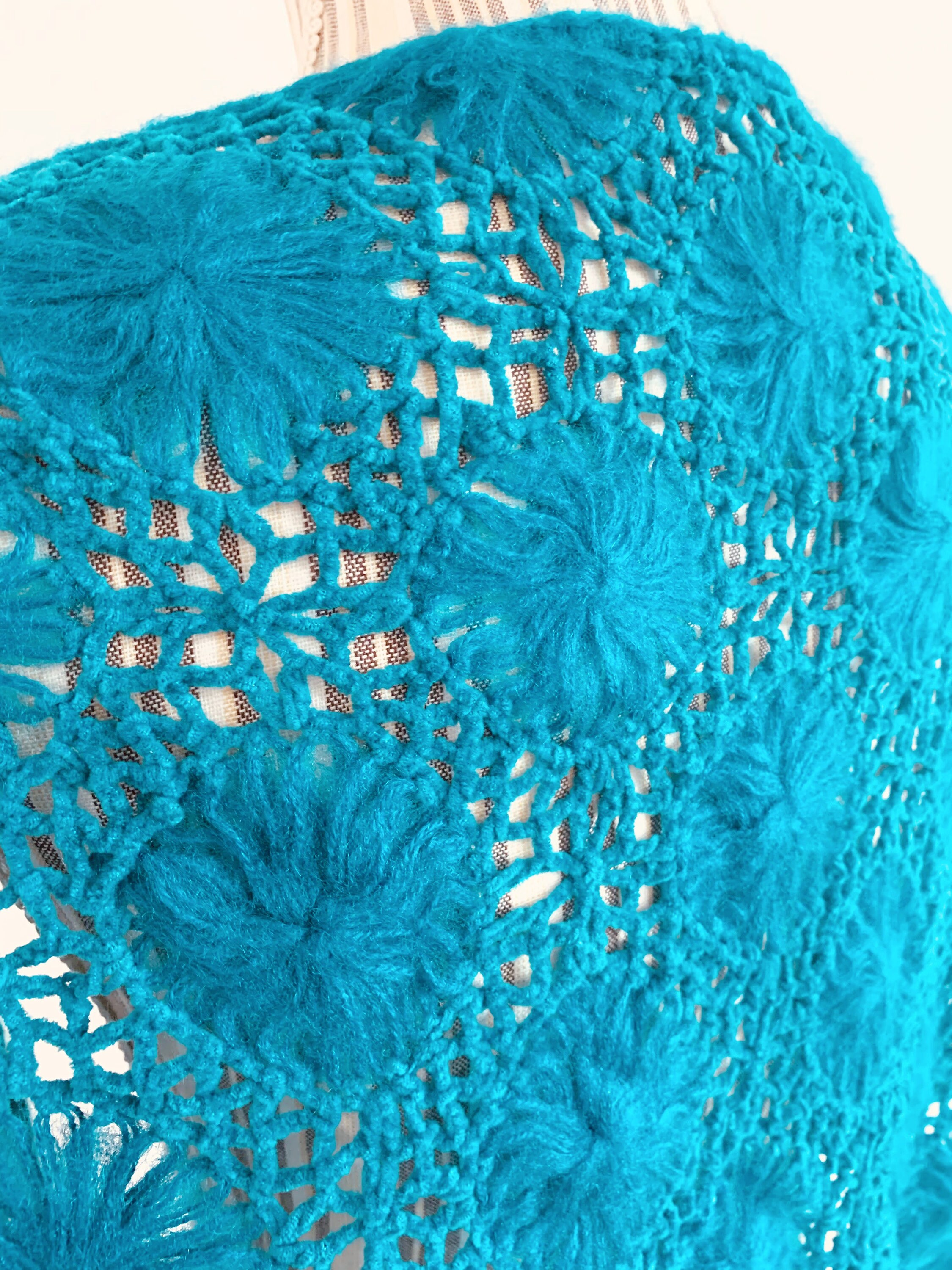 This is an amazing vintage turquoise blue lace shawl made of fluffy acrylic mohair wool yarn. This delicate sheer mesh shawl has beautiful fluffy mohair flowers sprinkled on it. This lovely crochet lace shawl has a triangle shape and lace floral pattern. This bohemian shawl will made the perfect addition to a solid color dress or shirt.