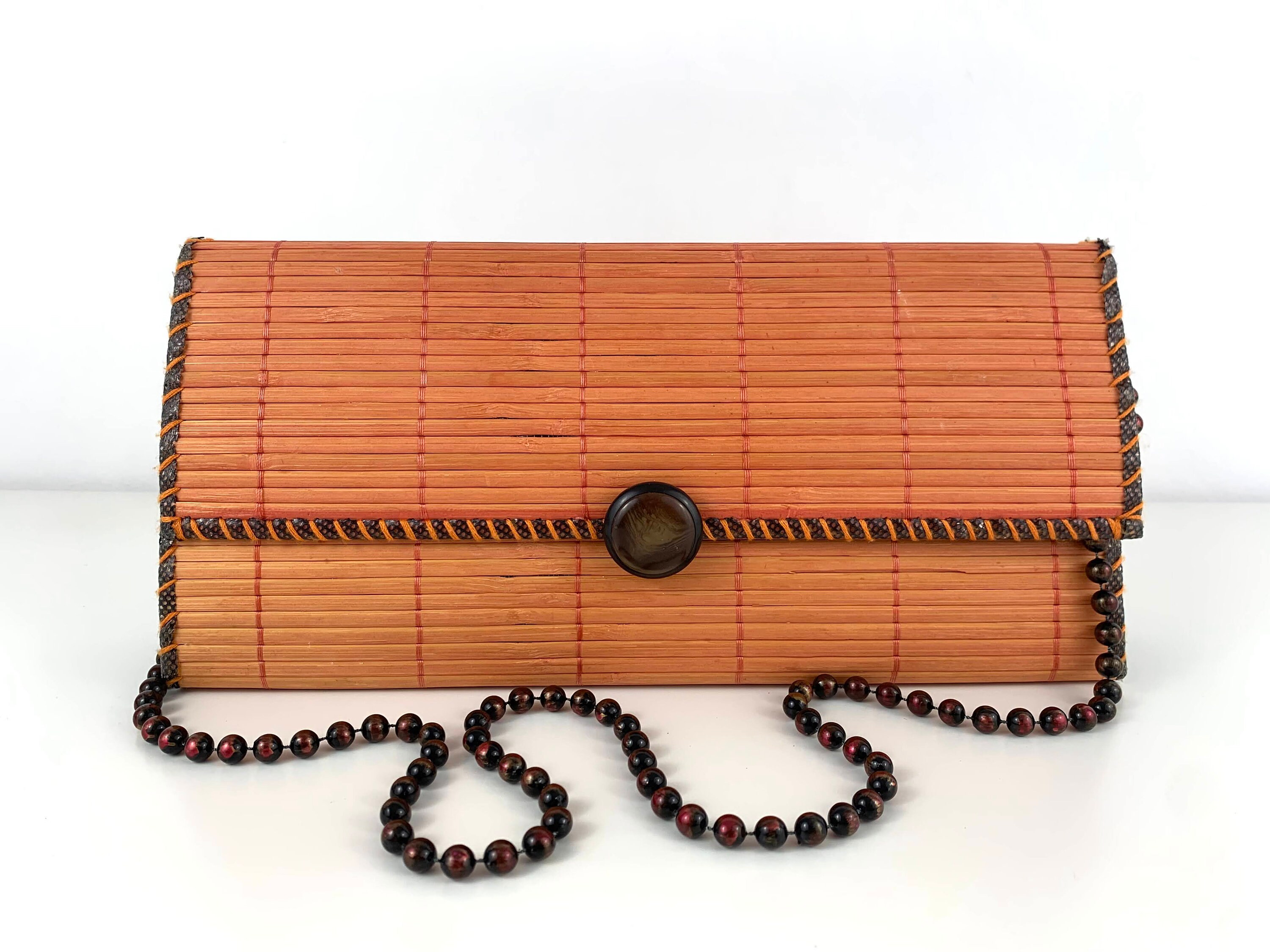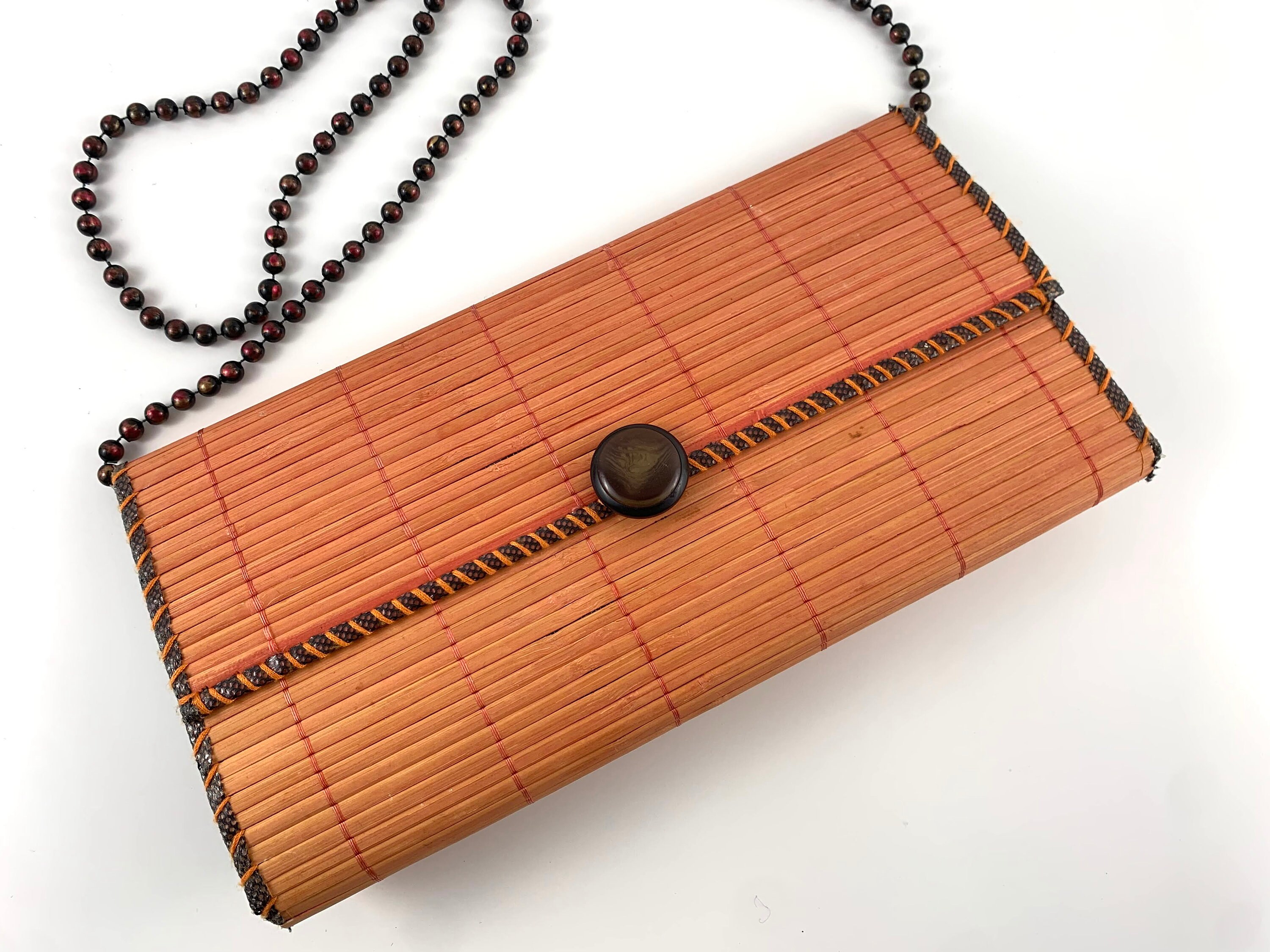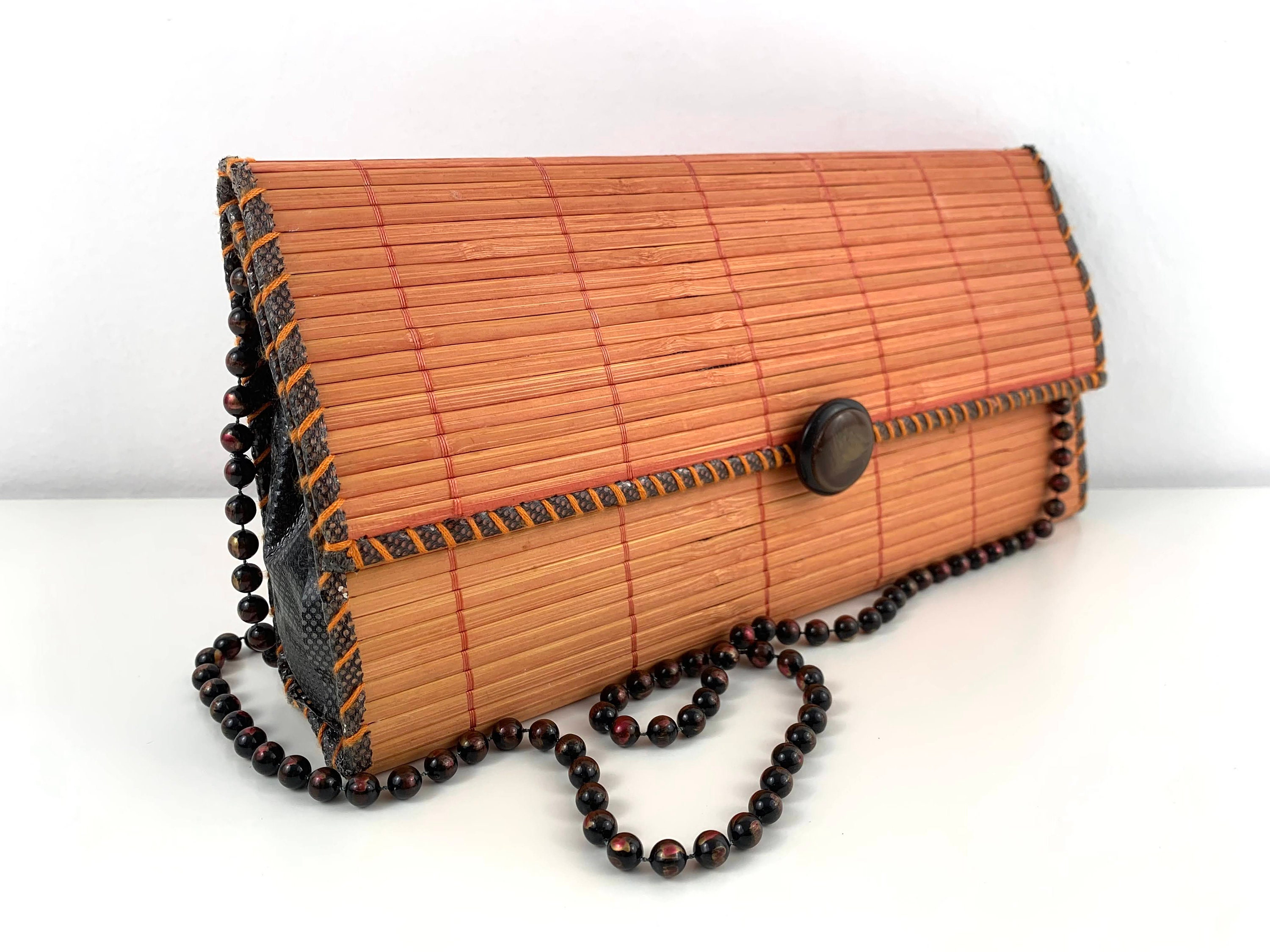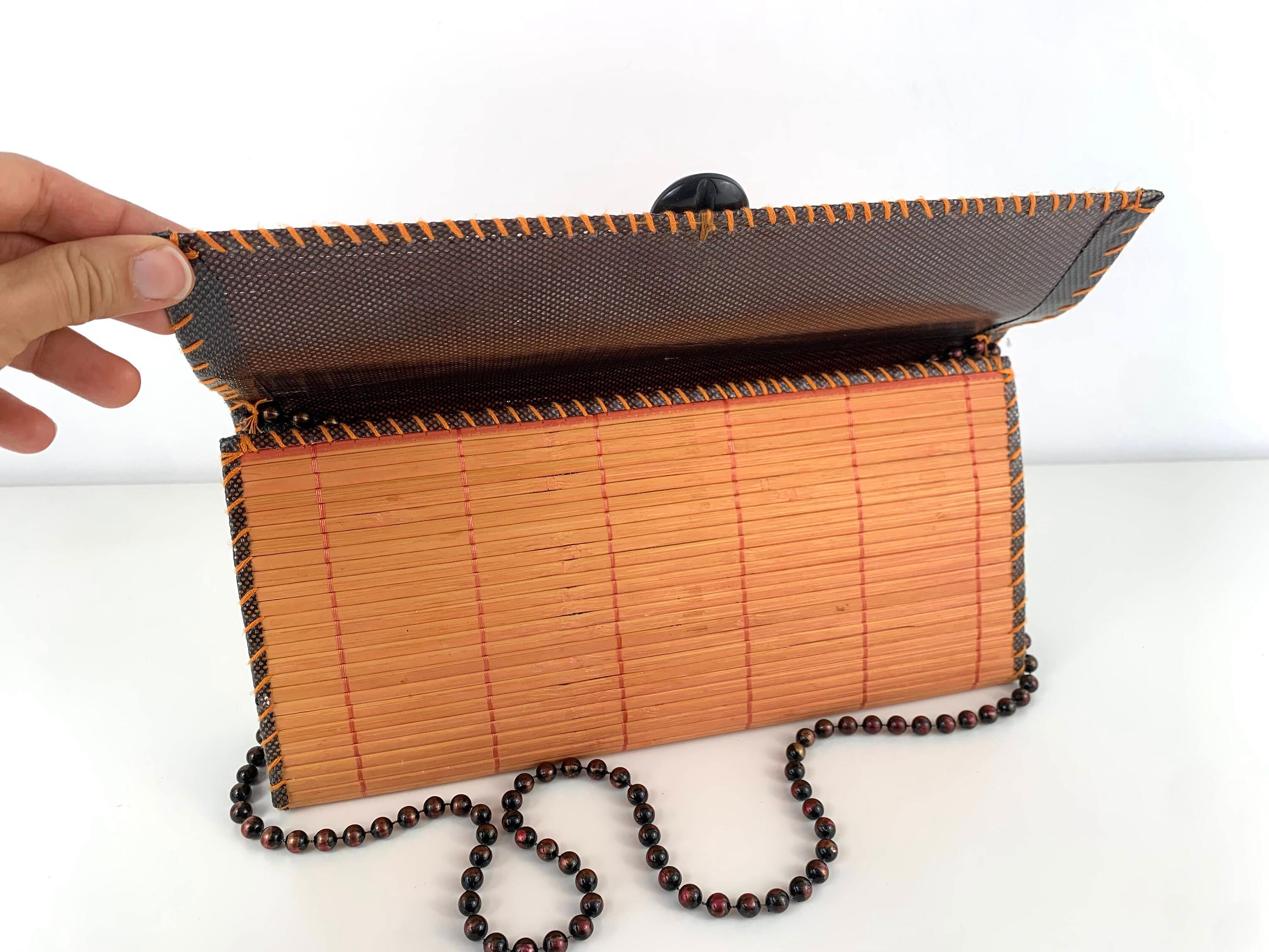 Adorable vintage 80s boho chic clutch bag made of natural wood in orange brown color with beadwork shoulder strap. This wooden purse is the perfect addition to any summer outfit. This natural wool purse has flap over lid and open top. It has thin polyester lining and one compartment.