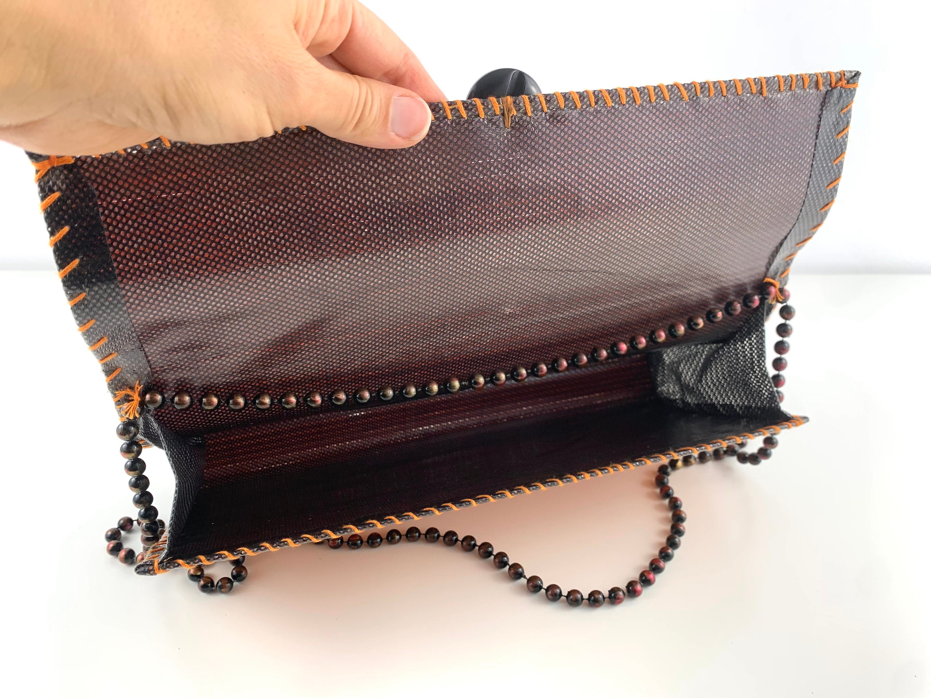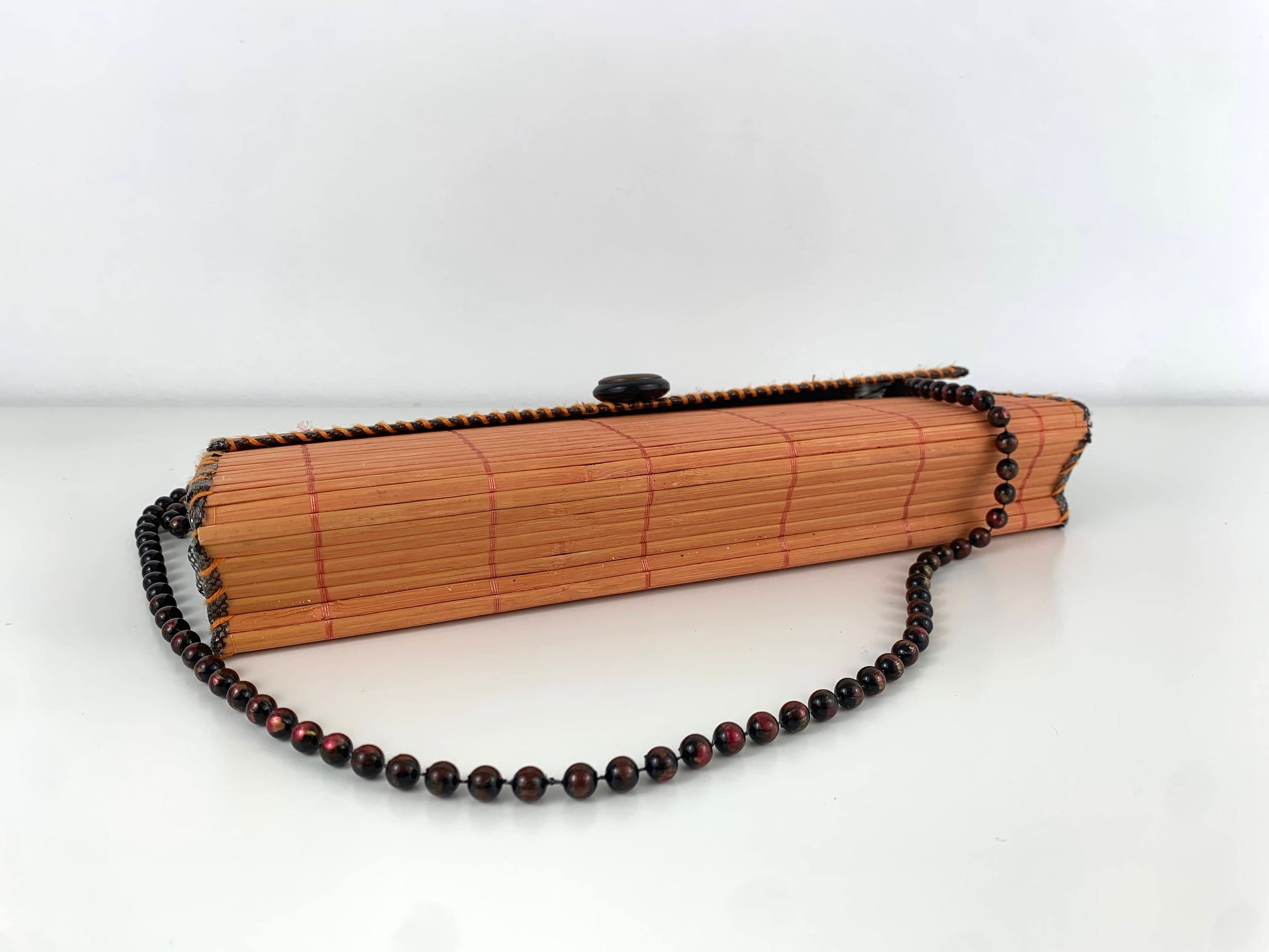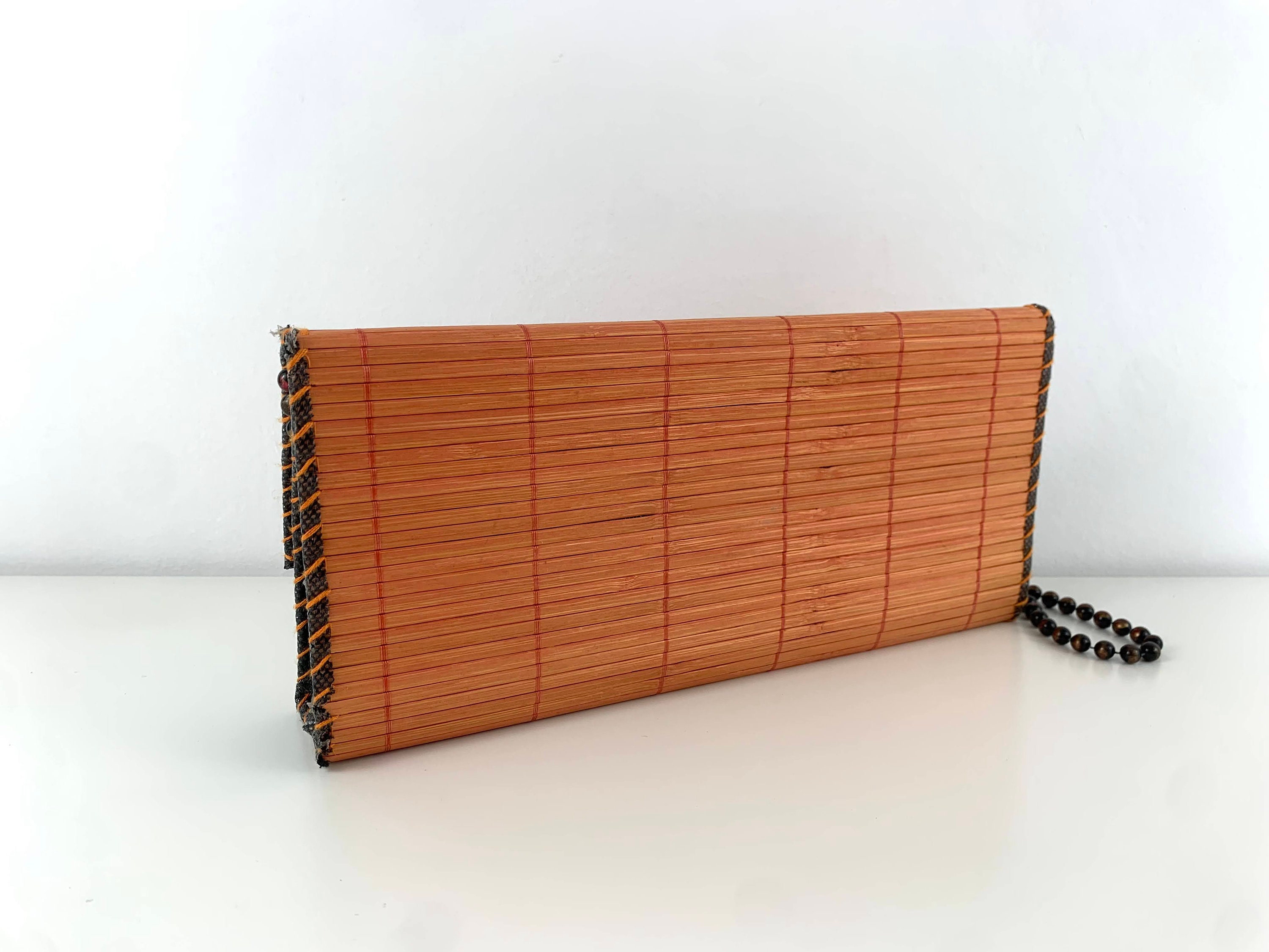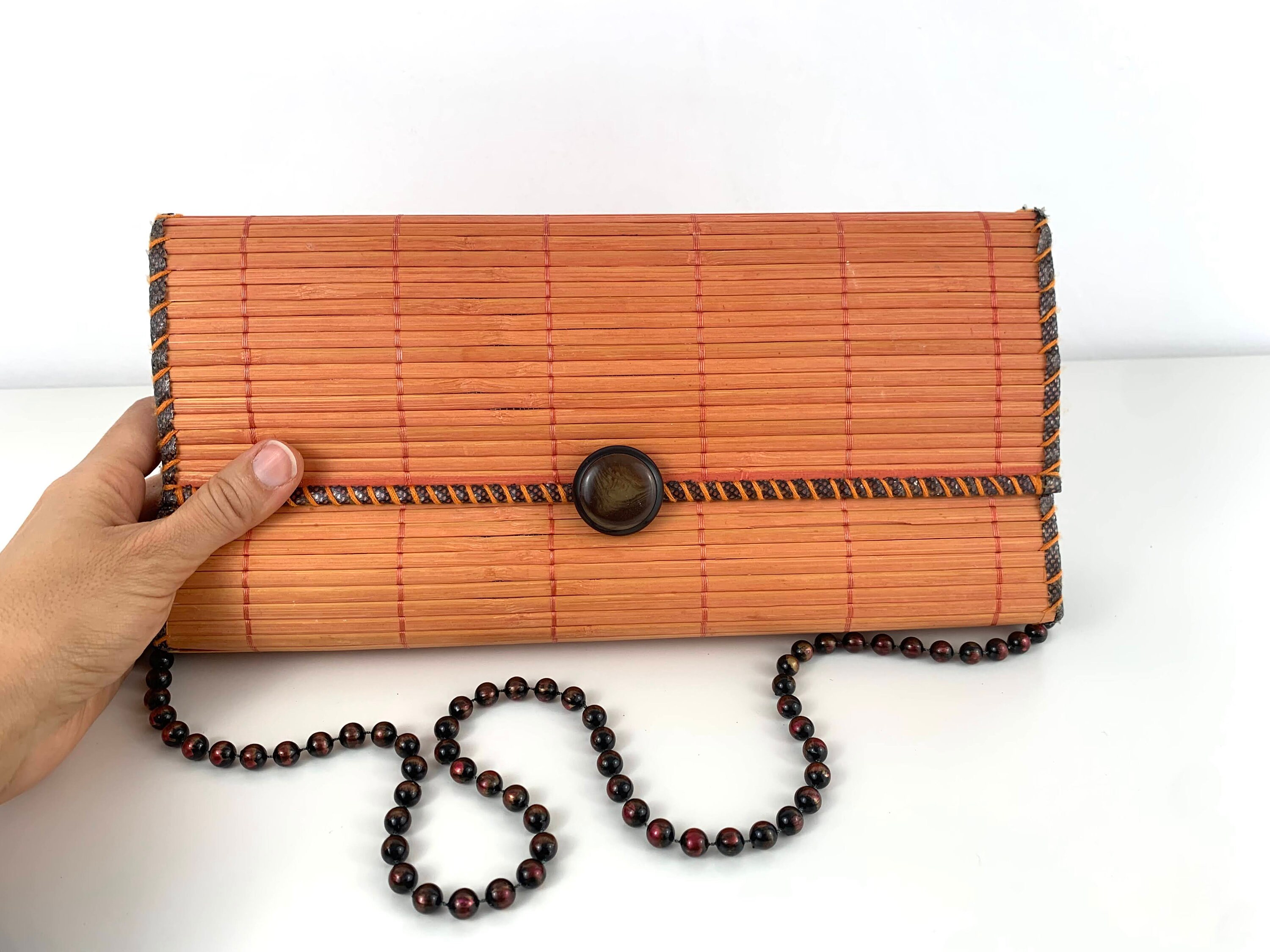 Adorable vintage 80s boho chic clutch bag made of natural wood in orange brown color with beadwork shoulder strap. This wooden purse is the perfect addition to any summer outfit. This natural wool purse has flap over lid and open top. It has thin polyester lining and one compartment.