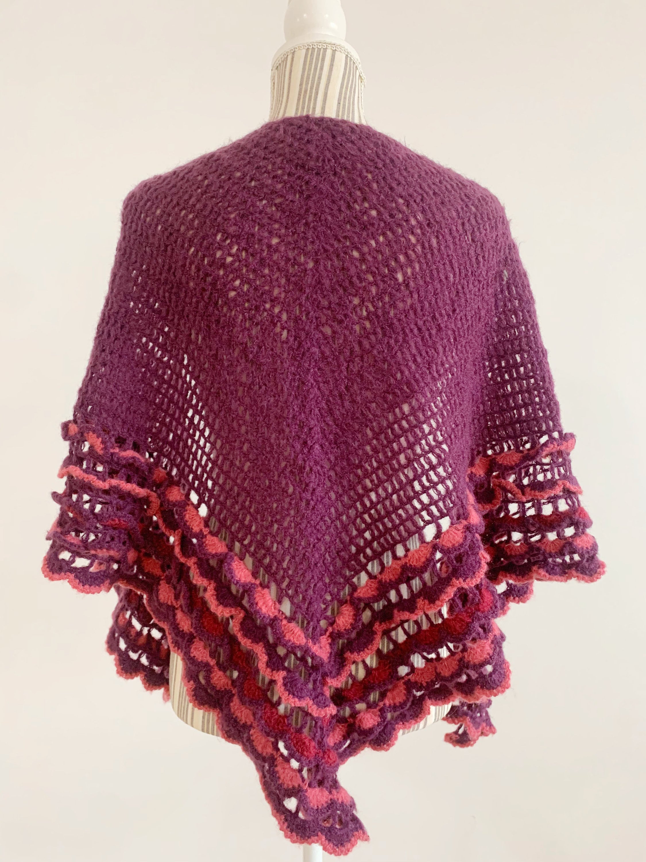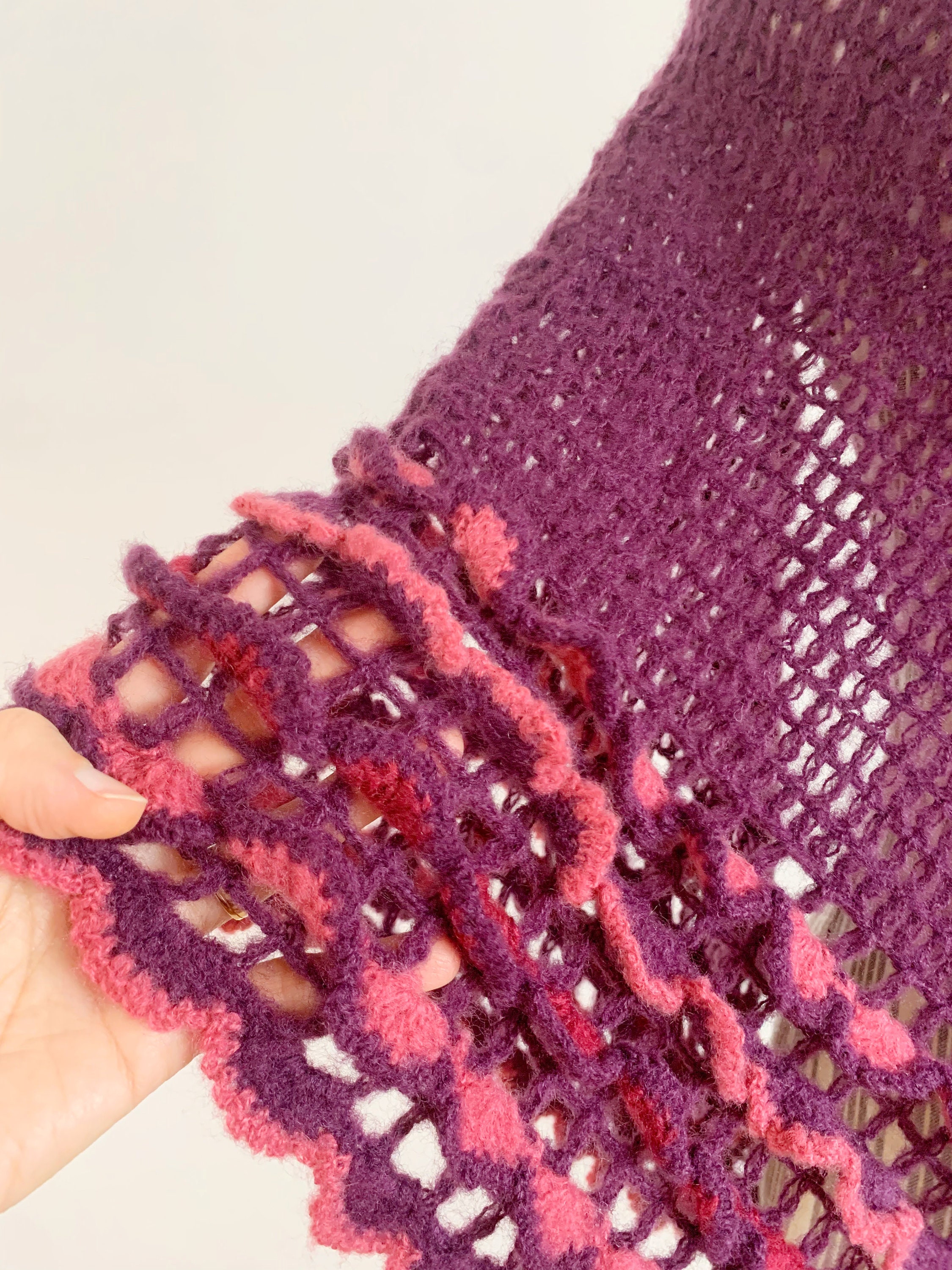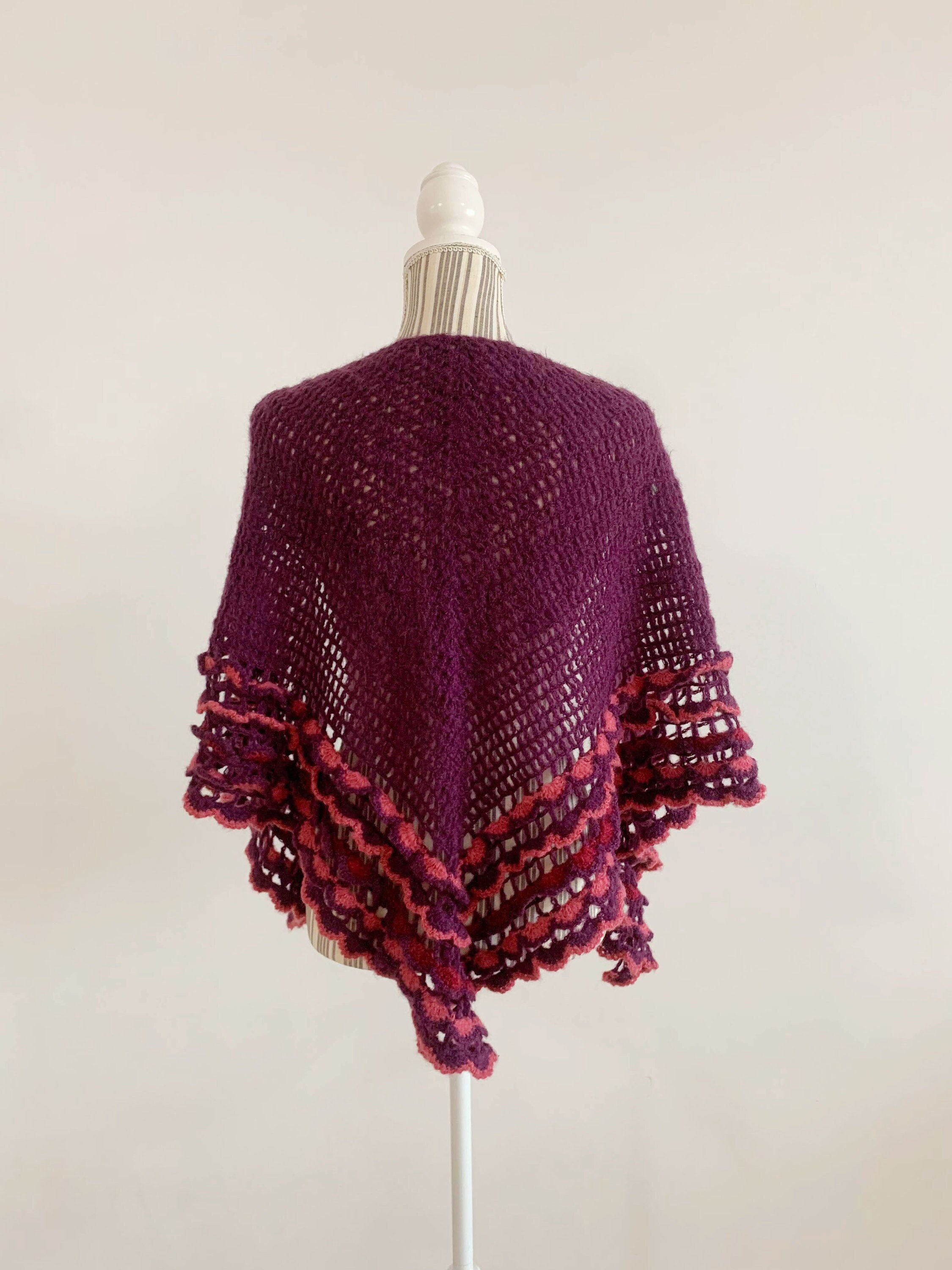 This is a vintage eggplant purple boho triangle shawl with delicate ruffled scalloped detailing at the bottom. This burgundy pink piano shawl is hand crochet with soft fluffy mohair wool yarn. Adorable statement accessory to your bohemian style maxi dresses. This gypsy triangle shawl is perfect for the autumn and winter season. Throw is over your long Victorian Era dress and you are ready to get all eyes on you. Be glamorous and gorgeous and let your free spirit lead the way. This cute vintage lace crochet shawl will make a perfect boho chic gift for your mother or grandmother.
