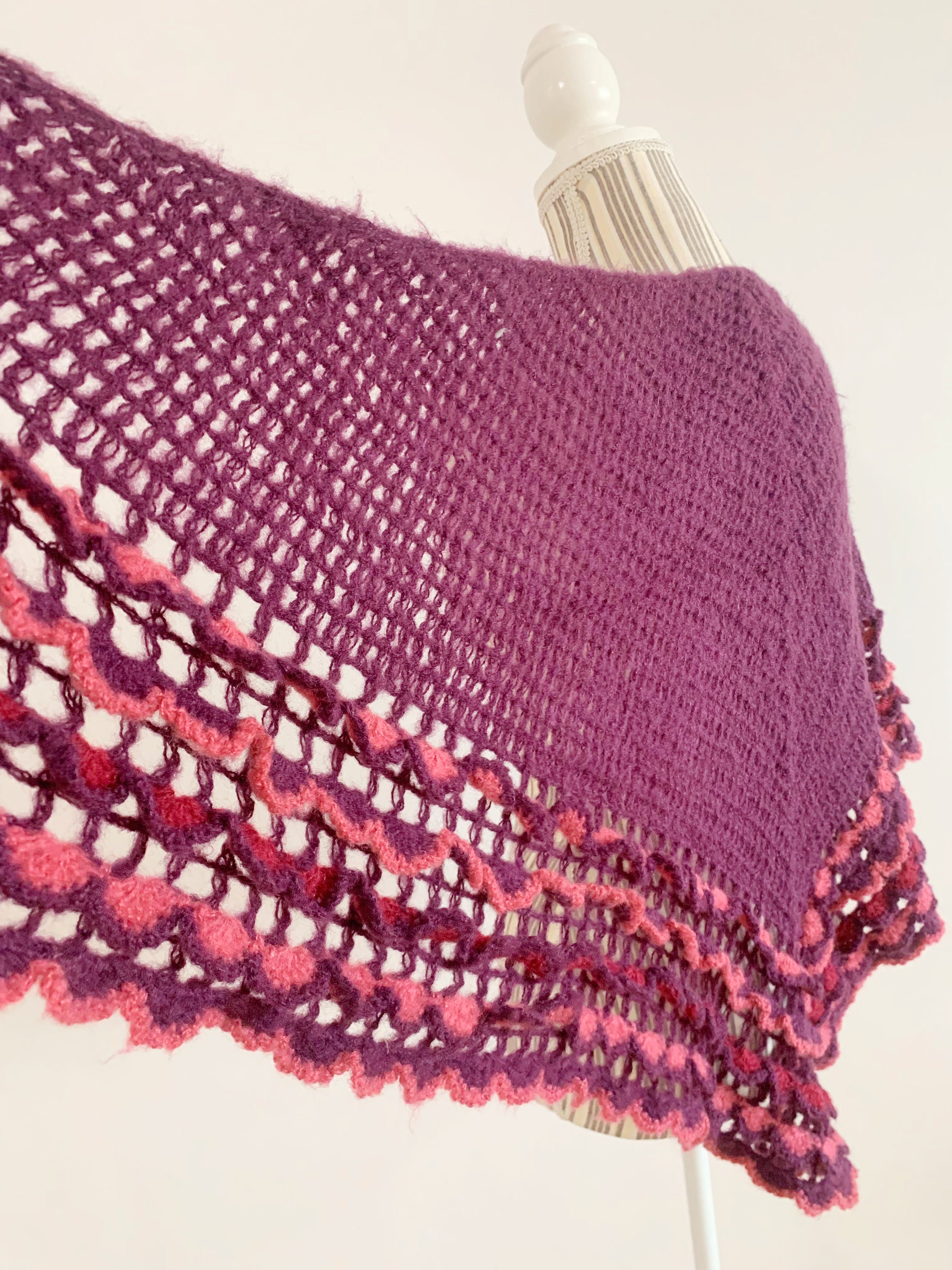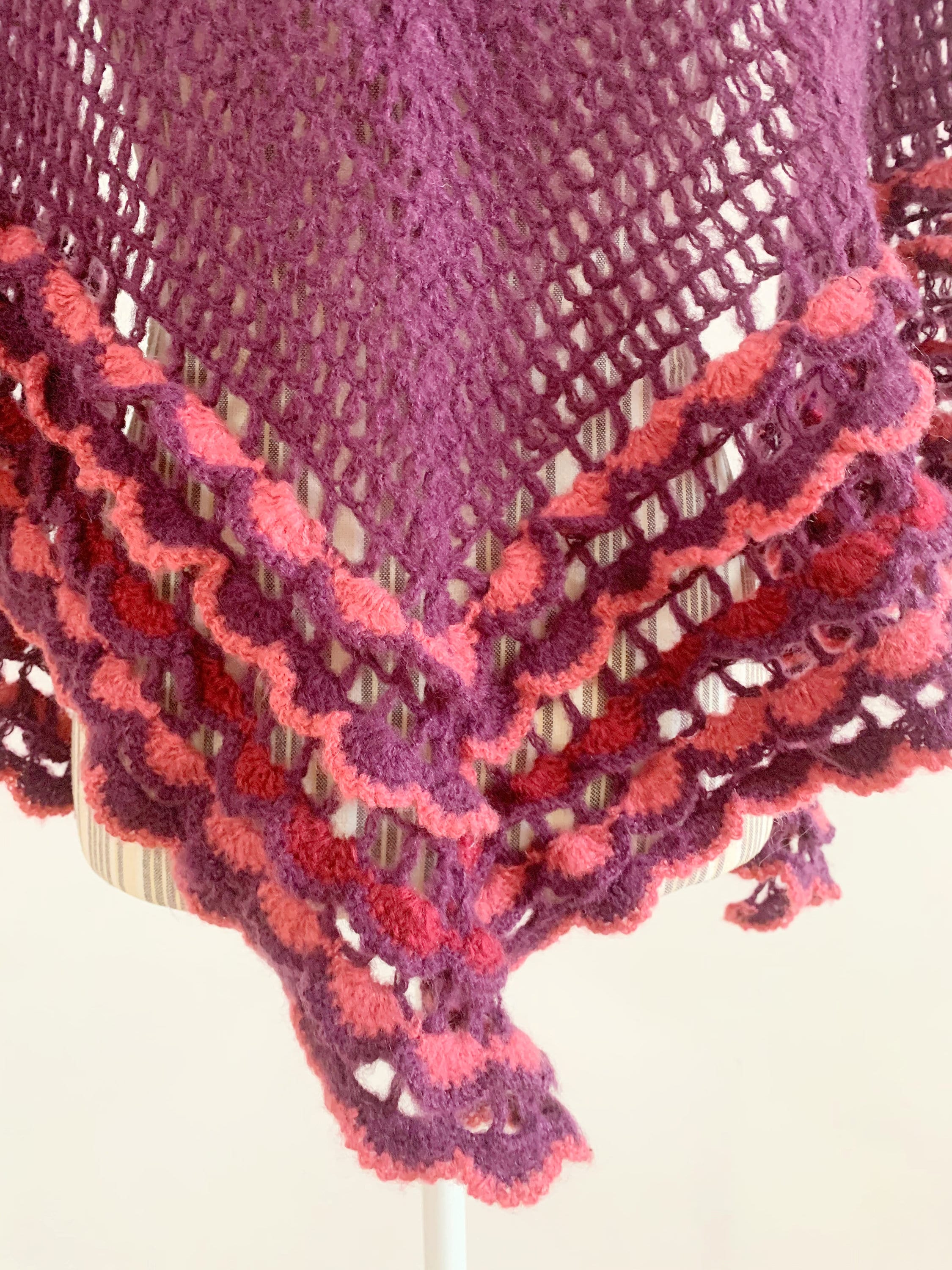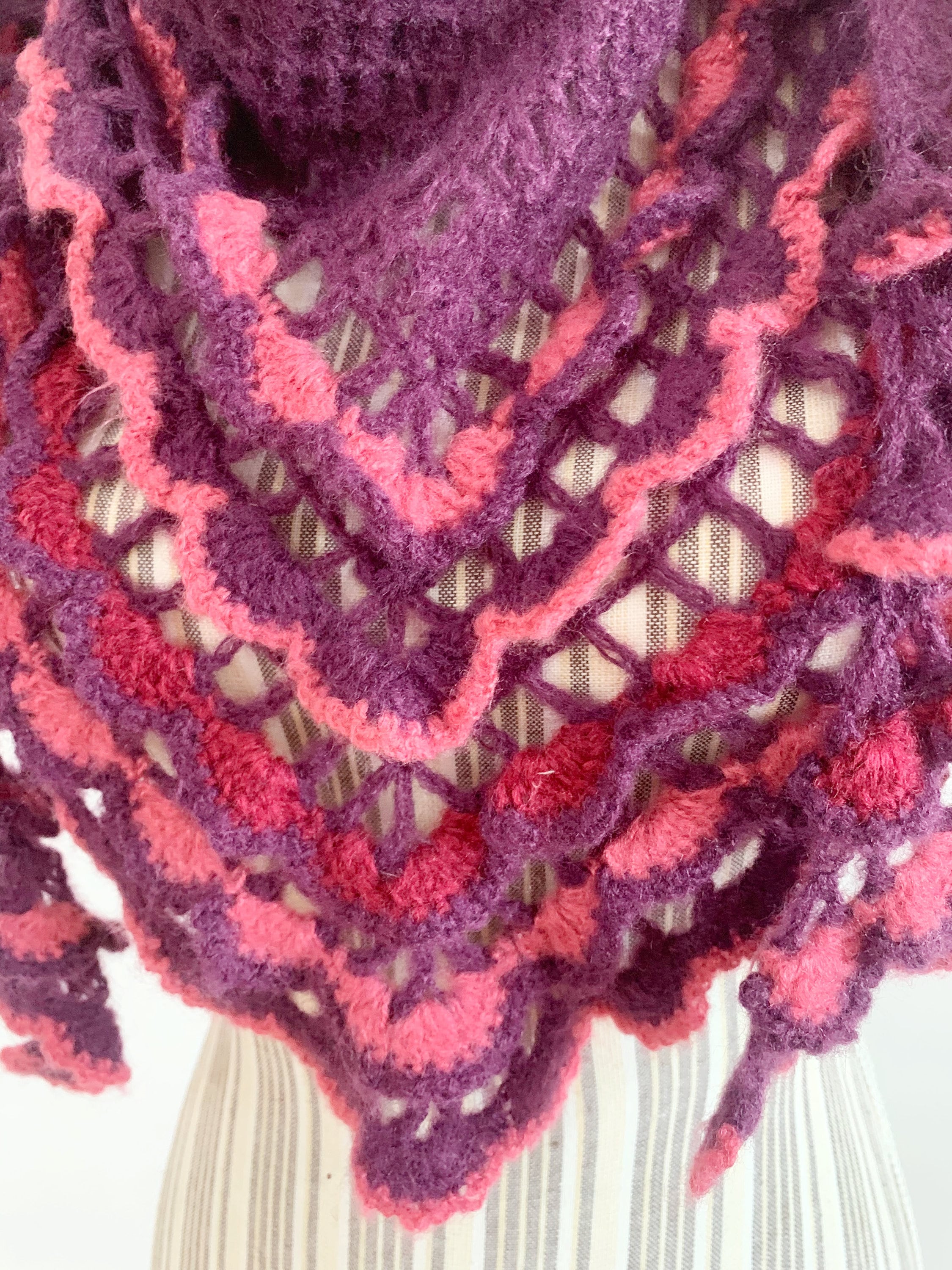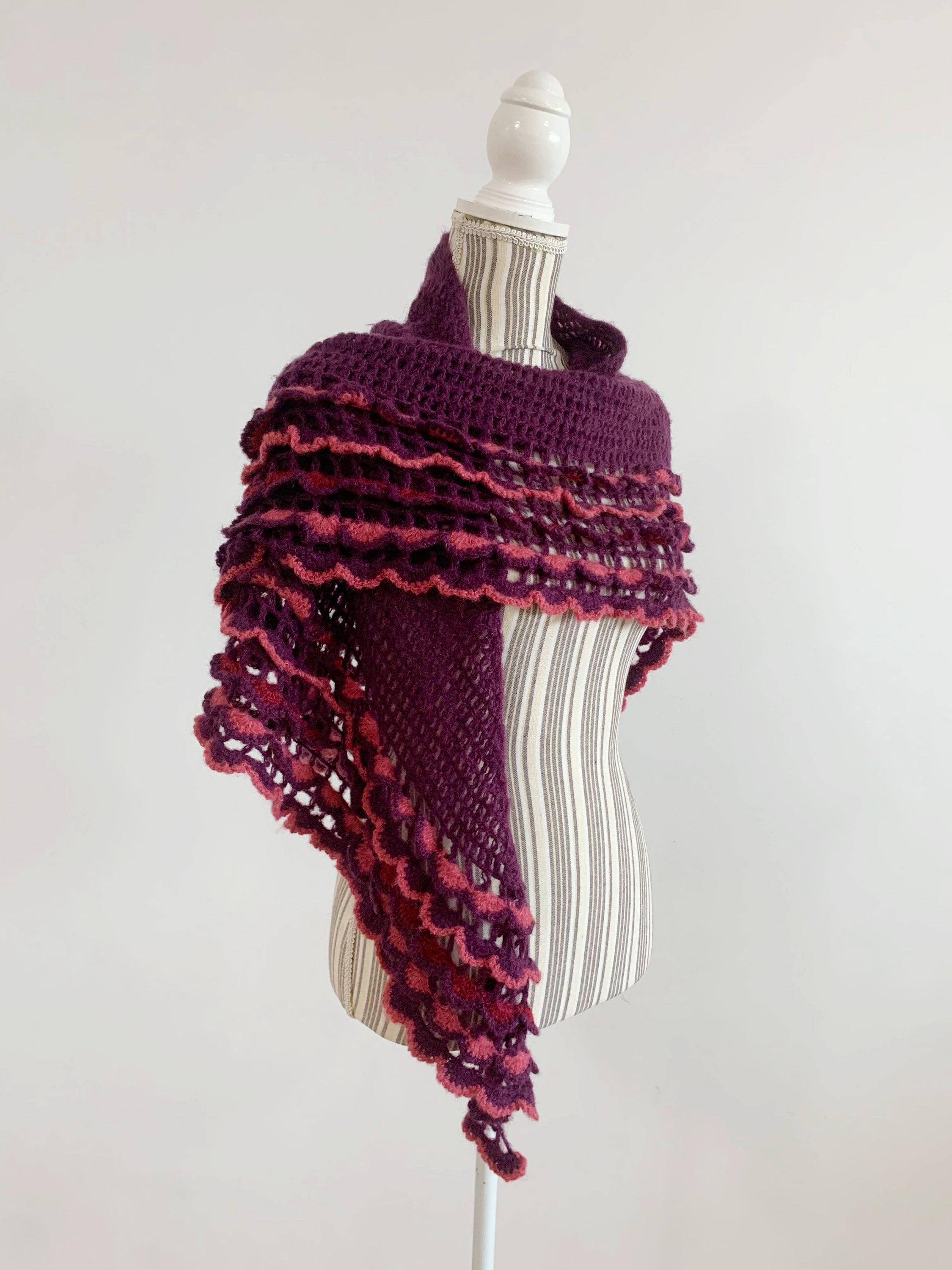 This is a vintage eggplant purple boho triangle shawl with delicate ruffled scalloped detailing at the bottom. This burgundy pink piano shawl is hand crochet with soft fluffy mohair wool yarn. Adorable statement accessory to your bohemian style maxi dresses. This gypsy triangle shawl is perfect for the autumn and winter season. Throw is over your long Victorian Era dress and you are ready to get all eyes on you. Be glamorous and gorgeous and let your free spirit lead the way. This cute vintage lace crochet shawl will make a perfect boho chic gift for your mother or grandmother.