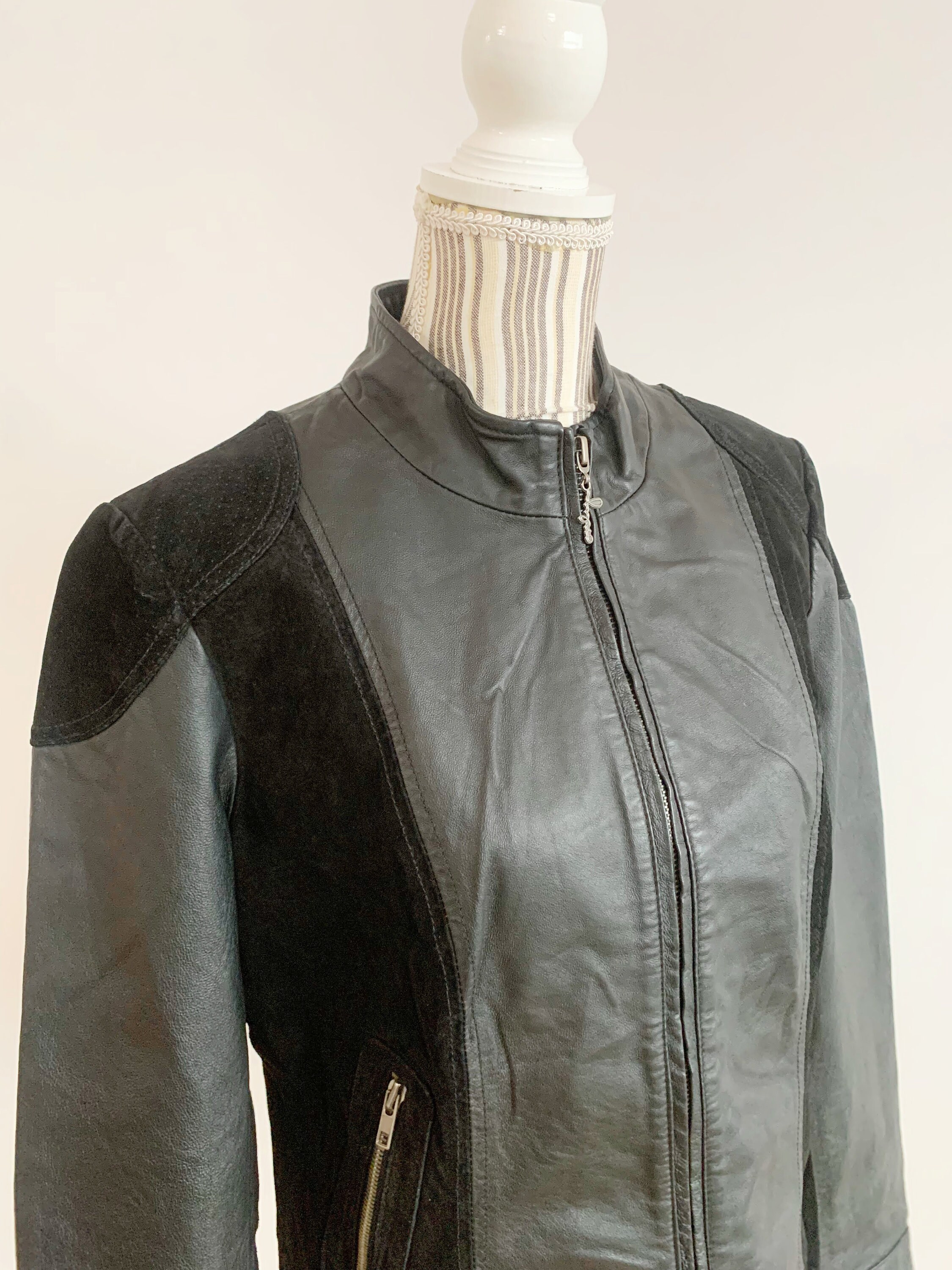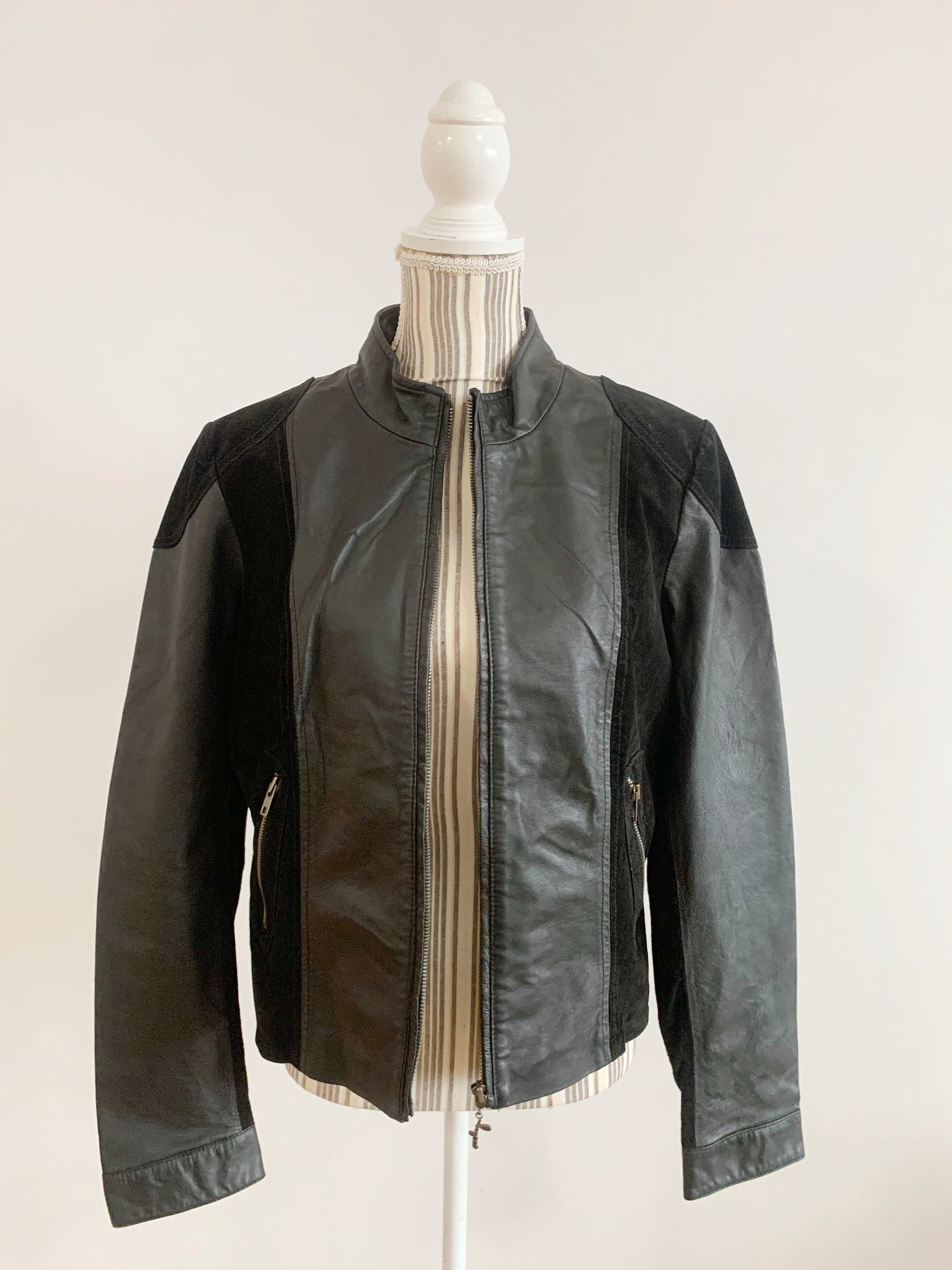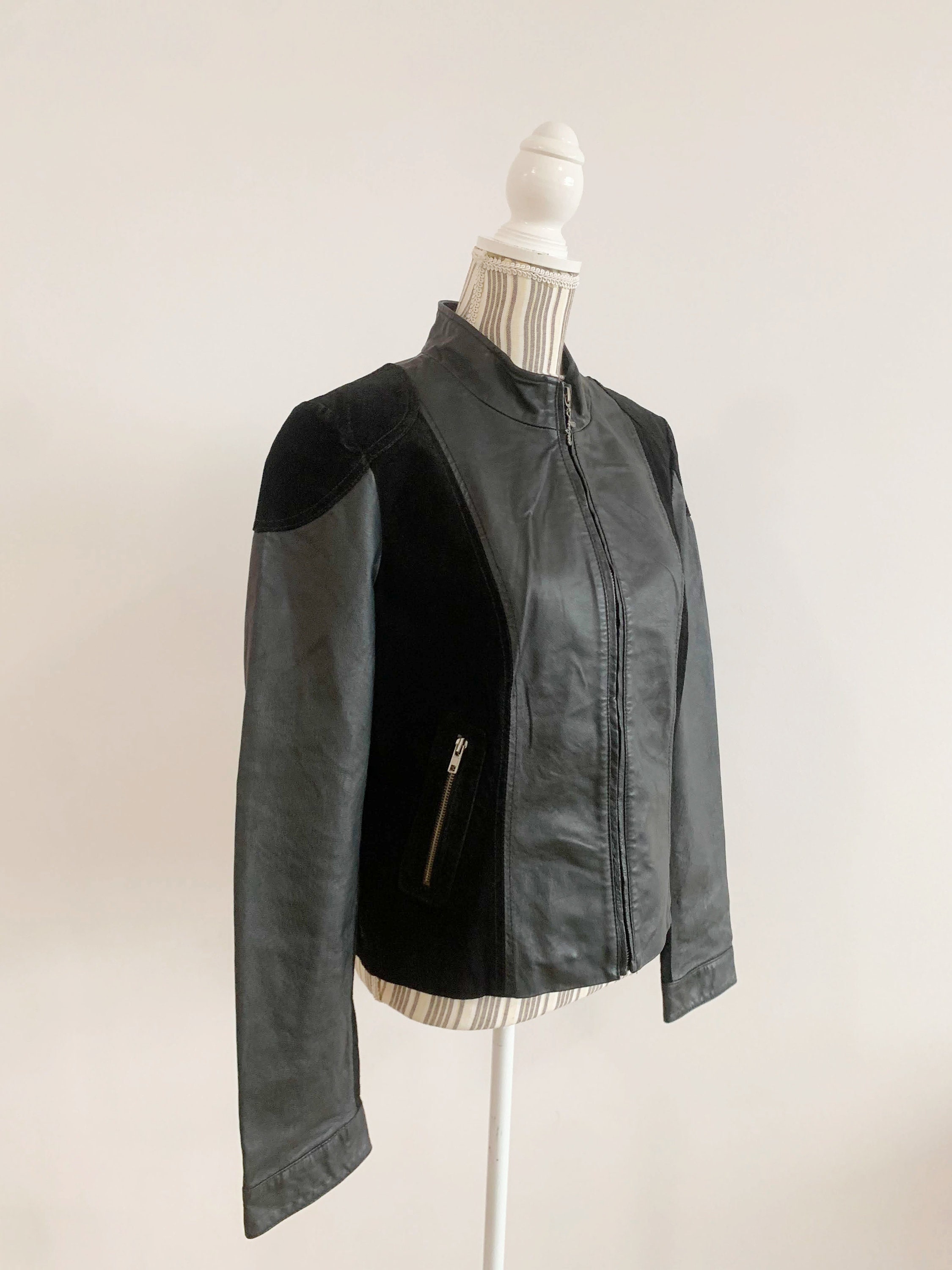 This is a vintage Y2K genuine leather motorcycle jacket for women size 42 L. This leather biker jacket has zip up closure and ziper pockets. This minimalist racer leather jacket is made of genuine leather and suede leather. This motorcycle jacket has band neck collar slim fit silhouette. This biker jacket is size 42, it would best fit size M or L. Please check the measurements below.