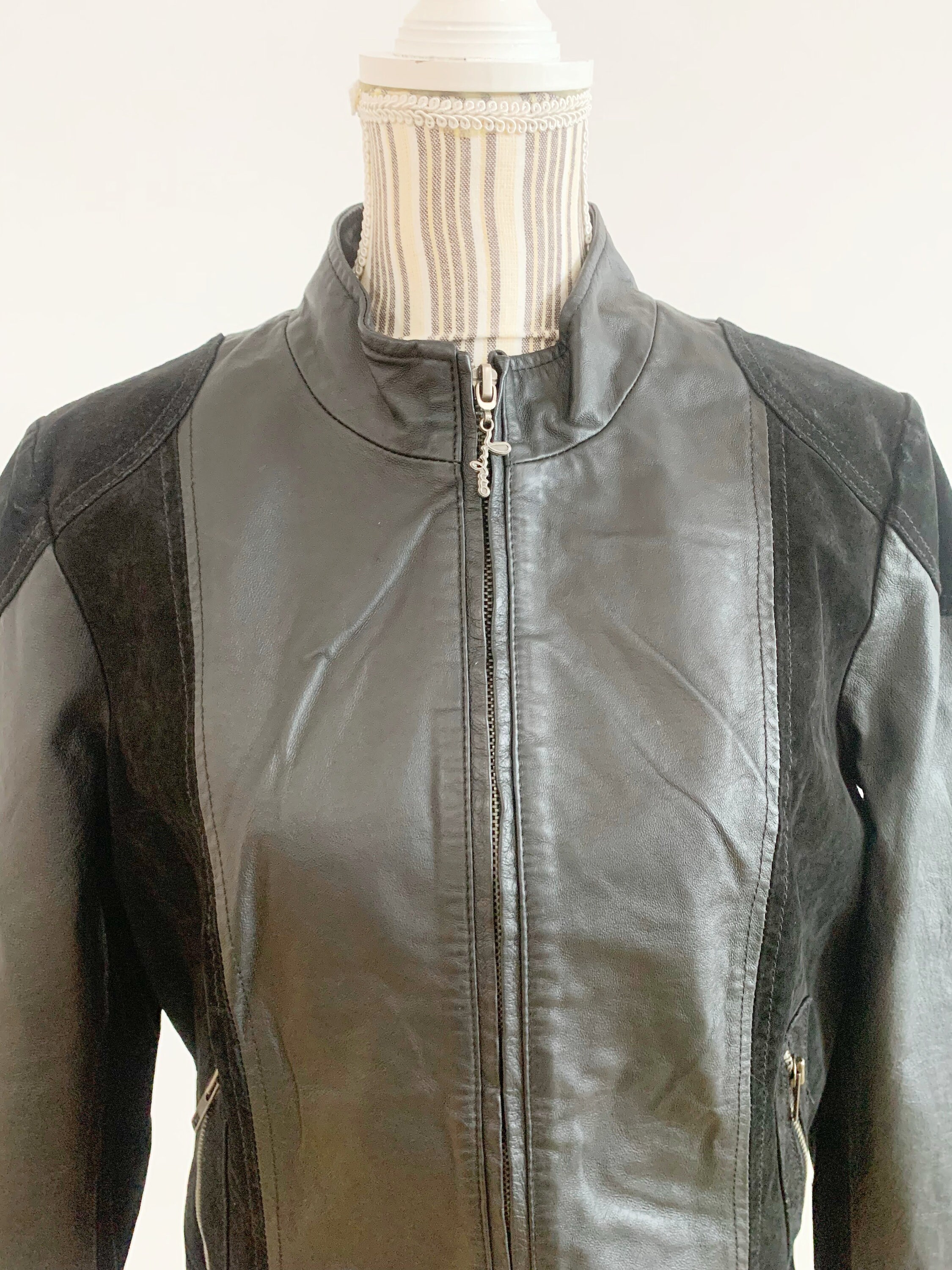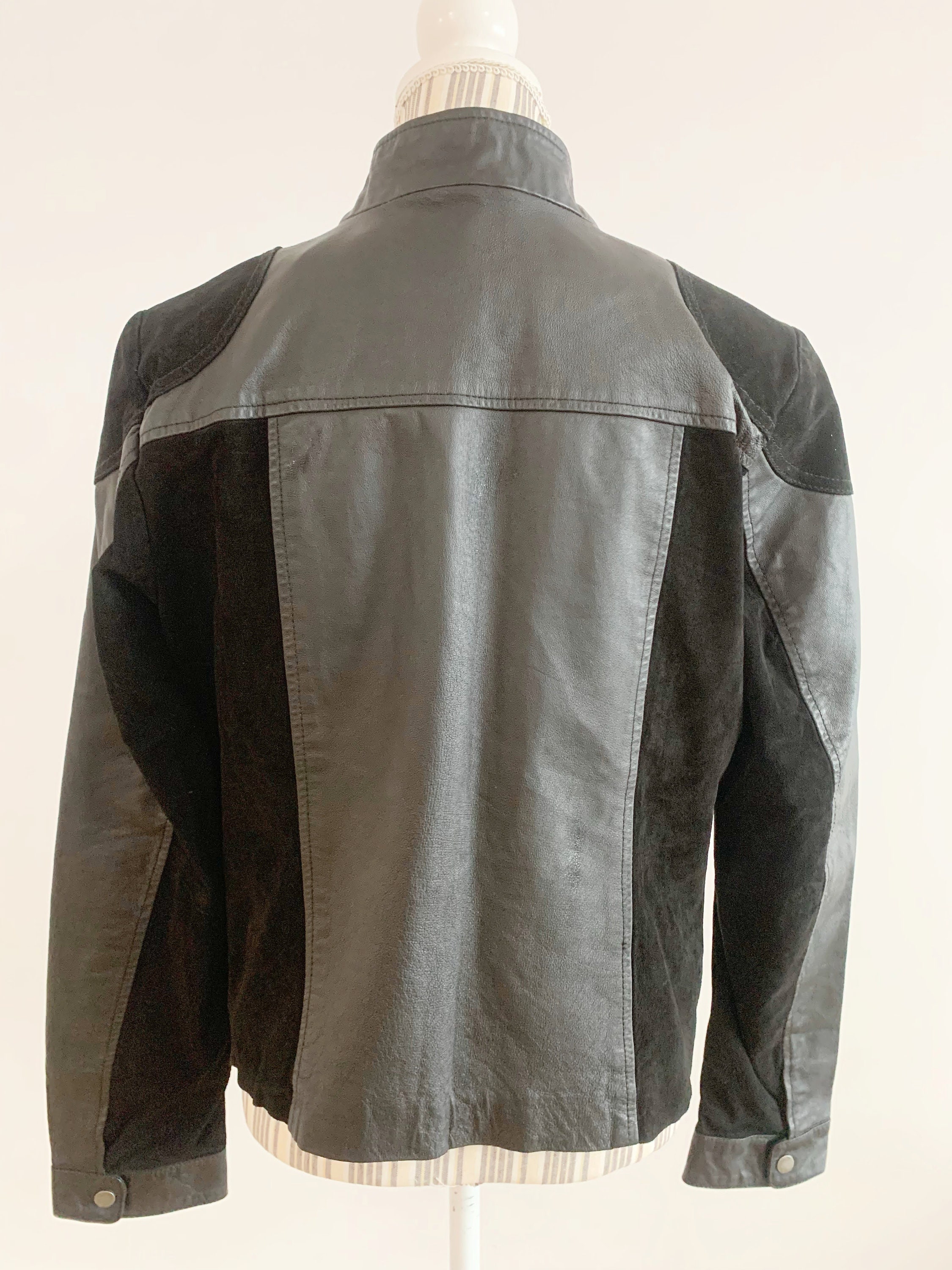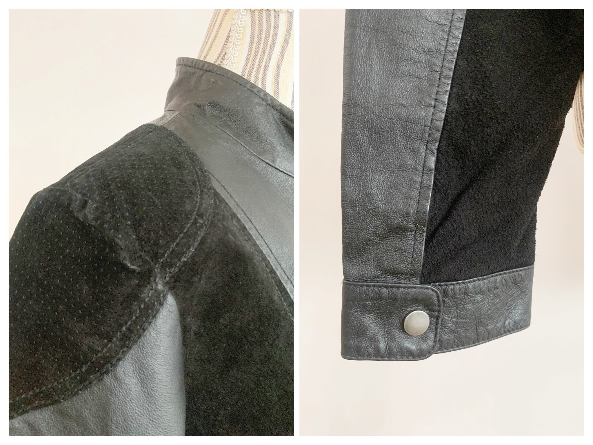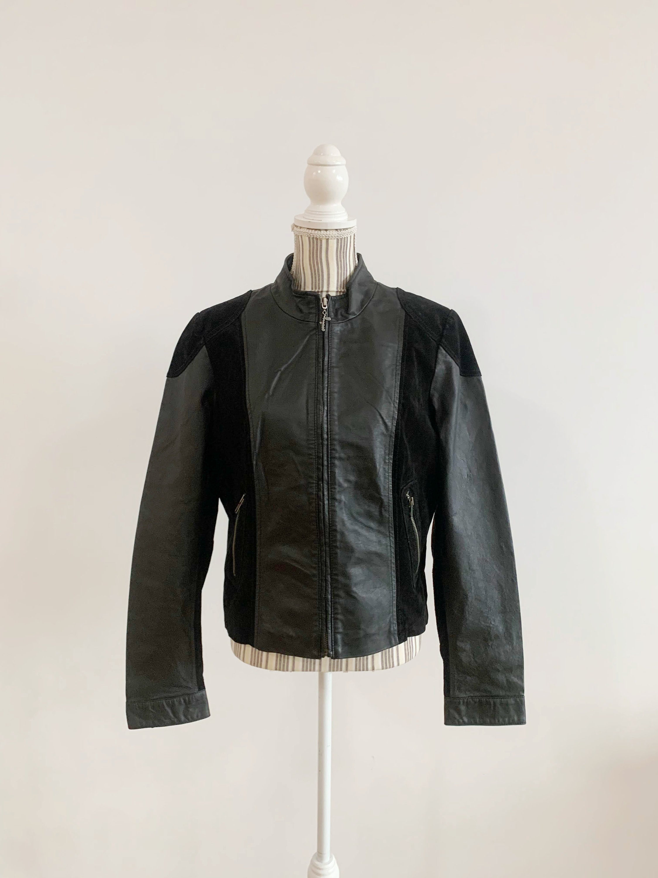 This is a vintage Y2K genuine leather motorcycle jacket for women size 42 L. This leather biker jacket has zip up closure and ziper pockets. This minimalist racer leather jacket is made of genuine leather and suede leather. This motorcycle jacket has band neck collar slim fit silhouette. This biker jacket is size 42, it would best fit size M or L. Please check the measurements below.