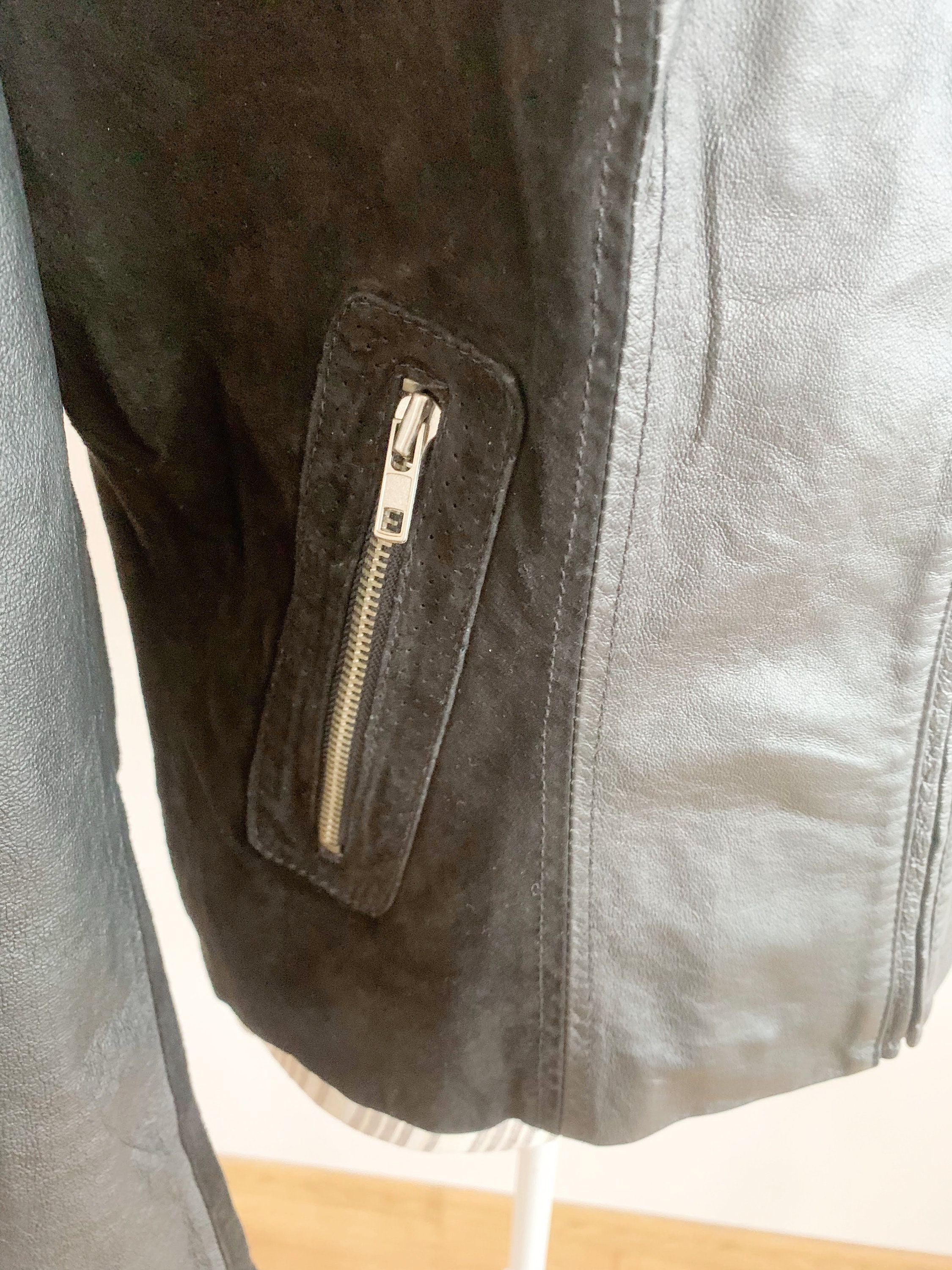Condition: this brown leather jacket was pre- loved and shows some minor signs of wear - there are some creases on the leather surface and some marks on the suede leather parts.