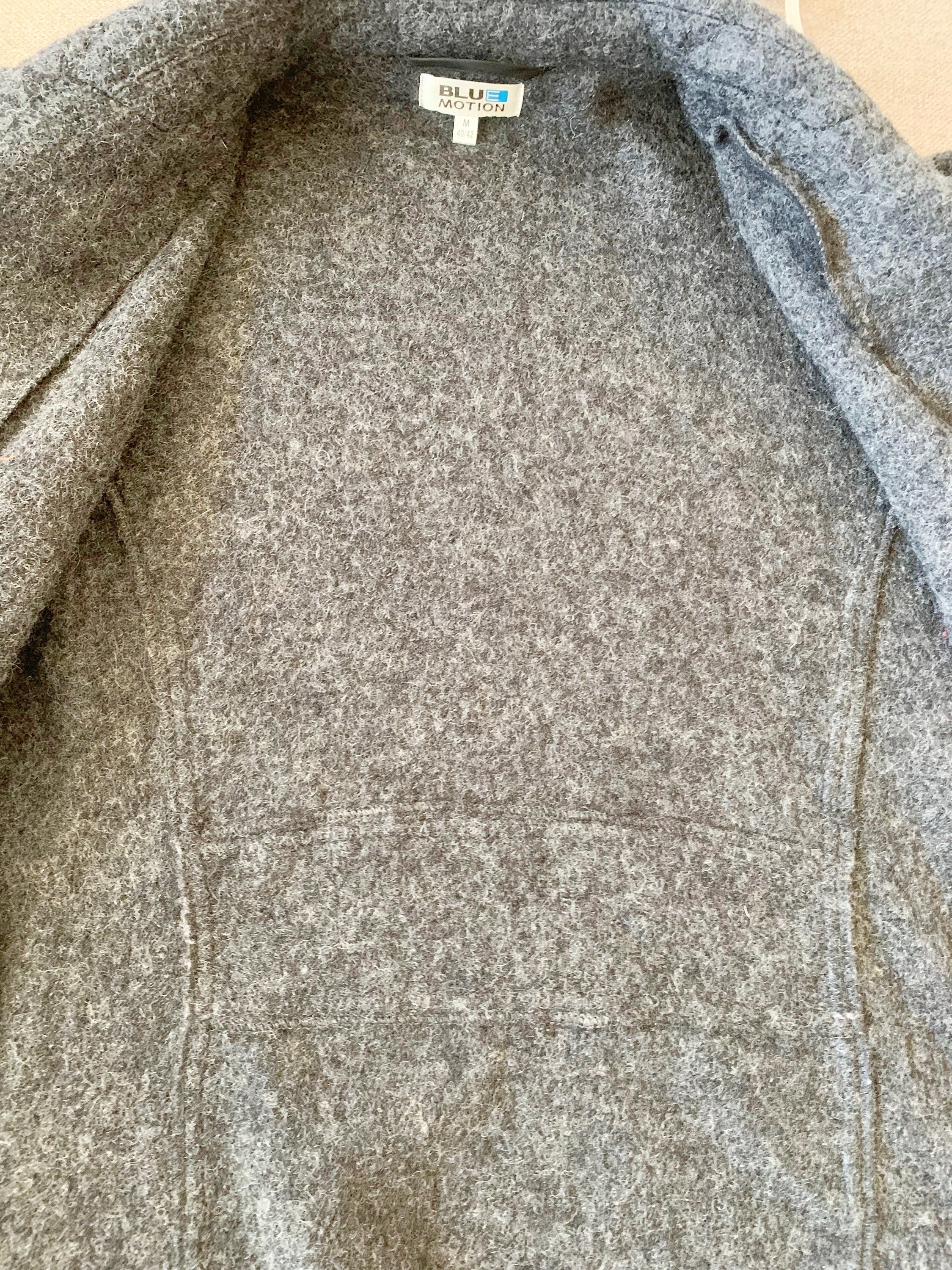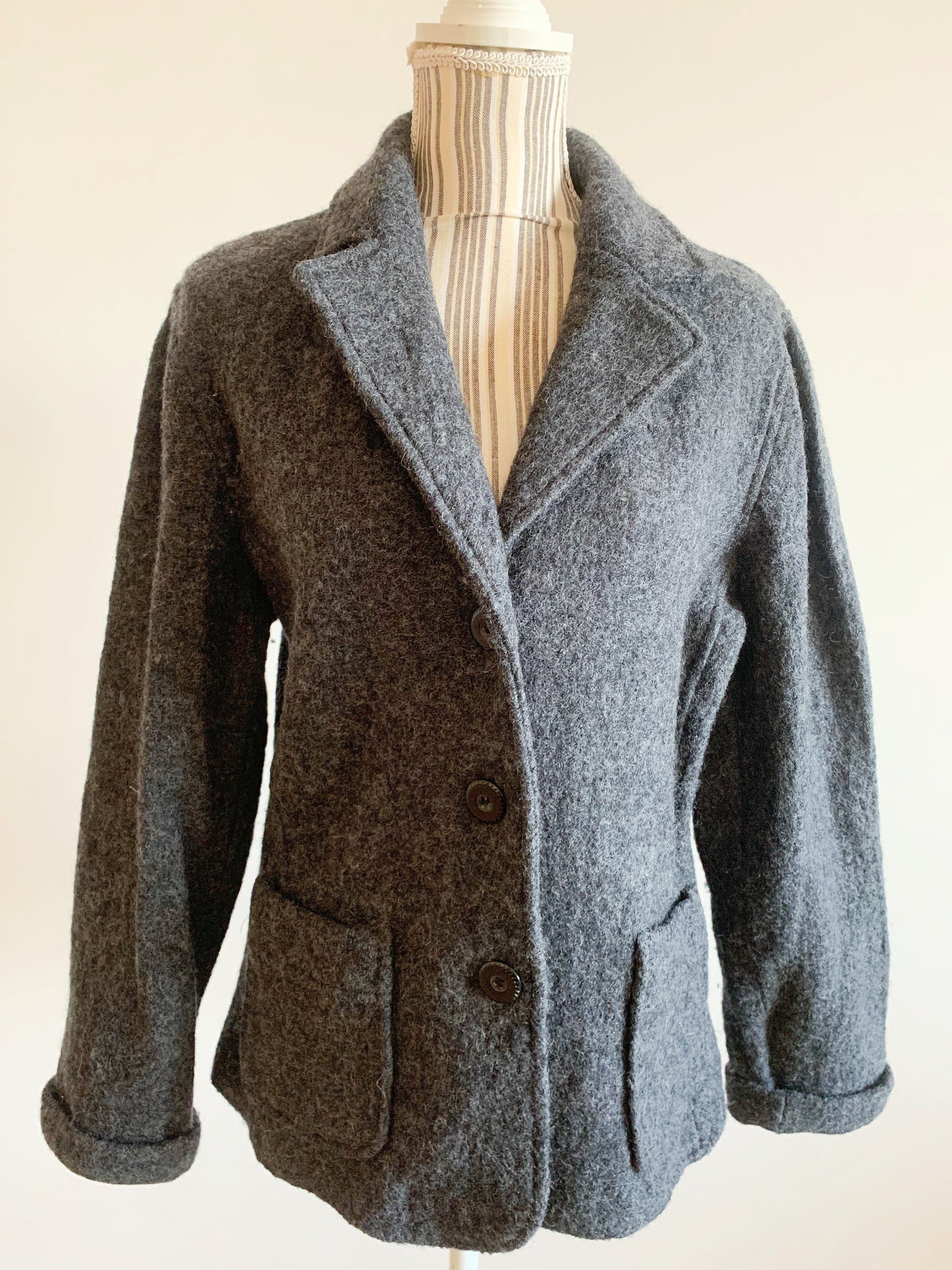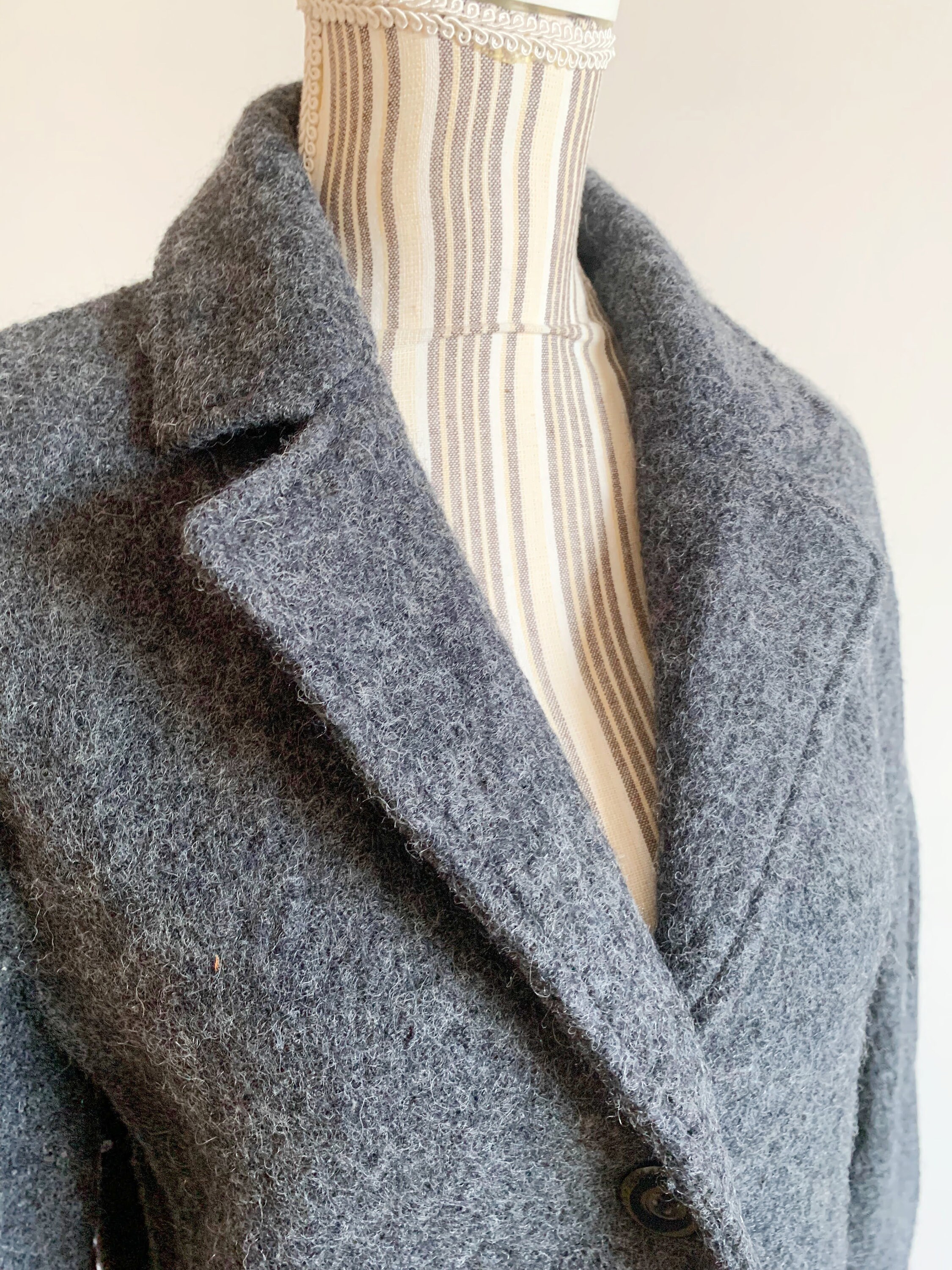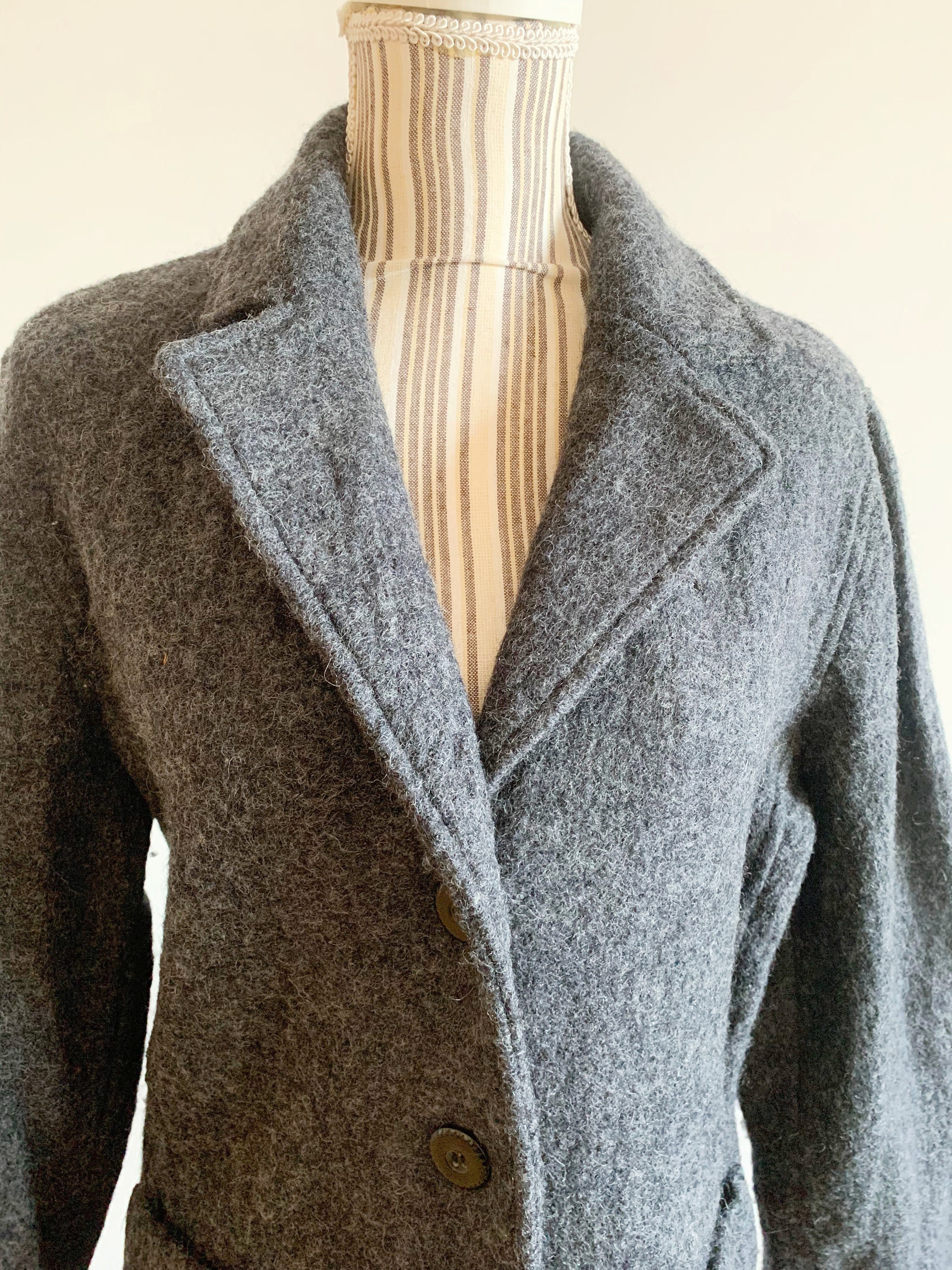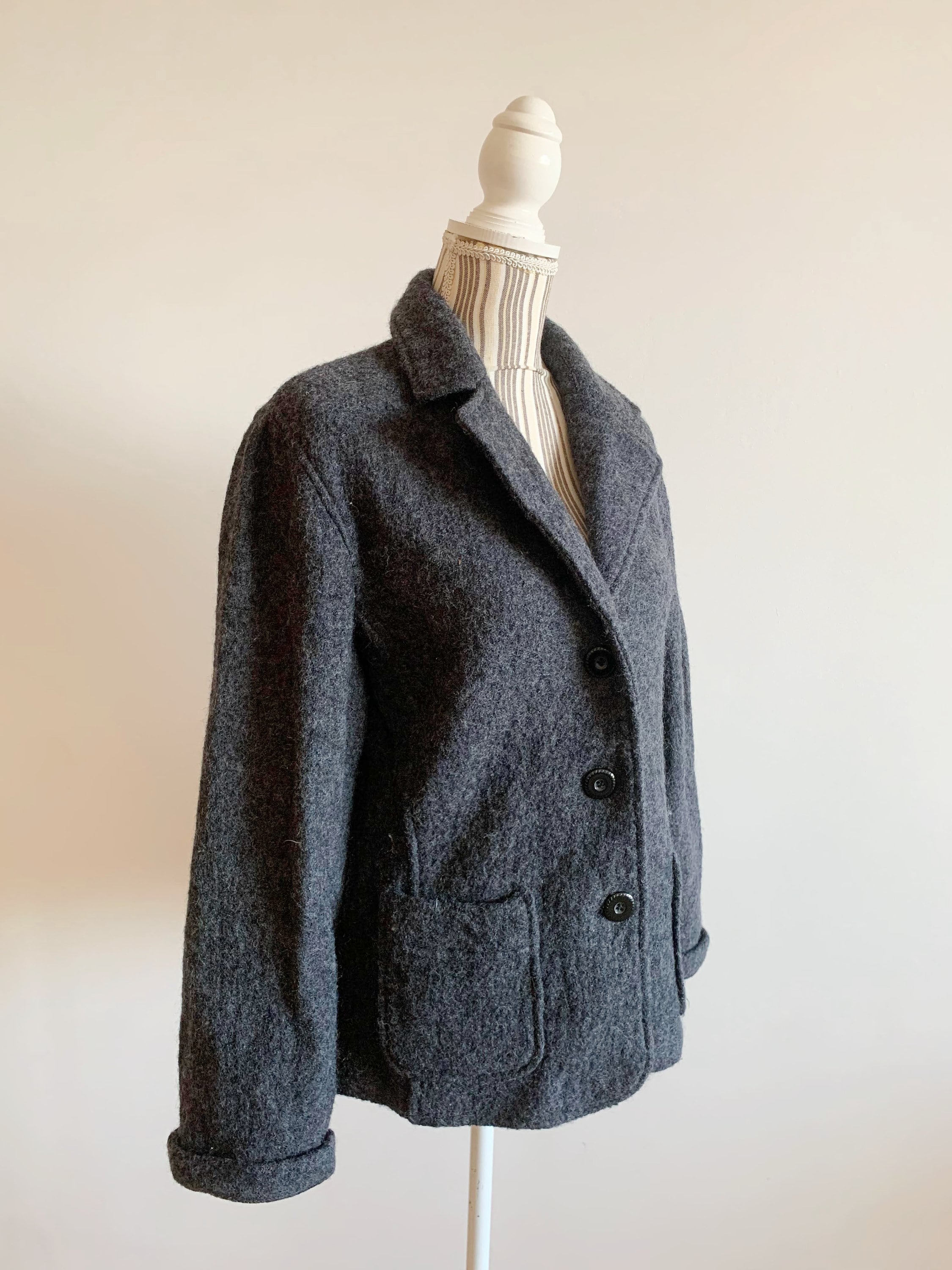 This is s beautiful vintage 90s grey wool blazer for women. This unlined wool blazer is perfect for the spring and autumn seasons. This short wool coat is made of 100% wool fabric. It has no lining underneath. This wool blazer has button up closure and two side pockets. This women's cropped wool coat is by the brand Blue Motion. The size marked is M 40/42, it fits more like size L. Please check the measurements below.