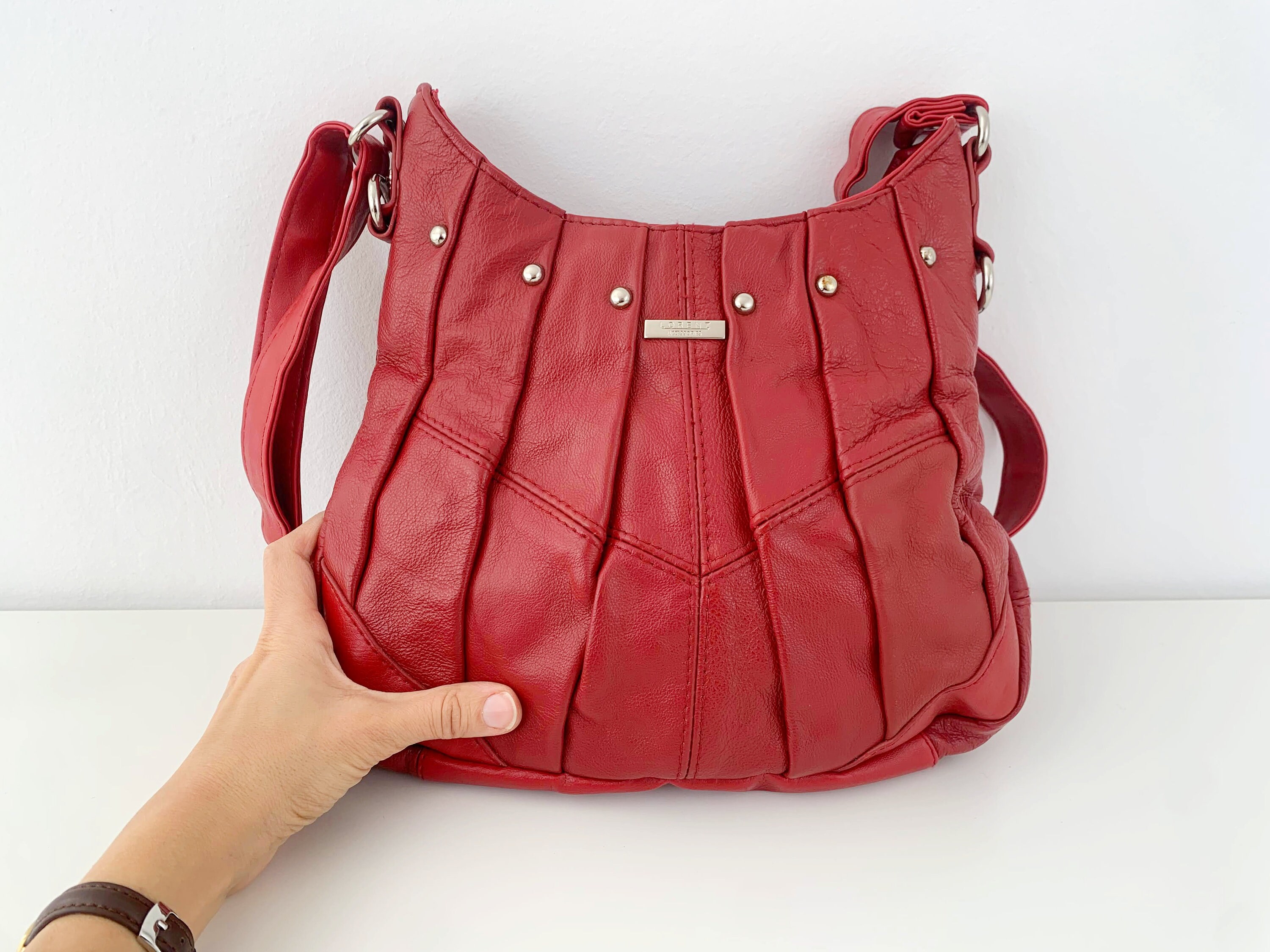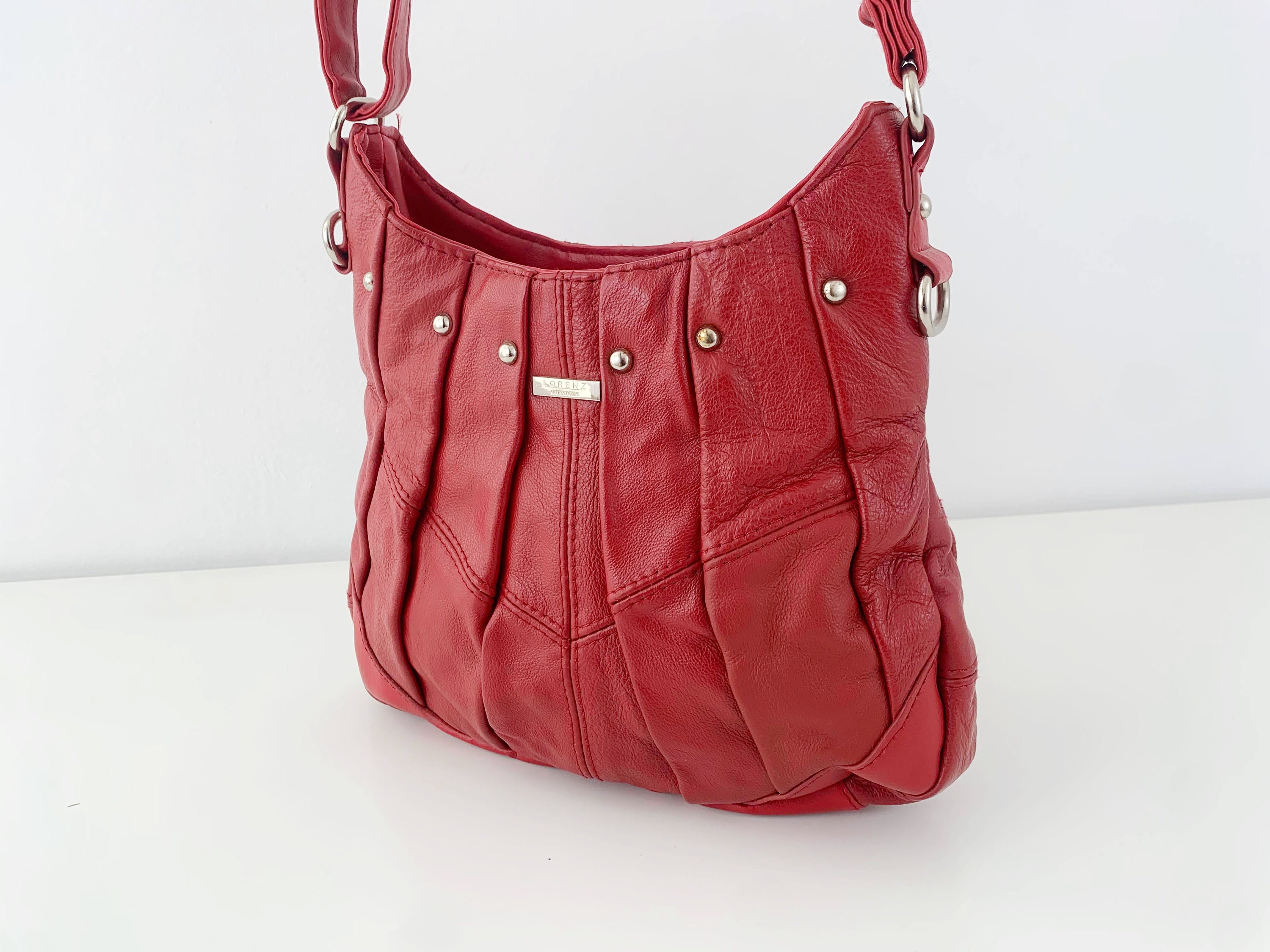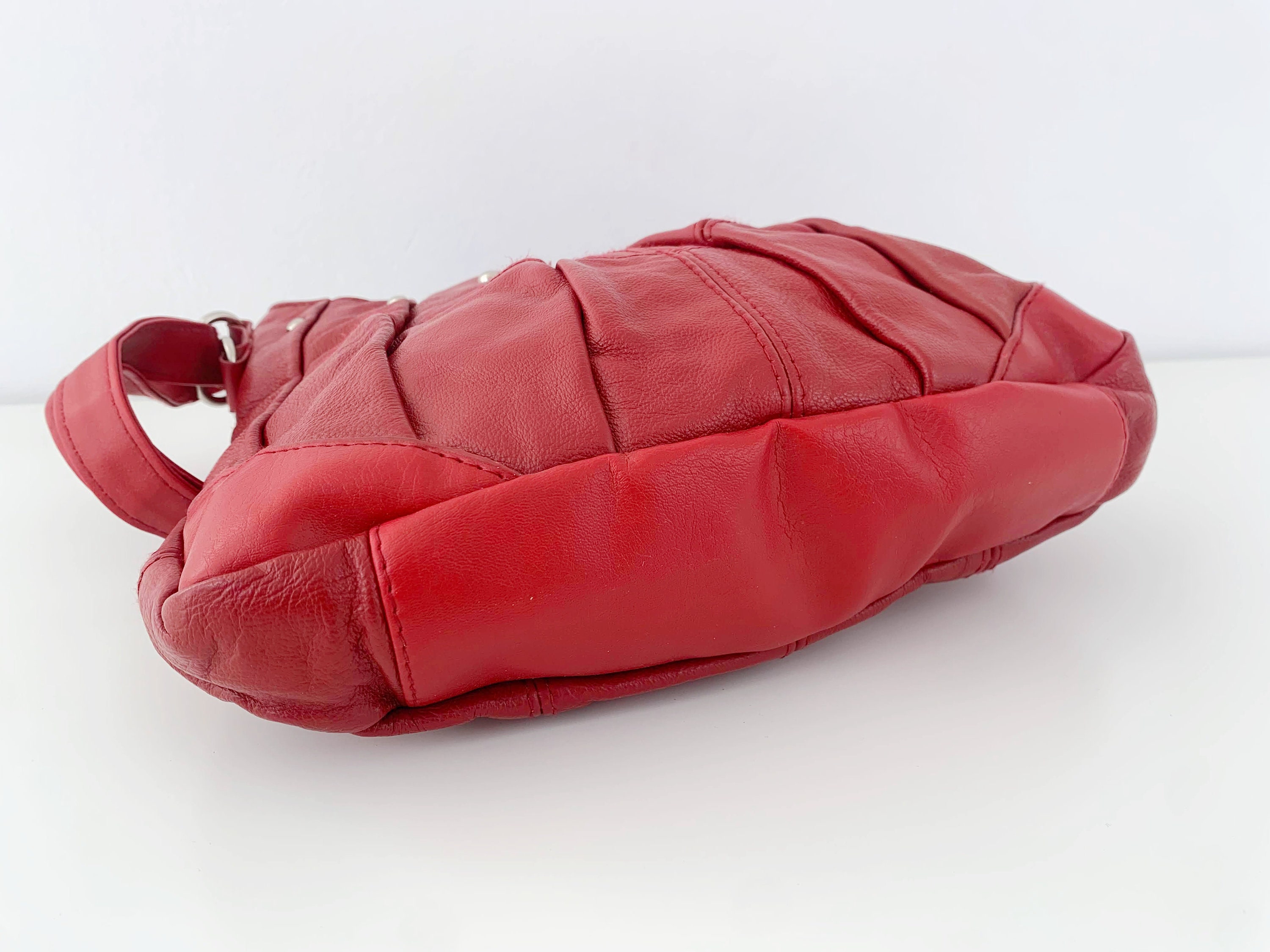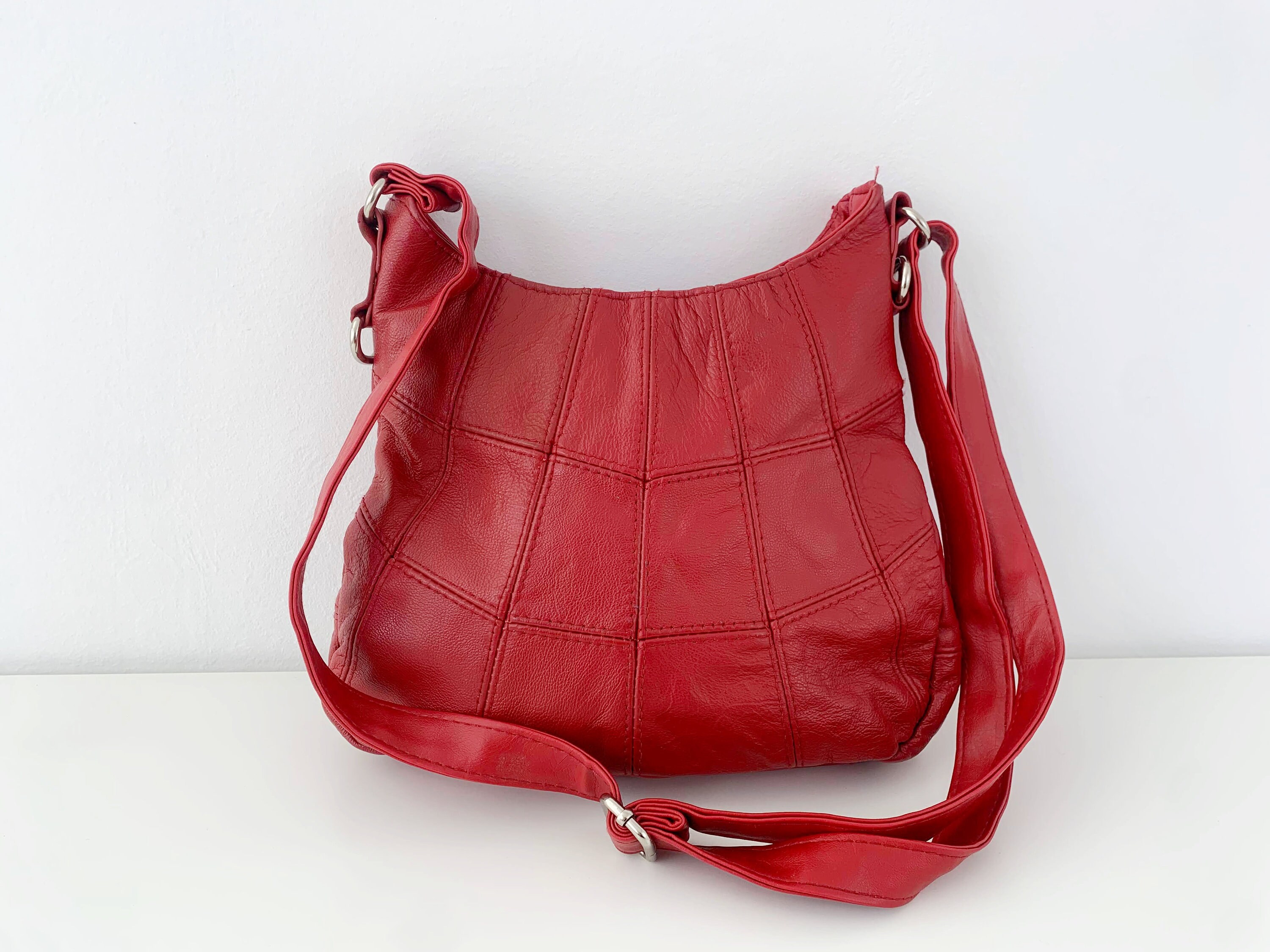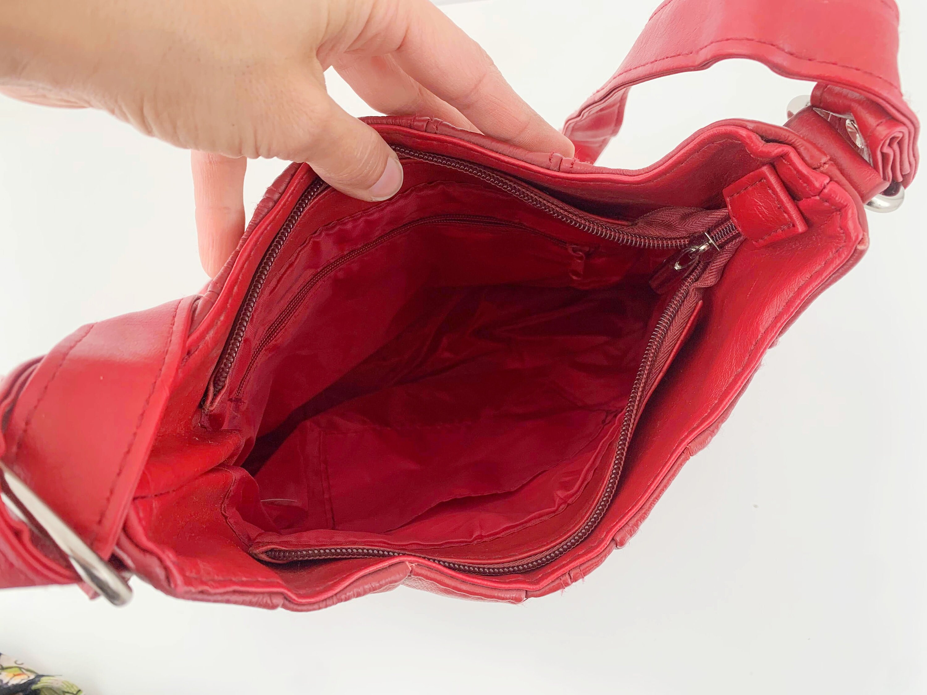 This is a vintage 90s cute and simple red faux leather crossbody purse. This red leather hobo shoulder bag has vertical U shape and top zip up closure. This medium size red vegan leather satchel purse is made of faux leather and silver tone hardware. It has an adjustable shoulder strap which can be adjusted so you can wear it as a shoulder hobo or as a crossbody bag. There is one compartments with one zipper pocket and one slip pocket inside.
