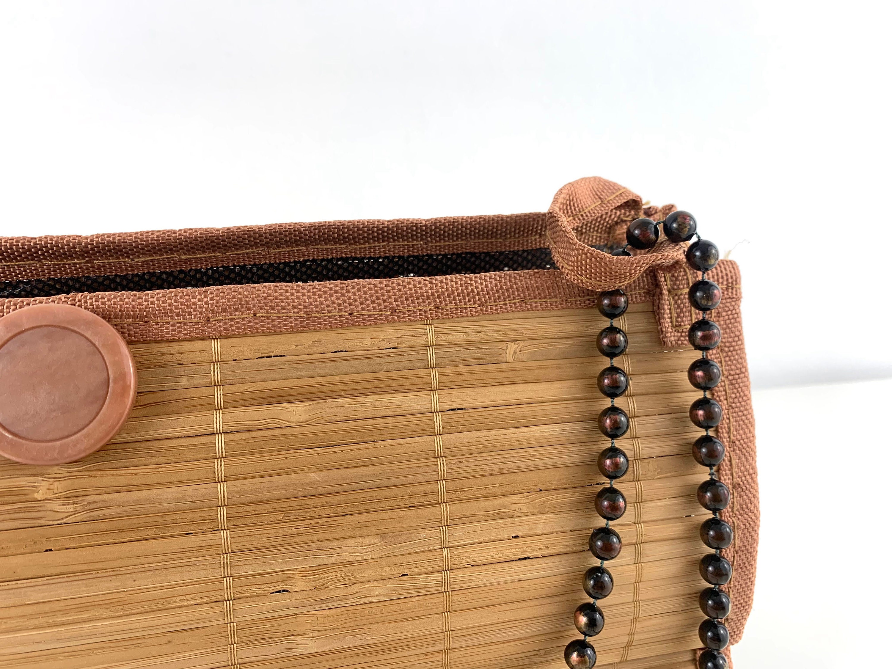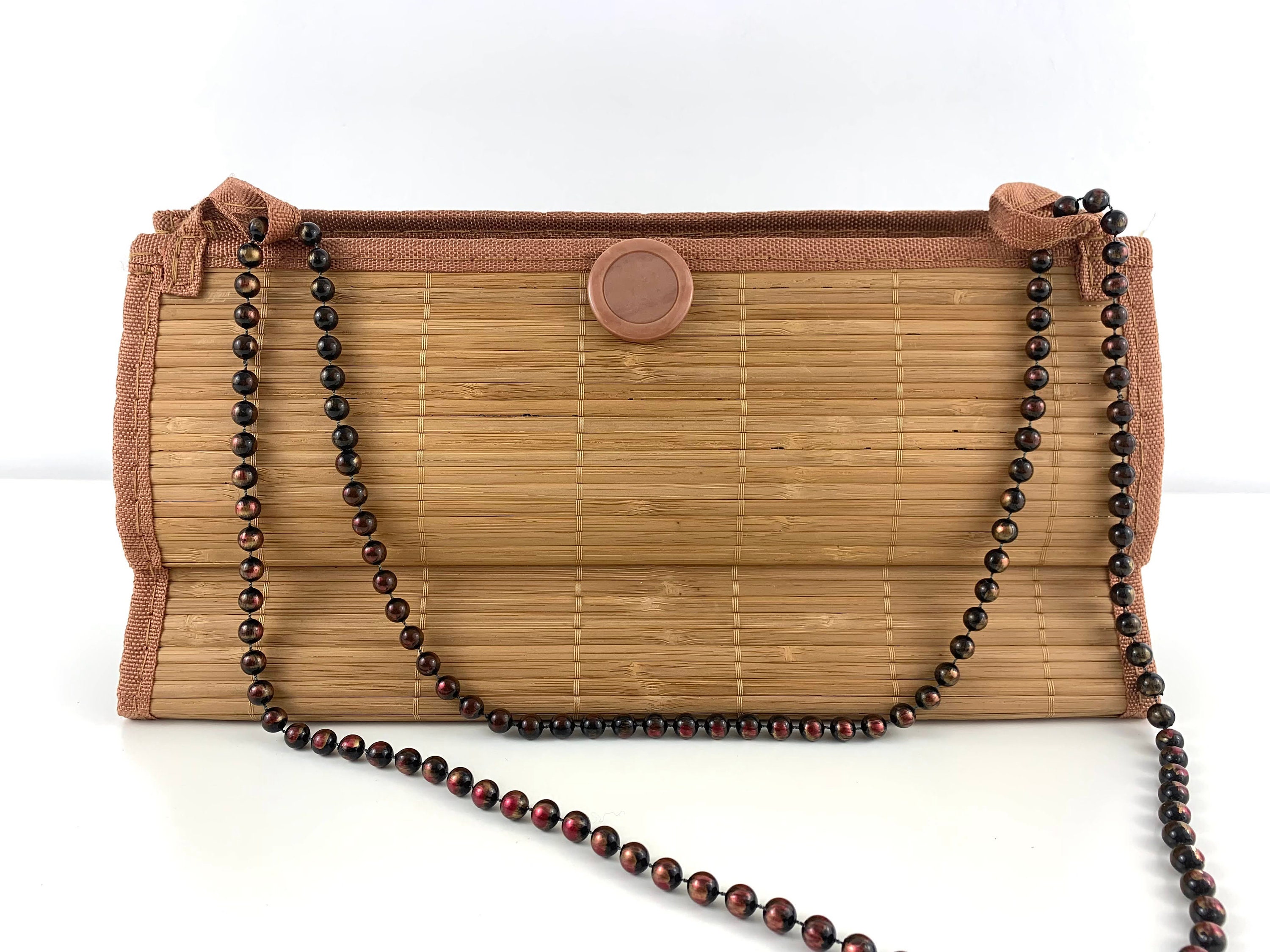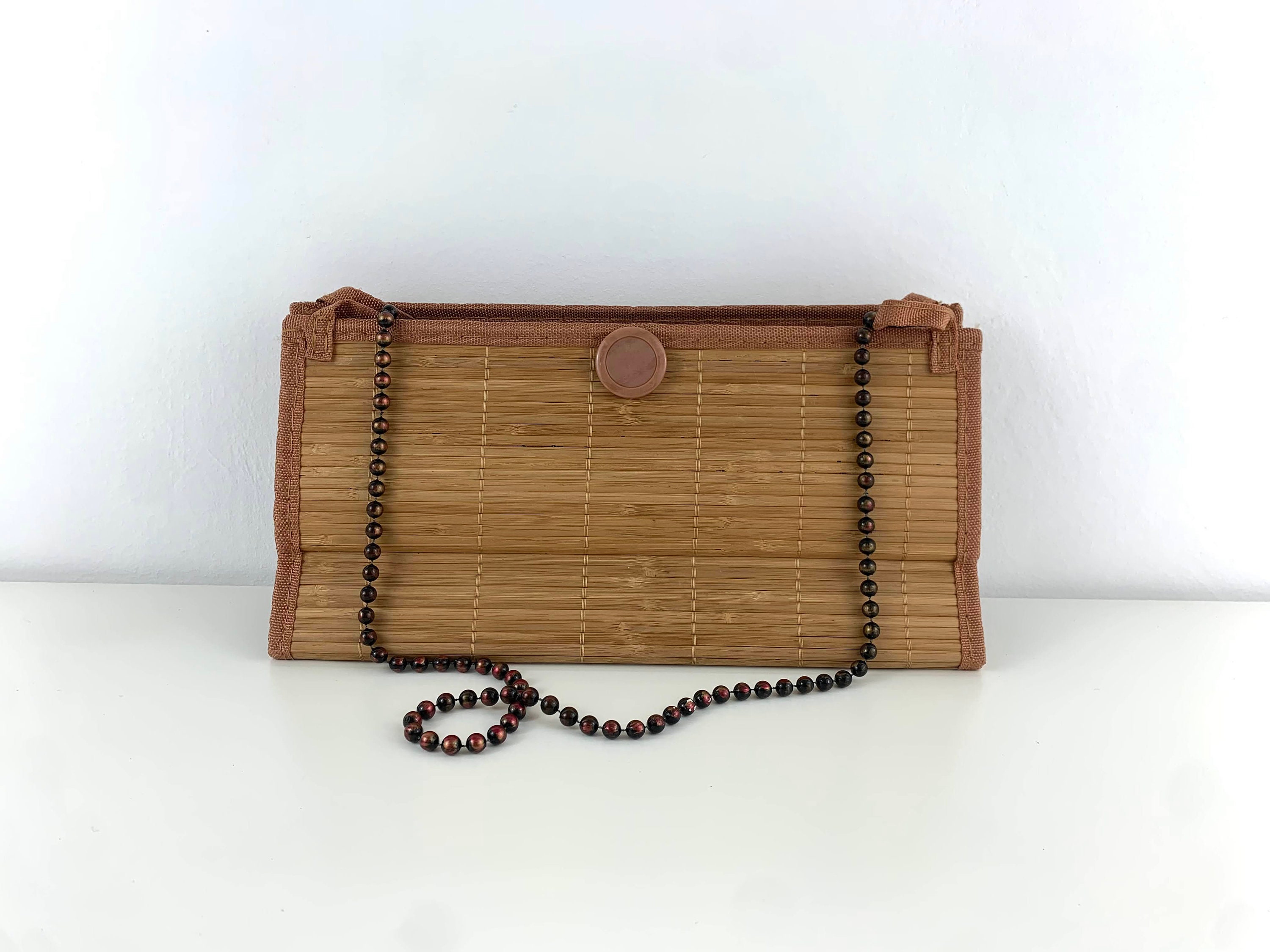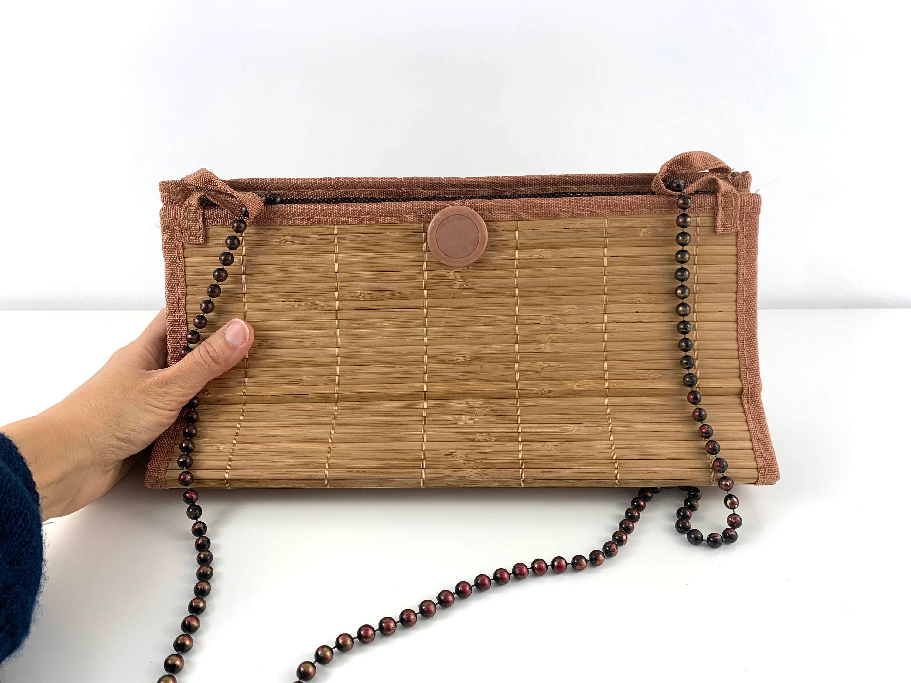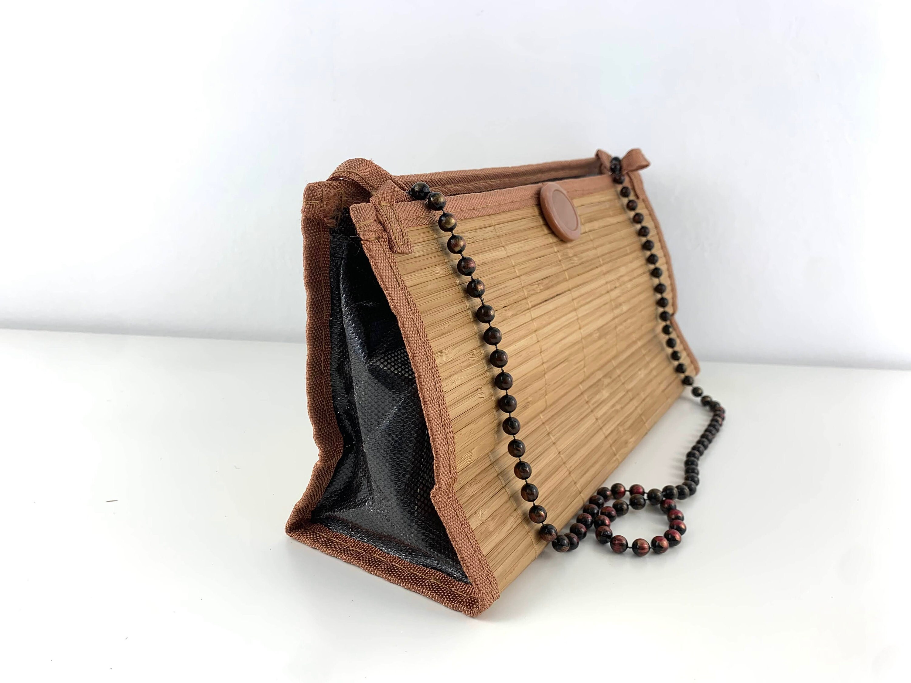 Adorable vintage 80s boho chic clutch bag made of natural wood in tan brown color with plastic beadwork shoulder strap. This wooden purse is the perfect addition to any summer outfit. This natural wool purse has open top with one compartment inside. The interior is lined in polyester lining.