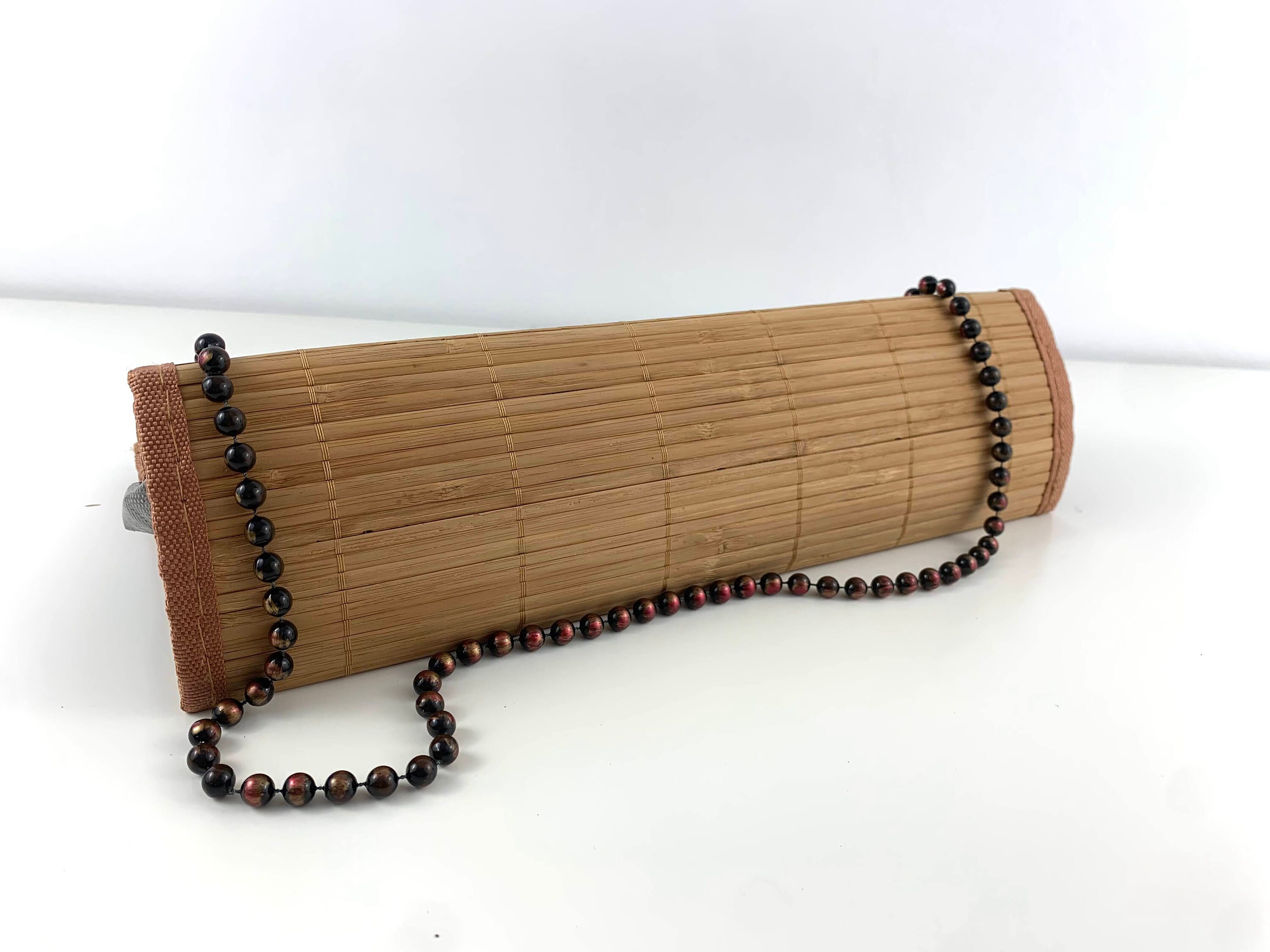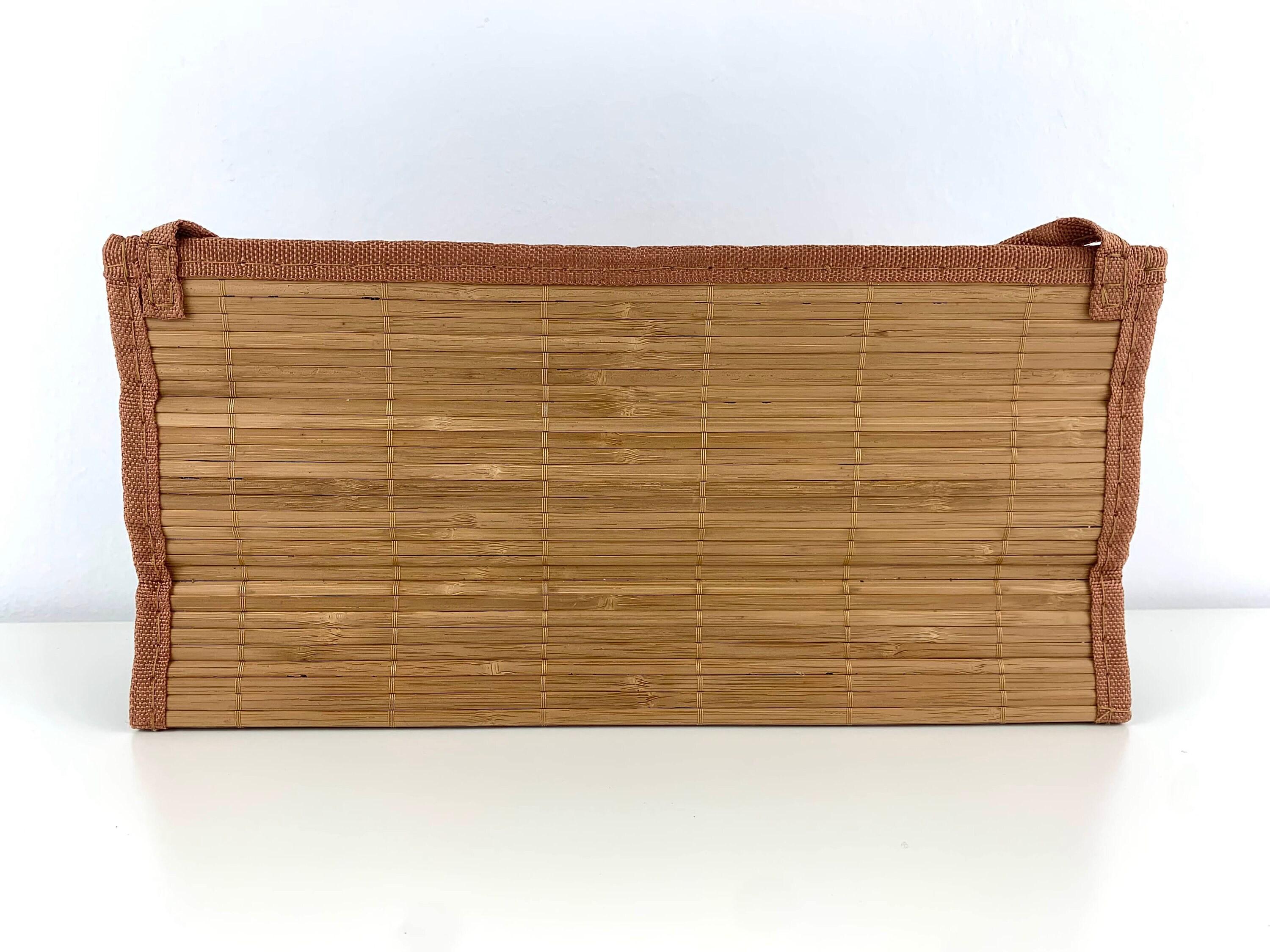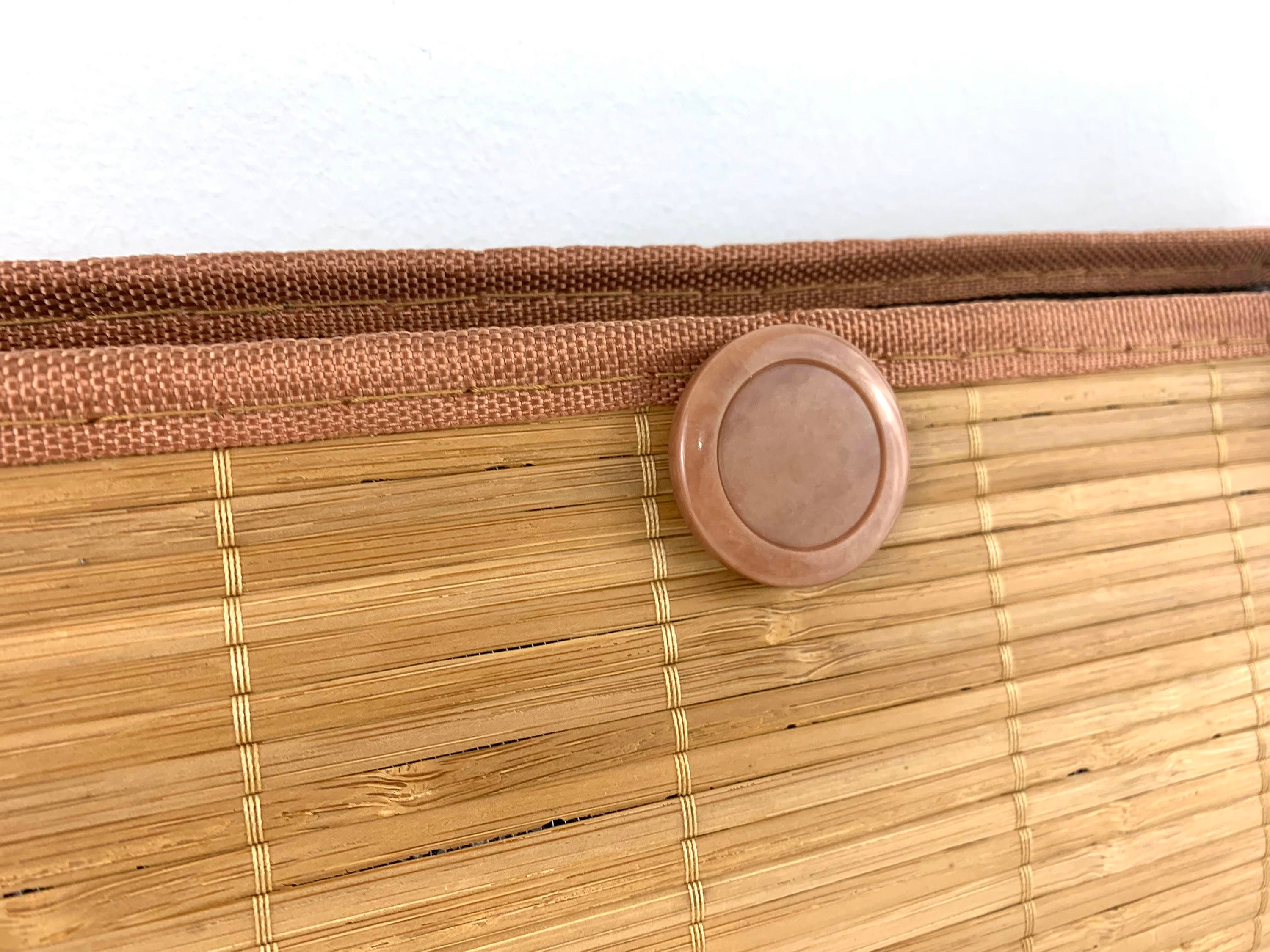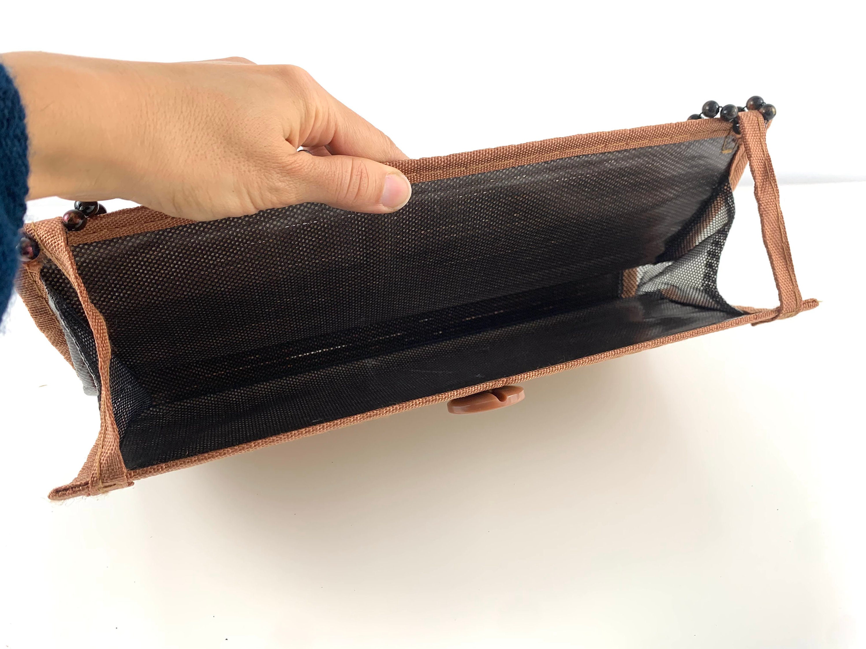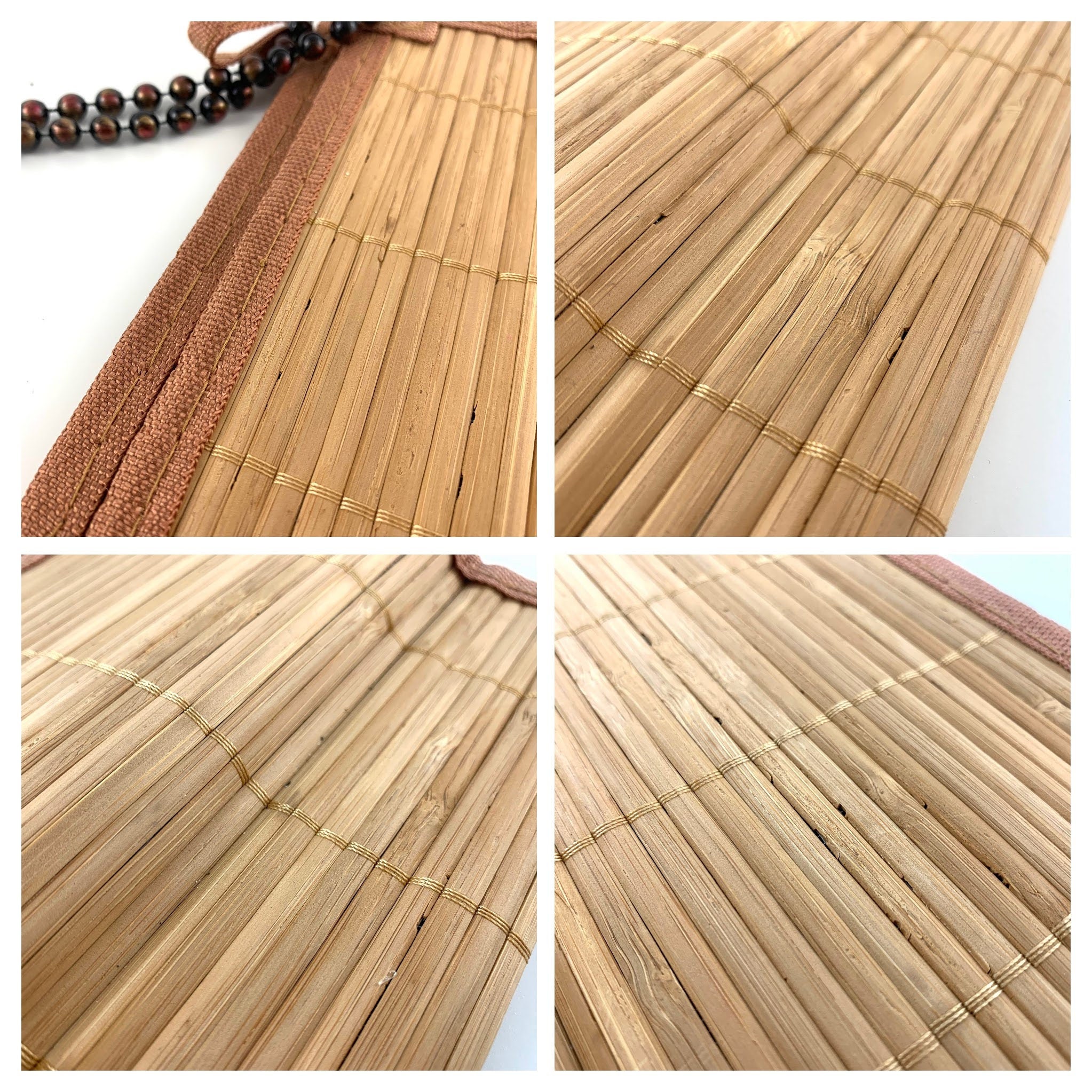 Adorable vintage 80s boho chic clutch bag made of natural wood in tan brown color with plastic beadwork shoulder strap. This wooden purse is the perfect addition to any summer outfit. This natural wool purse has open top with one compartment inside. The interior is lined in polyester lining.
