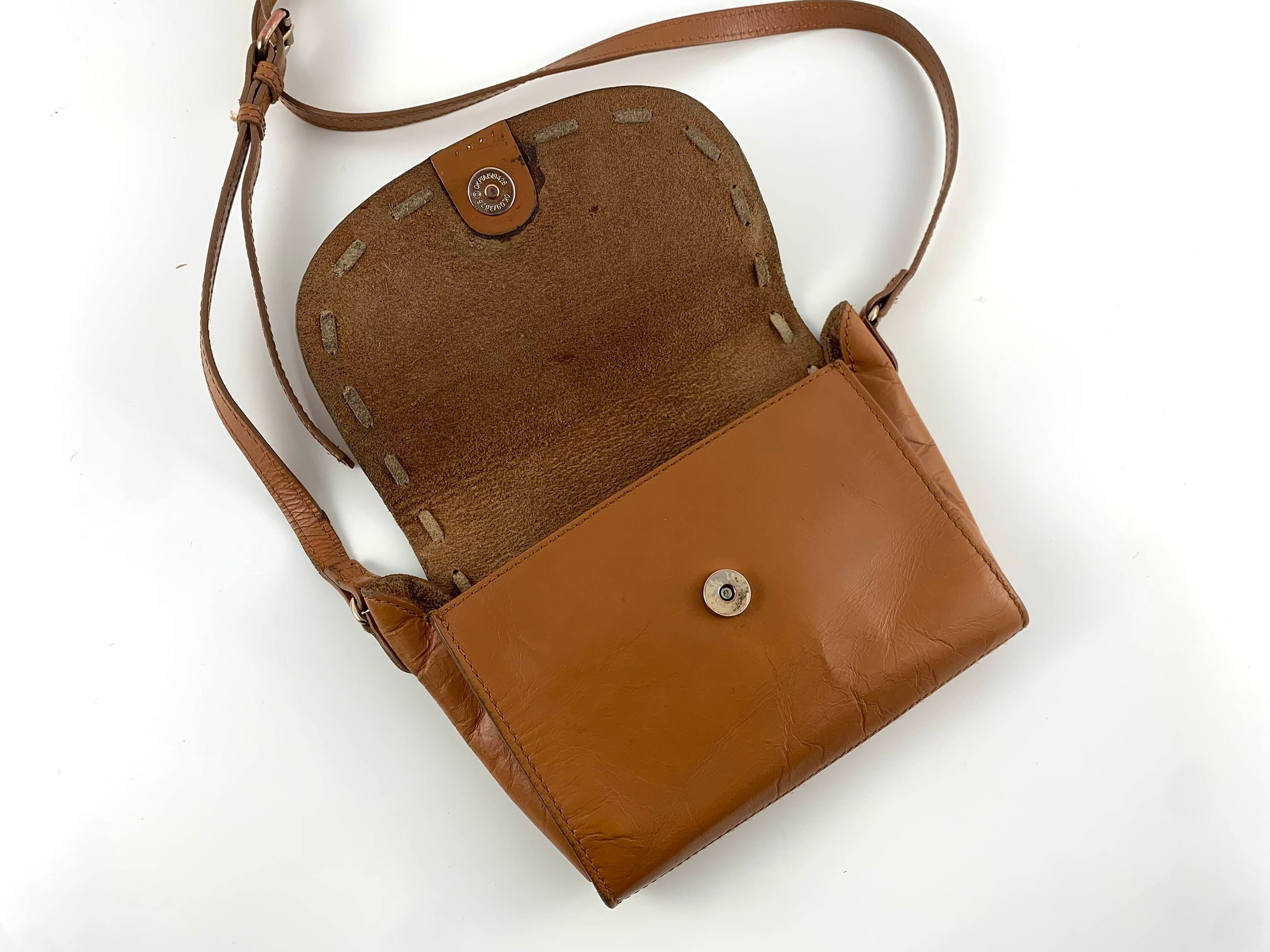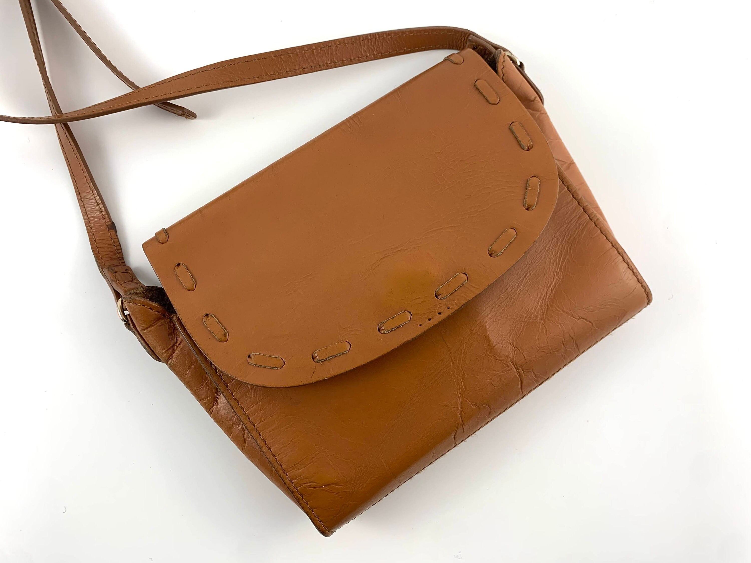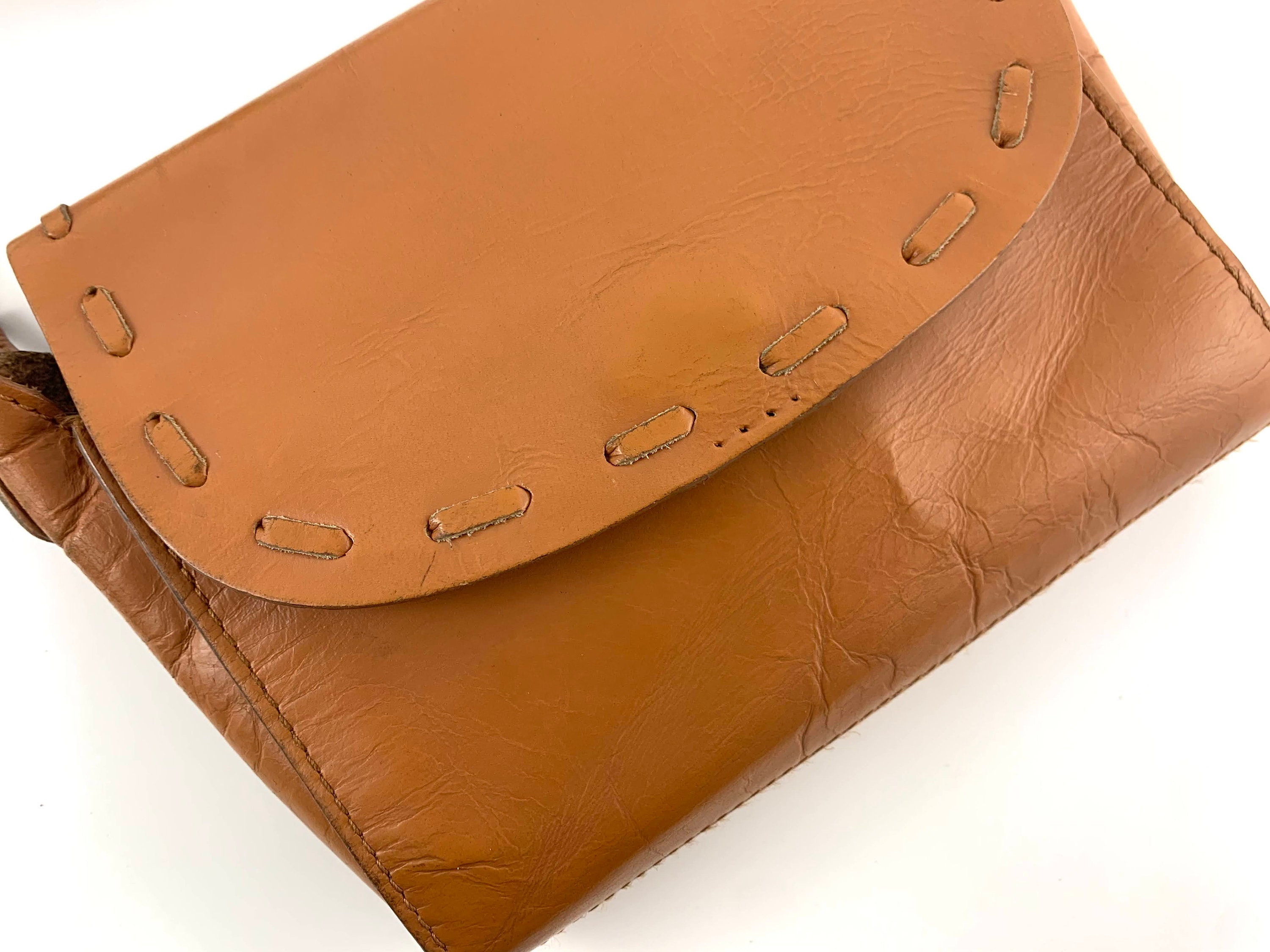 This is a vintage 90s boho hippie simple camel brown leather crossbody purse. This brown leather satchel has simple design and flap over lid with magnetic closure. This small brown distressed leather satchel purse is made of genuine leather in and out. It has a slim shoulder strap which can be adjusted so you can wear it as a shoulder or as a crossbody bag. There is one compartments inside. There is no lining, so you can feel the leather inside