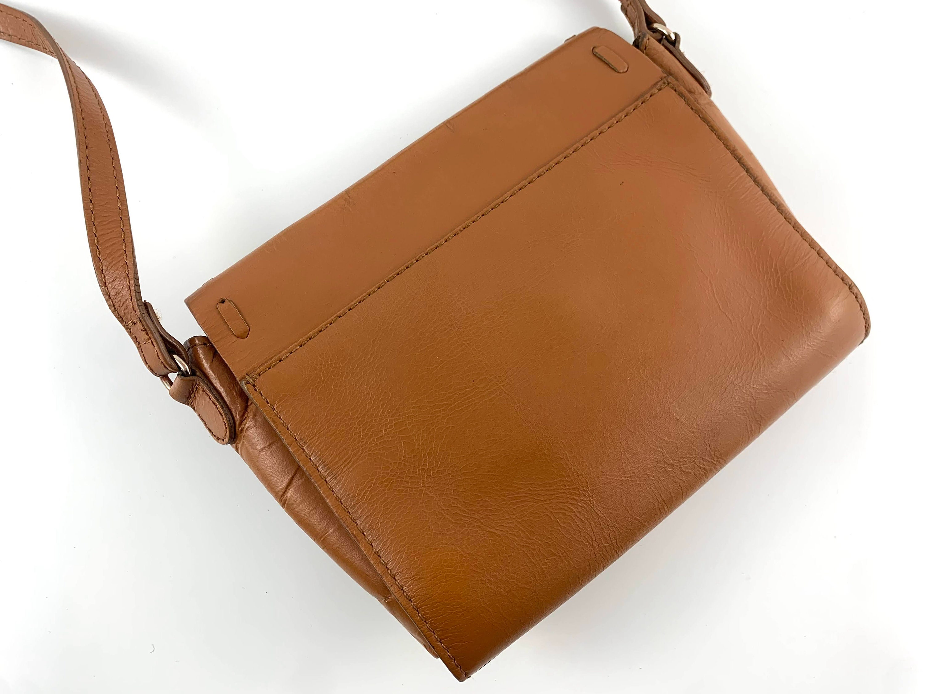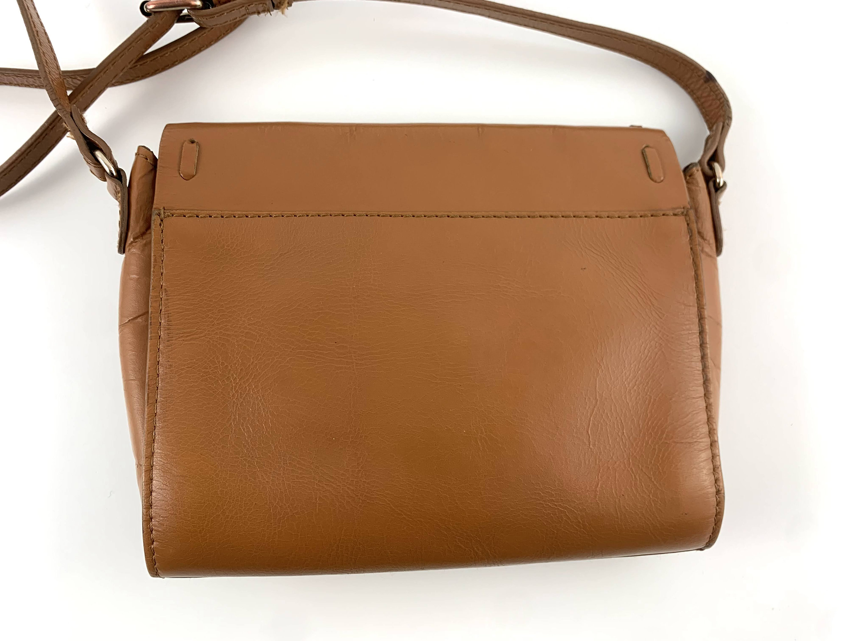 Condition: This small brown crossbody purse has a distressed look as it was much loved. The leather shows some scratches and creases all over the leather surface, there is some fading around the edges.