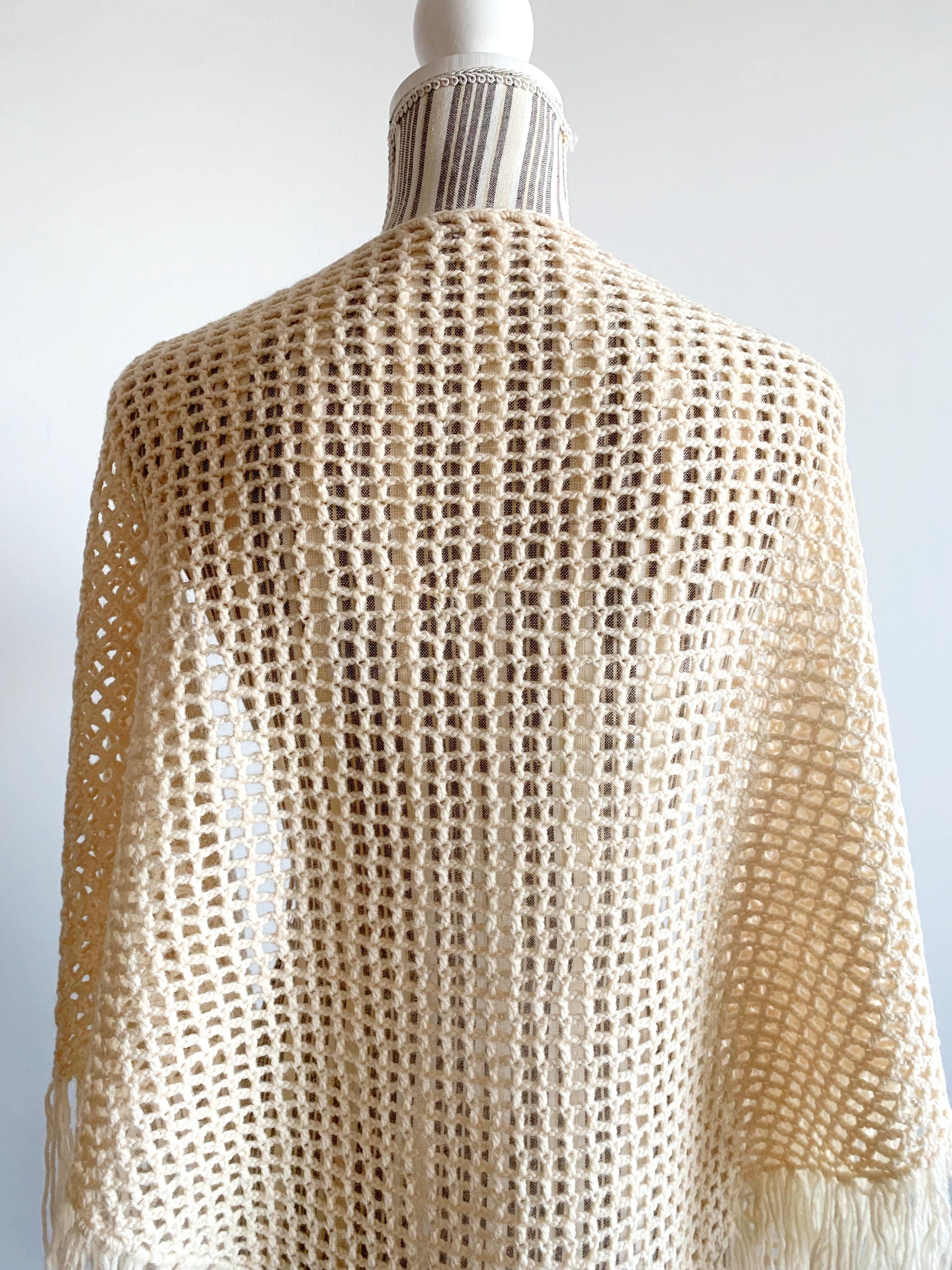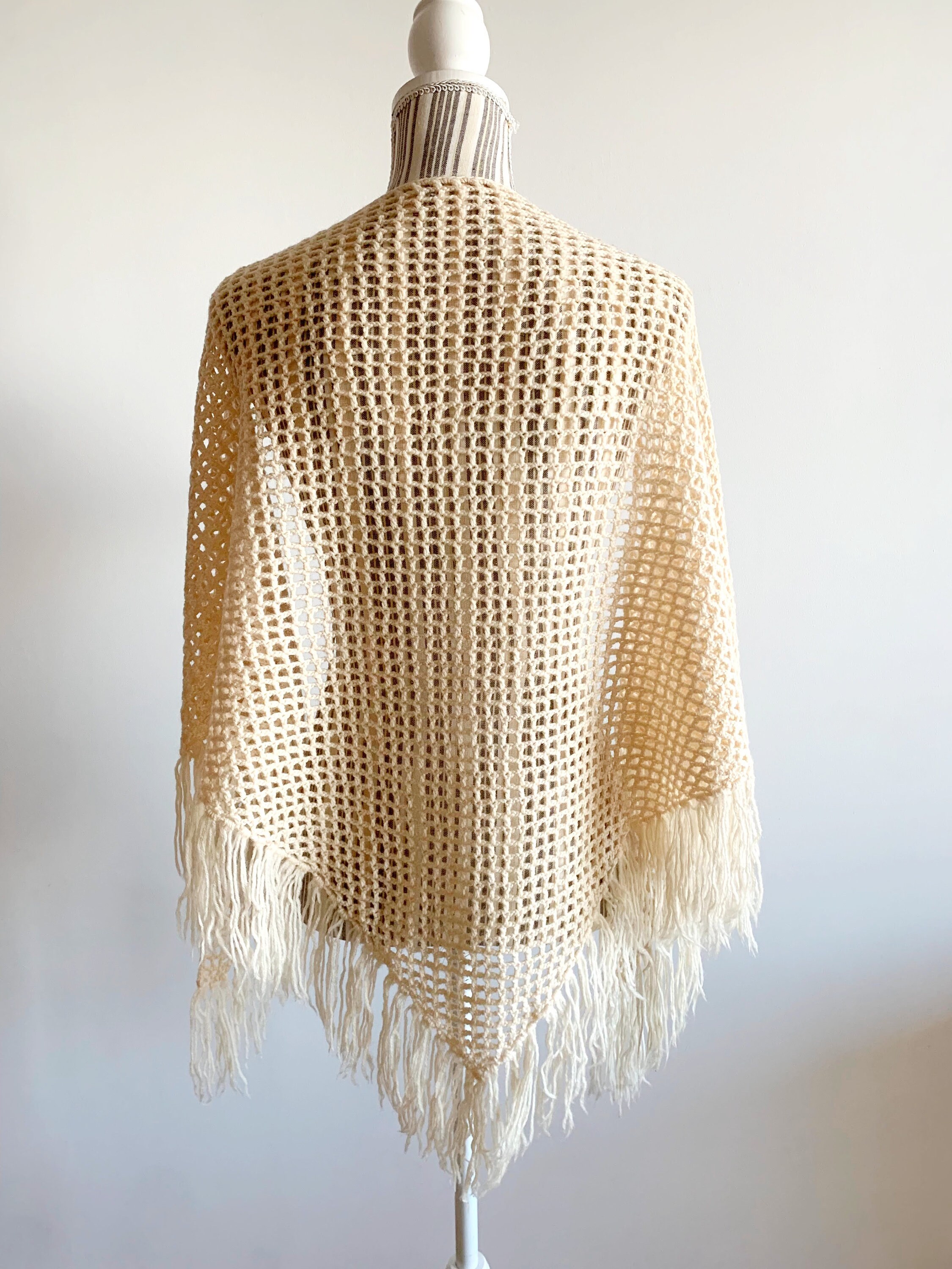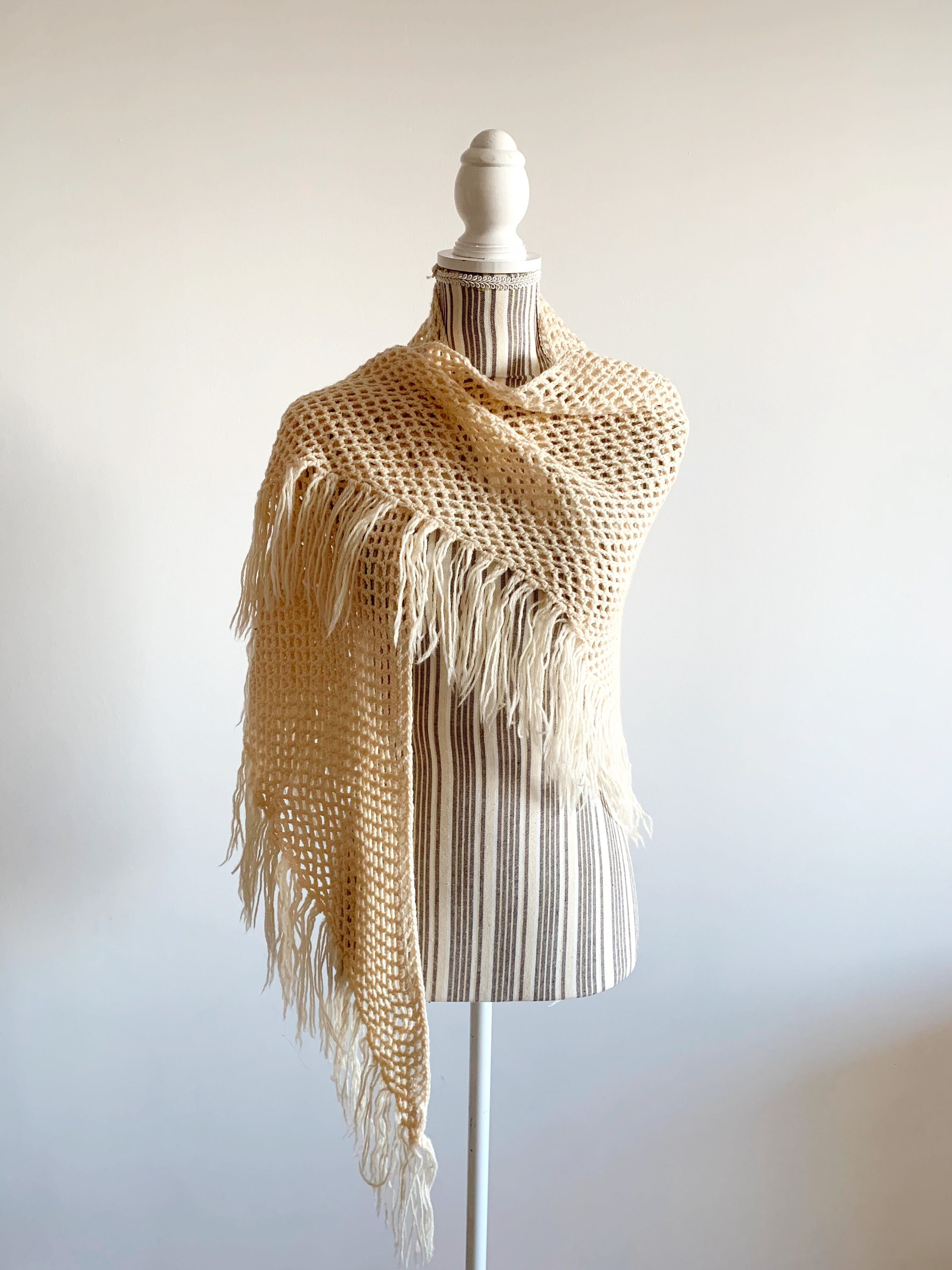This is a vintage ecru bohemian lace shawl with fishnet pattern and lovely tassels. It is in cream off white color. This see through scarf has a triangular shape with basic net crochet pattern and delicate fringe at the ends. It is very delicate and super basic, so you can wear it with shirts and jeans, boho dresses and tunics. You can wear this triangle piano shawl in so many different ways - wear it as a long neck scarf, as a shoulder shawl, or wrap it around as a shrug. Perfect to wear over a dress, a solid color blouse or turtleneck. This cream beige lace shawl will add a pop a style to your outfit.